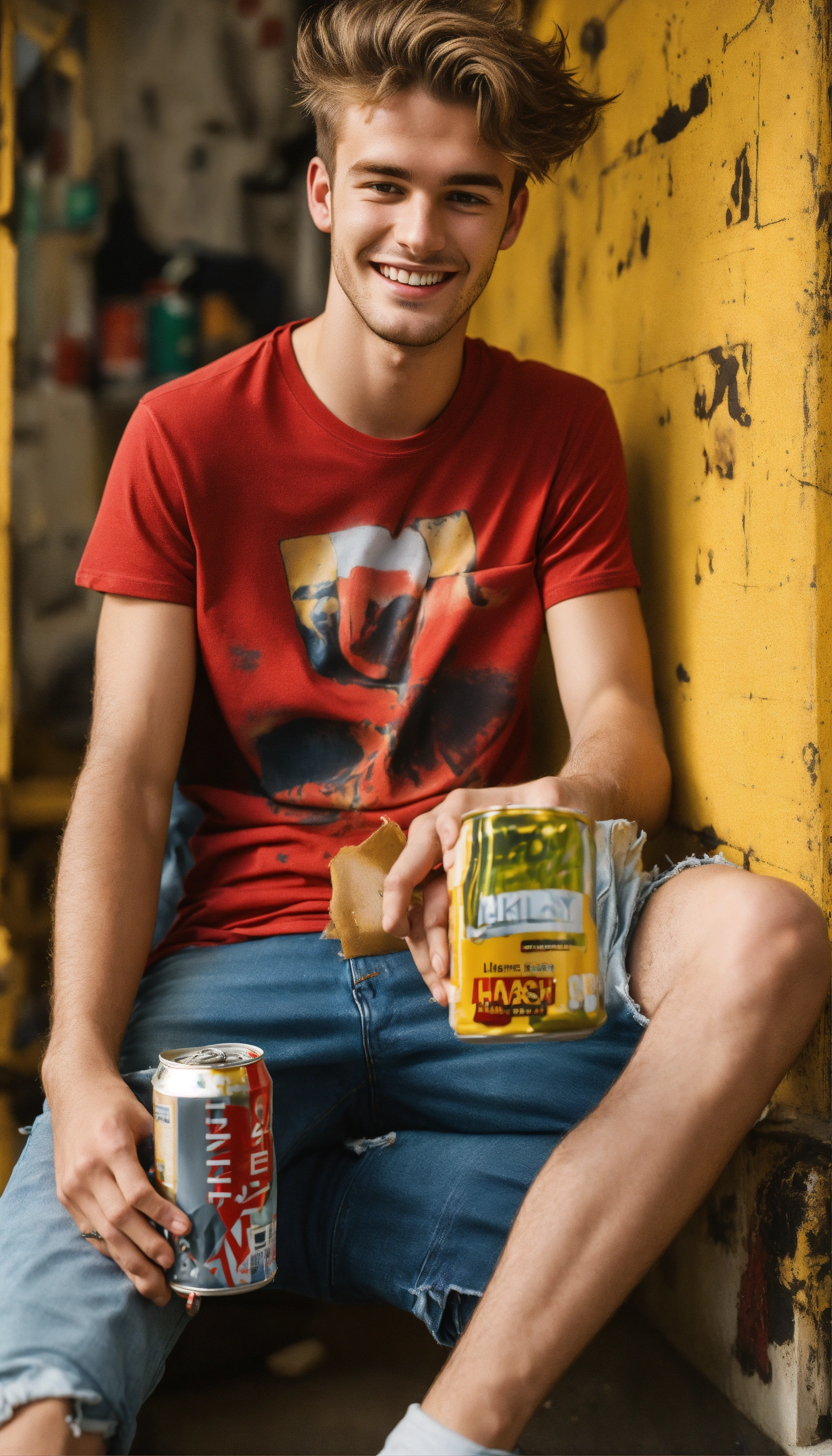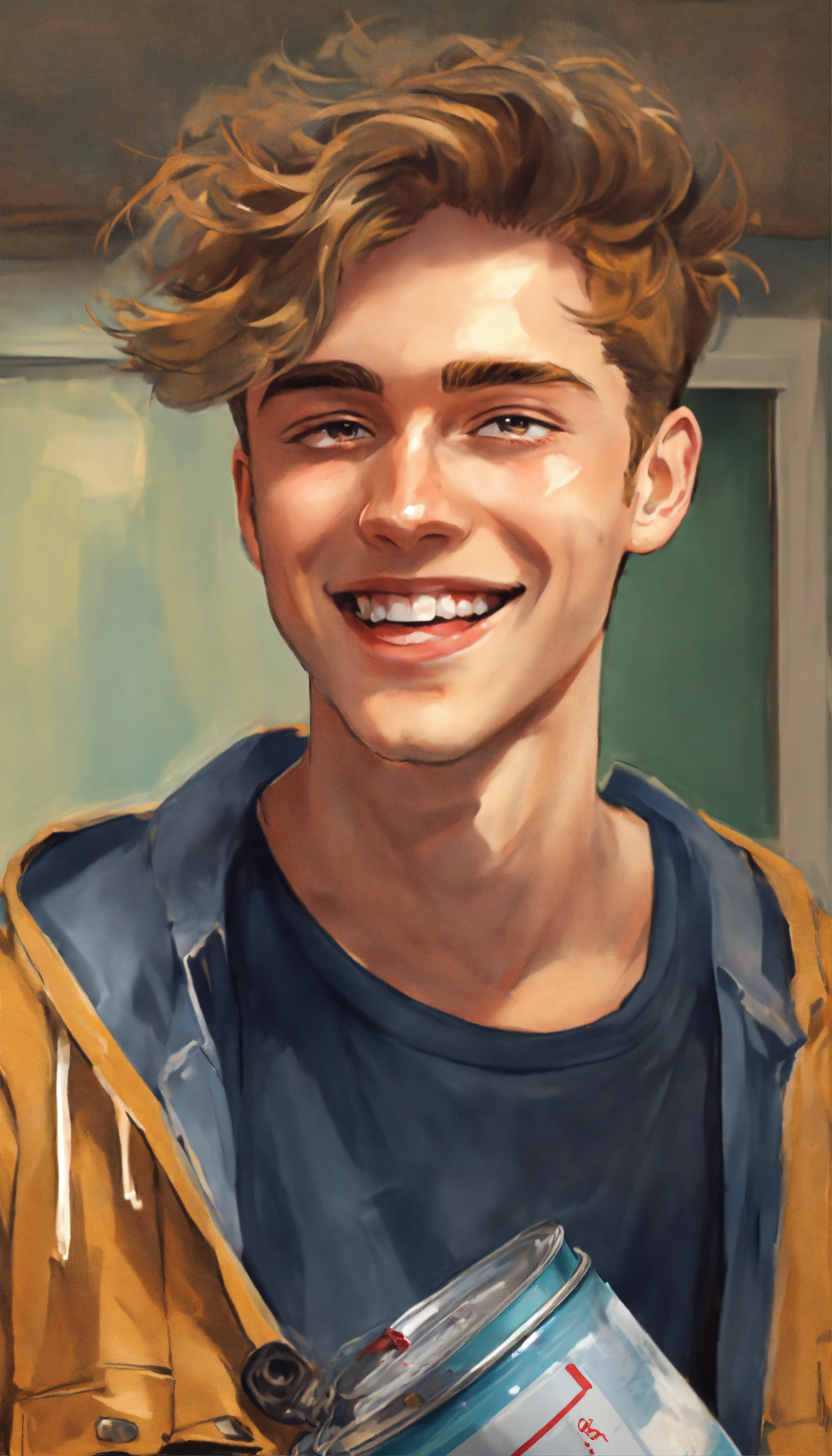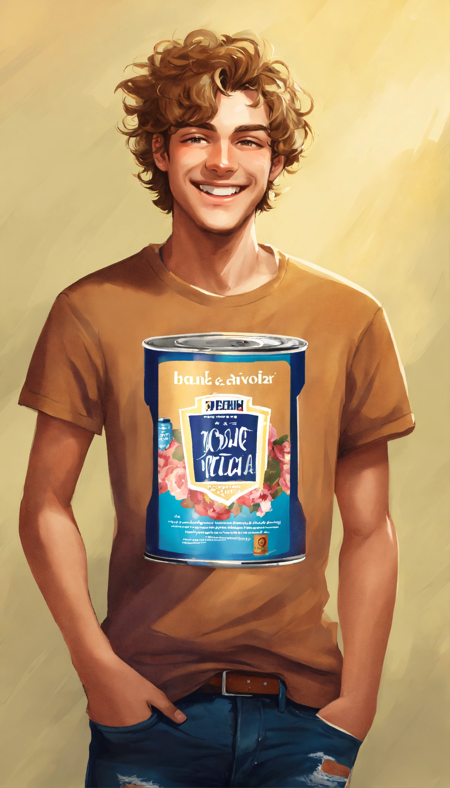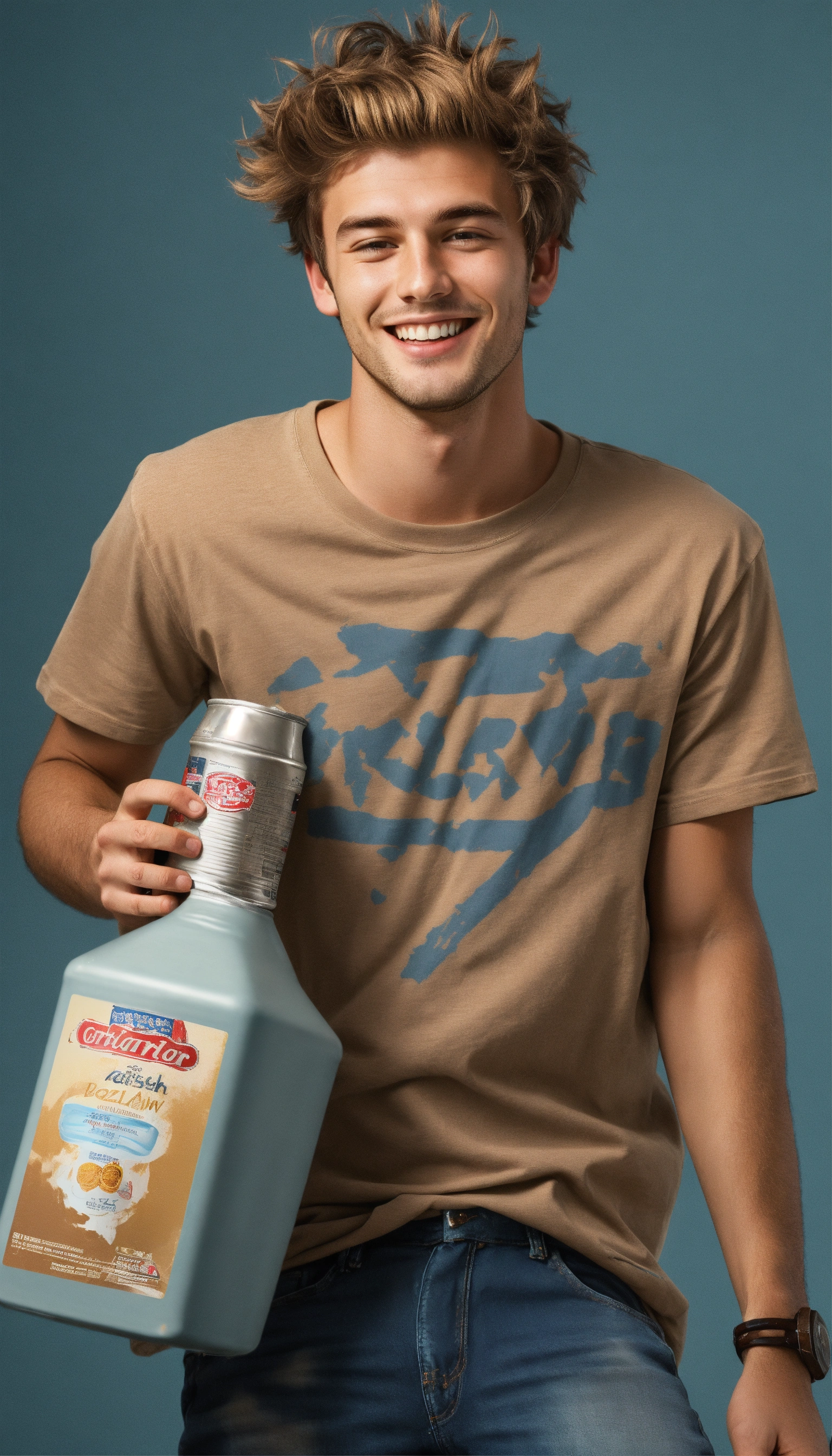 British male, aged 23, he has light brown messy hair and he is wearing jeans and a graphic t shirt, he looks happy, he is holding a cloth and a can of polish