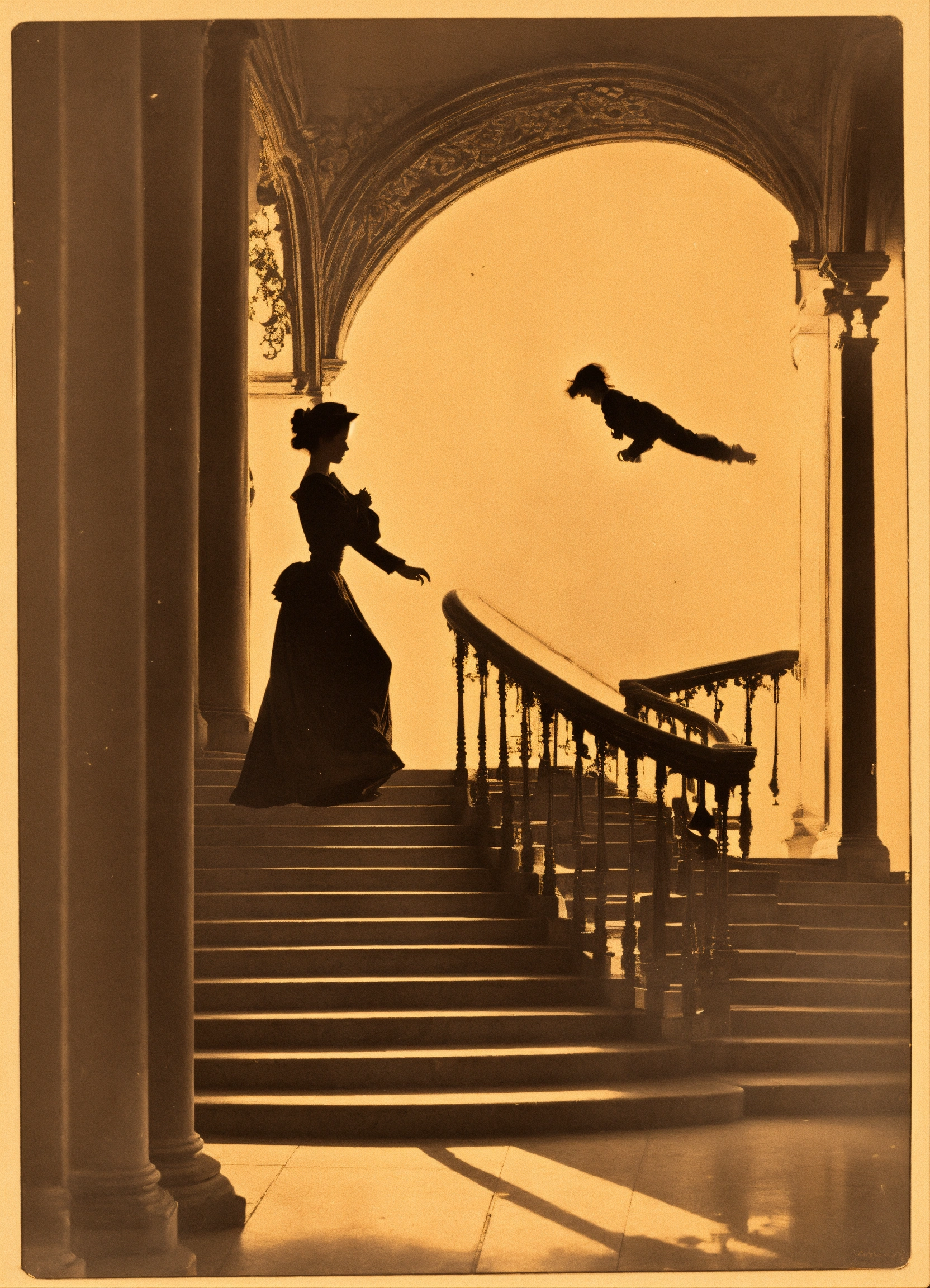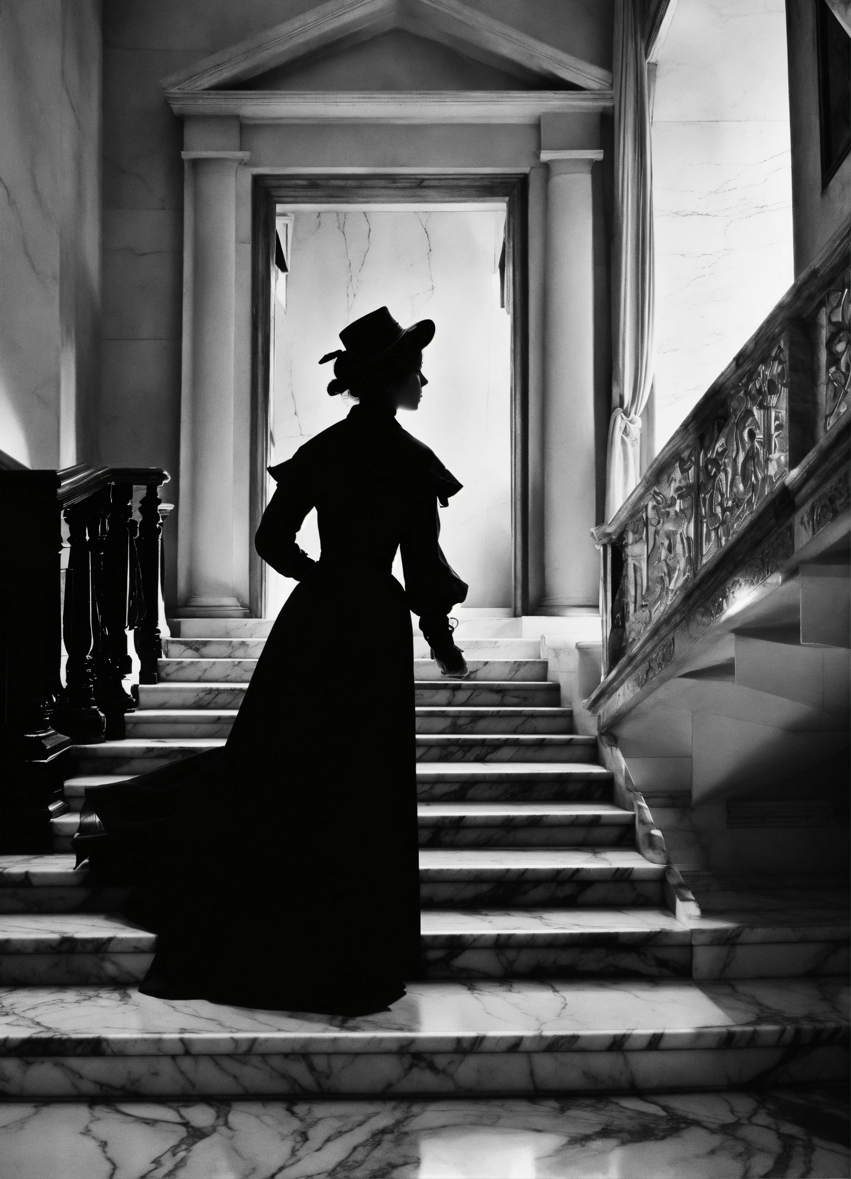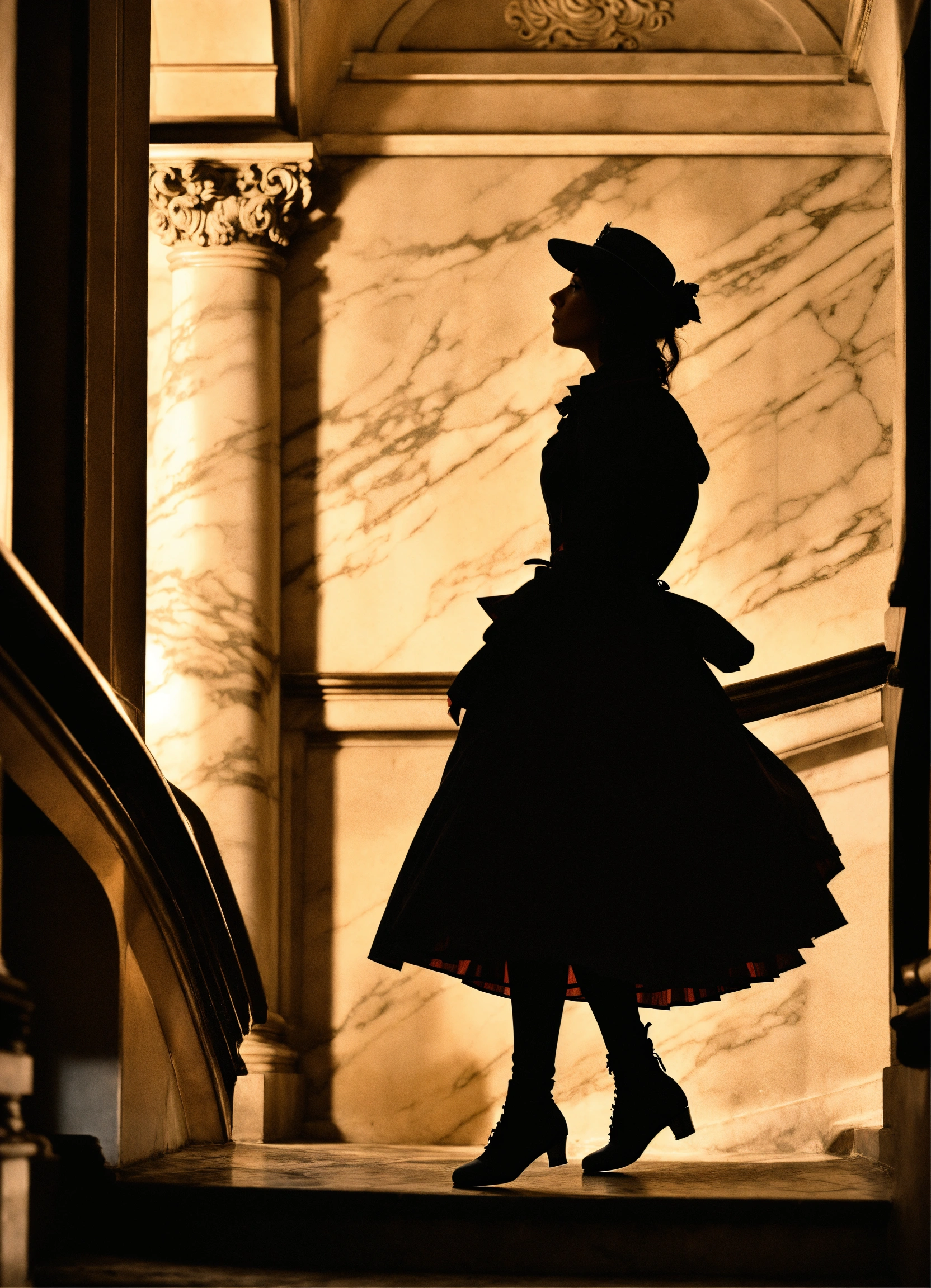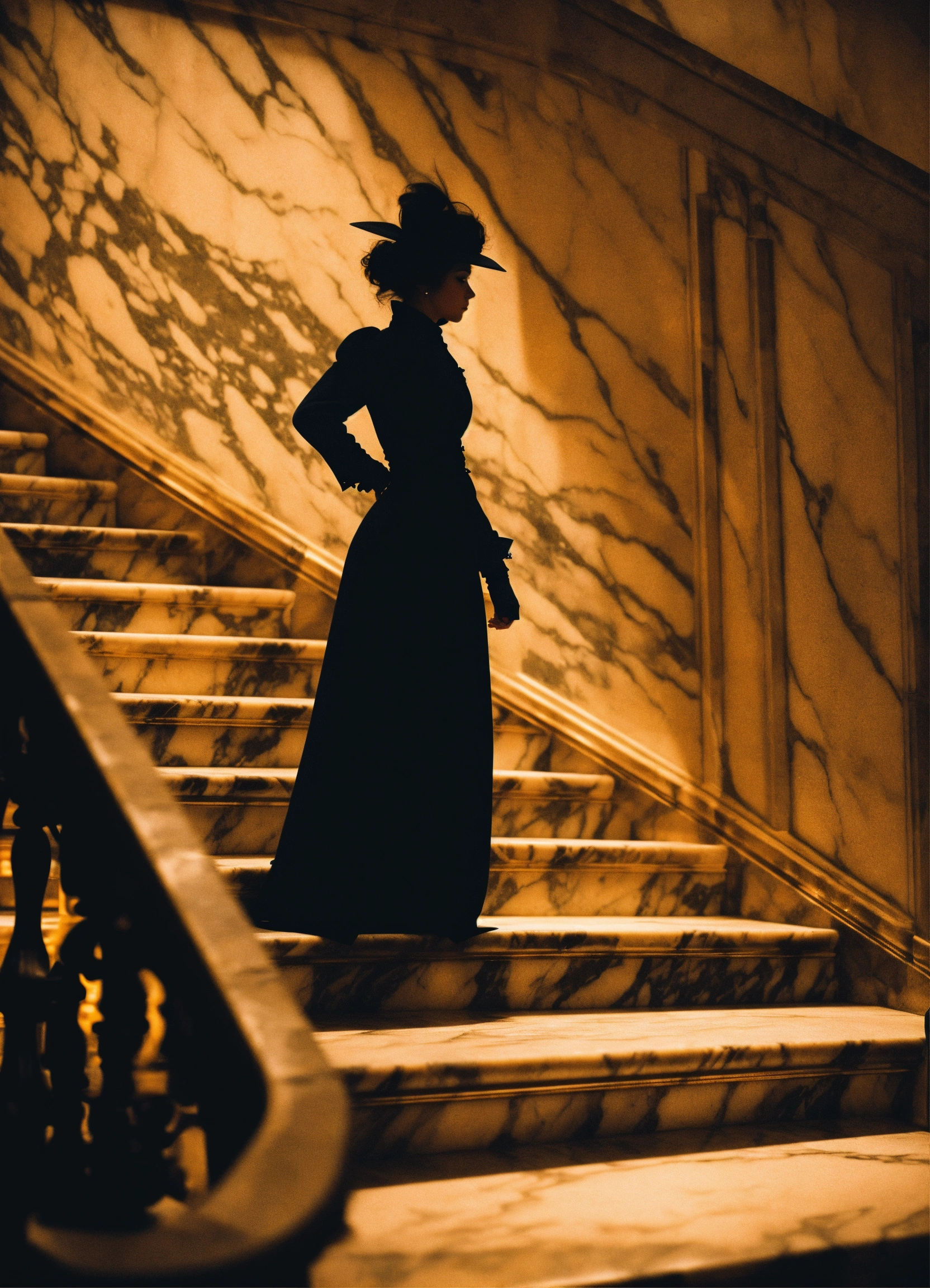 Silhouette of a woman on marble stairs flying 30 inches above in the 1800s