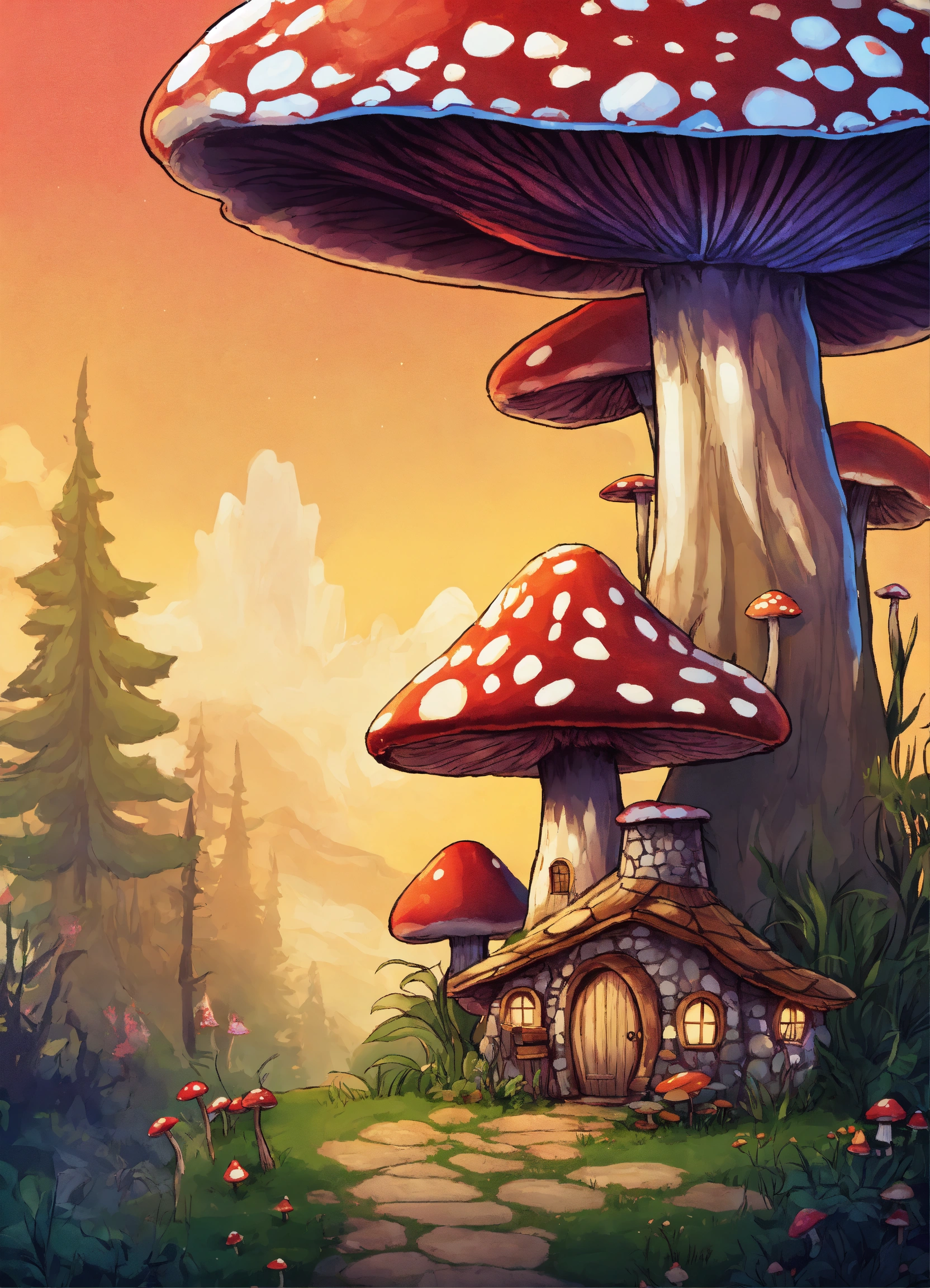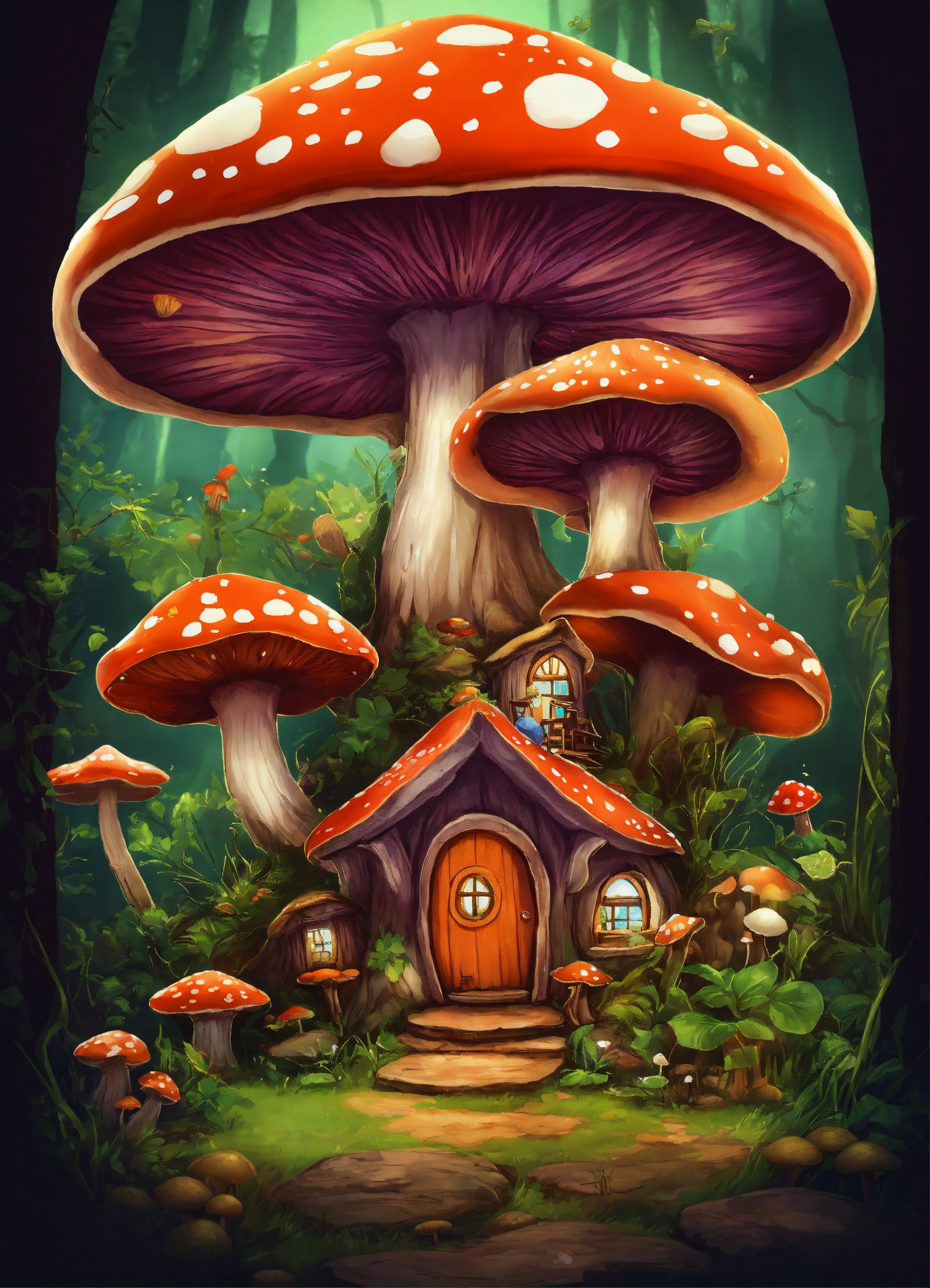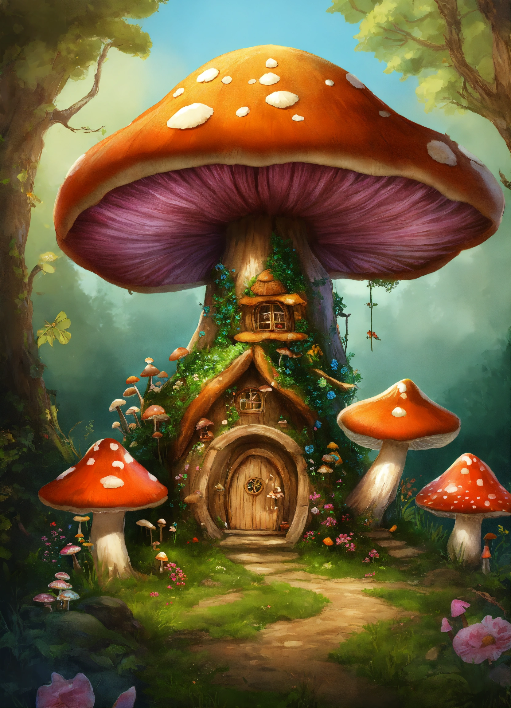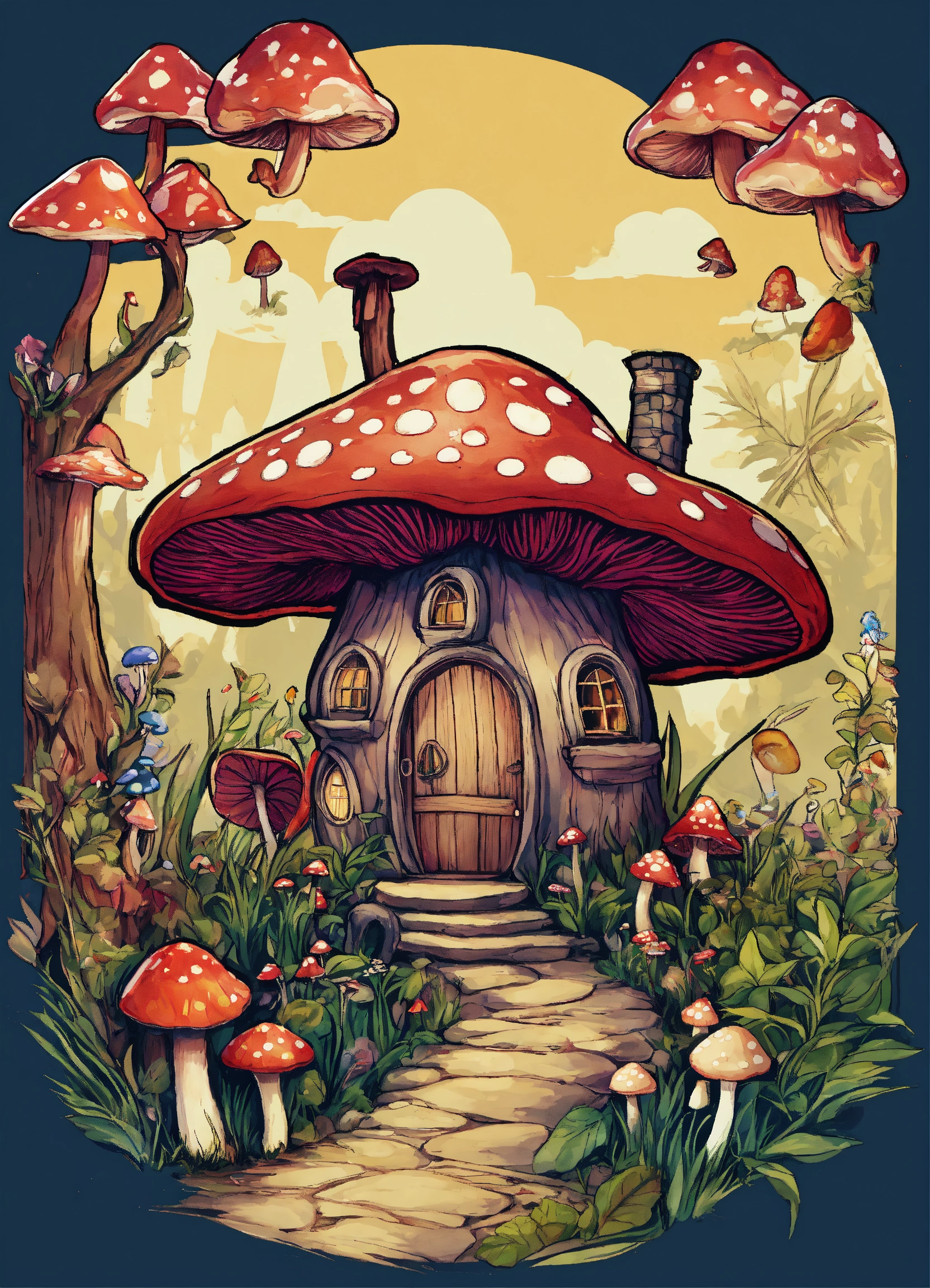 T-shirt design, fairy mushrooms, fairy trees, fairy fantasy, huge mushrooms, houses, huts, empty background