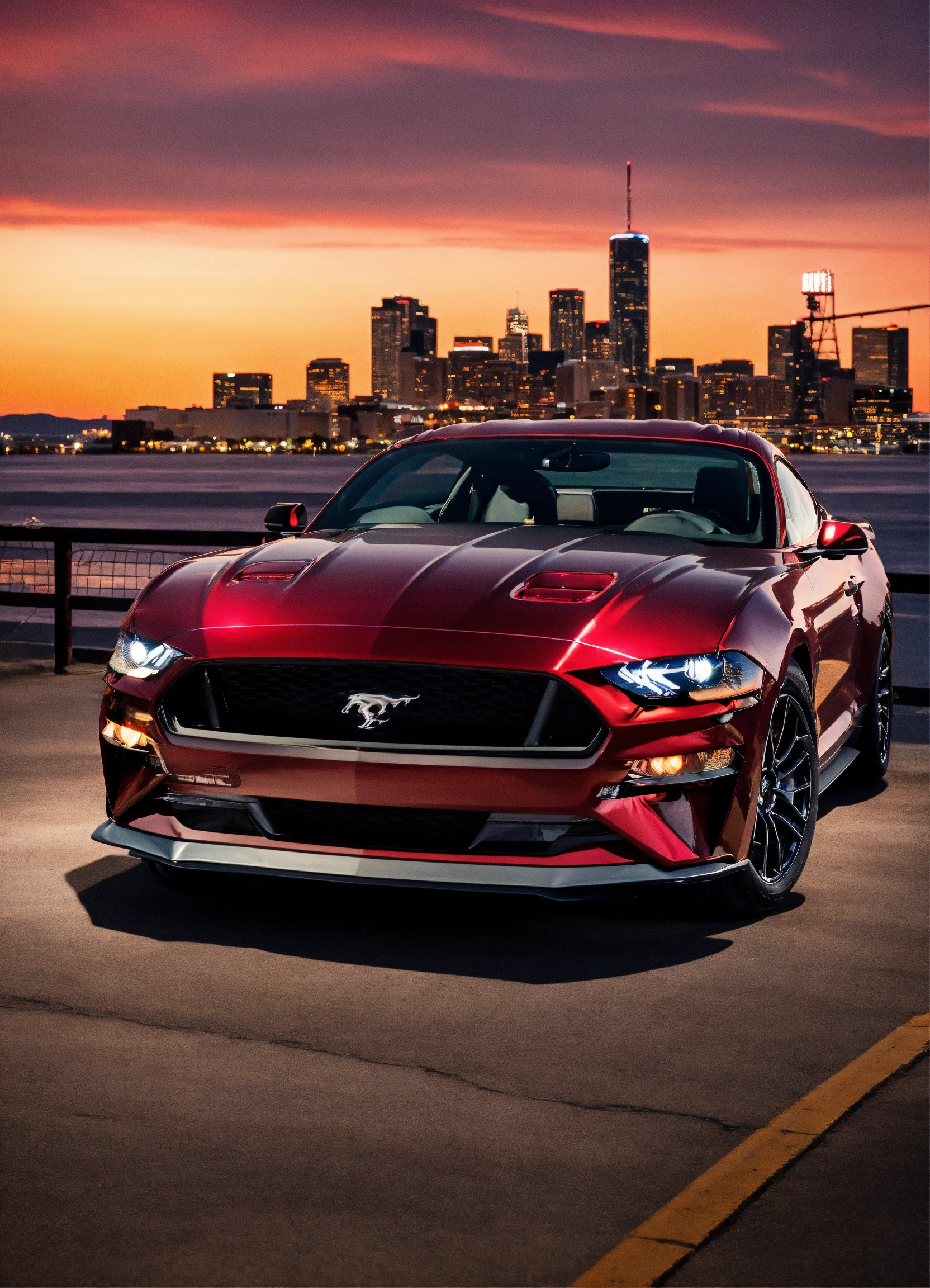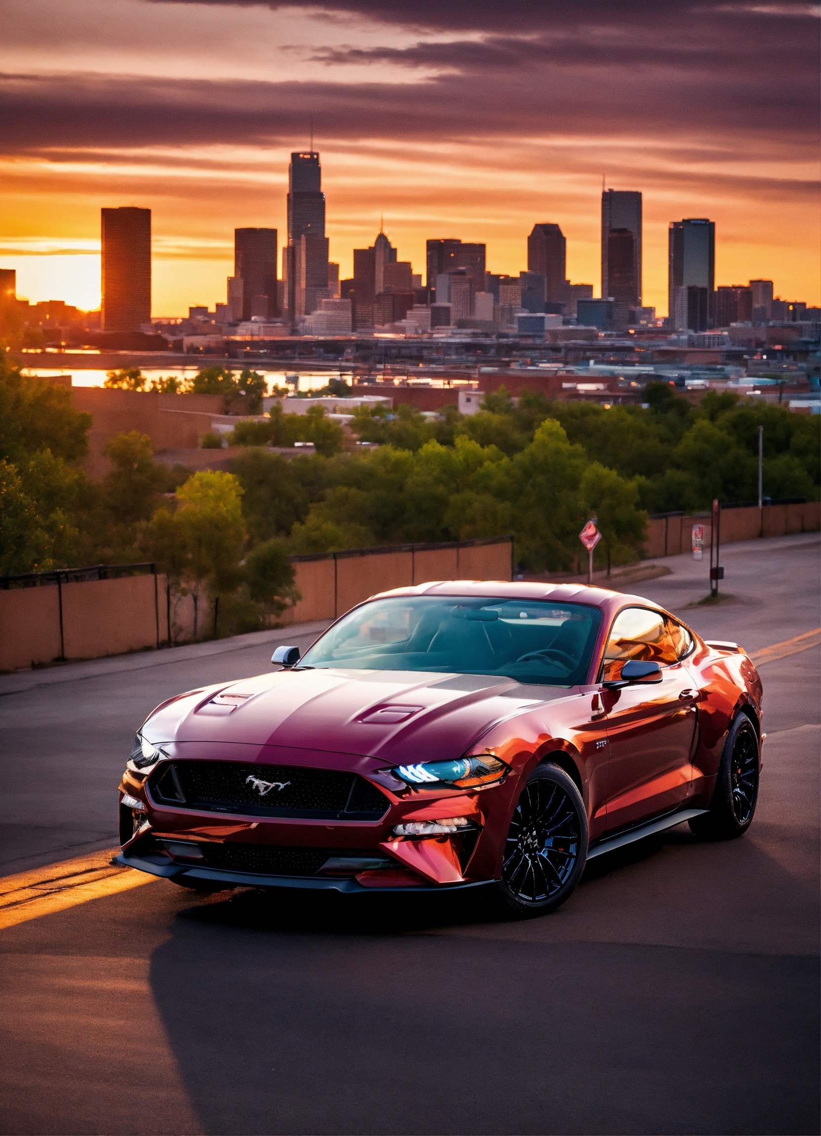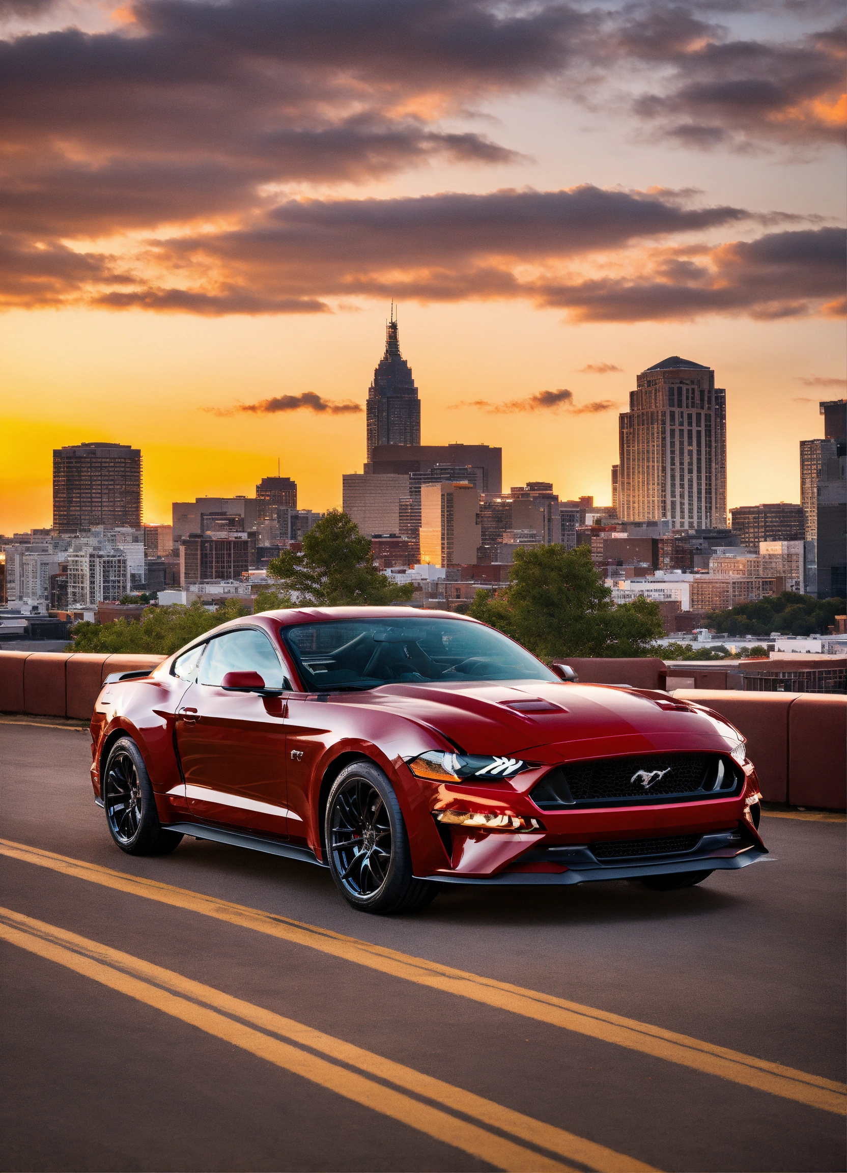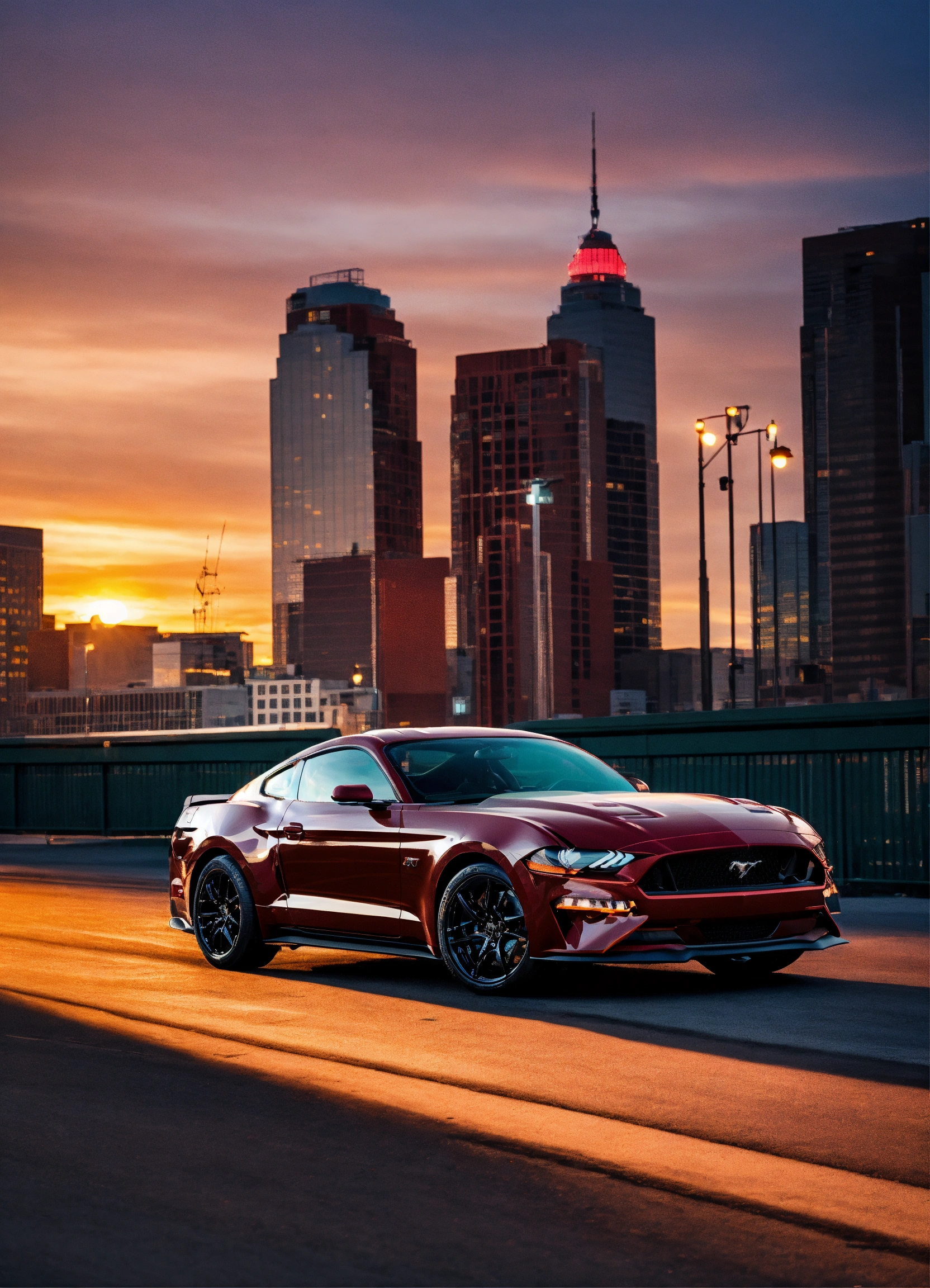 2021 mustang gt burgundy and tan with sunset landscape and downtown background