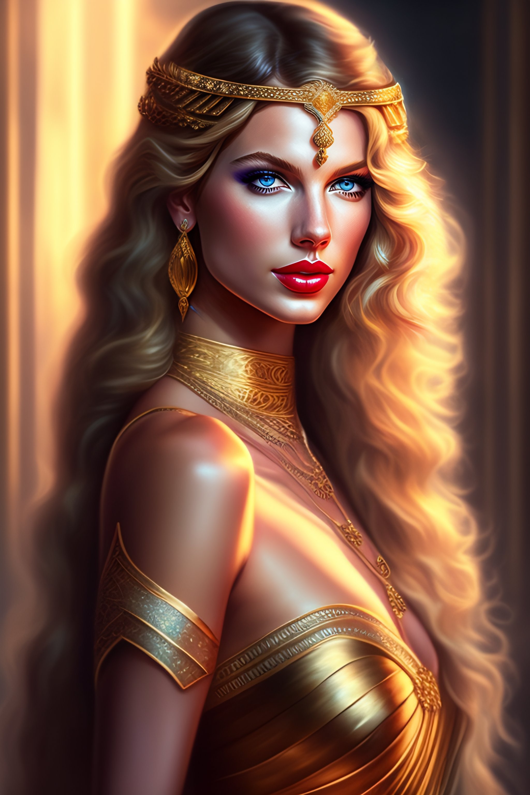 Taylor swift as a greek goddess, beautiful, 8k, stunning, glowing glass skin, confident half smile, dramatic lighting, intricate, wild, highly detailed, concept art, smooth, sharp focus