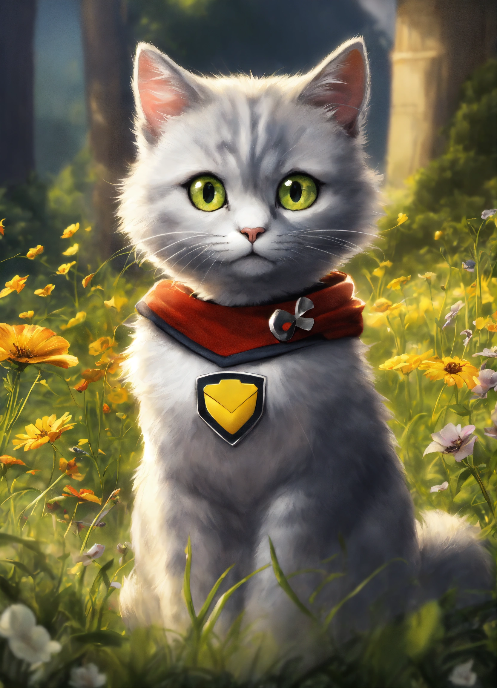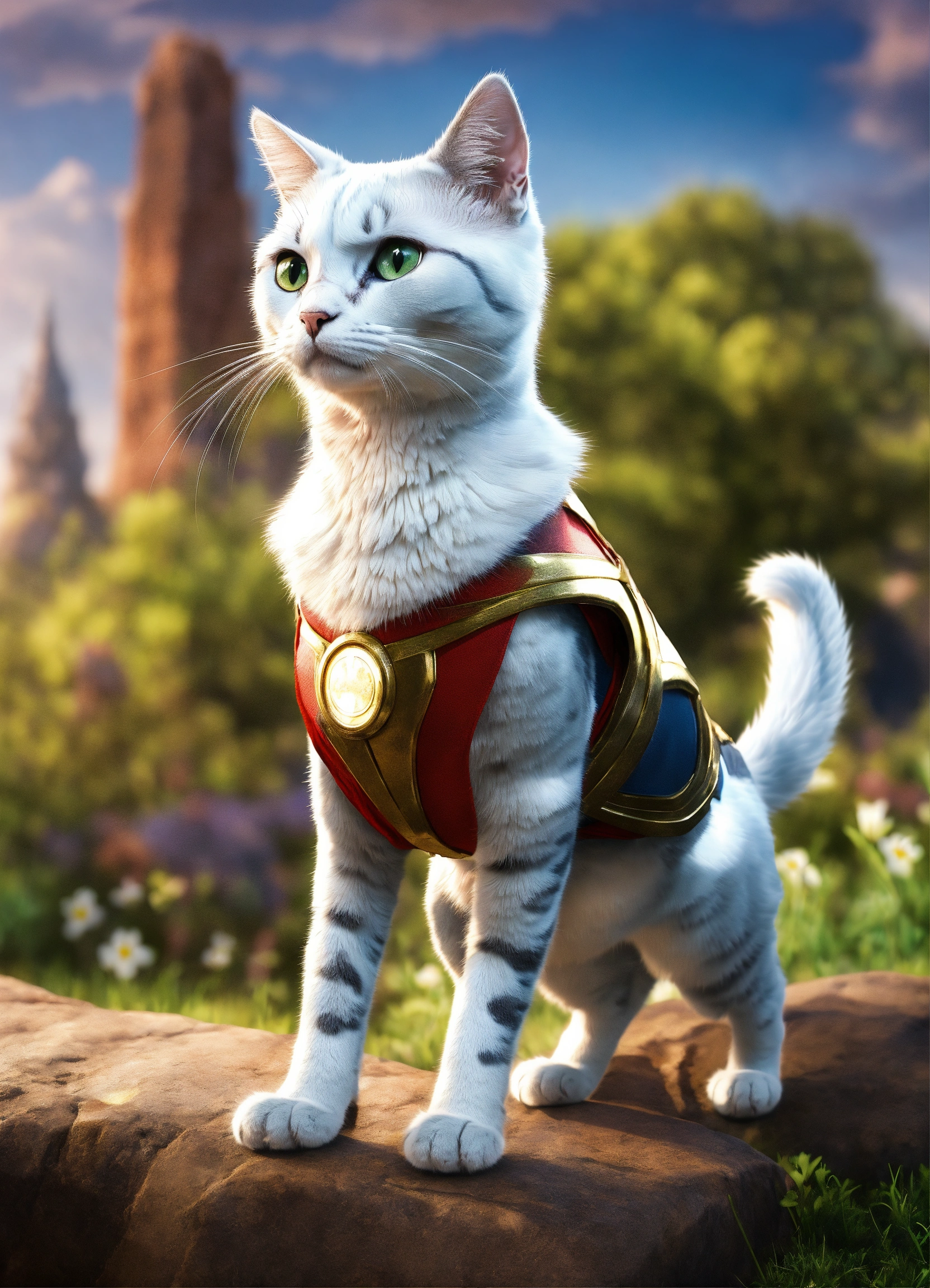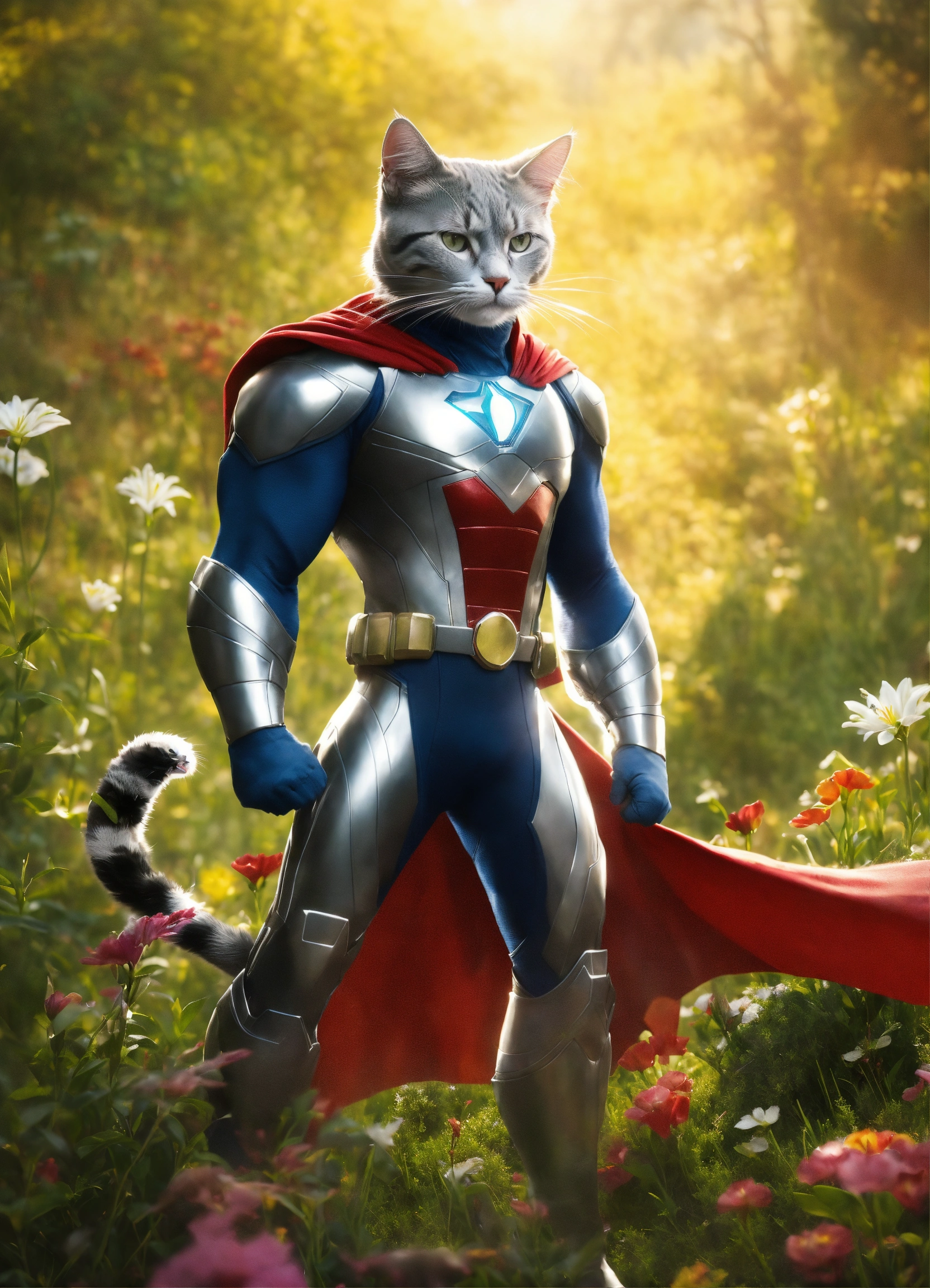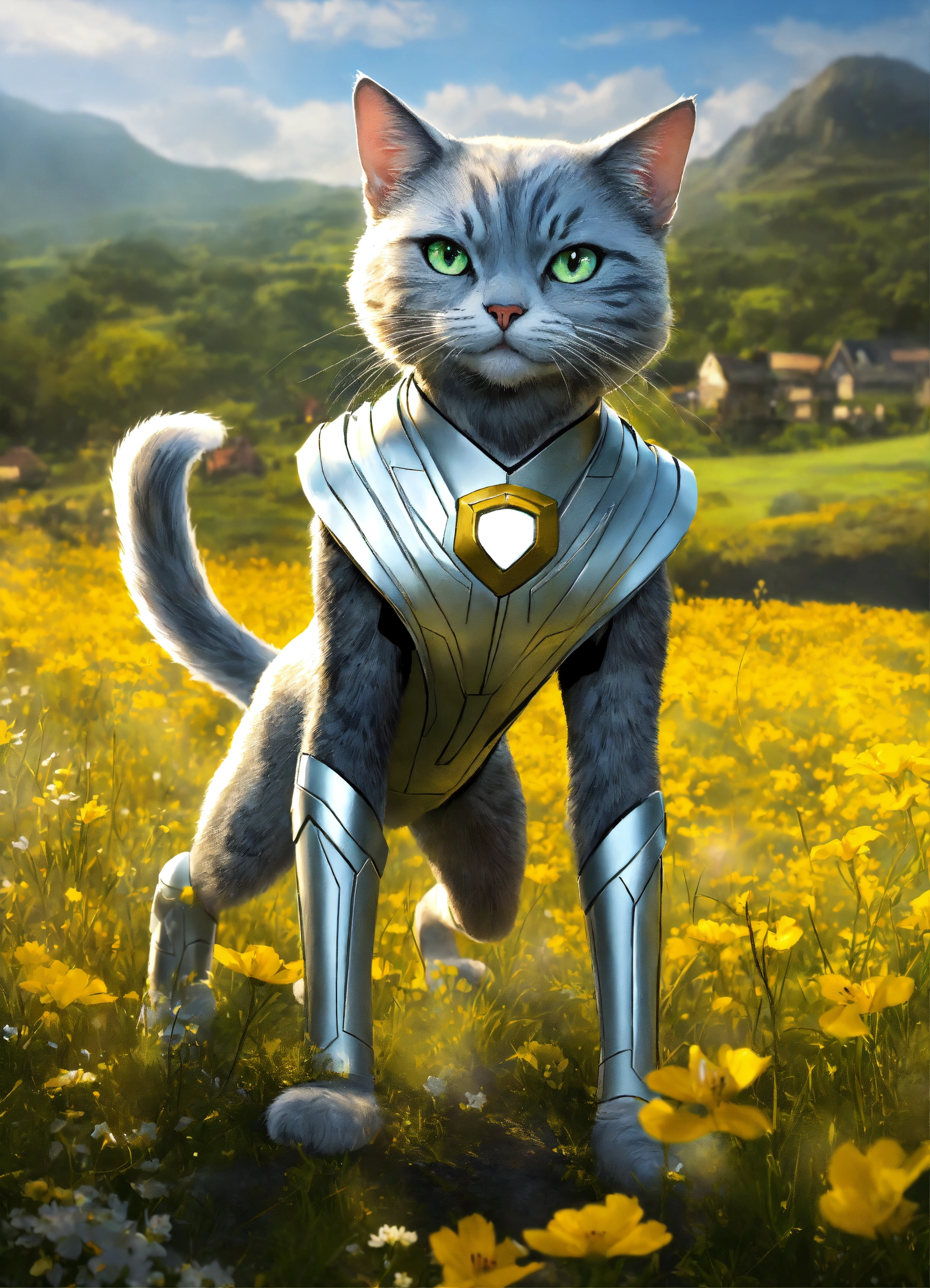 Silver (the cat) adjectives agile, mysterious, heroic verbs silver moves gracefully through the meadow, exuding the agility and charm of a marvel superhero. his animated movements are captivating, evoking the style of animation pixar. silver has a sleek, superhero-like costume with a hint of mystique that adds to his aura of intrigue and adventure. with his enigmatic yet heroic appearance, silver complements the scene in the meadow, making the trio of characters even more compelling and visually captivating. his partnership with lily and max creates a group of characters that blend the excitement of superhero adventures with the charm of animated storytelling.