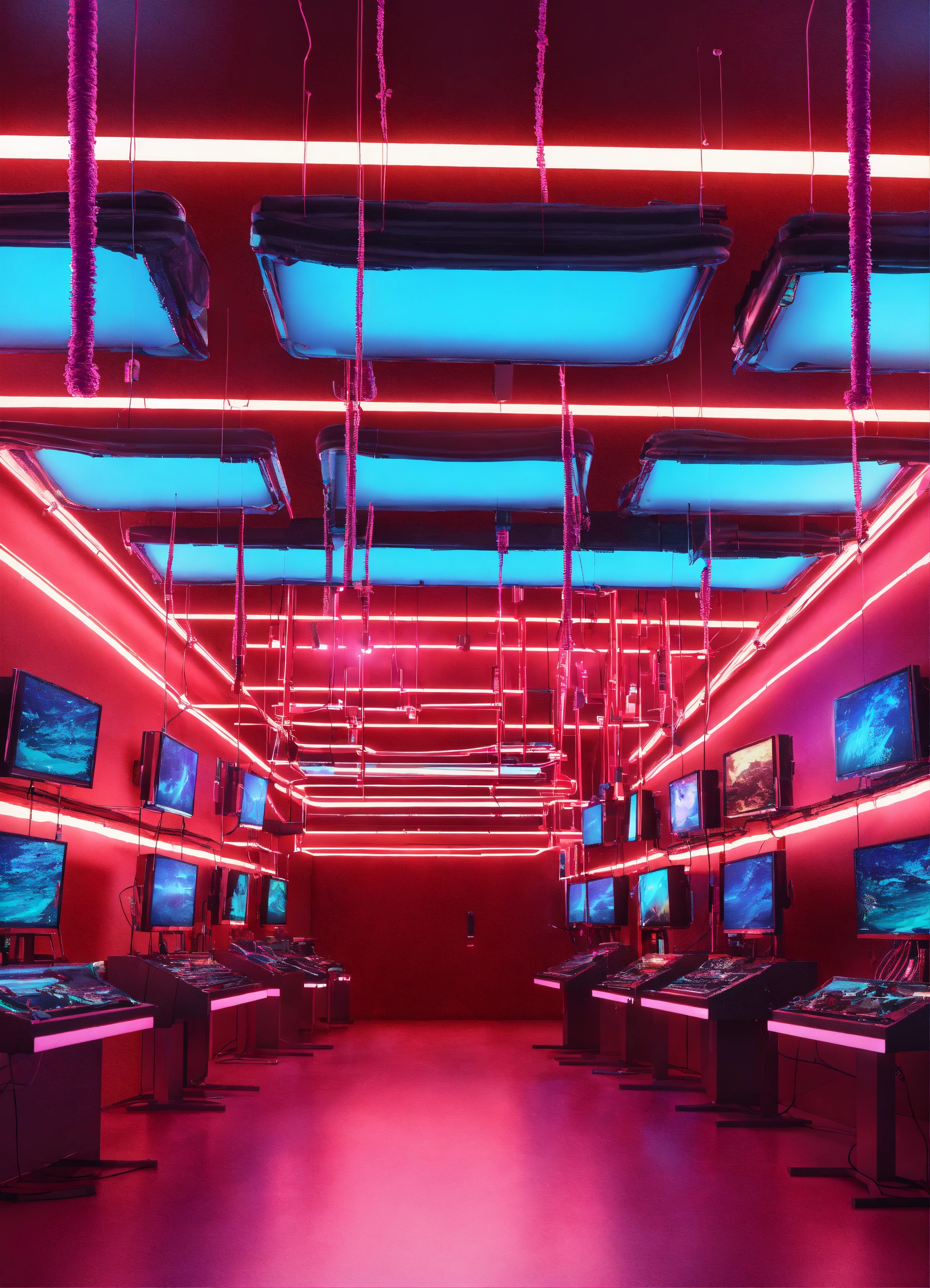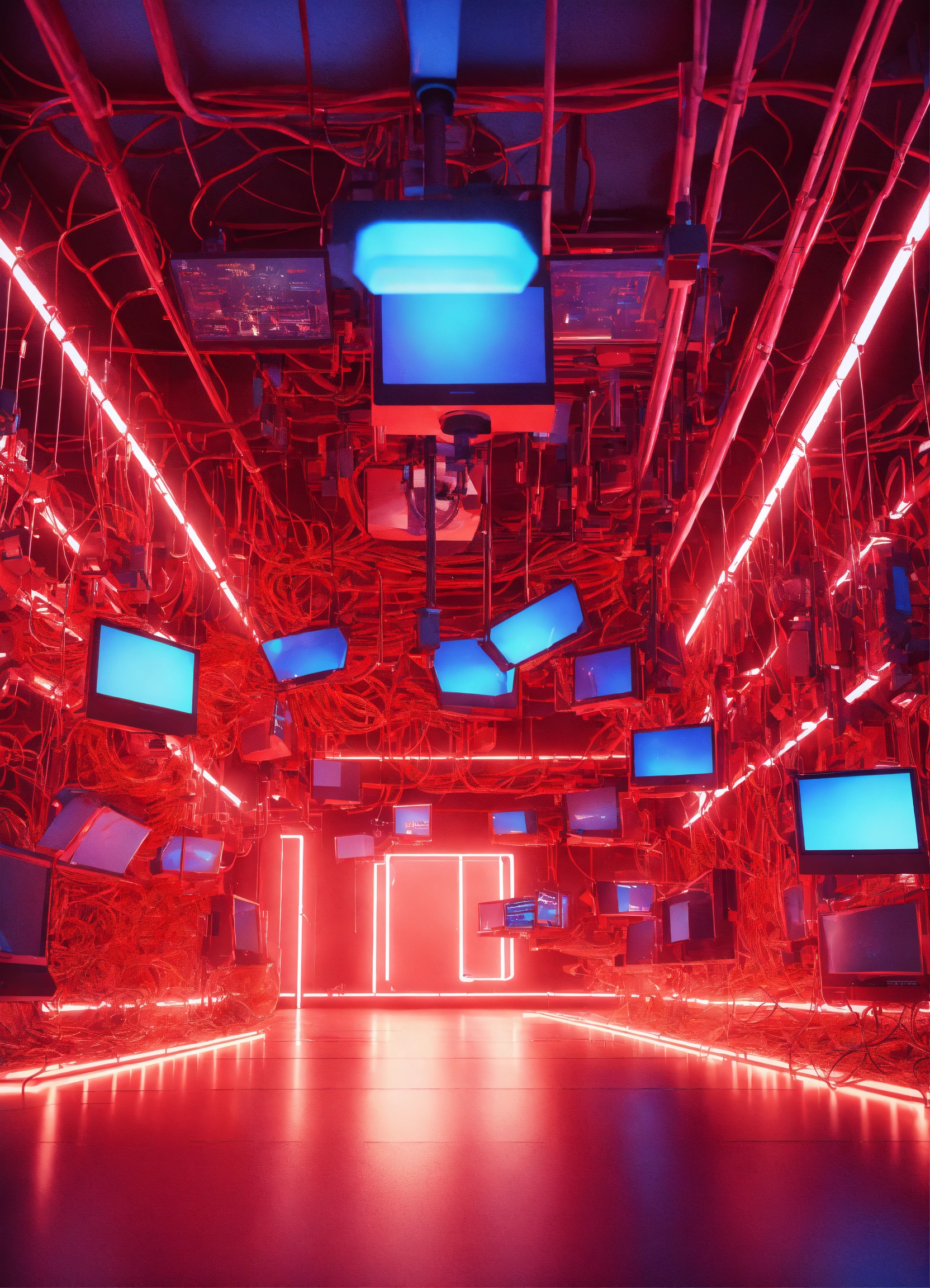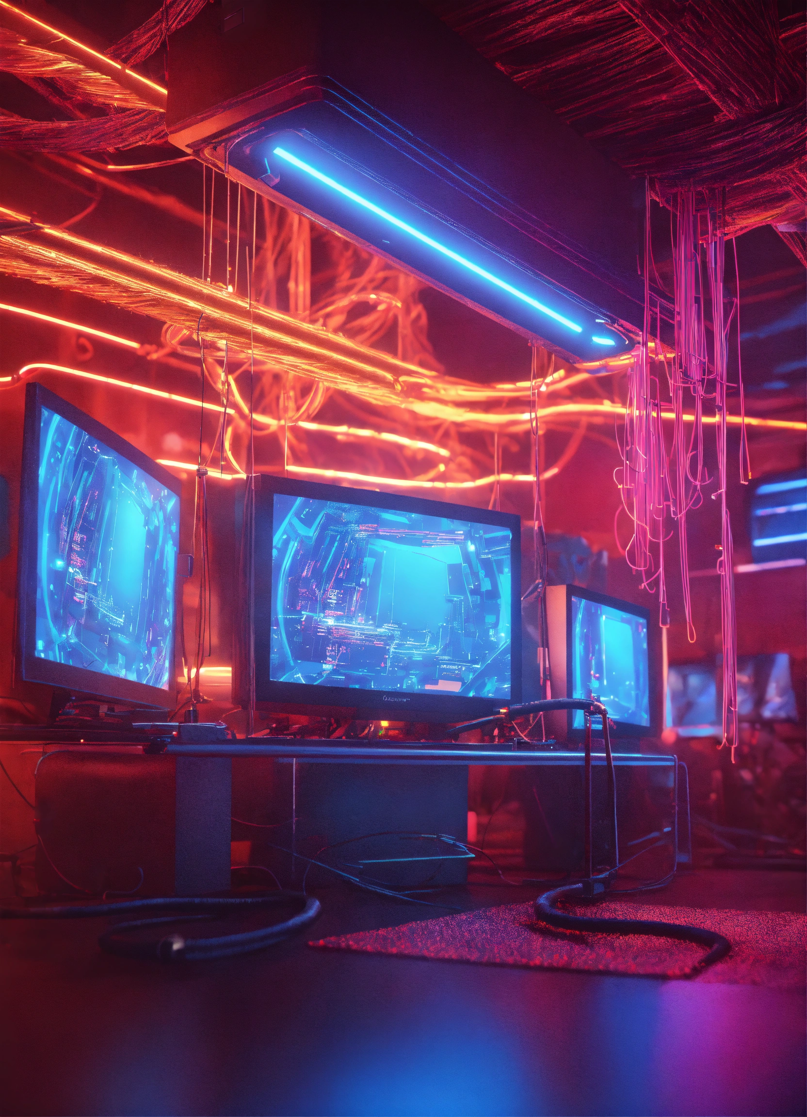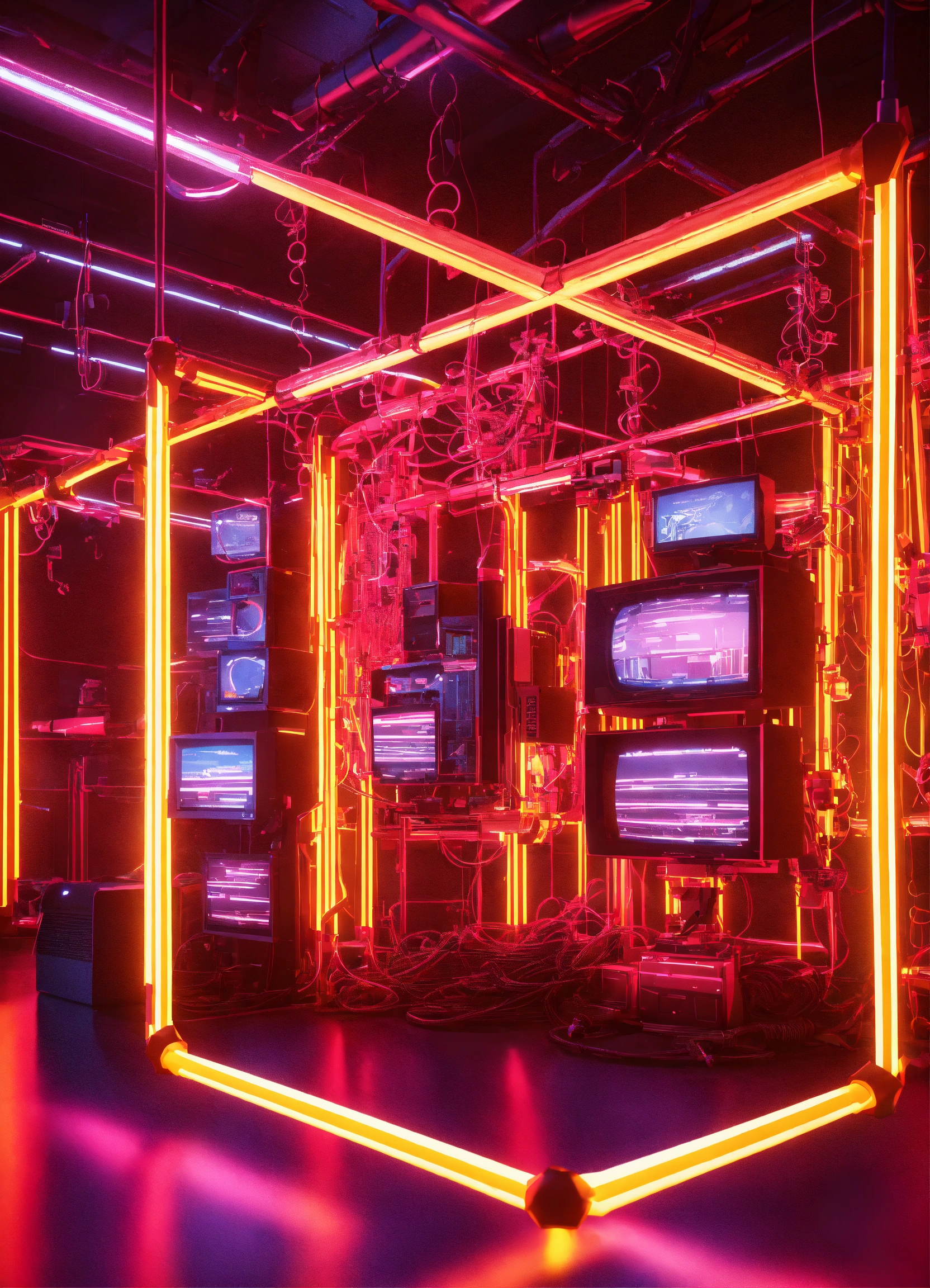 A futuristic 3d scene of retro different sized monitors hanging from the ceiling wrapped with large fluffy pipe cleaners, vector glowing pipe cleaners, trending on artstation, octane render, cinematic lighting from the right, hyper realism, octane render, 8k, depth of field, 3d