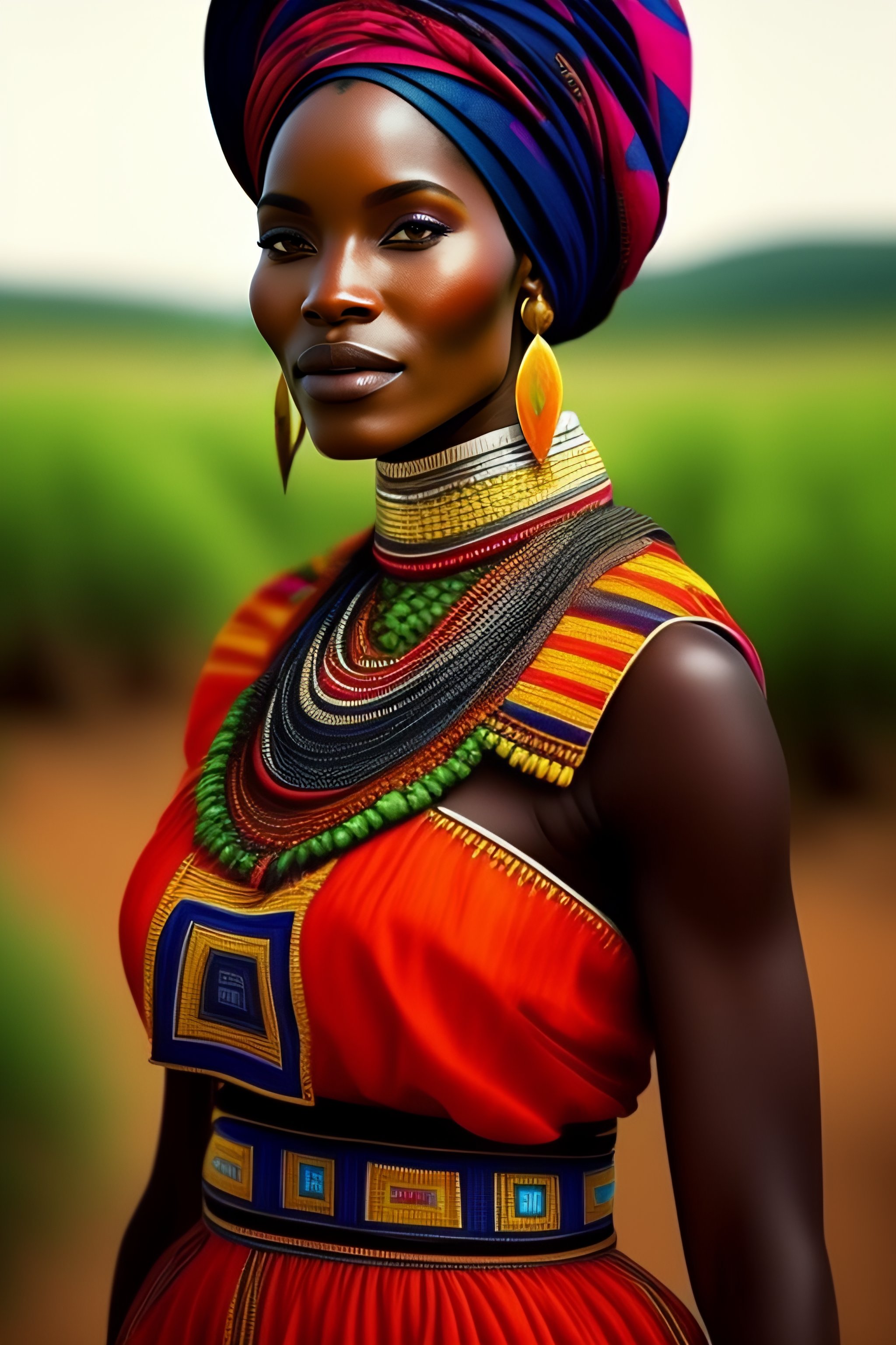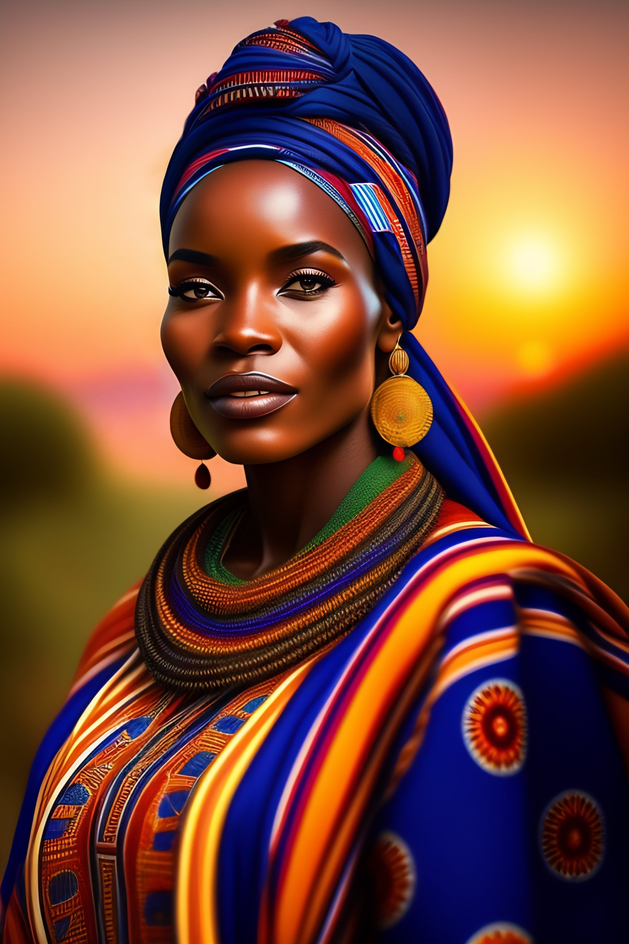 Create an image of a rural african woman wearing traditional clothing. the woman should have dark skin and short, black hair. she should be wearing a brightly colored headwrap and a flowing, patterned dress. the background should be a rural african village, with mud huts and lush greenery. include details such as baskets of produce and traditional cooking tools. the overall look should be vibrant and full of life, photorealistic, high definition