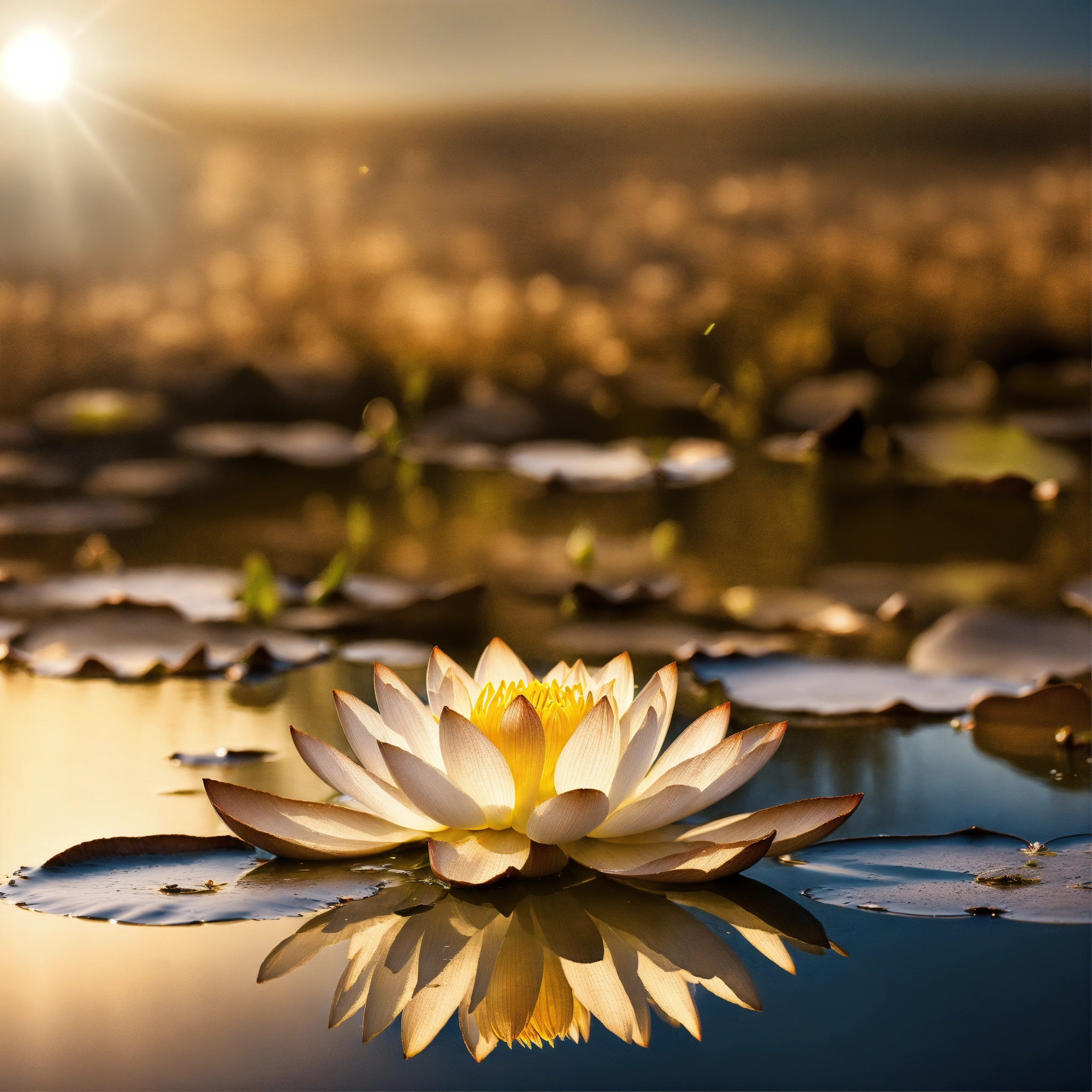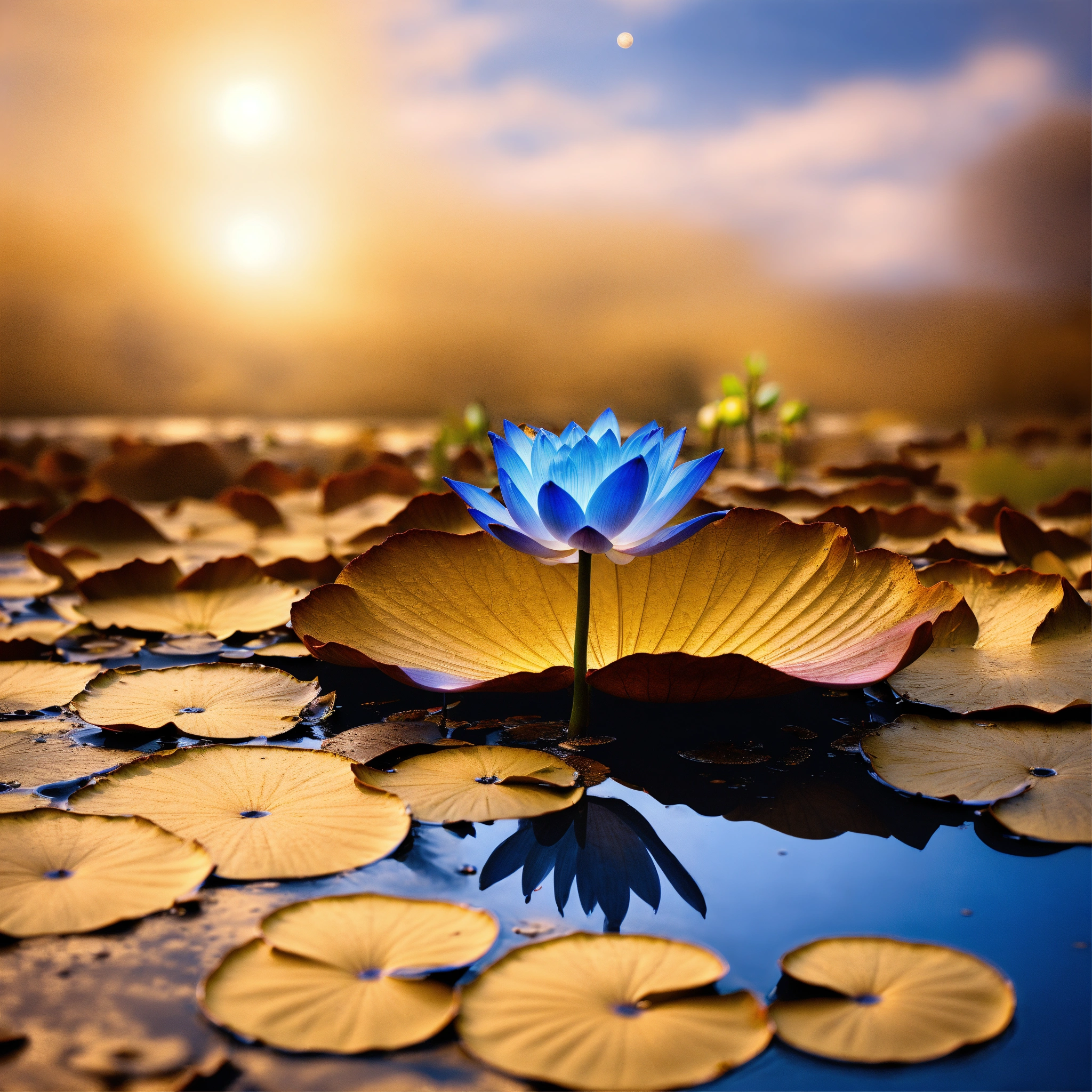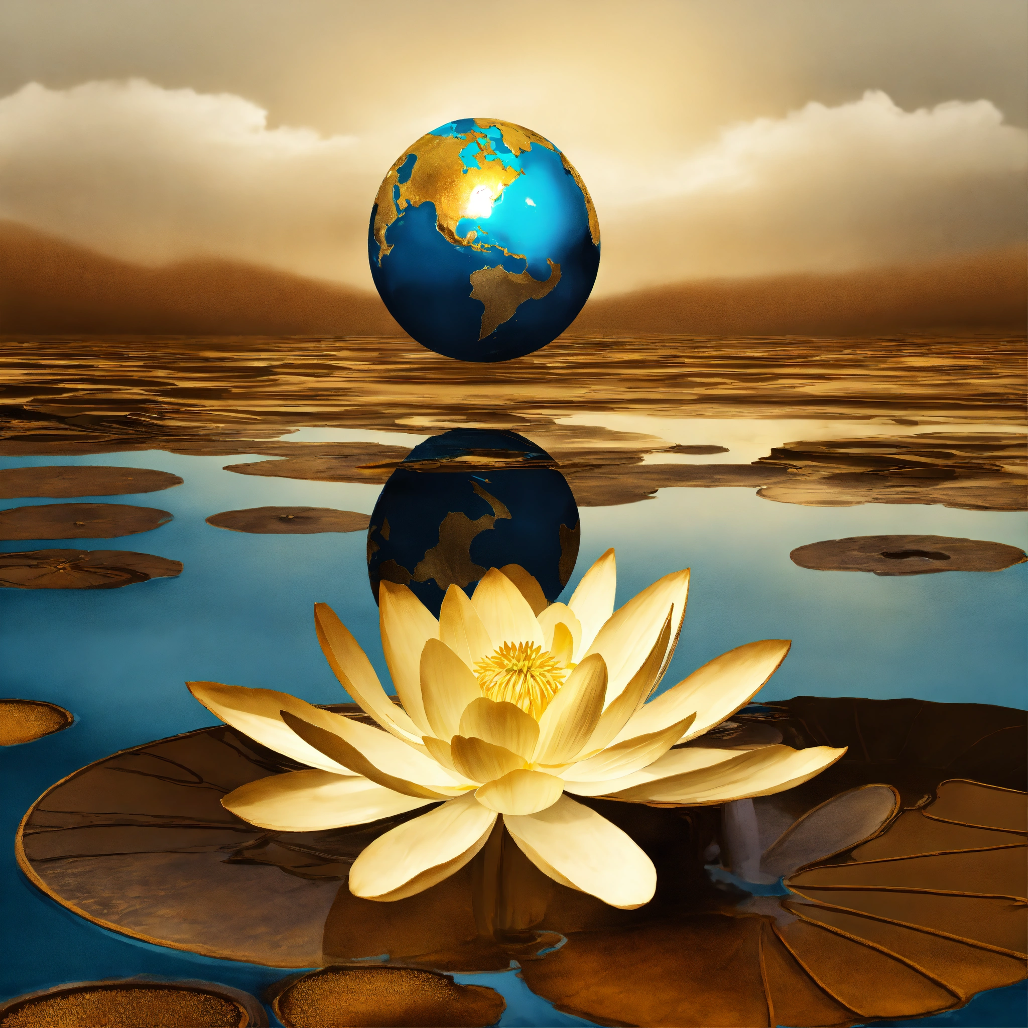 Create png clip art of blue gold and sepia tone lotus flower in a pond reflecting a melting planet earth