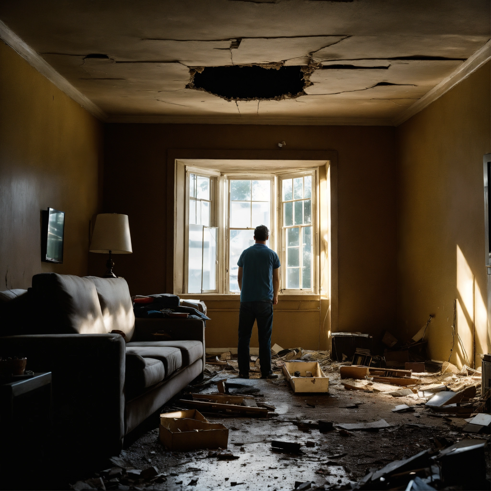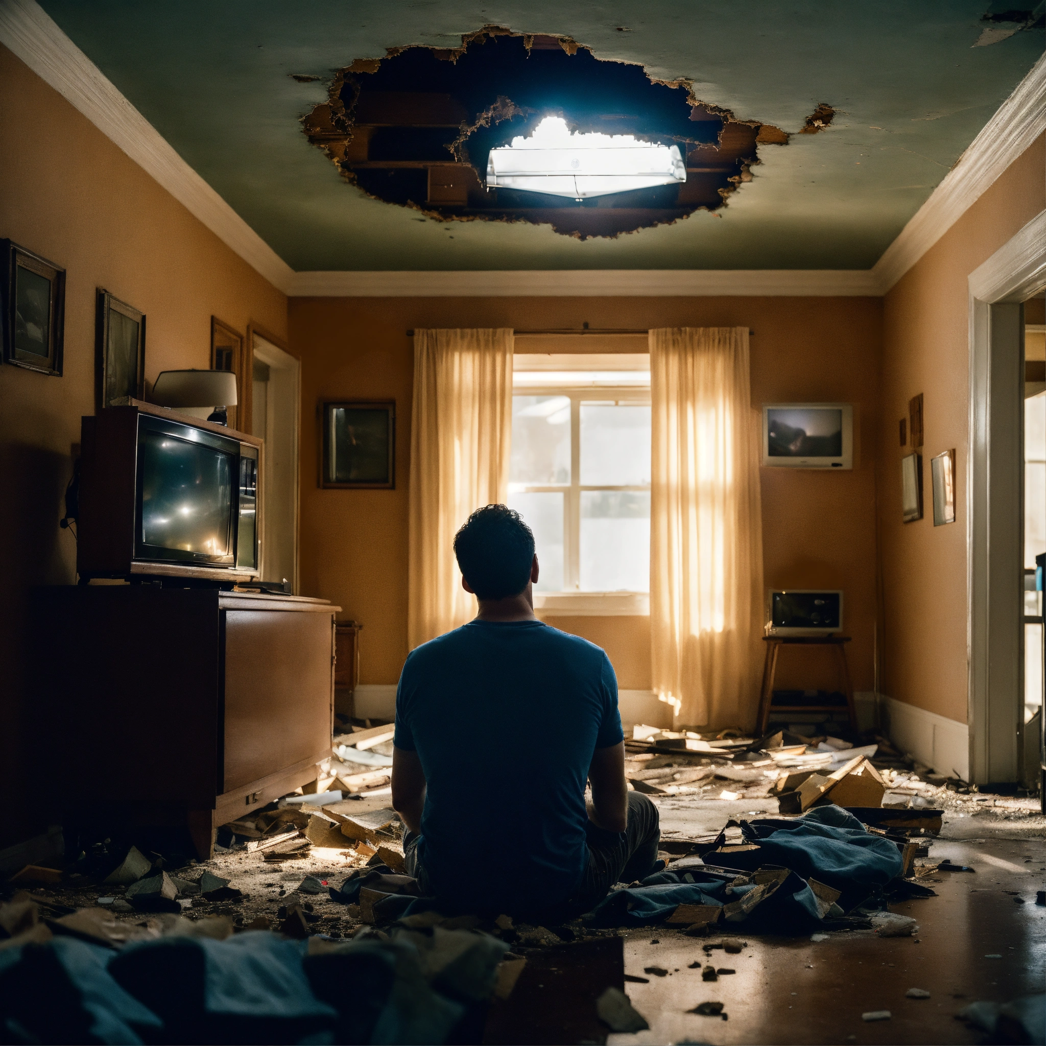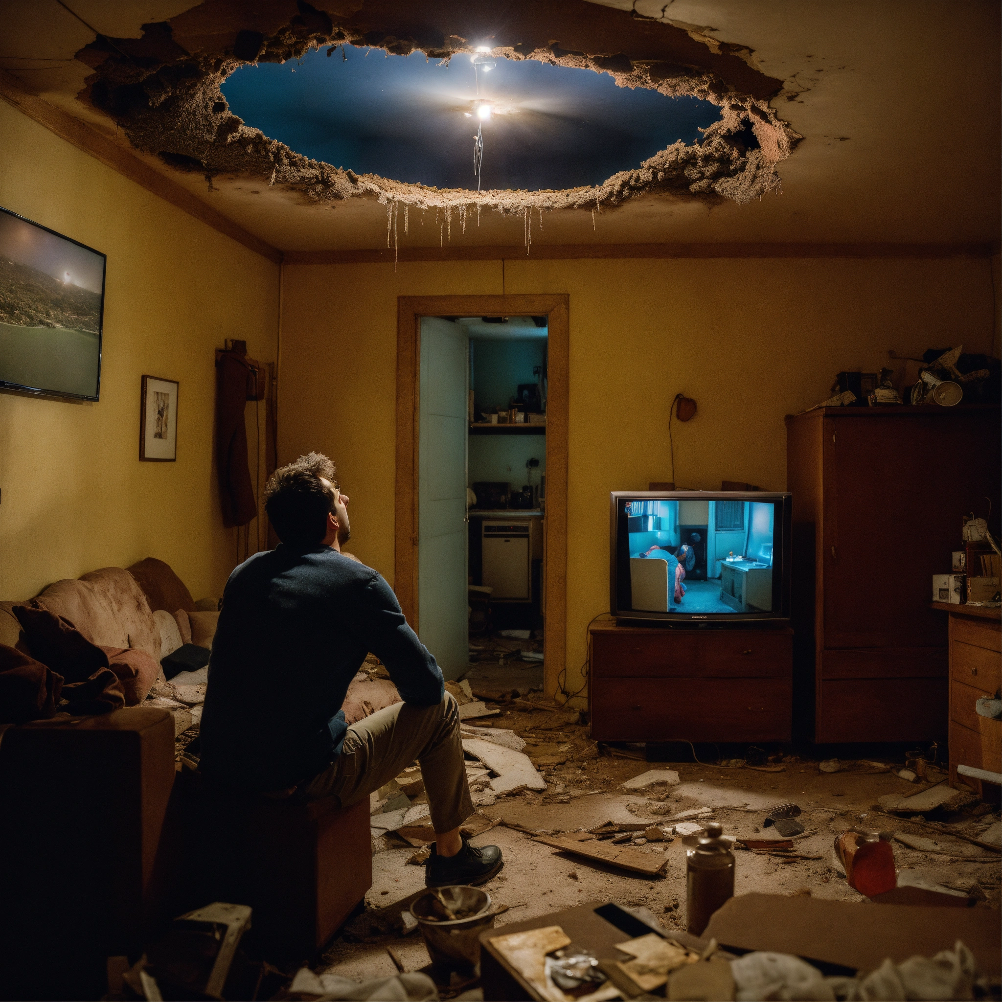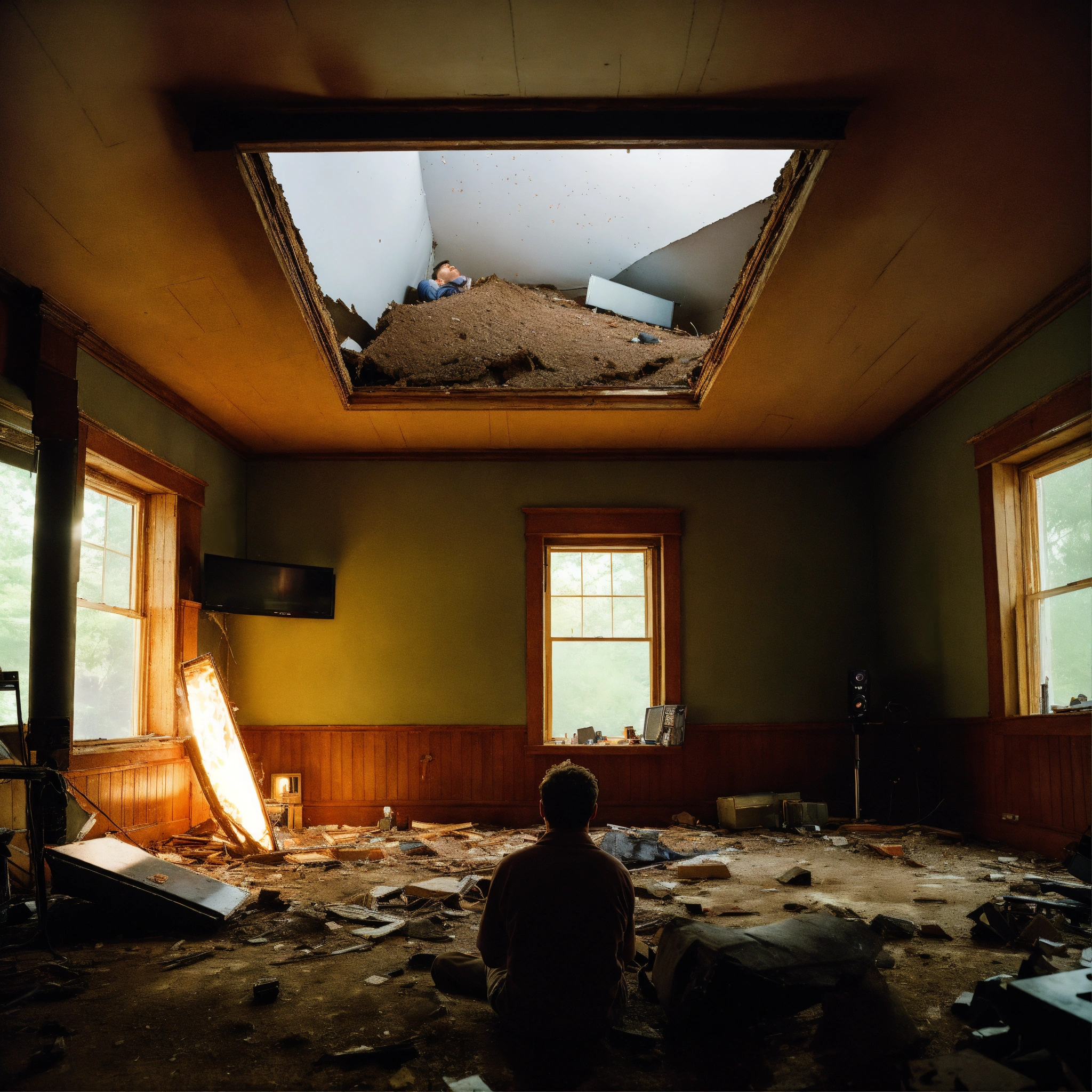 Cinematic photograph of a collapsed covert narcissist looking up into a large hole in the ceiling in a dingy living room, the man is lit by the light of a tv which is out of view, gregory crewdson style photography