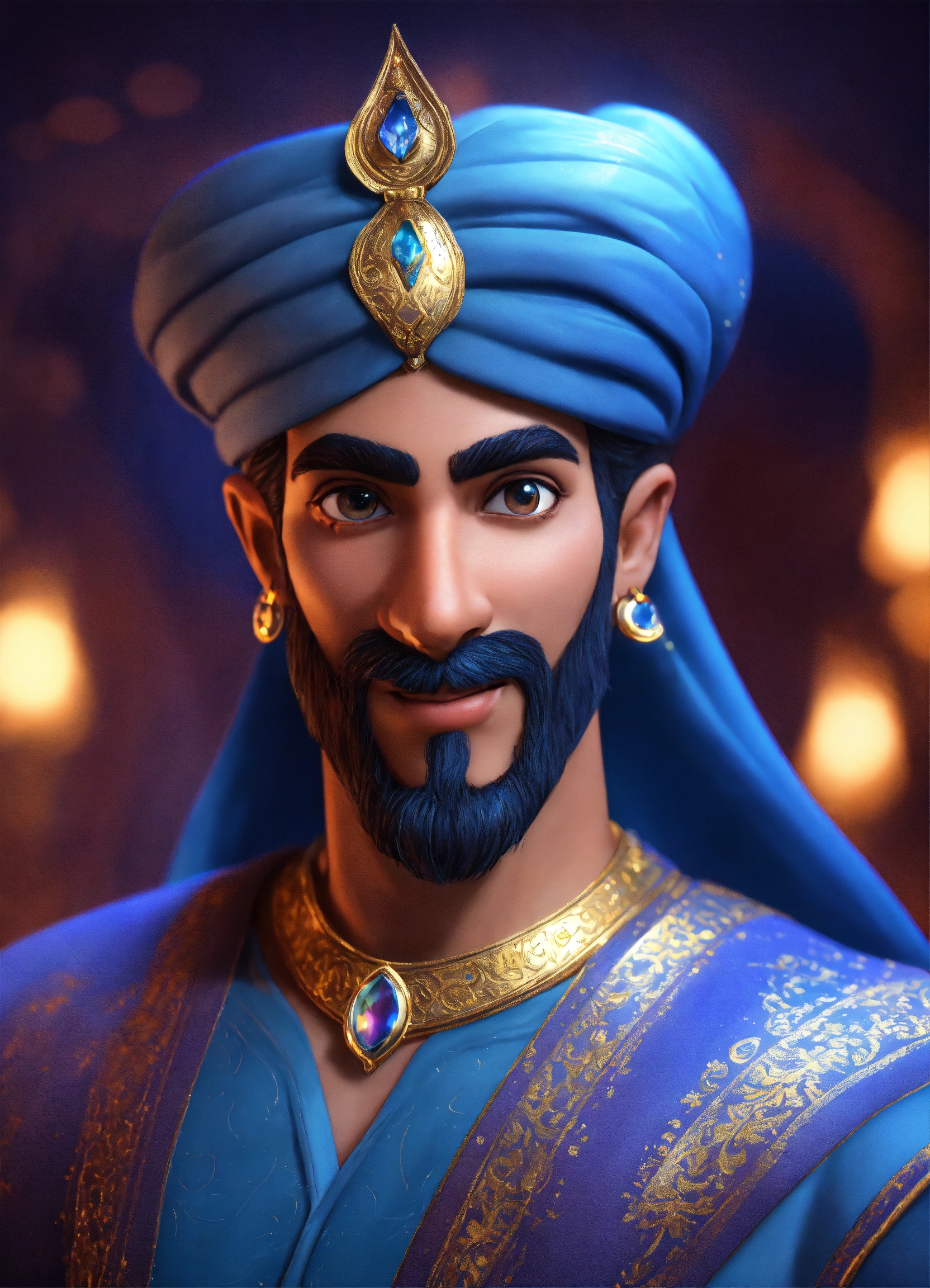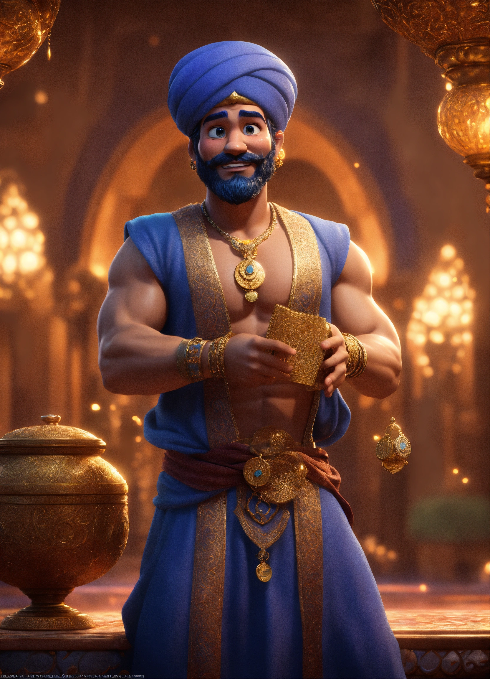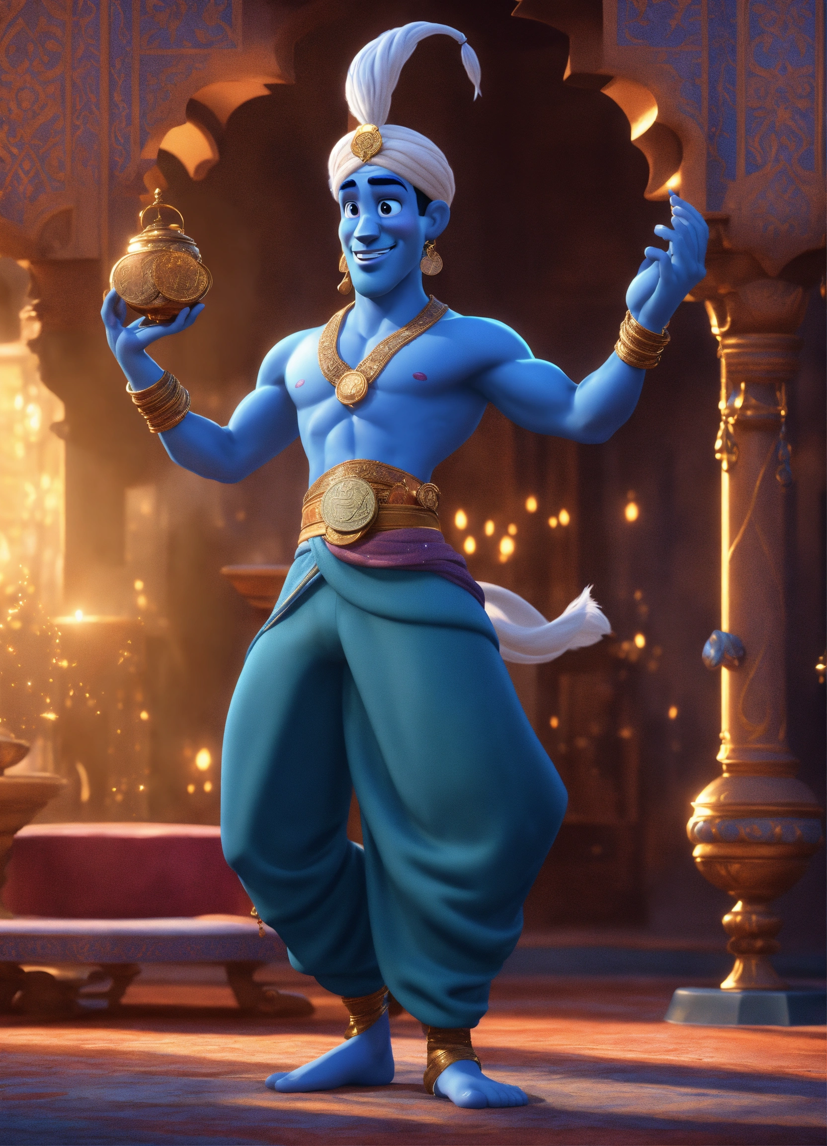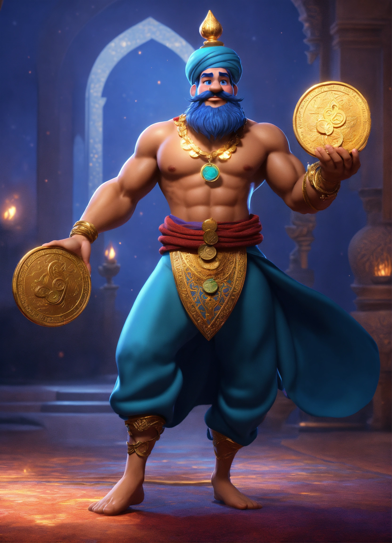 Create a 3d rendering of a magical blue arabian male genie inspired by the disney animation style. the genie must have blue skin, a playful but wise personality, and the ability to swim or fly. place your character in the atmosphere of arabian nights and aladdin. the image must be in high resolution format. dynamic pose from the waist up, he holds coins in his hands in front of him (pixar art style)++ highly detailed digital painting, art stations, concept art, soft focus, hard focus, illustrations. cinematic, visual effects, hdr, unreal engine 5, ray tracing, soft light, 8k, high detail, sparkling backlighting, luxury gem, game art, 3d, cartoon, colorful, magical, mysterious
