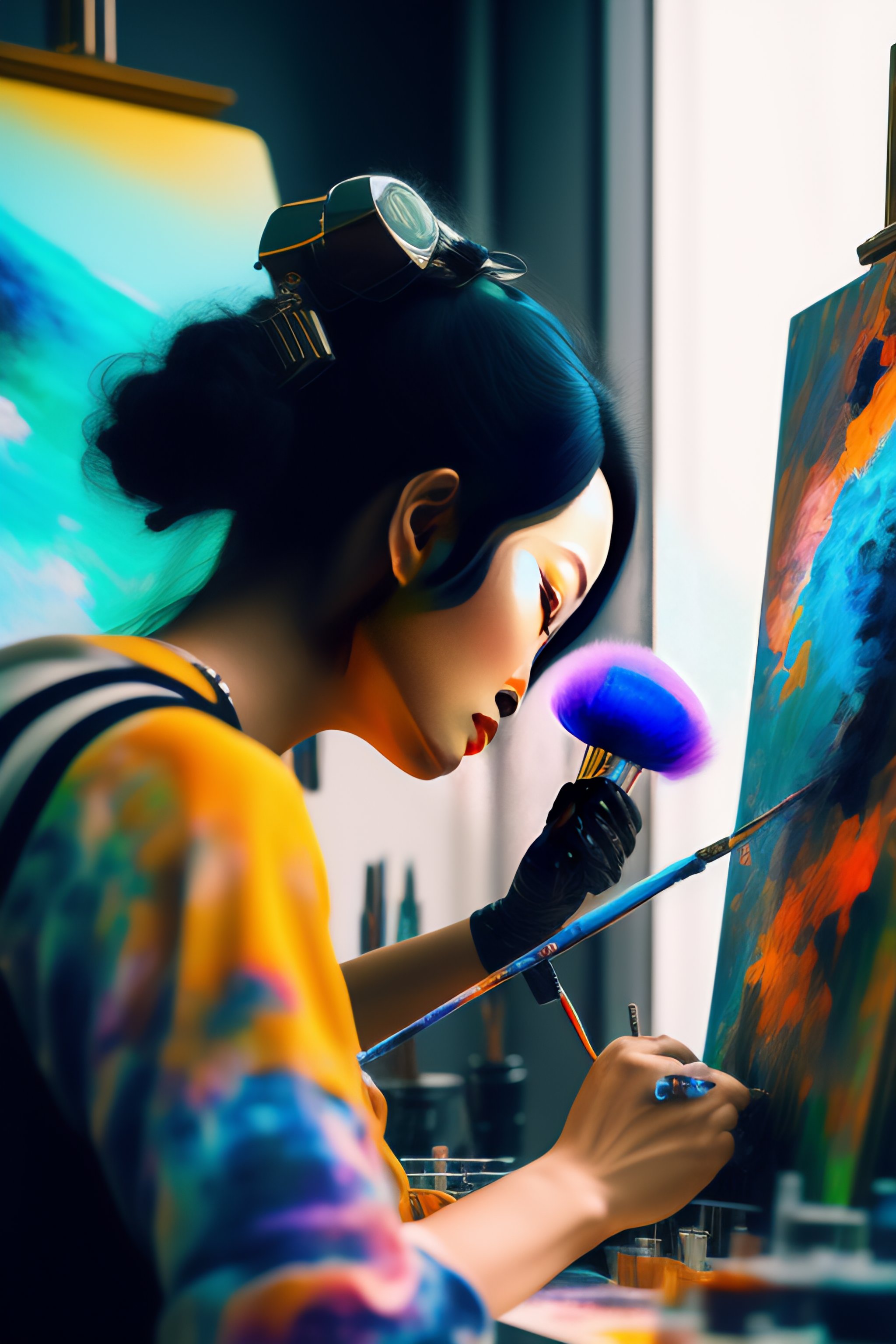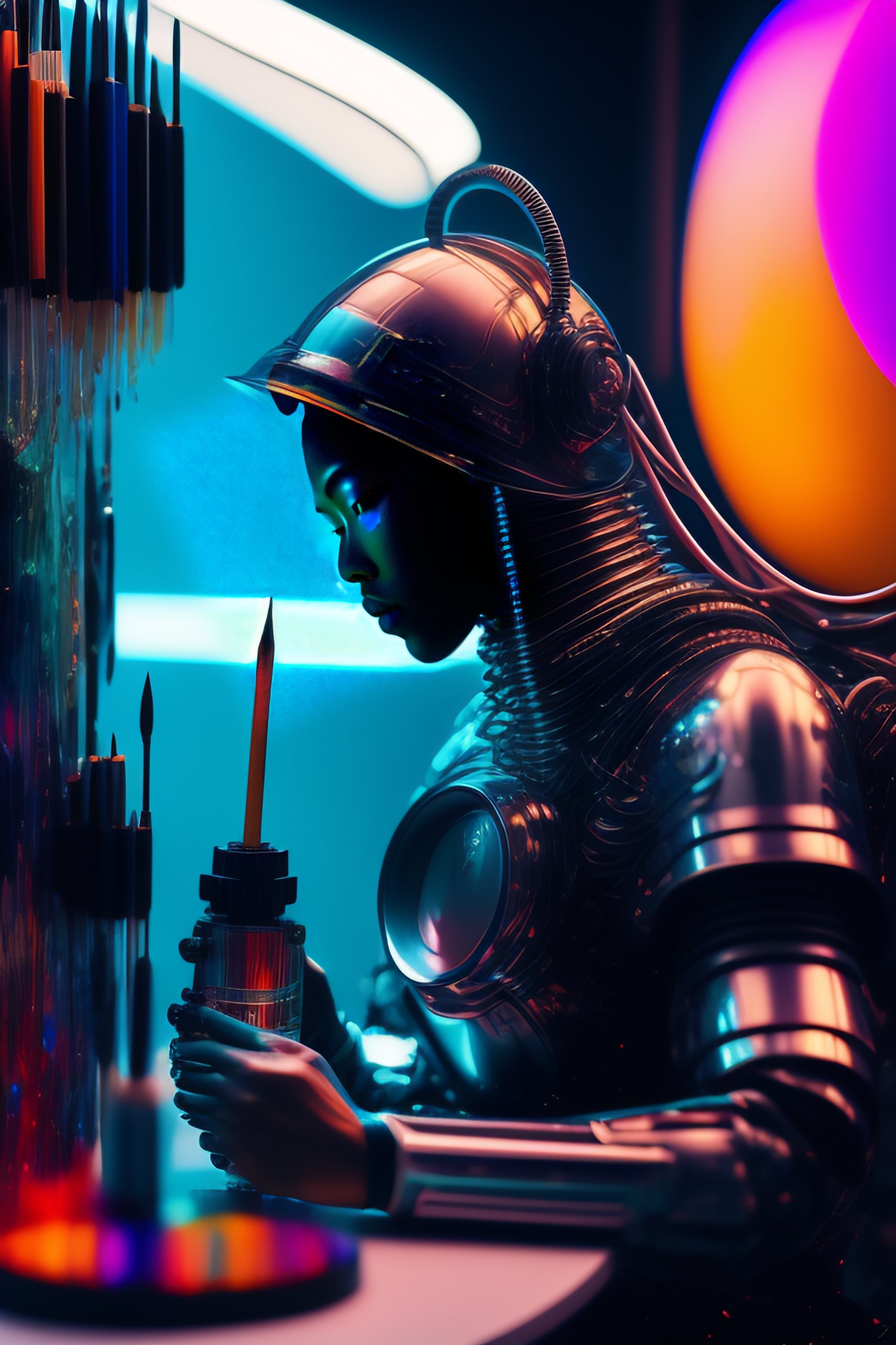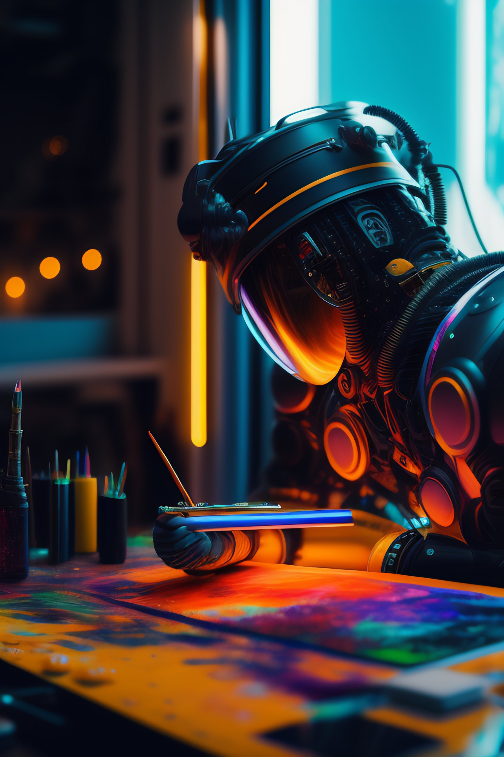 Photo of futuristic holy futuristic cyborg - robot - painter - artist creating a painting with acrylic paint and brushes in a futuristic artist studio by h. r giger, by, rich deep colors. masterpiece, intricate artwork by tooth wu and wlop and beeple, gaspar noe, james cameron