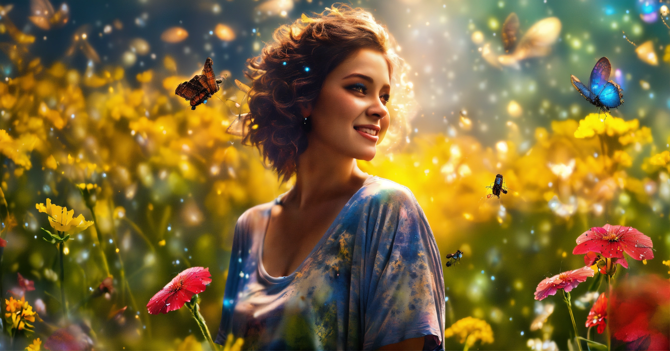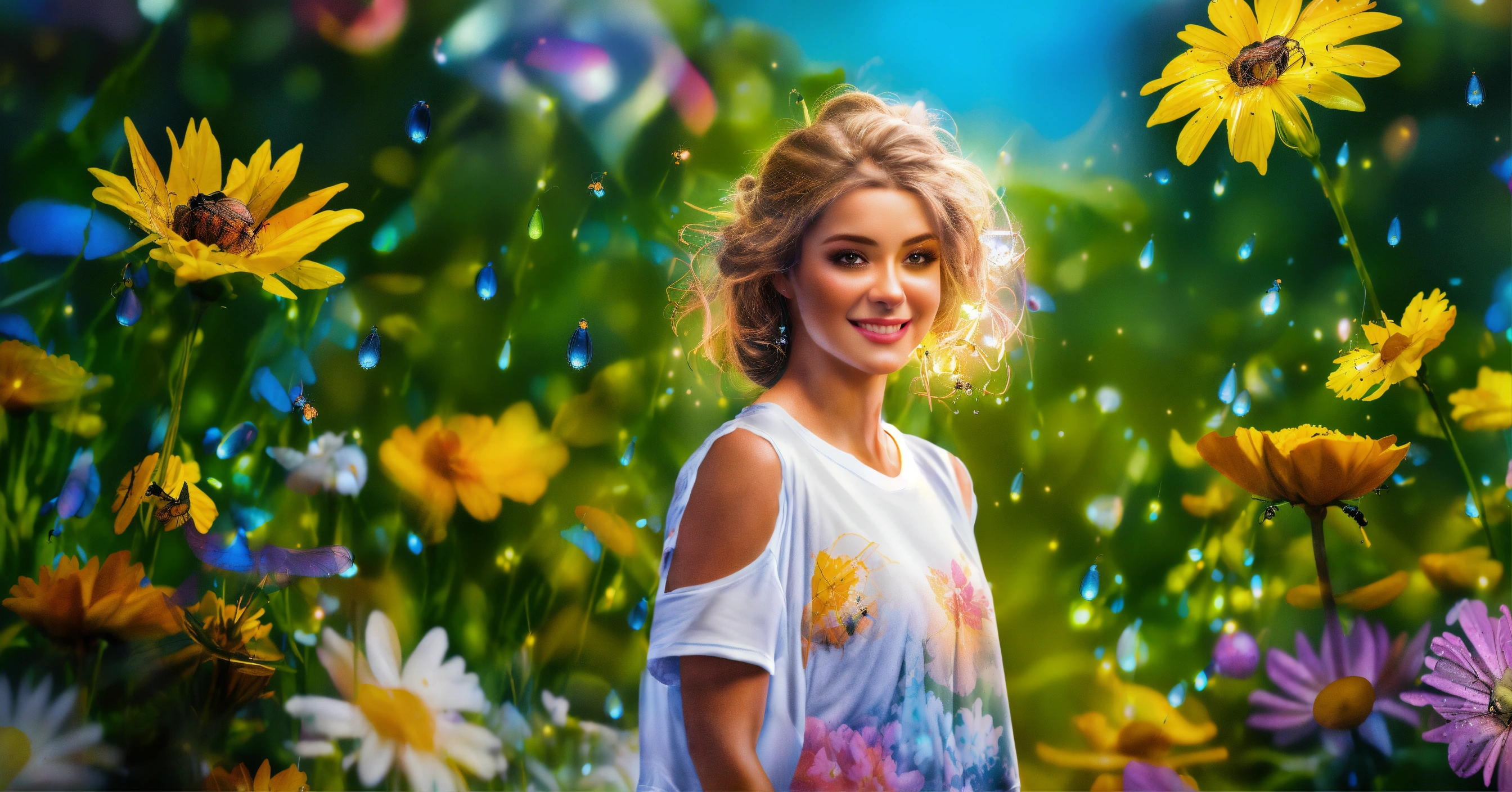 "a happy woman has pretty eyes and poses as a model. he wears (((he wears an oversized t-shirt printed with many beautiful pictures, stuffed animals, flowers, drops and fireflies))) with a white background. masterpiece, best quality, high quality, high resolution, amazing lighting, detail enhancement, the most beautiful picture in the world, 8k resolution, amazing inspiration, hd., extremely detailed cg unity 8k wallpaper, high detail, photorealistic painting art by midjourney and greg rutkowski, matte, bryan organ
