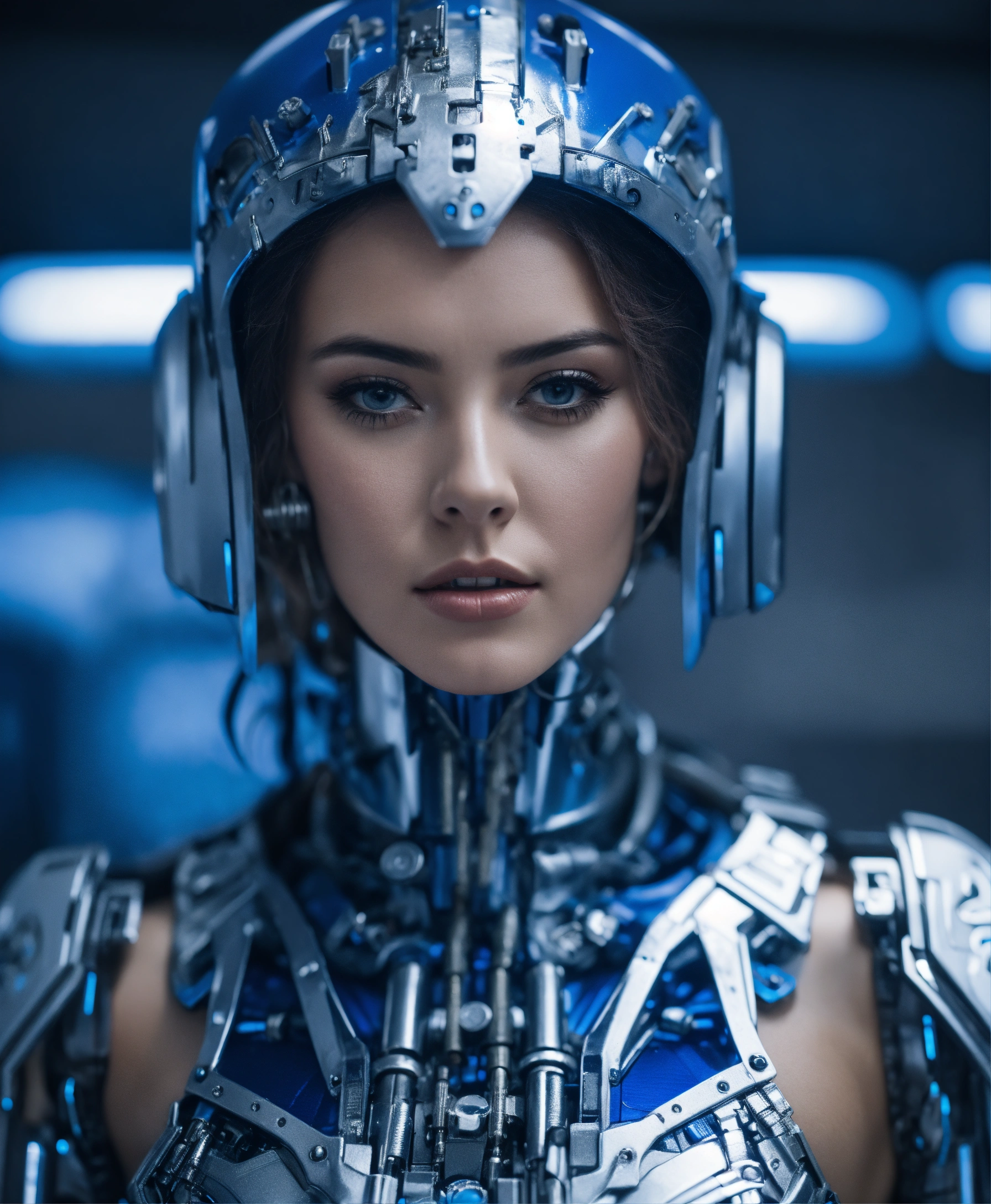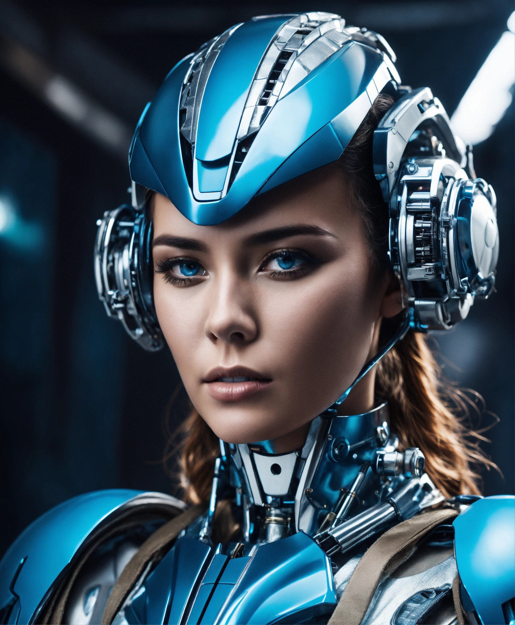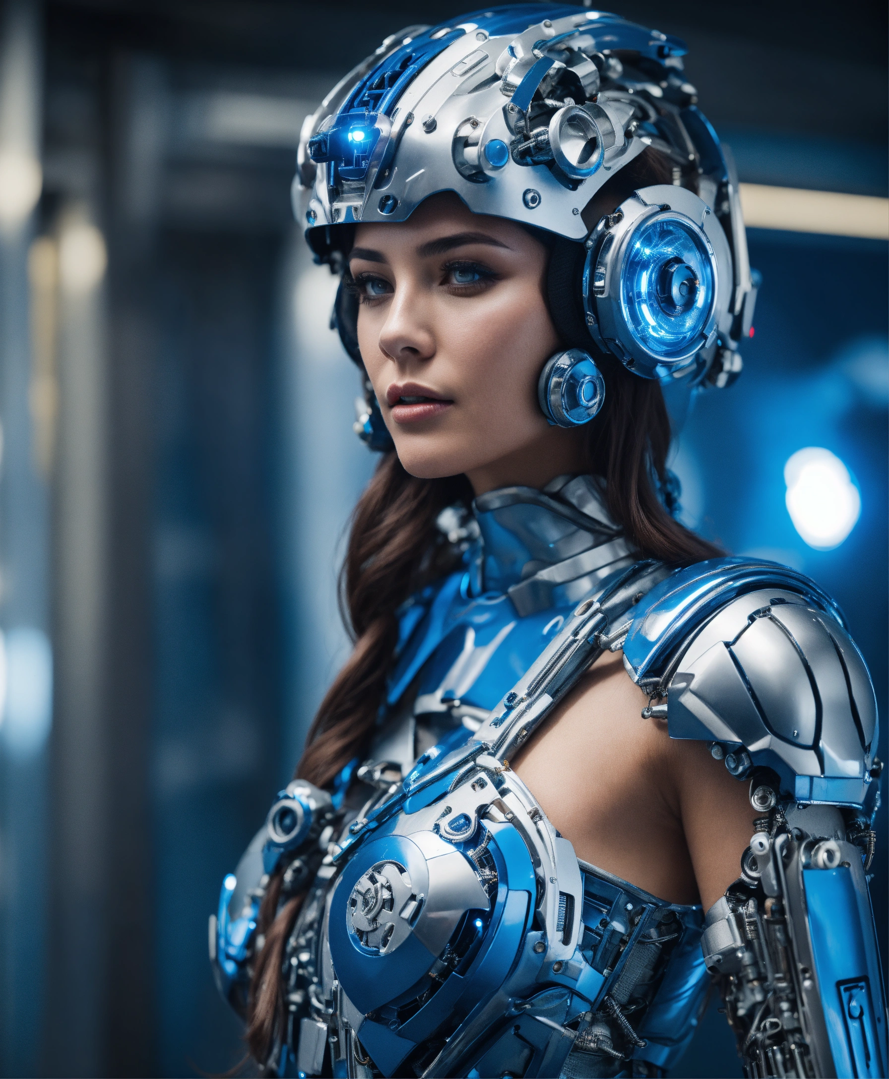 Upper body of a cyborg woman in blue and silver mechanical dress with a helmet