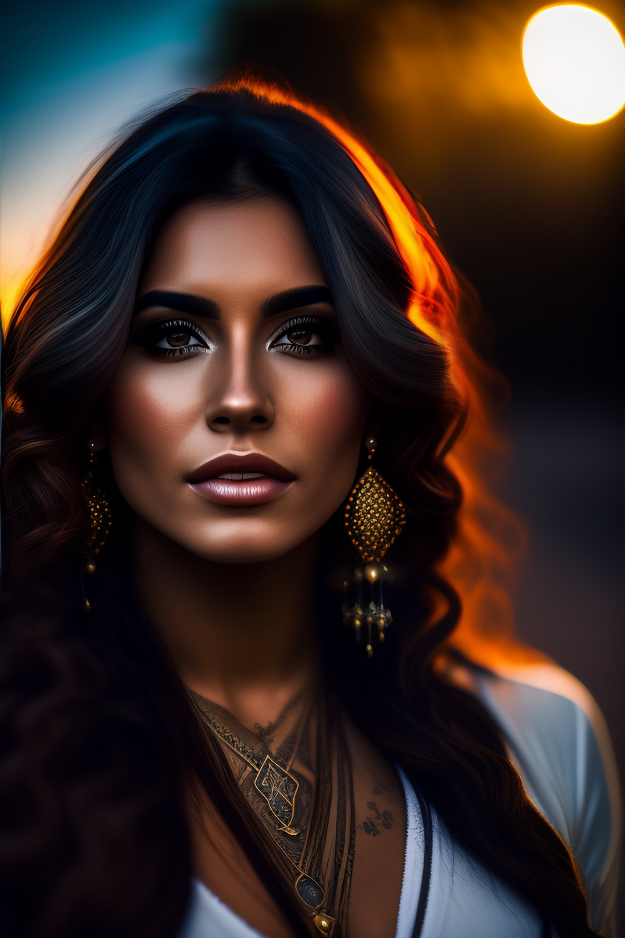 Highly detailed photo of a beautiful hispanic female with long hair, piercings, metalhead style, behind a natural moon light, wide shot, symmetric realistic texture, leica 75mm, f/1.25