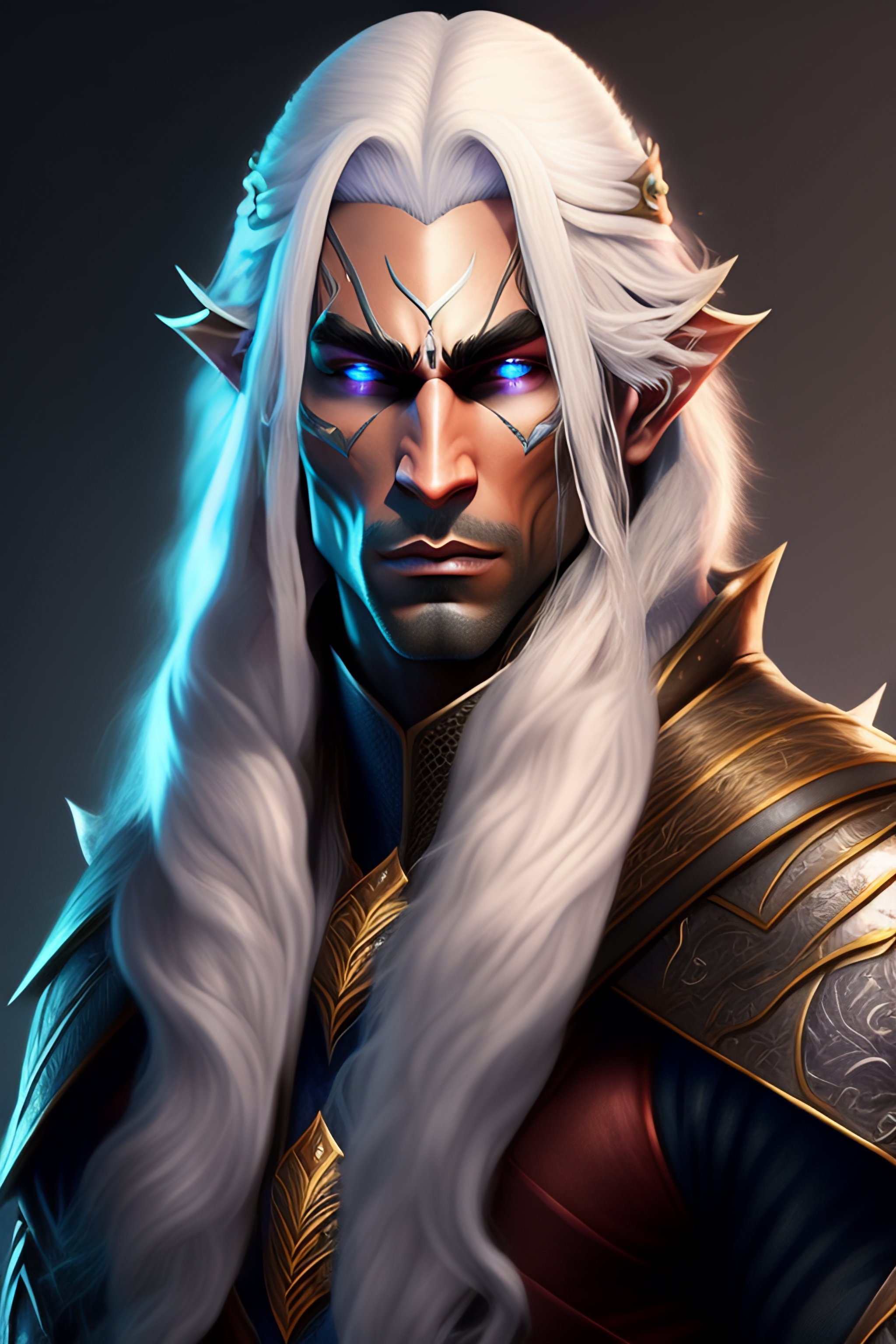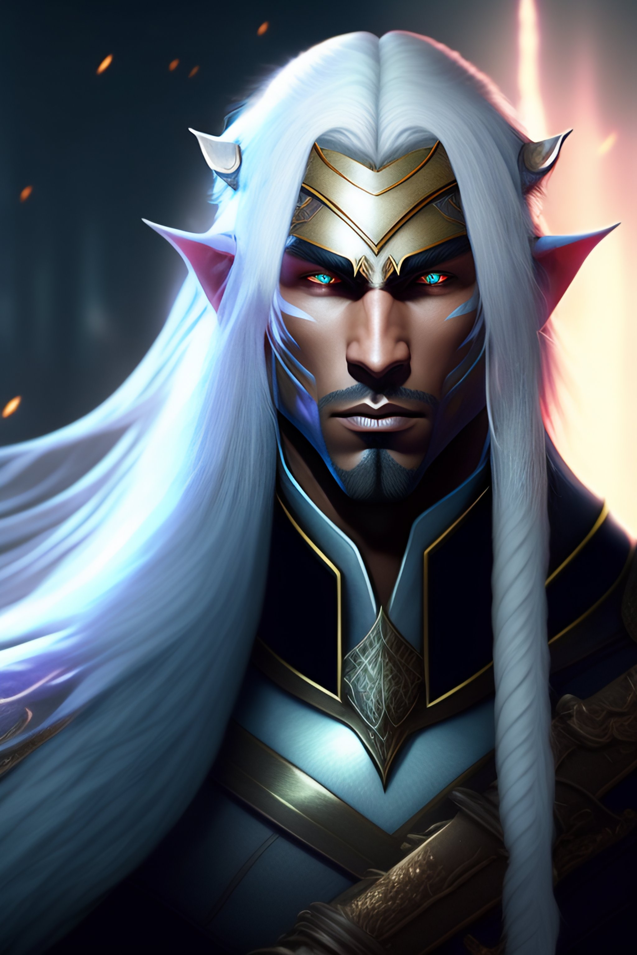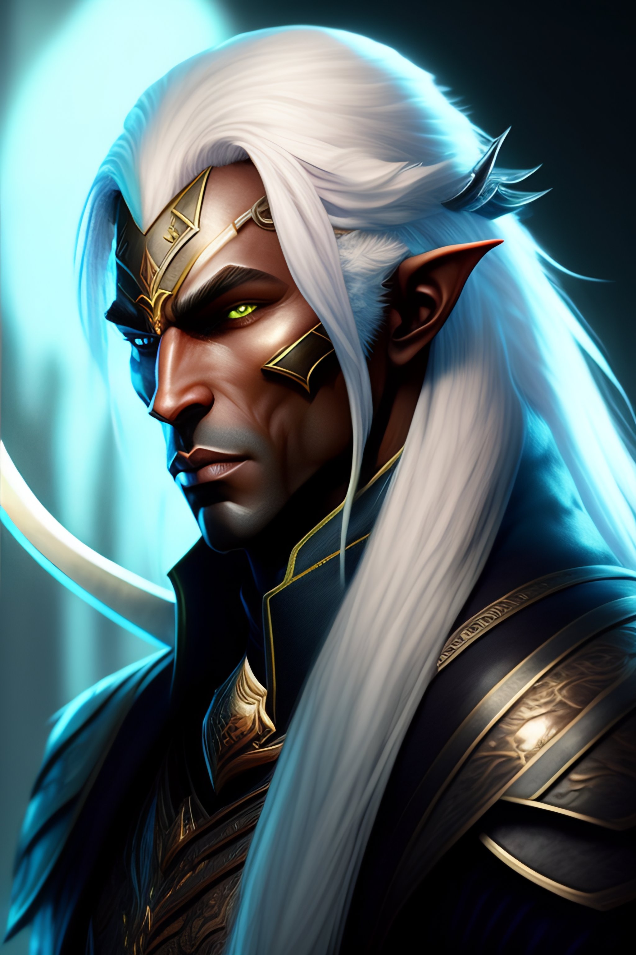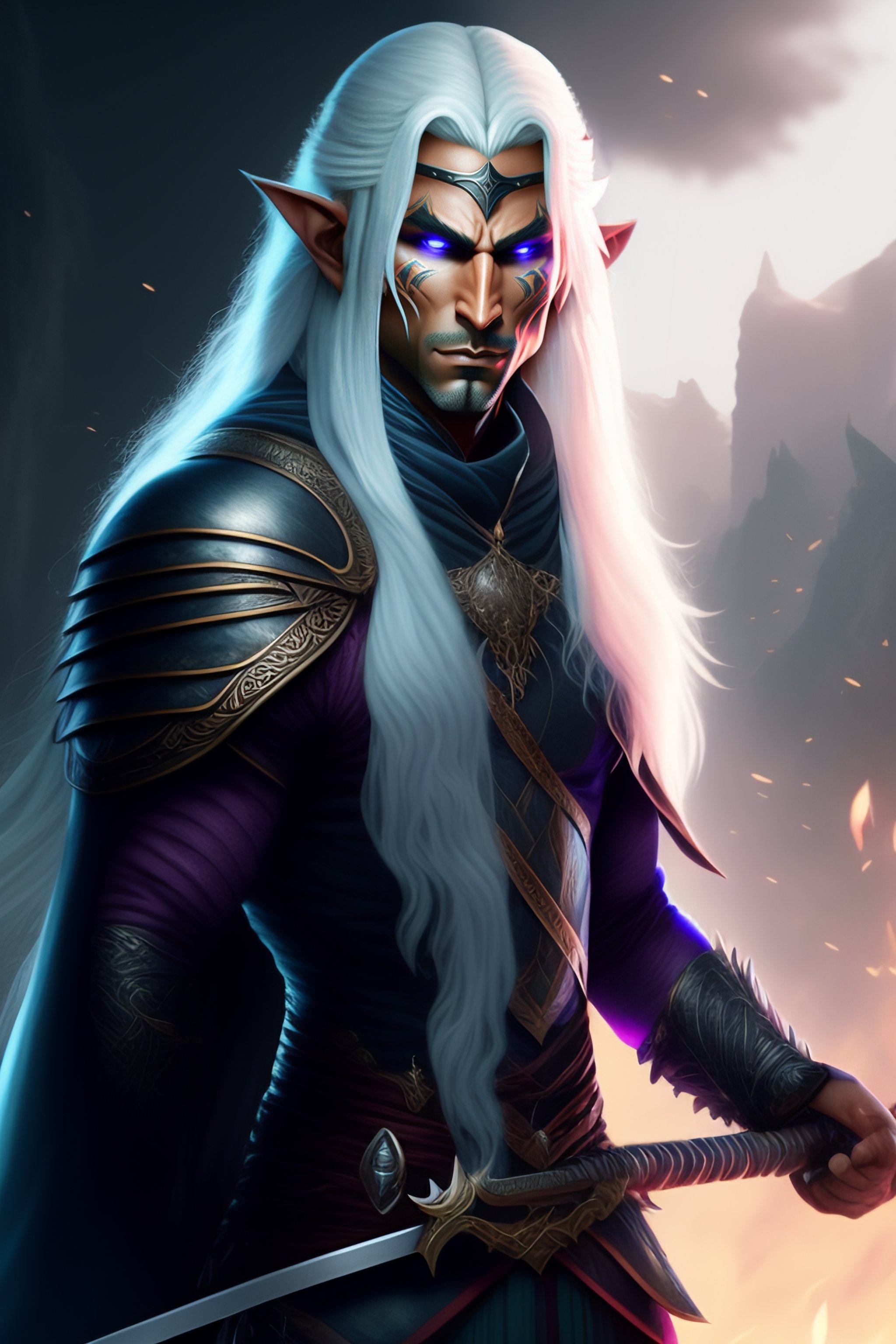 Male drow elf rogue, long white hair tucked behind ears, magical right hand/forearm holding black katana
