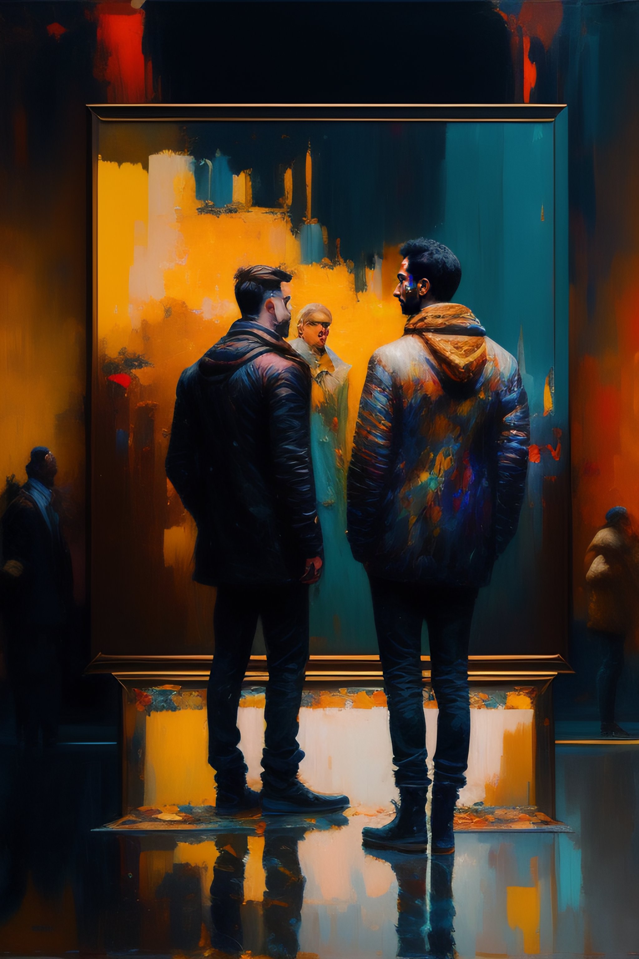 A beautiful glitched painting by robert proch of people in front of a painting in a museum gallery, metal rust and plaster materials, pixel sorting, color bleeding, brushstrokes by jeremy mann, still life, dark colors