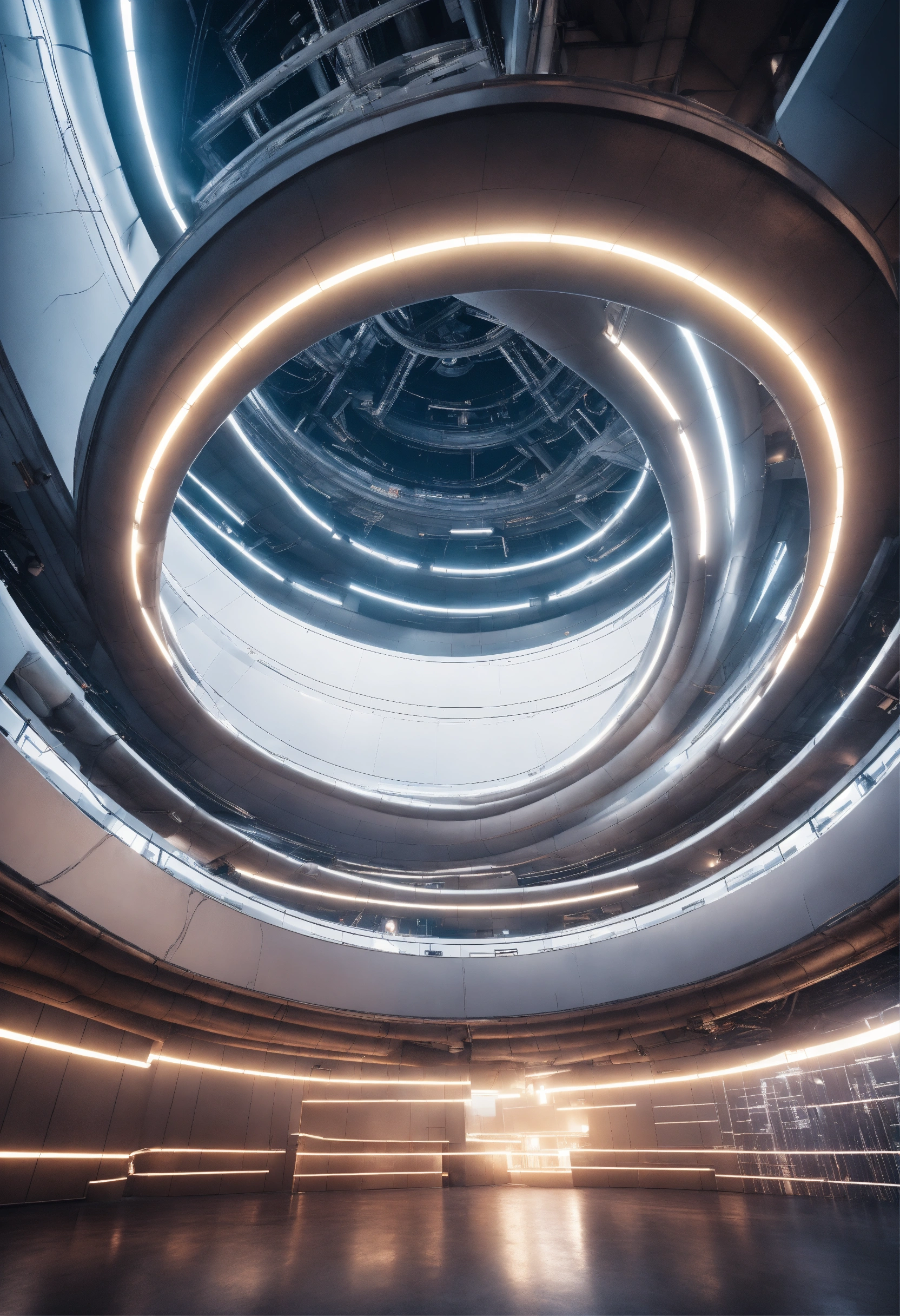 A realistic, highly detailed photo of a colossal very big huge futuristic obstacle course spiraling upward on the wall of a huge, sci-fi, futuristic, cylindrical-shaped, metal-walled, non-visible ceiling, white lighting, hyperrealistic, 8 k