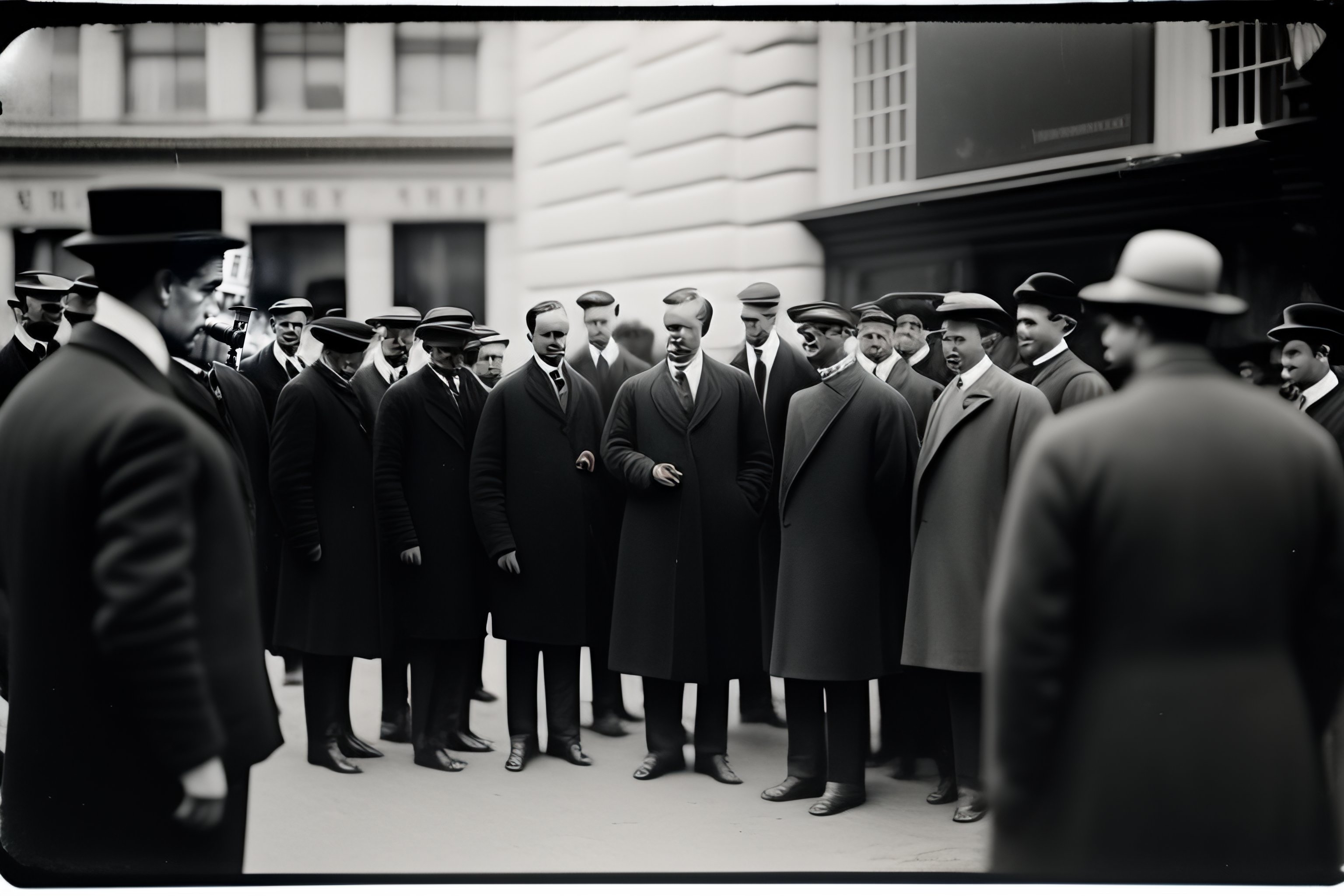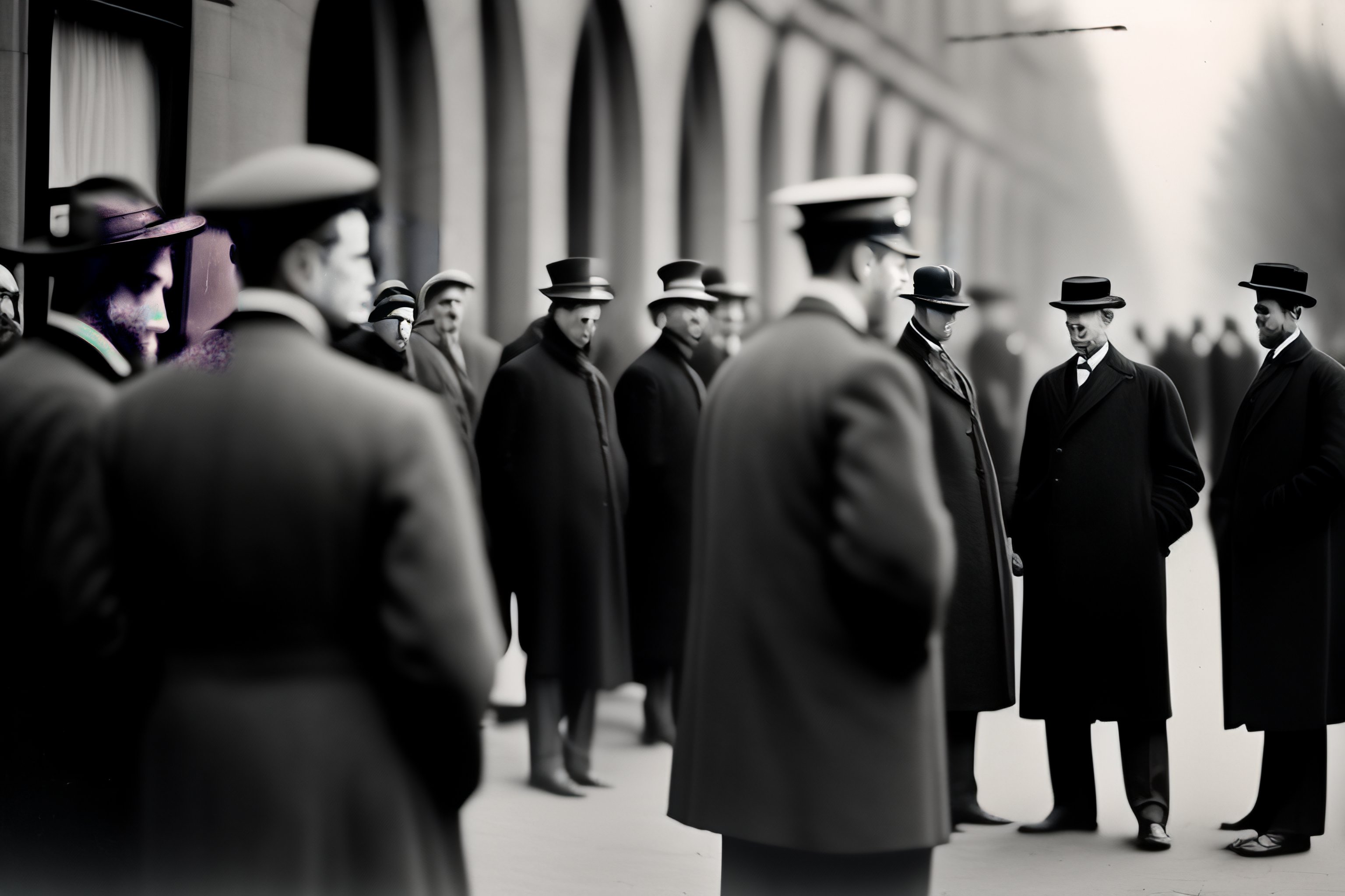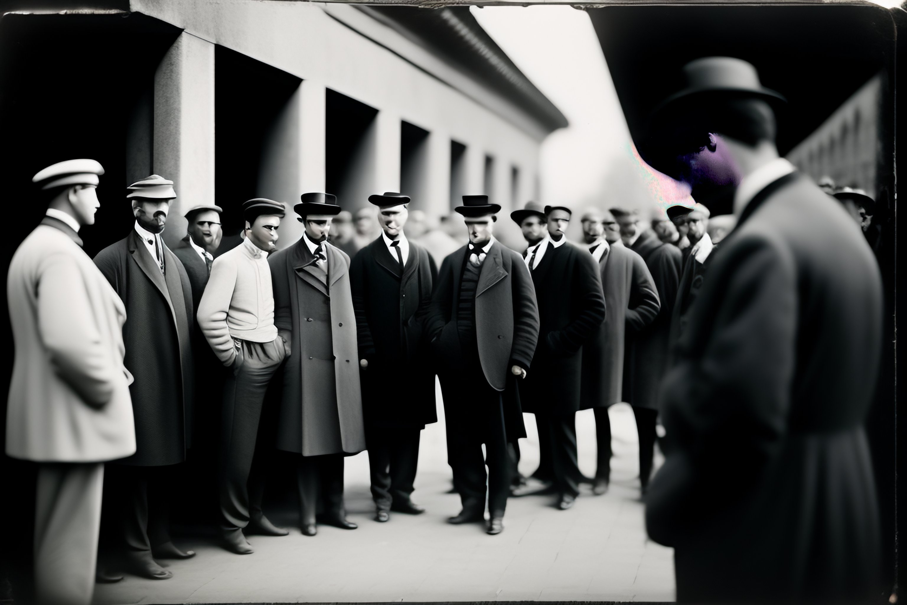 Old black and white photo, year 1910, there is a group of man and one of them talking on mobile phone, people around look at him amazed, high quality damaged photography