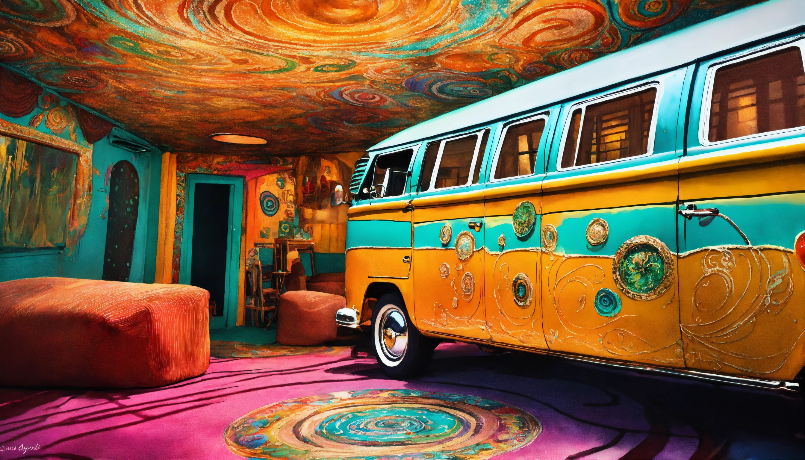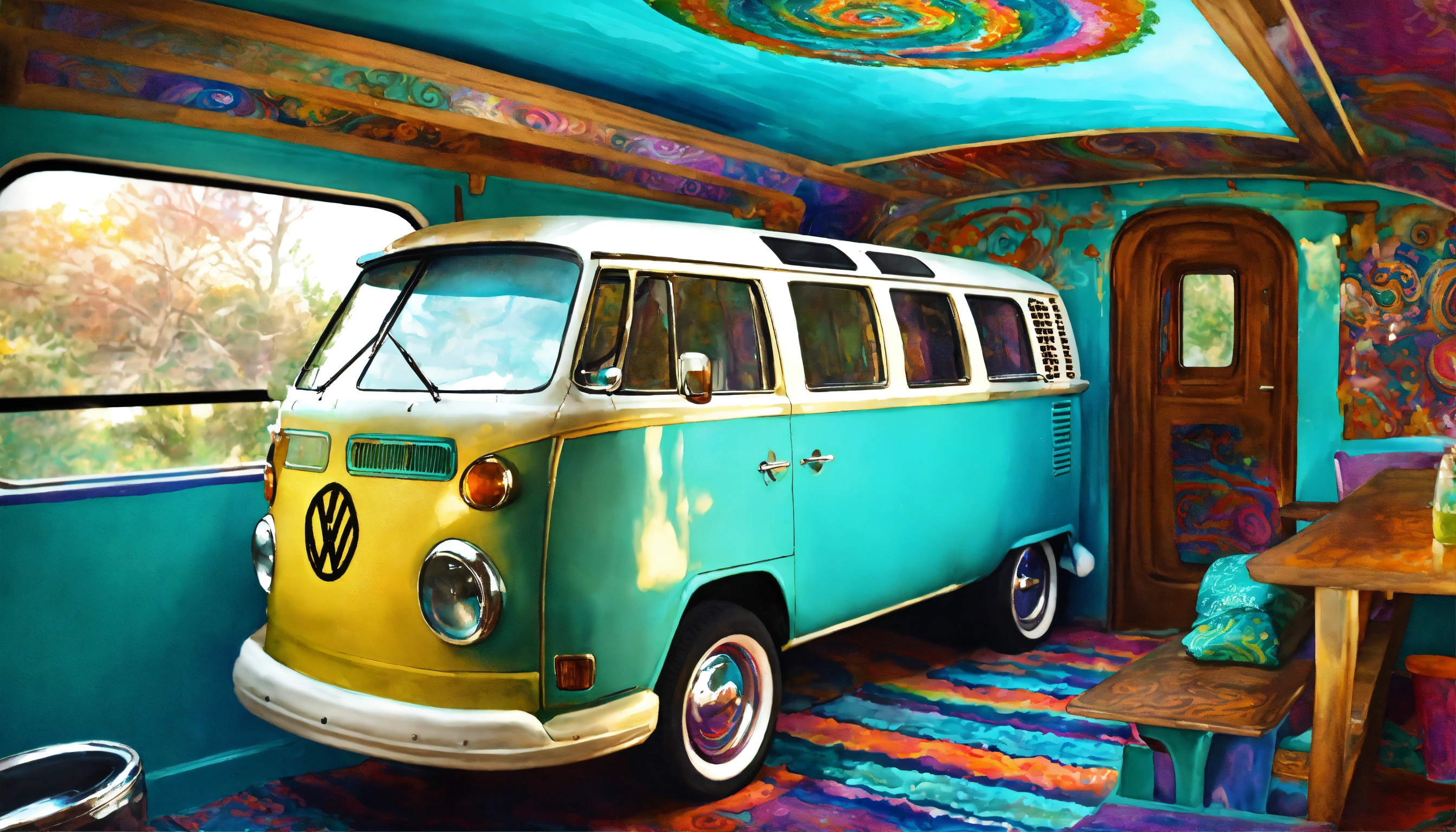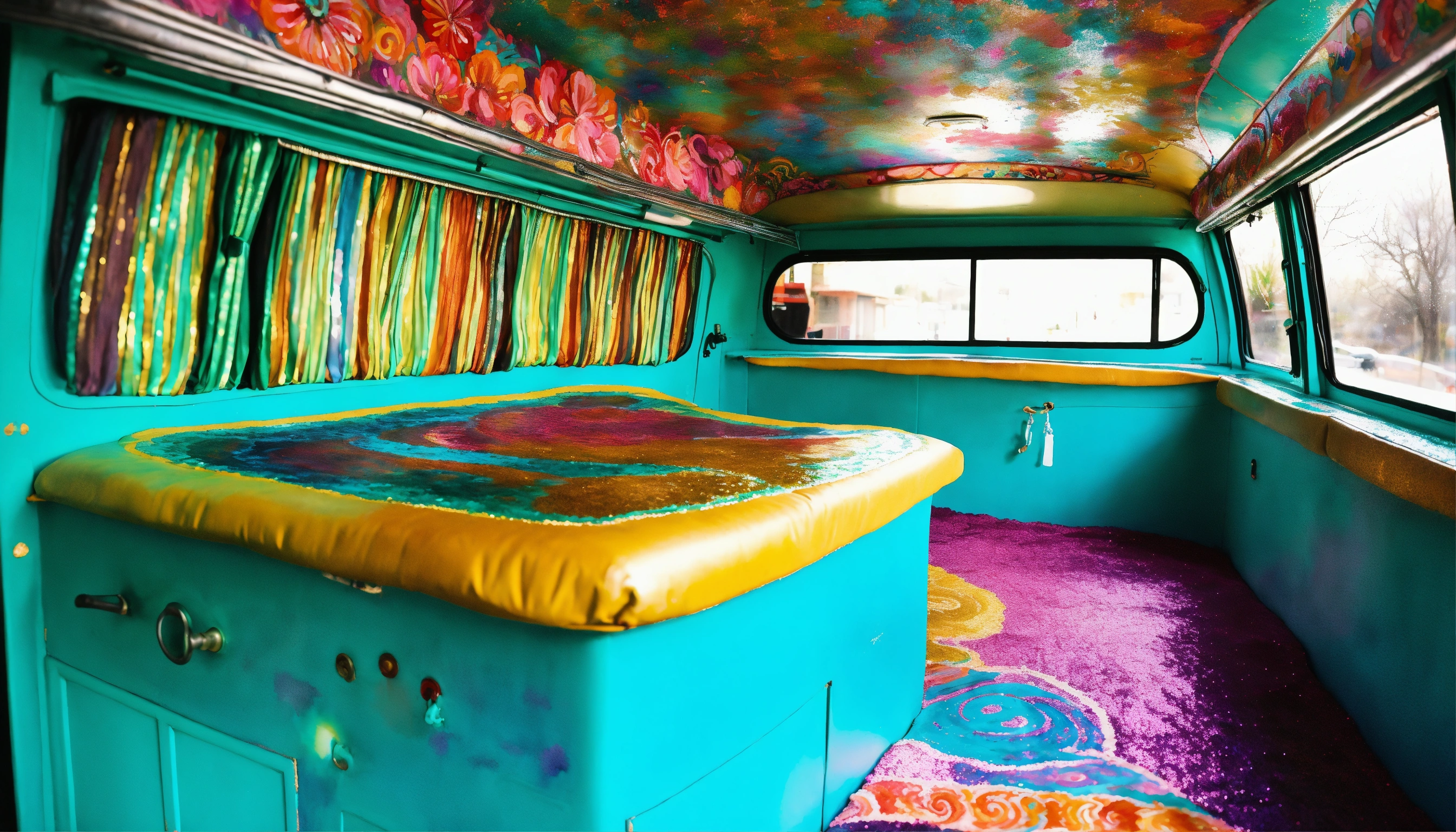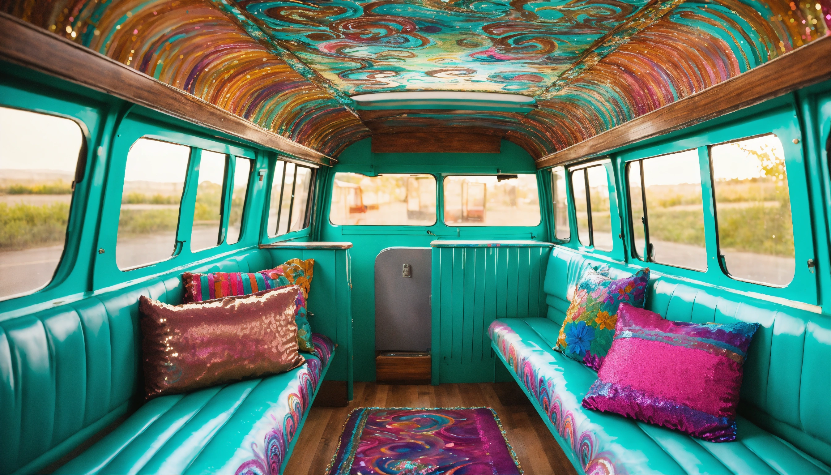Concept art of inside of a hyper realistic turquoise volkswagen bus, painted walls and ceilings, personalized, girly, feminine, handpainted watercolor swirls, artsy, boho, hyper realistic, realistic, hyper realism, painted, symmetrical, unique, vintage, hippie, view from inside, colorful swirls, hyper realistic image, beautiful painted abstract swirls on the inside wall, bohemian, decorated, perfect, sequins, glitter, glitter swirls, beautiful colorful embroidered sequin tied back curtains on windows, turquoise, detailed, intricate, sparkle, artsy paint, personalized van, multicolored, colorful, hippie, boho bus, interior, benches, van benches on the sides of the walls, seatbelts, empty space in the middle