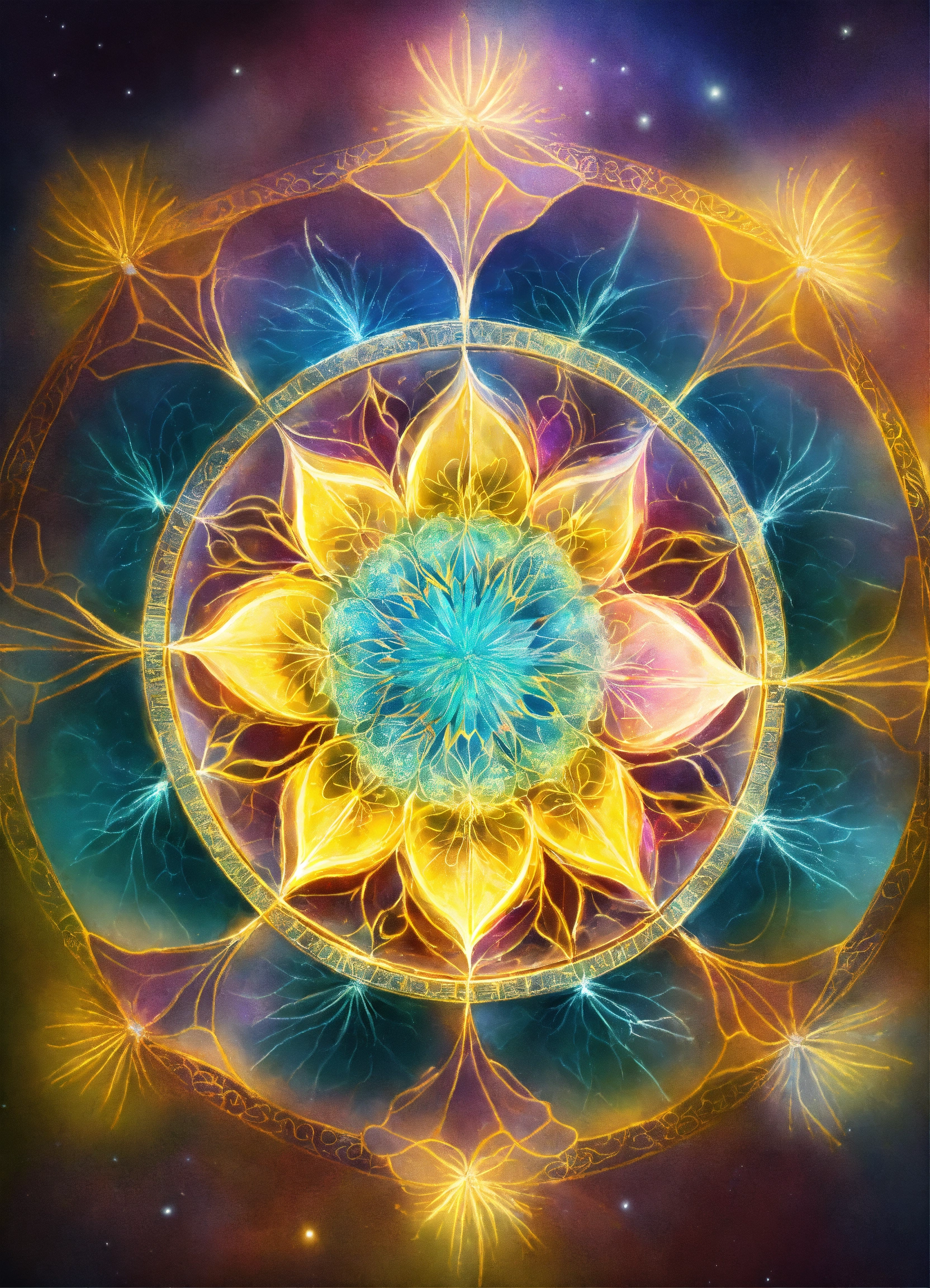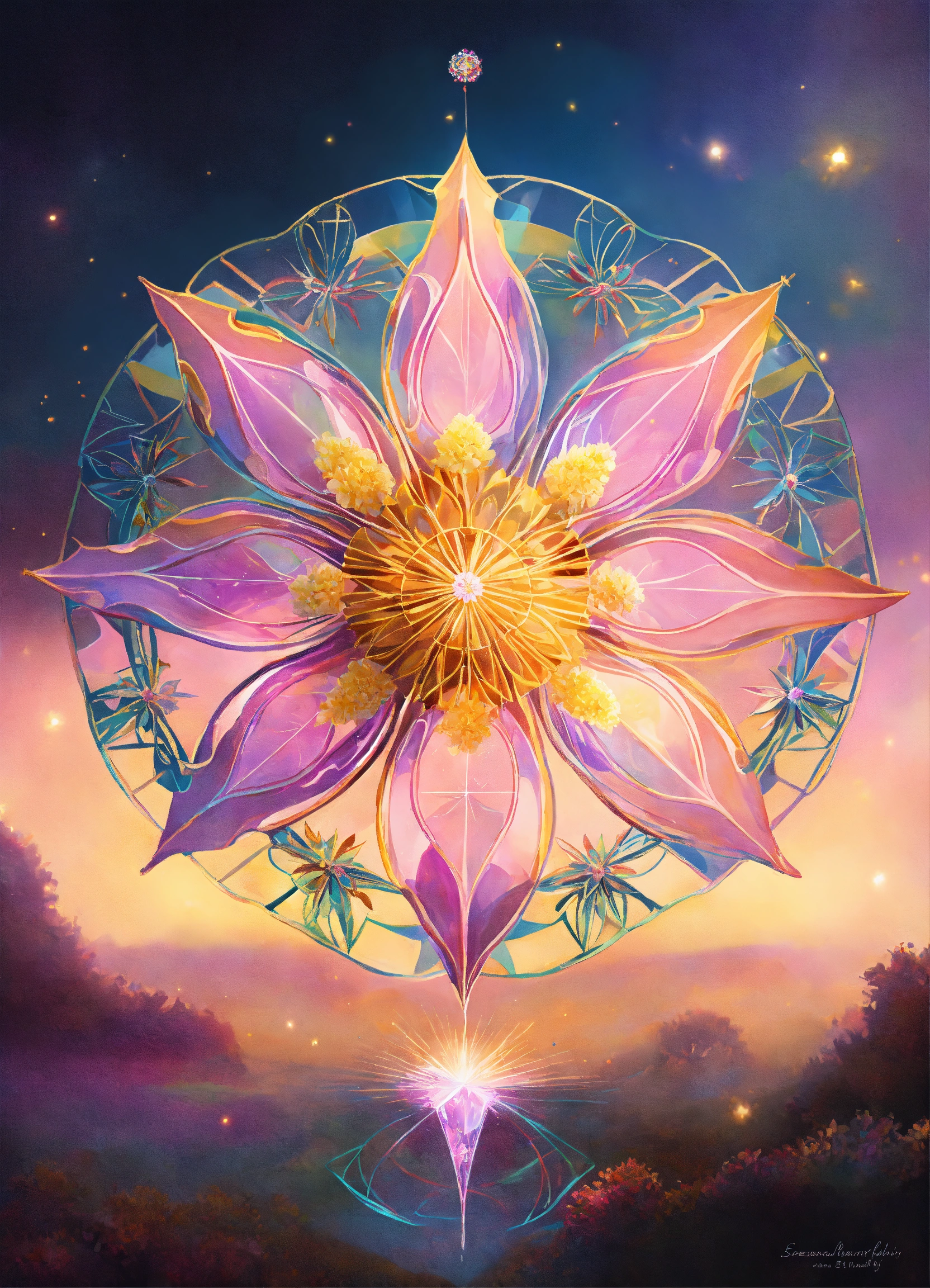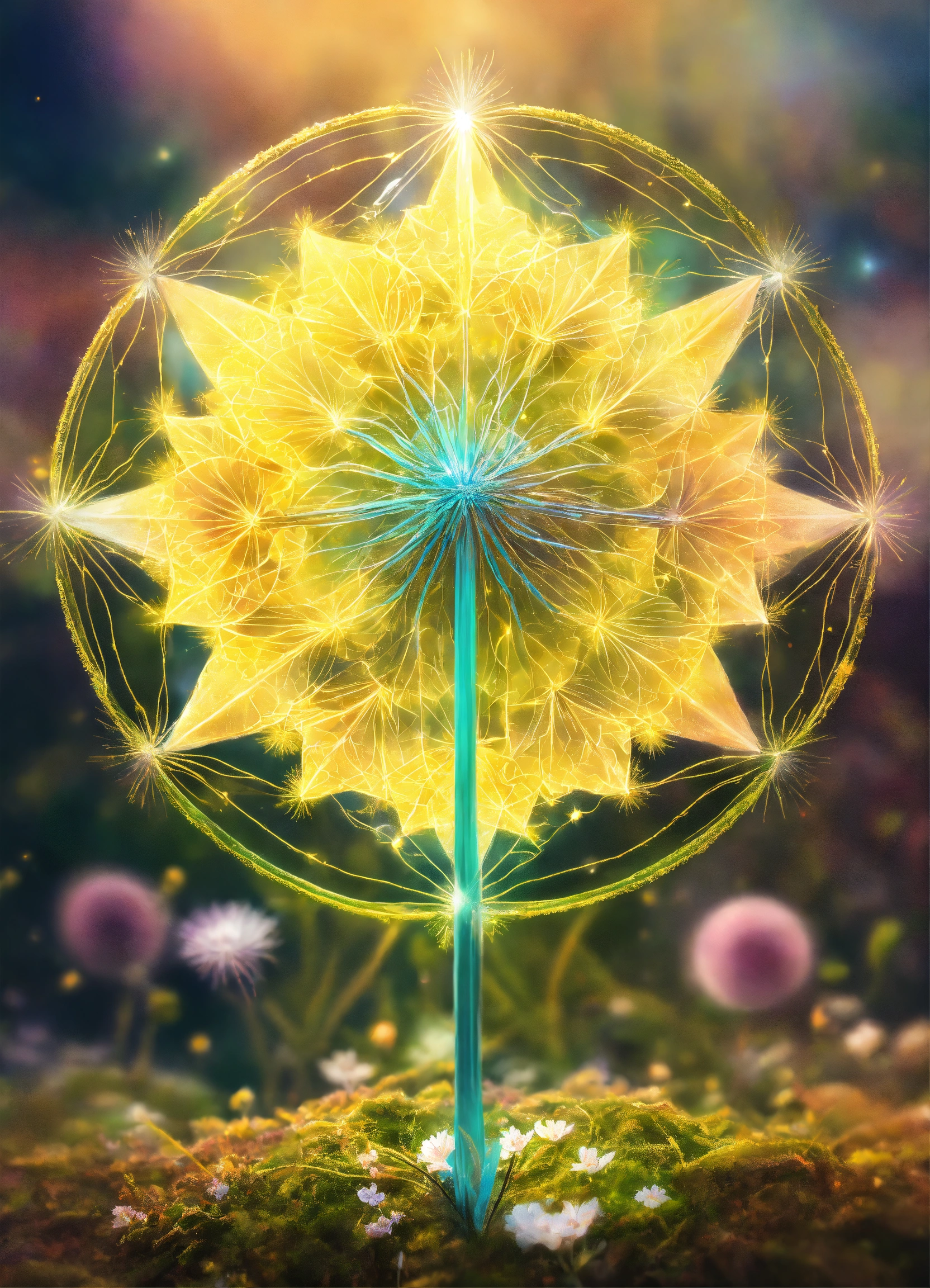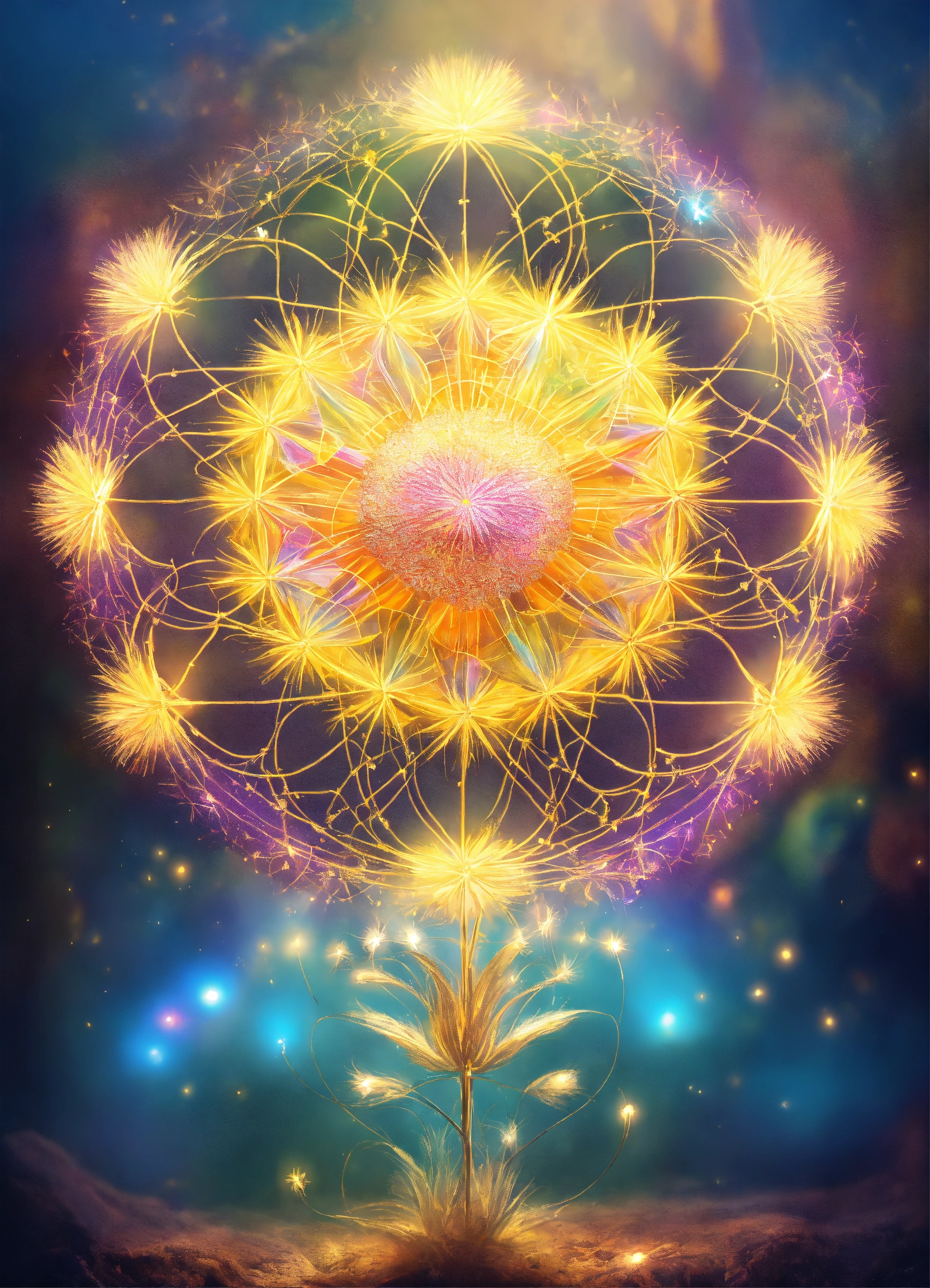 Fleur de pissenlit symbole spirituel, adn, connected to other universes, to the invisible worlds, pastel colors, shinning light, sacred geometry