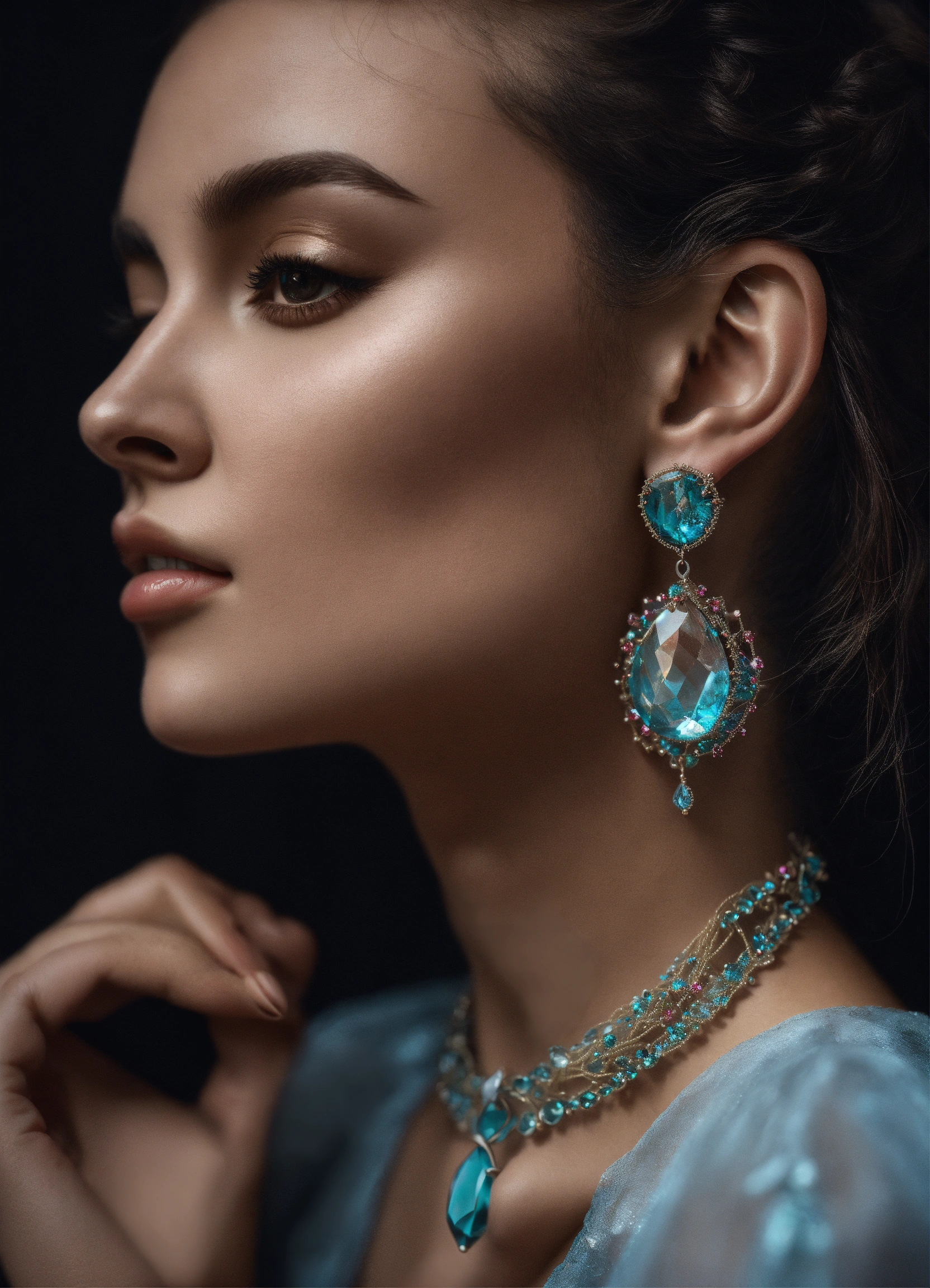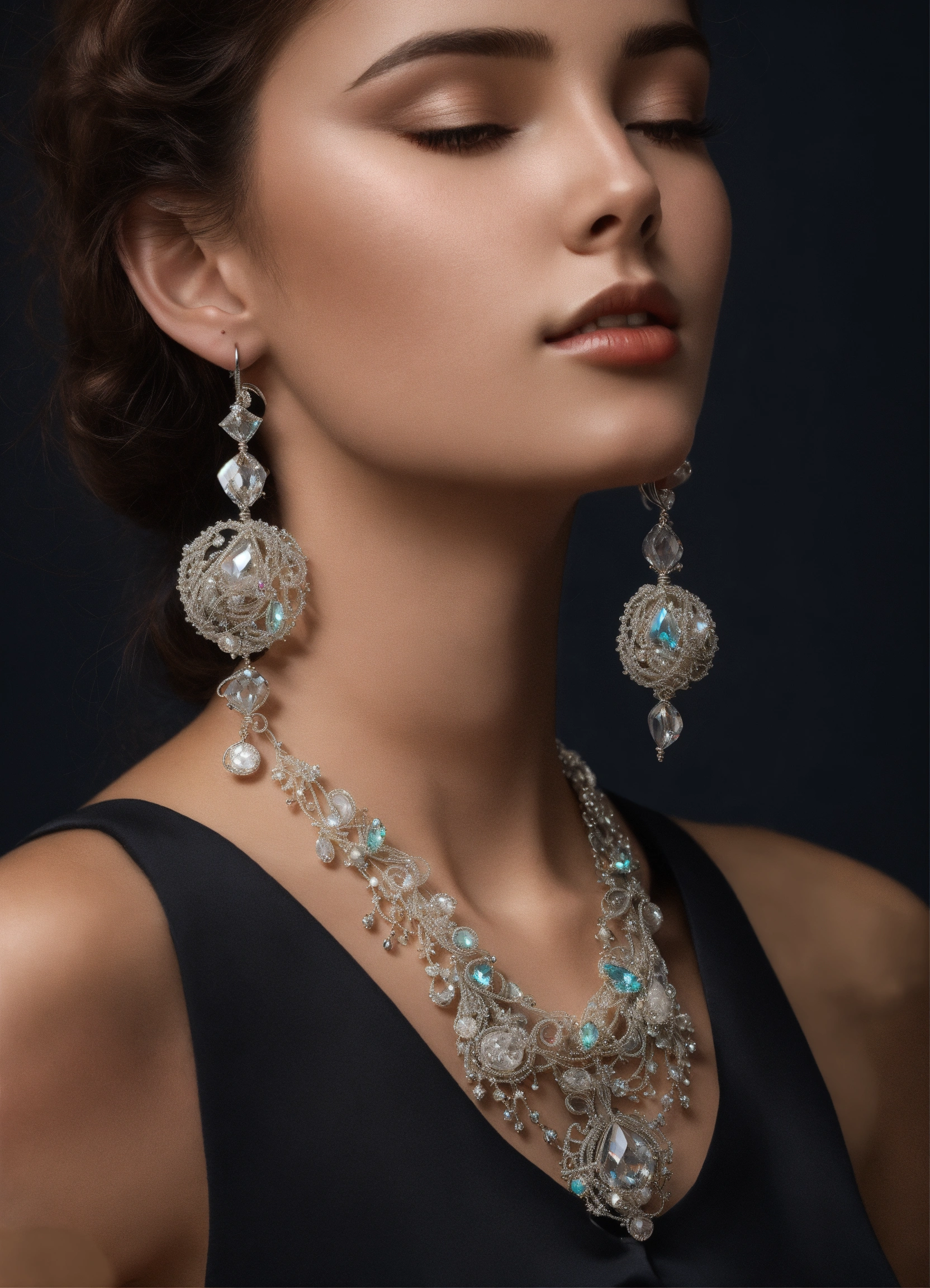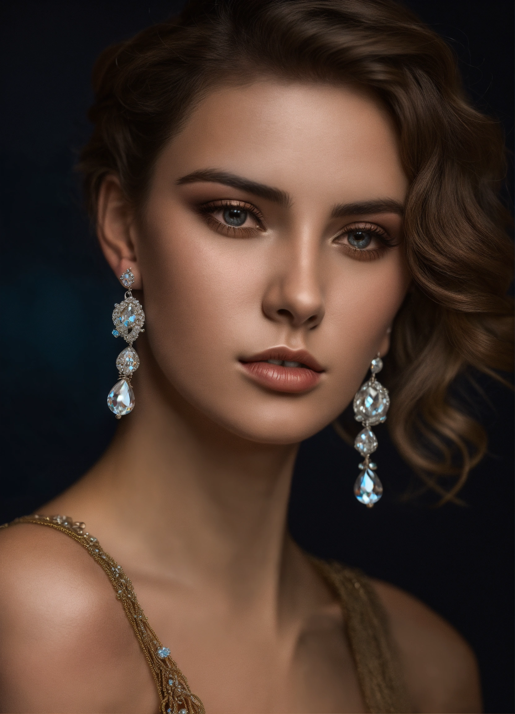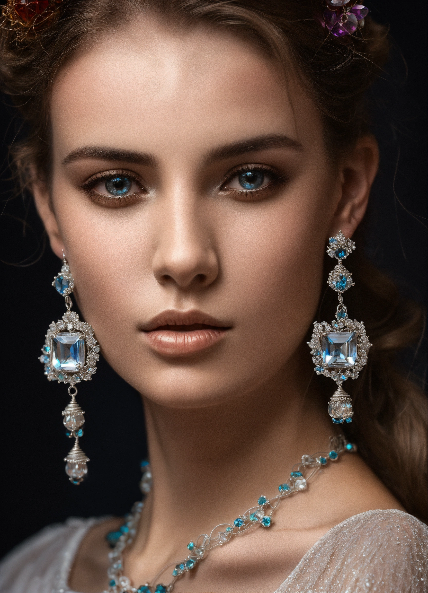 Modern super model wearing beautiful tiny sterling silver wire wrapped earrings with the preciouses stones and crystals, 8k, high resolution, dark background, victorian style