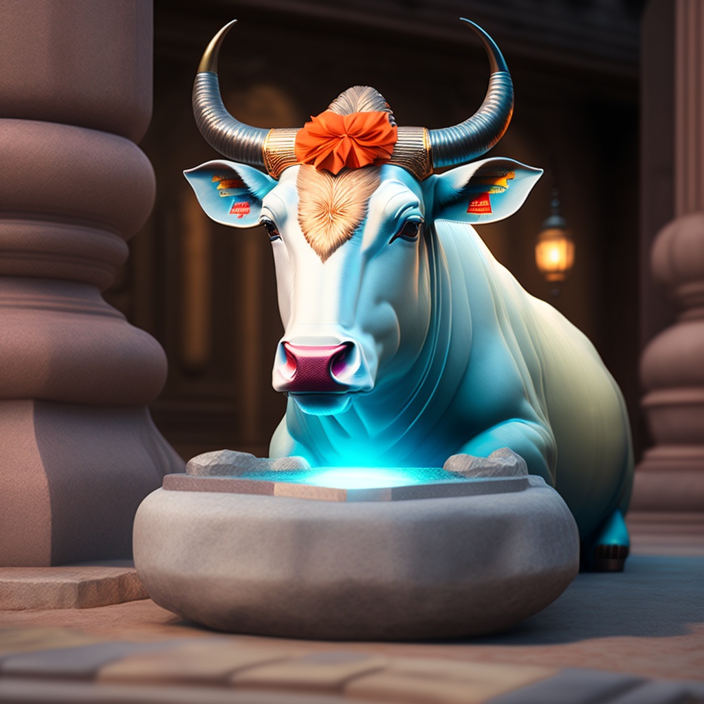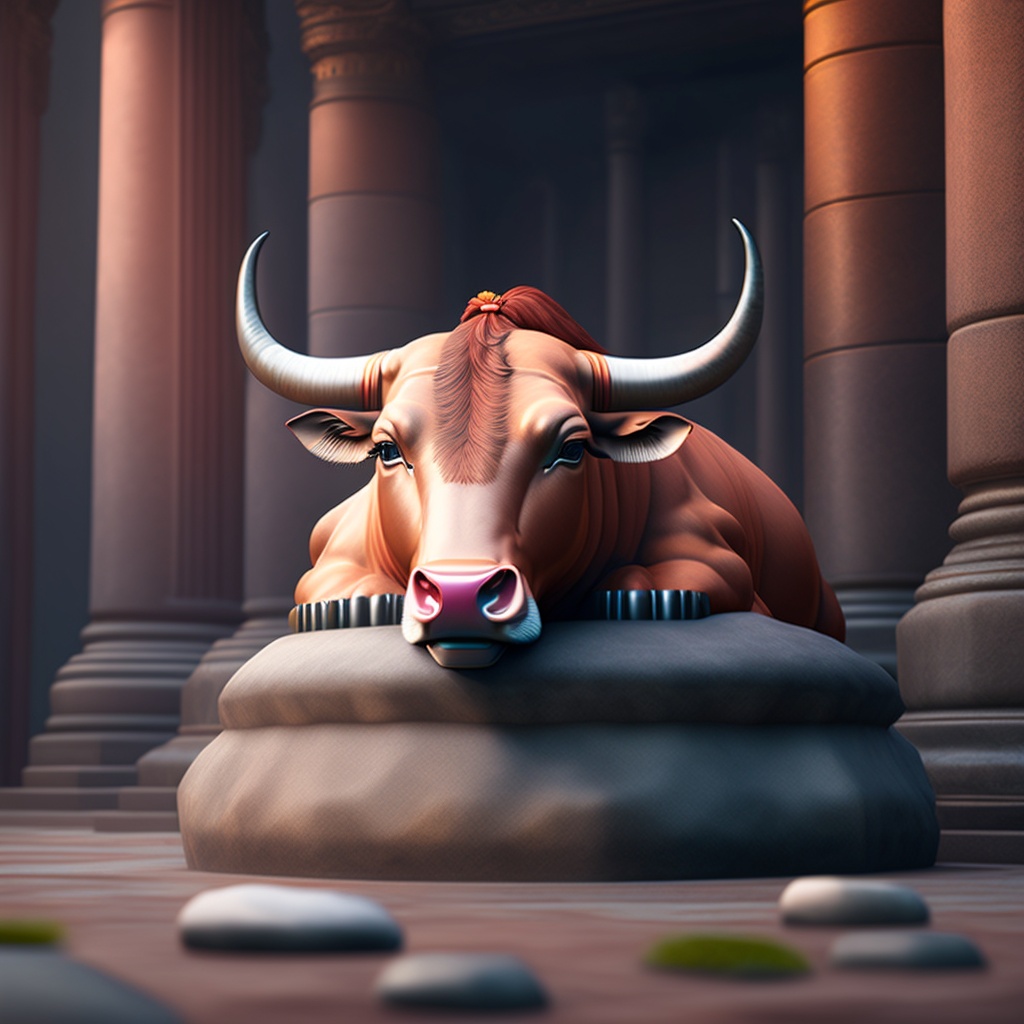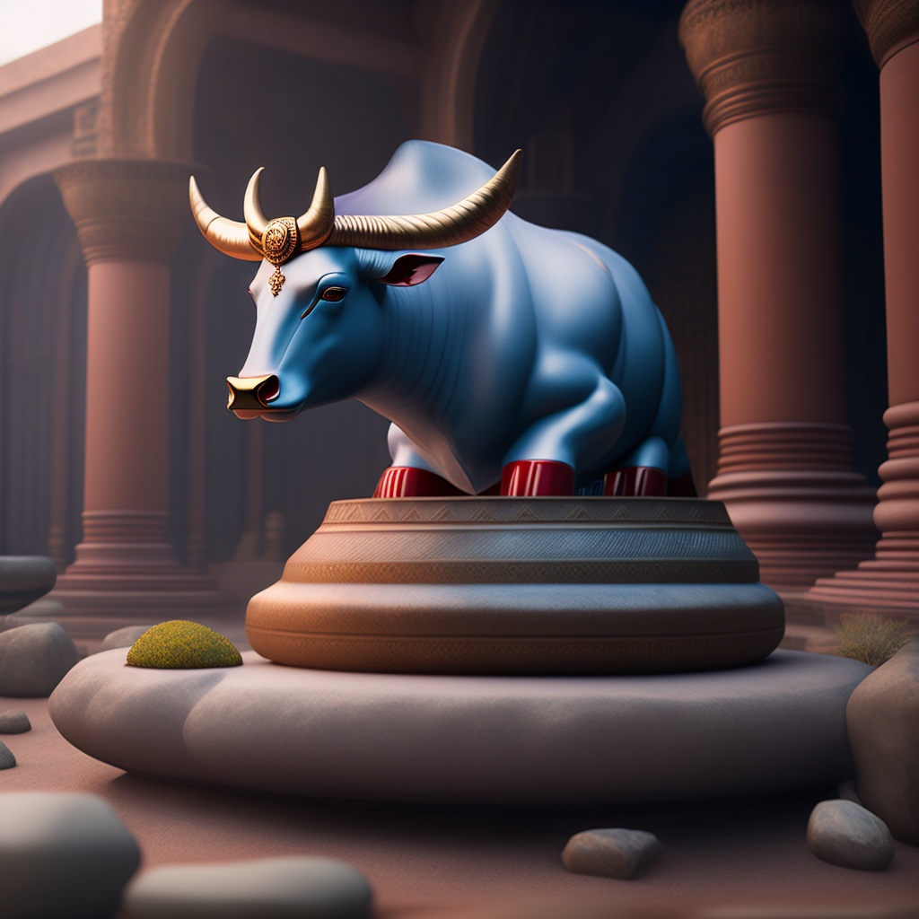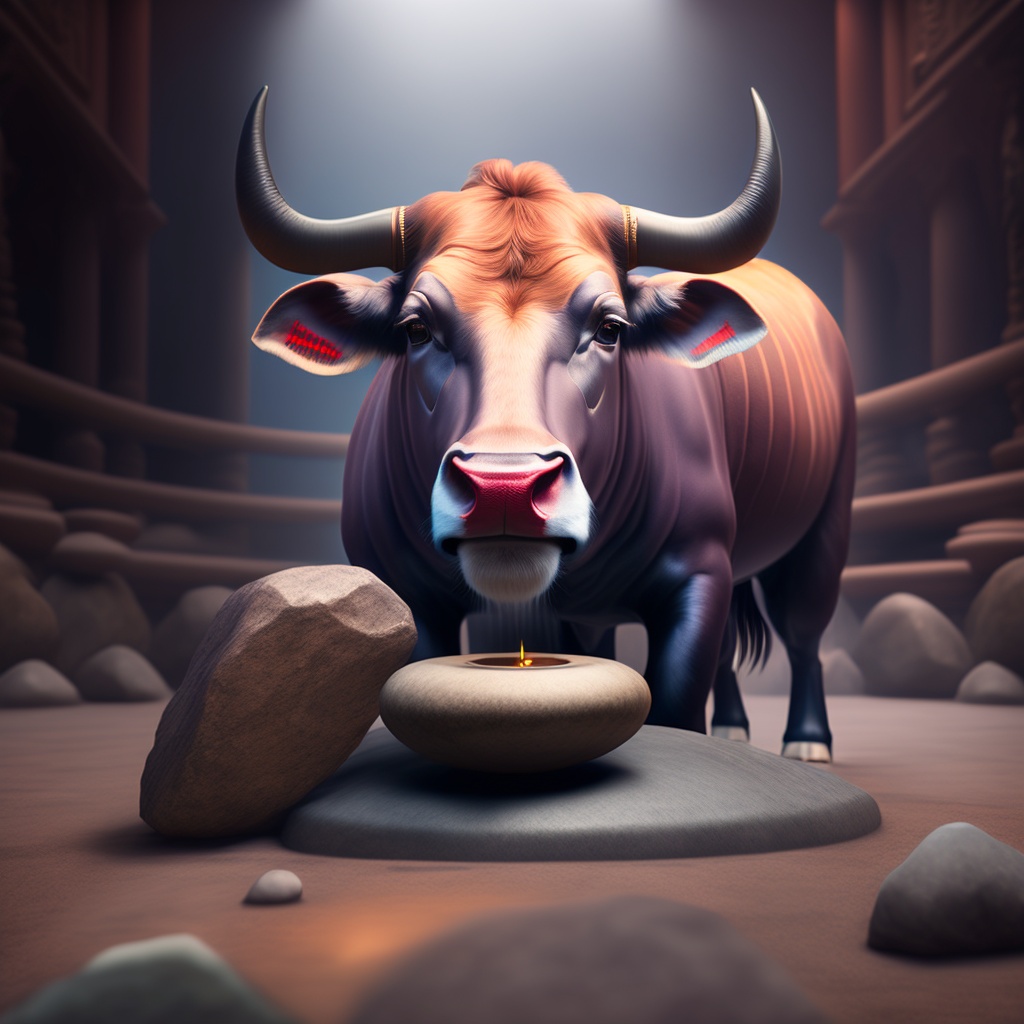 A big miscular bull praying to shiva linga sitting in a stone, realistic, 8k, cinematic lighting, photographic, eastman kodak color negative film 5251 50t shot on panavision super ps . no arms
