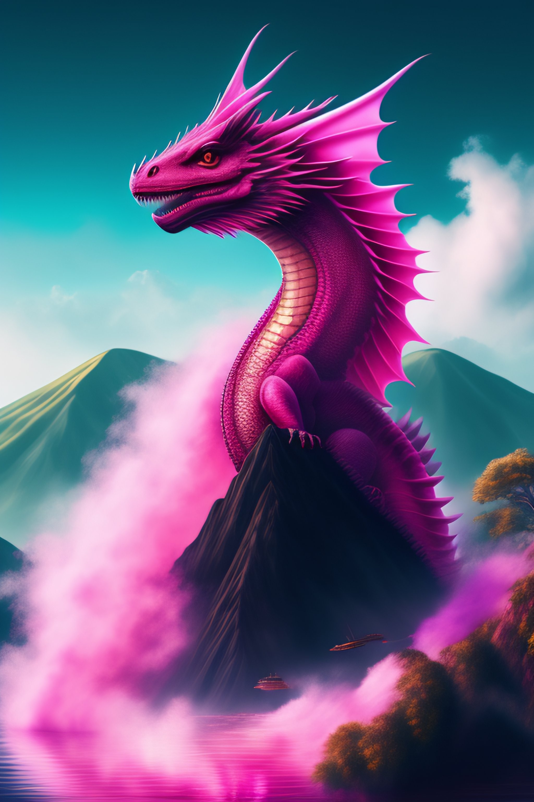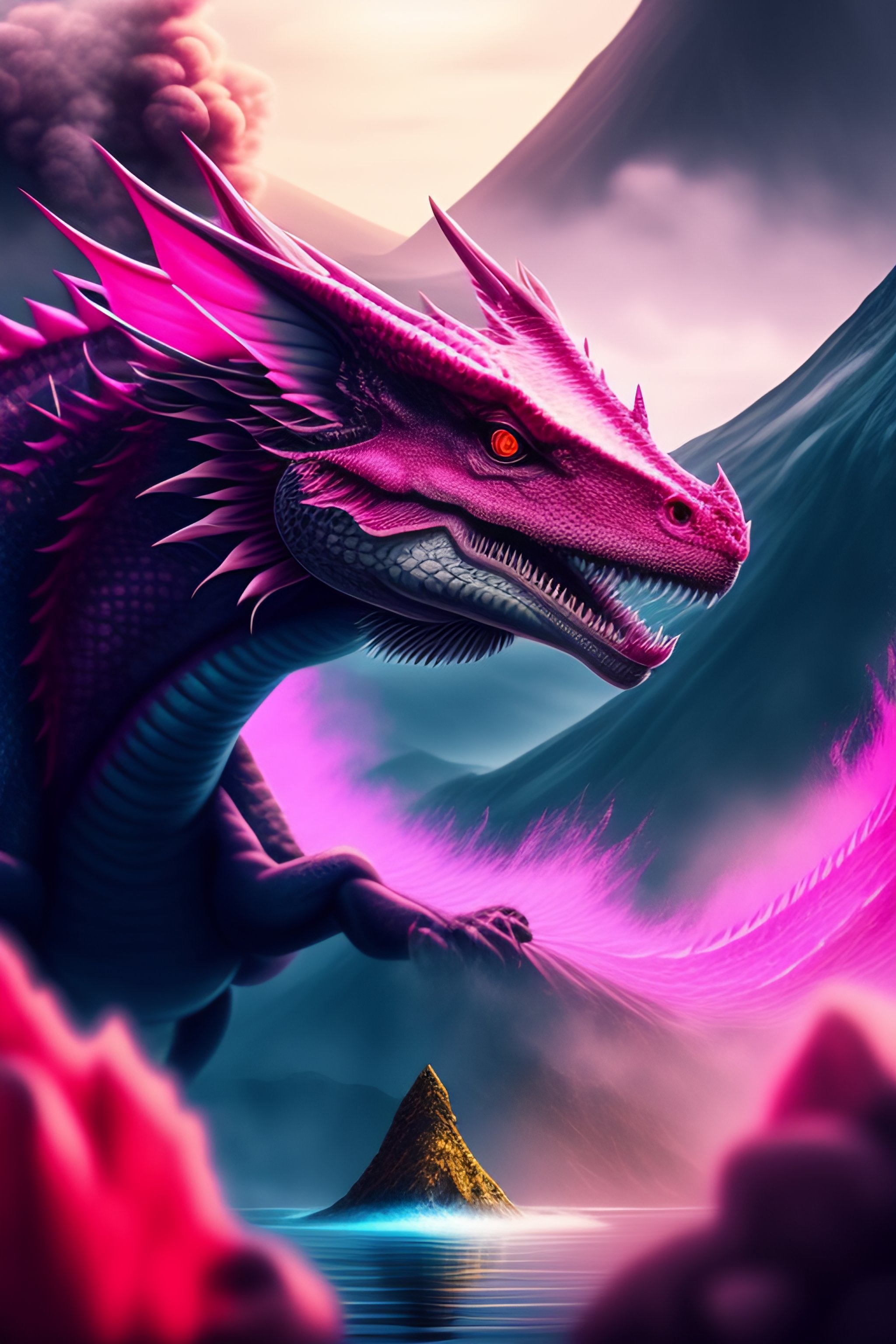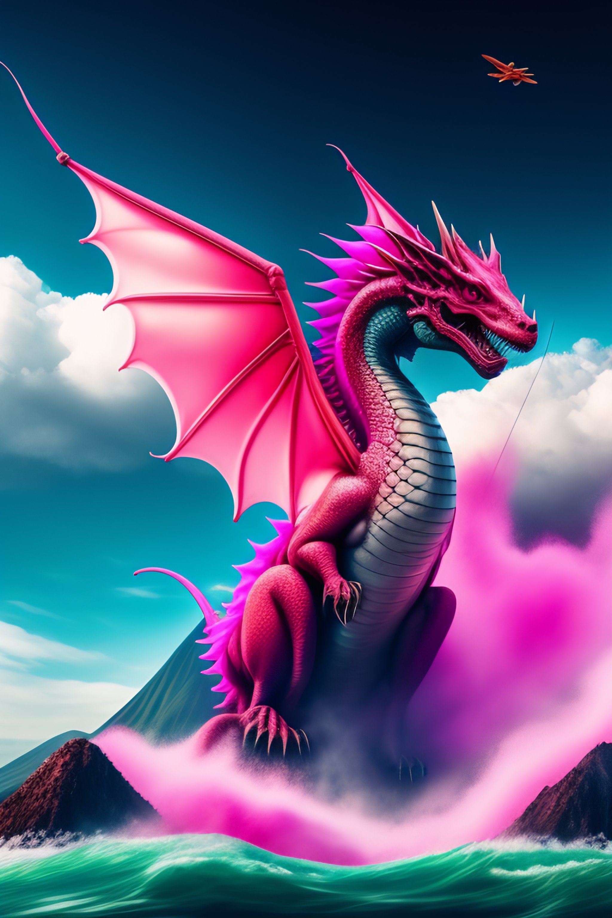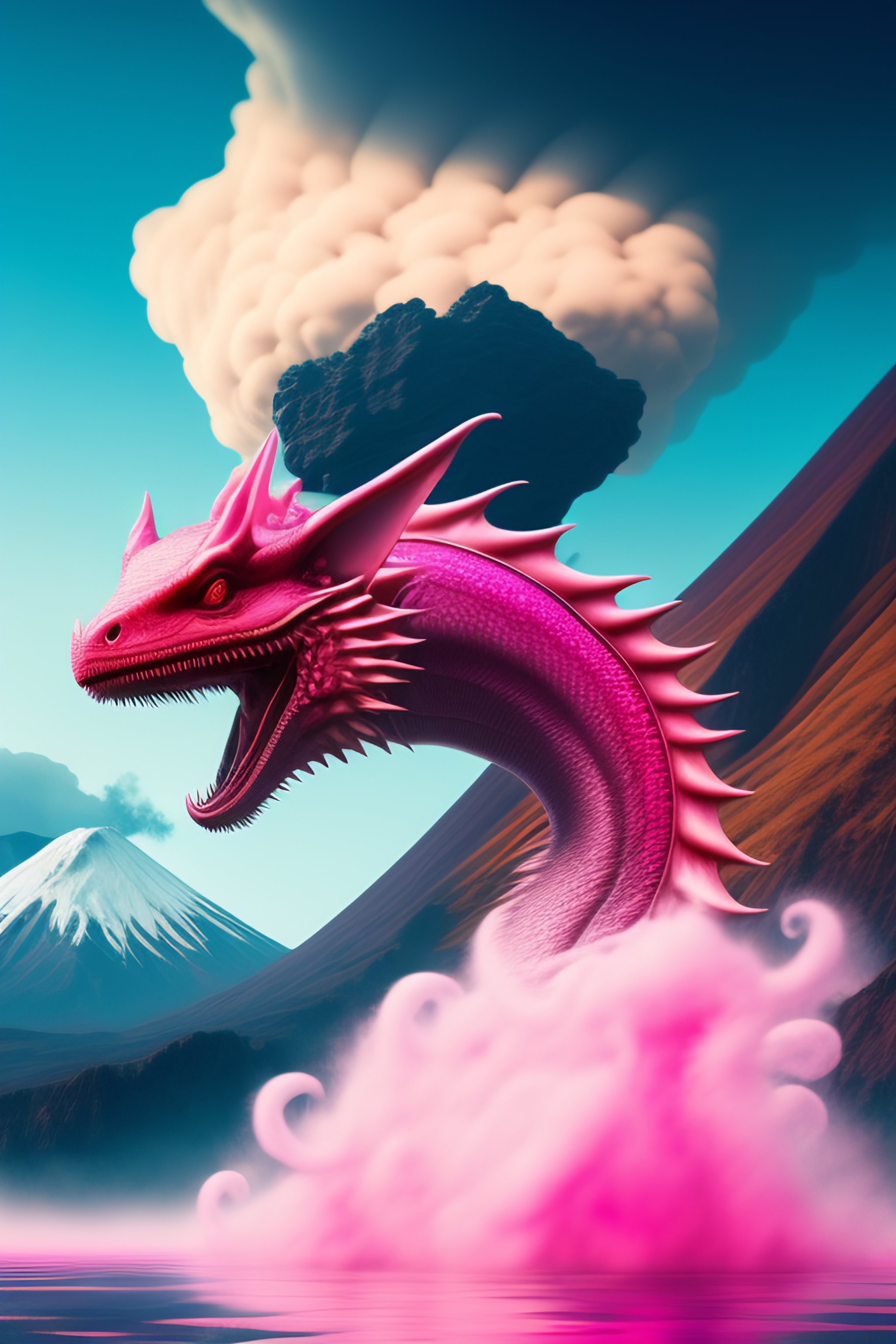 Dangerous pink water dragon flying over a volcano