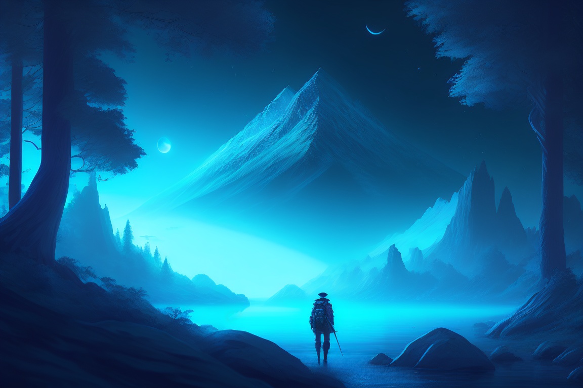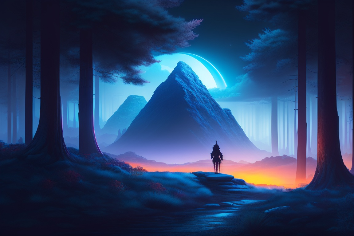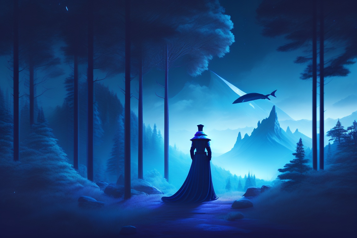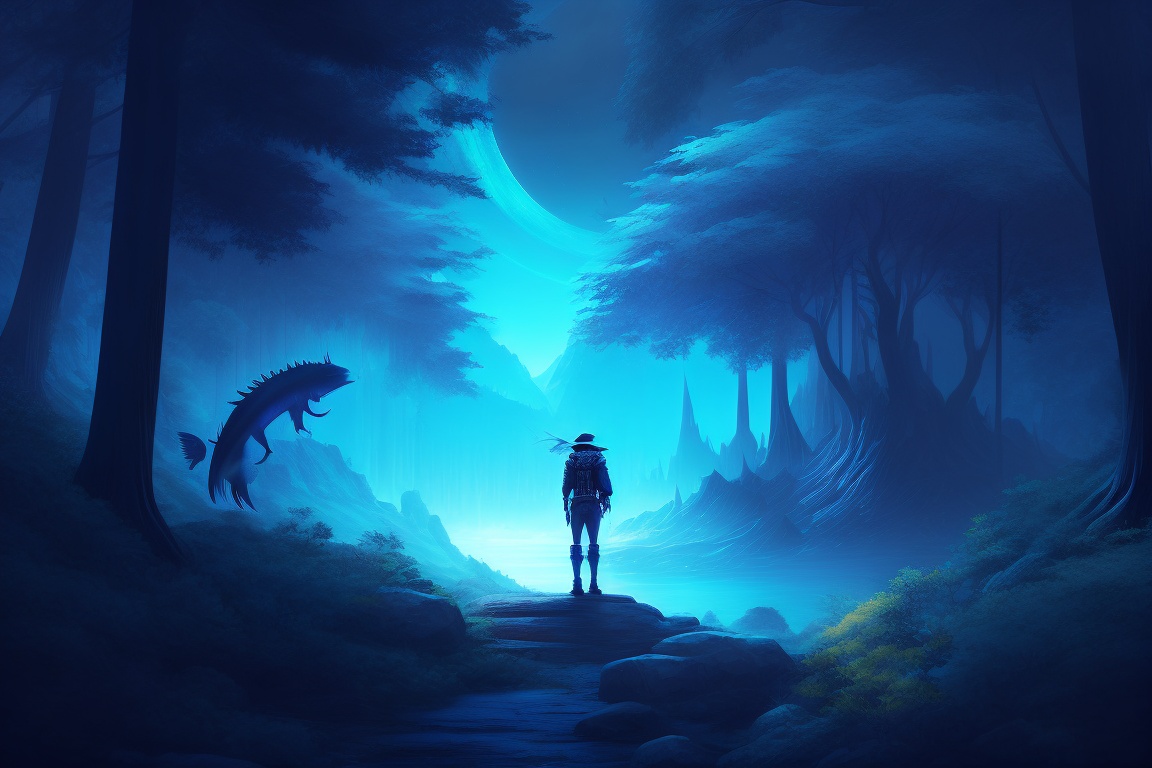 Dark-fantasy landscape with a monster at the foreground and a dark forest at the background, trending in art station, 4k, mate painting, digital art, blue black tints