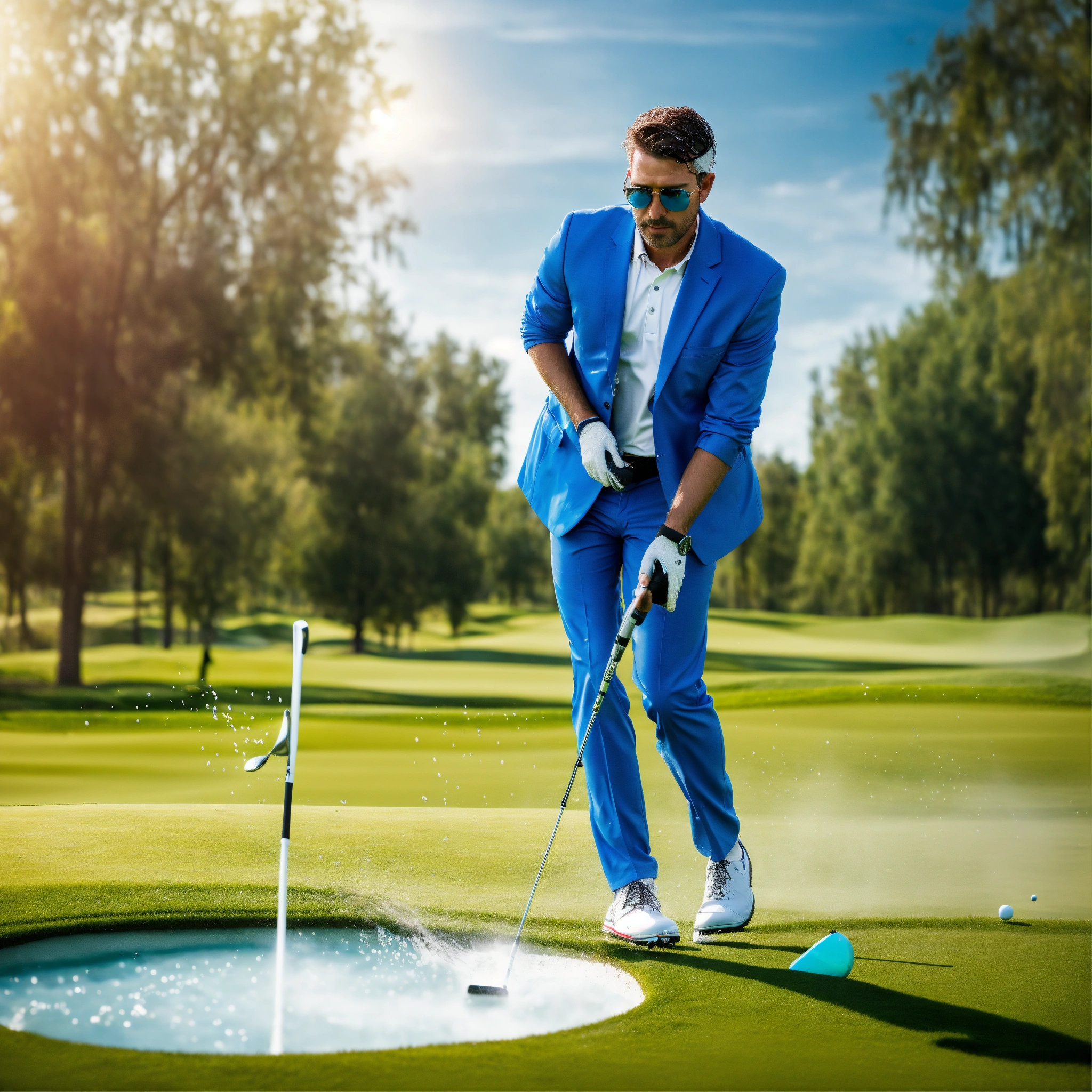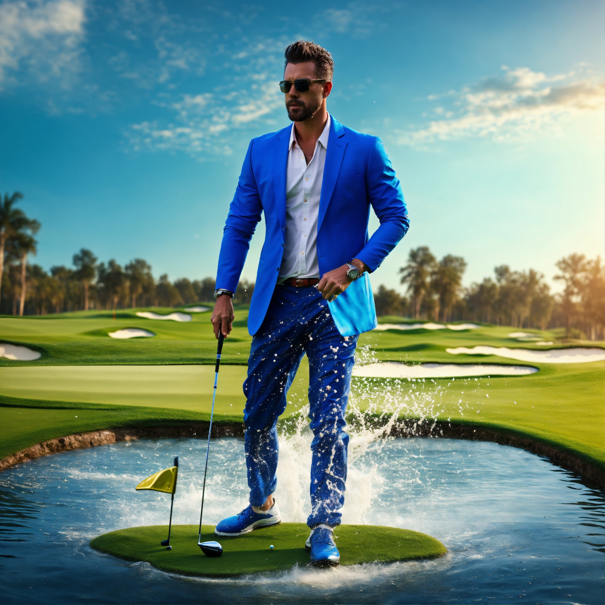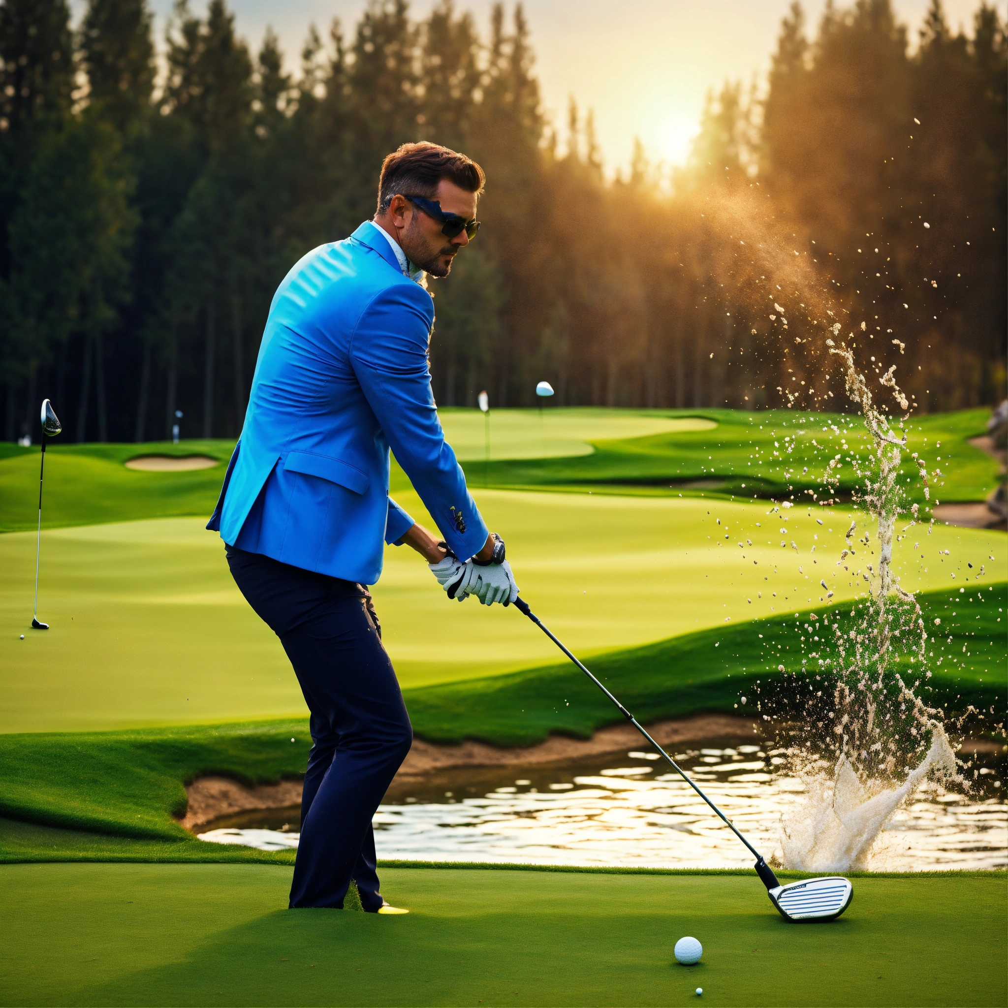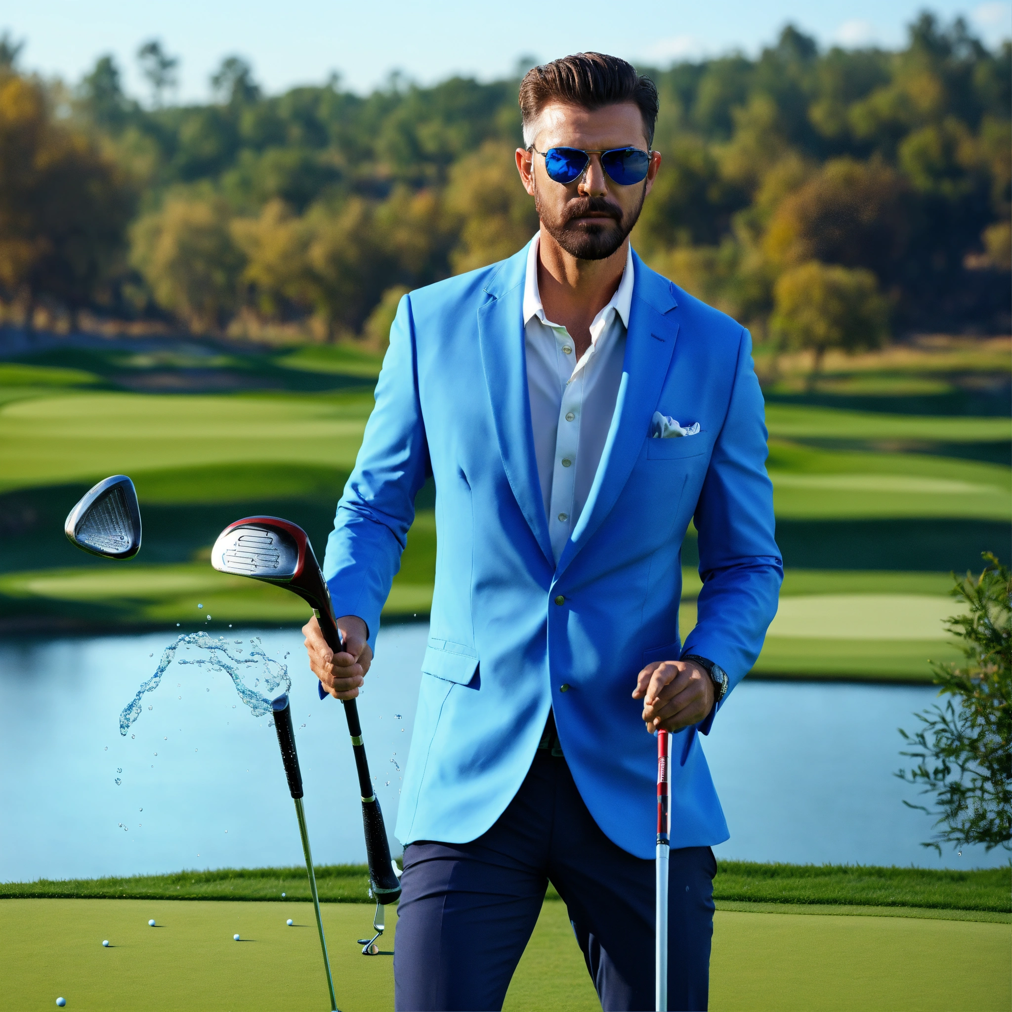 4k hd ultra realistic cool man blue blazer, sunglasses. swinging golf club on golf course playing golf with water splash