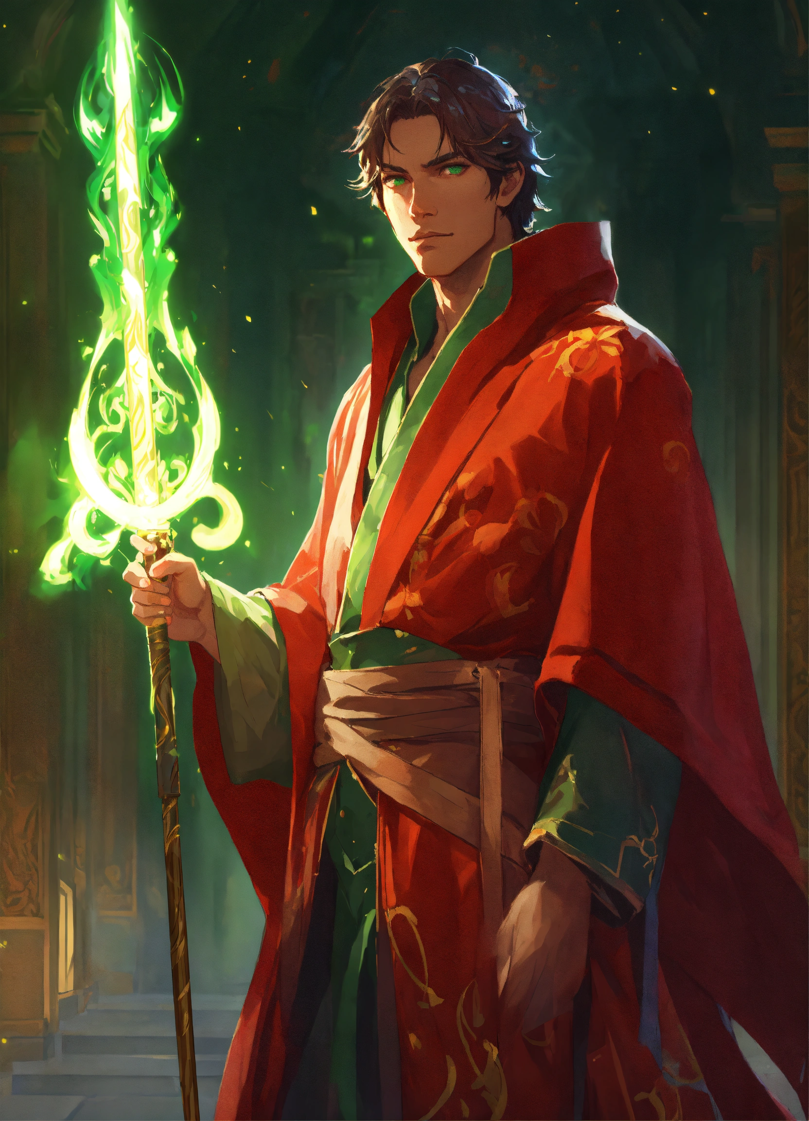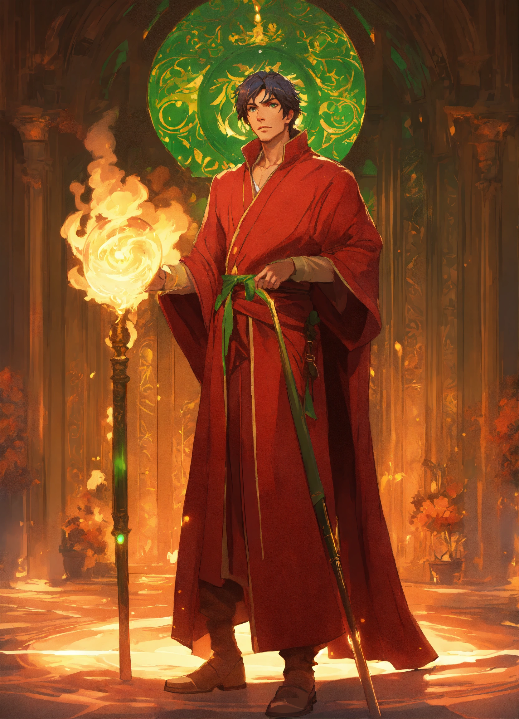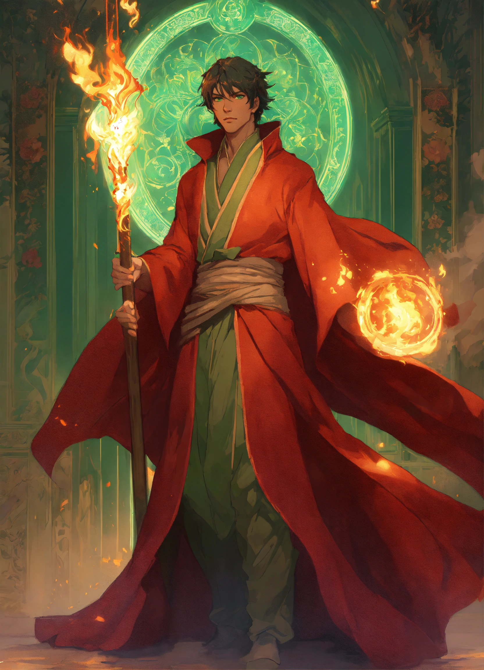 Handsome, human, imperial male wizard with glowing fire staff, red robe, green eyes, tan skin, high cheekbones, greg rutkowski, makoto shinkai, alphonse mucha, stylized, full body
