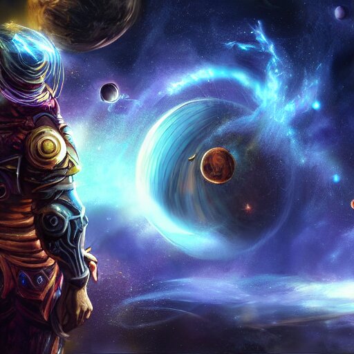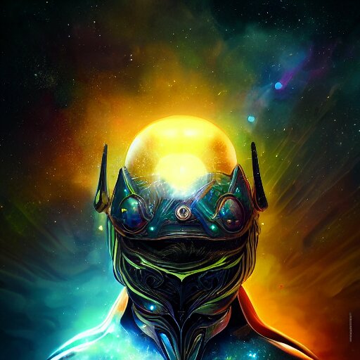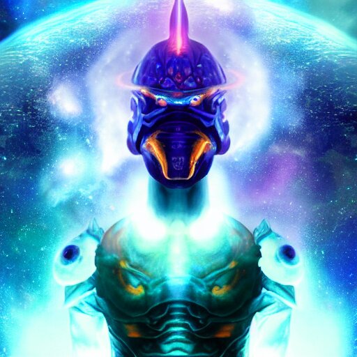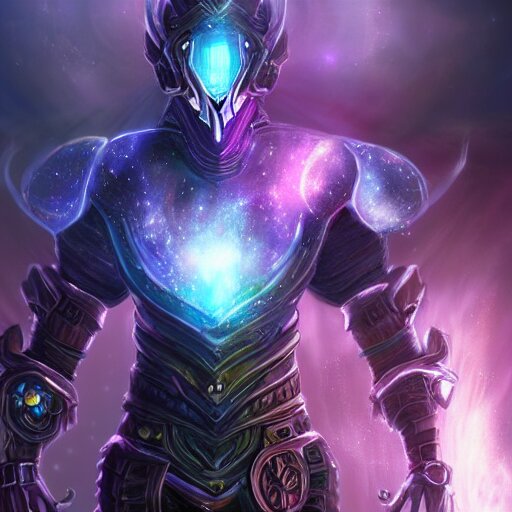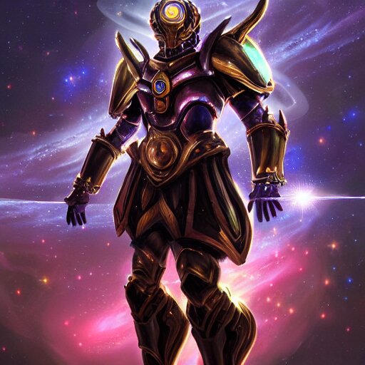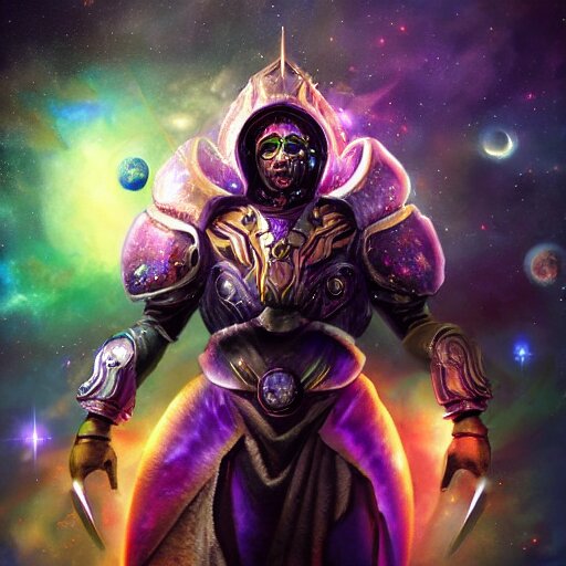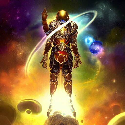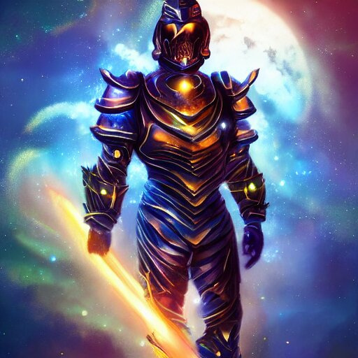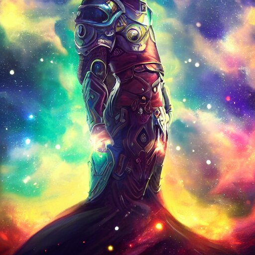 Photorealistic fantasy cosmic concept art of a cosmic god with armor made out of planets and dark matter, hovering in a unknown galaxy, fully body portrait, cinematic, dynamic lighting, ultra detailed, creative, trending on art station, stunning visuals, creative