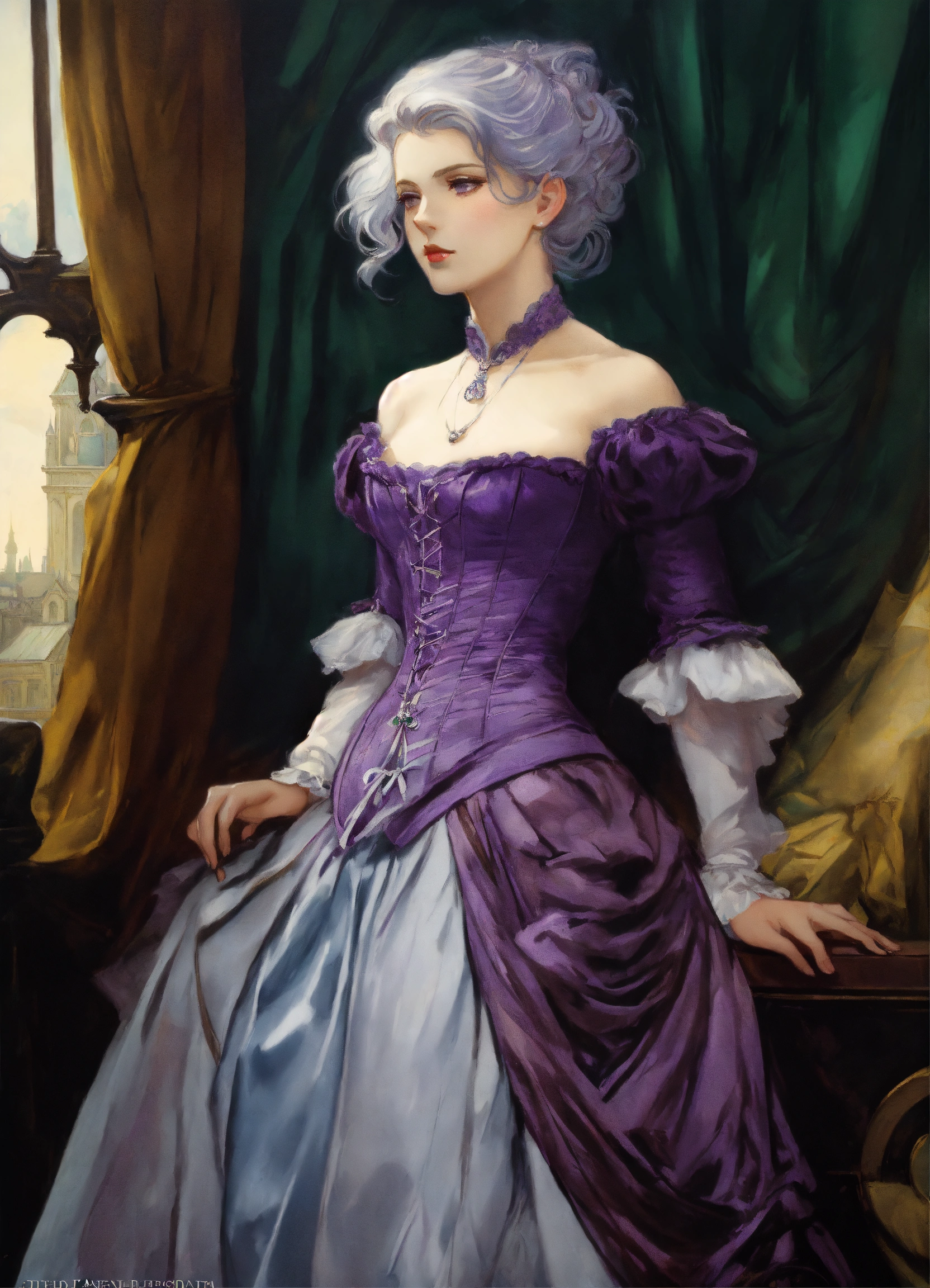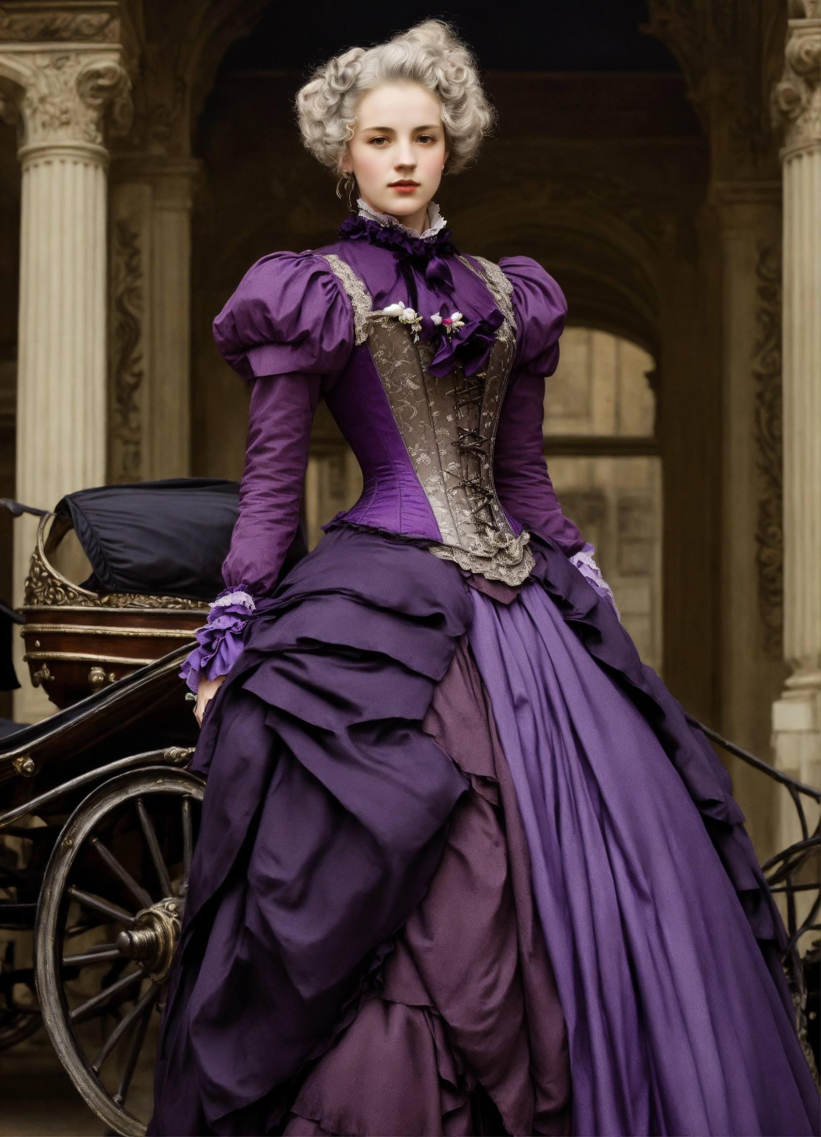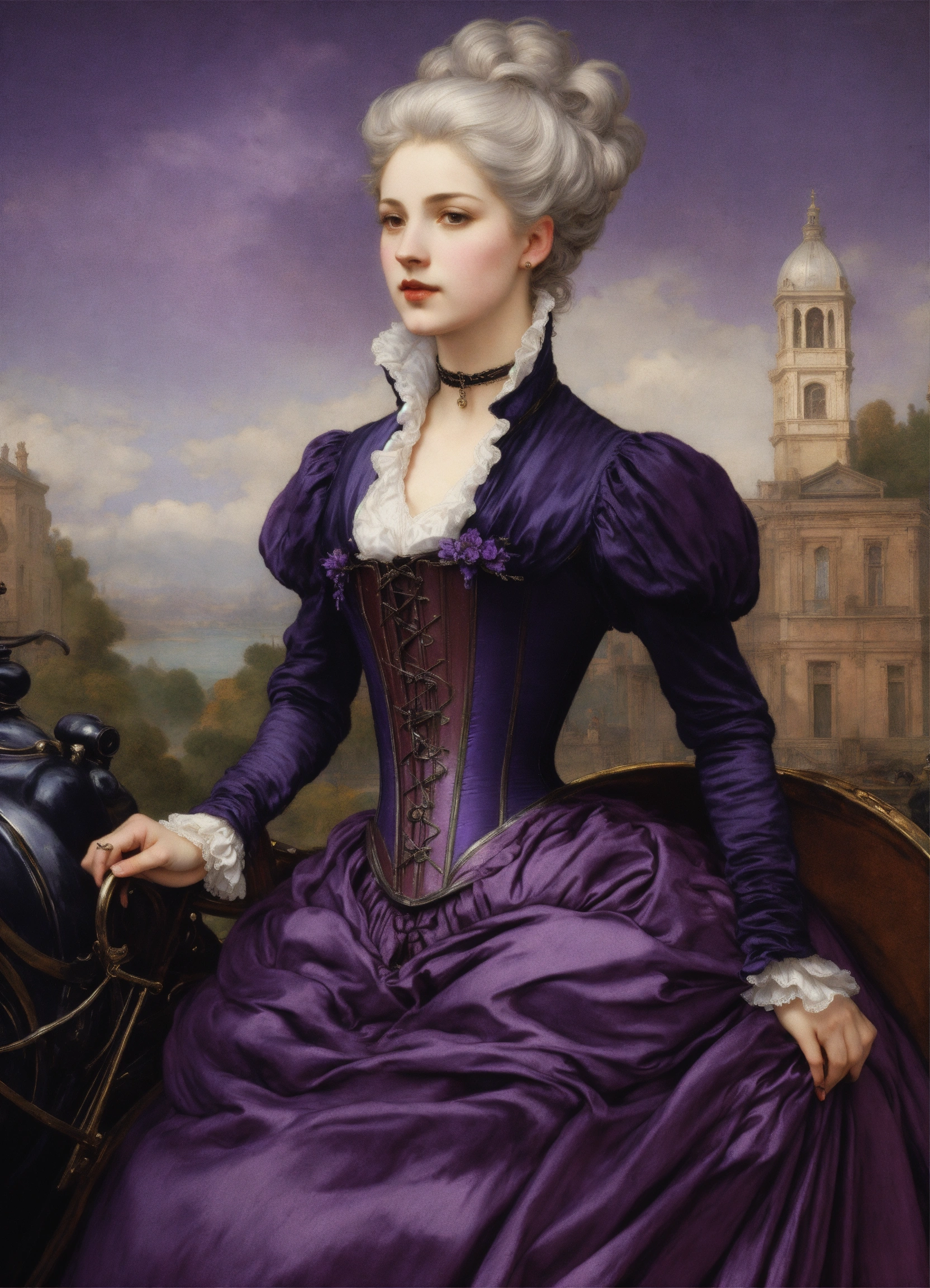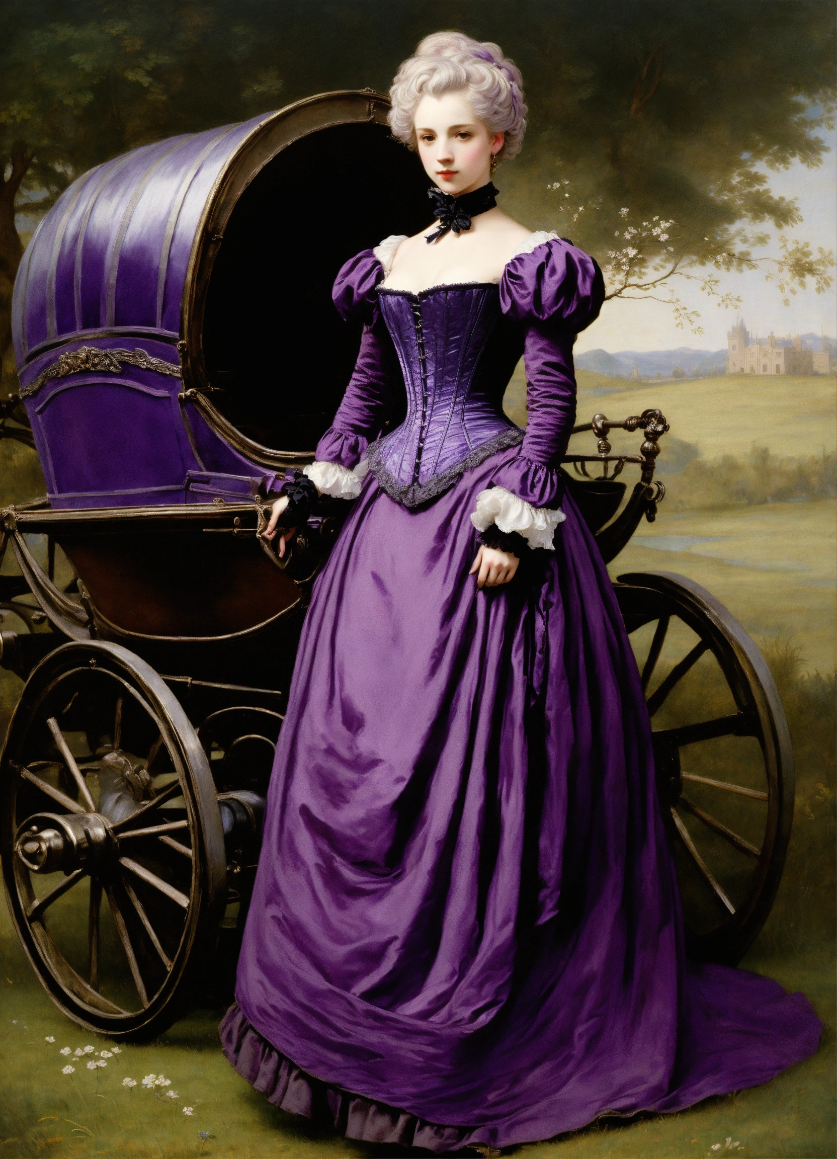 Androgynous person with victorian styled upswept silver hair, silver eyes, pale skin, wearing a purple corset and long purple skirt, standing next to a victorian open carriage, face forward, illustration, dystopian, rosetti, rackham, waterhouse, rembrandt, da vinci, michelangelo