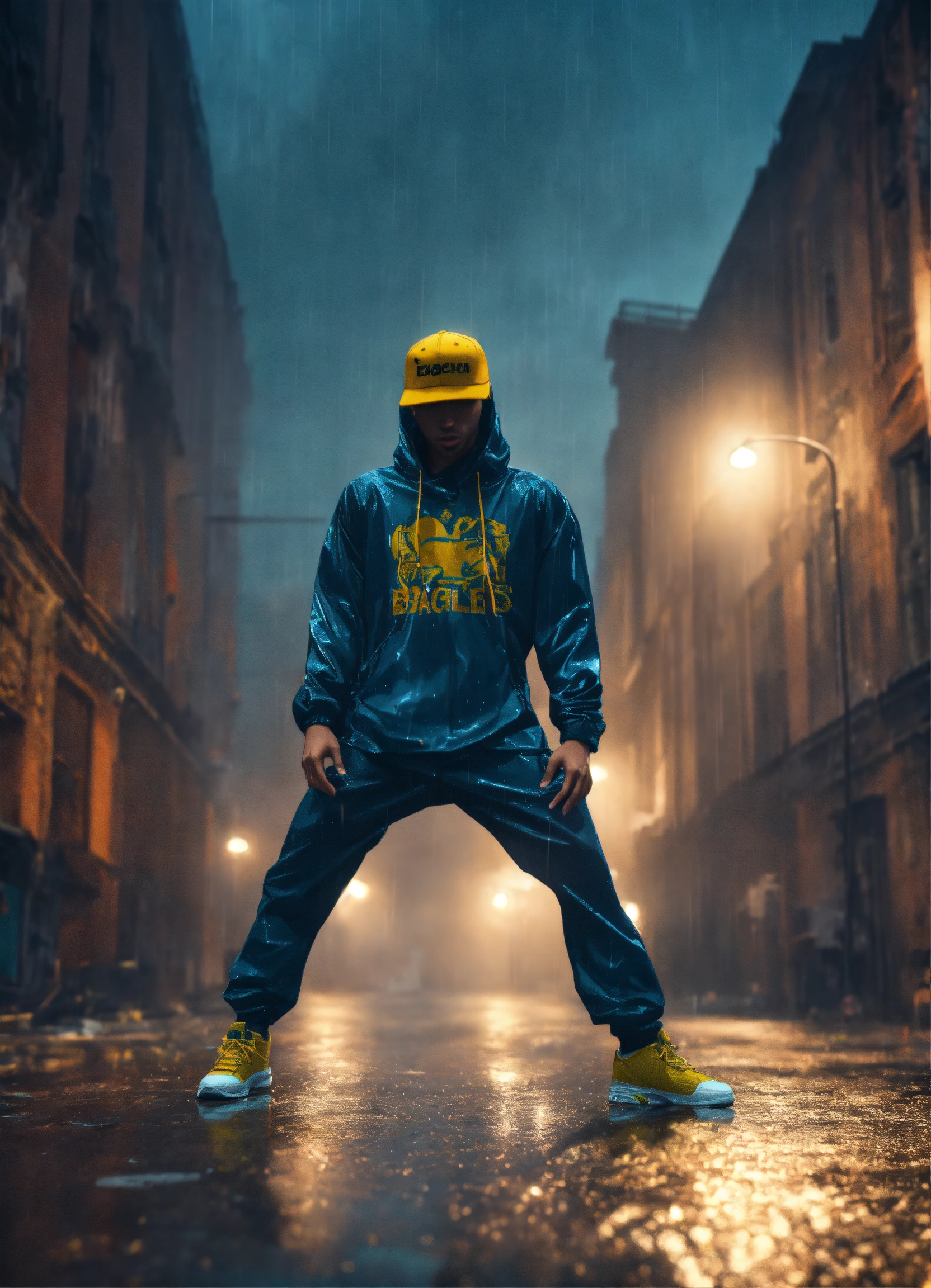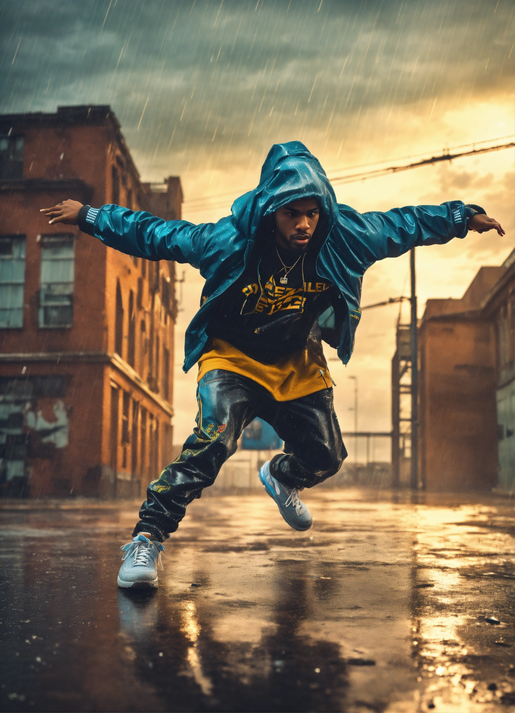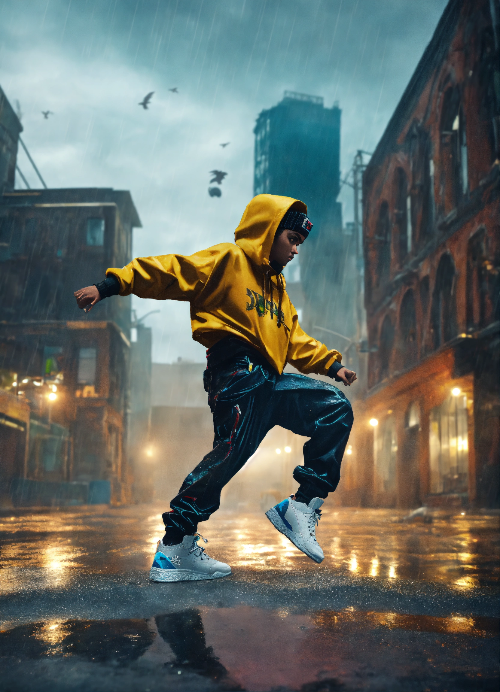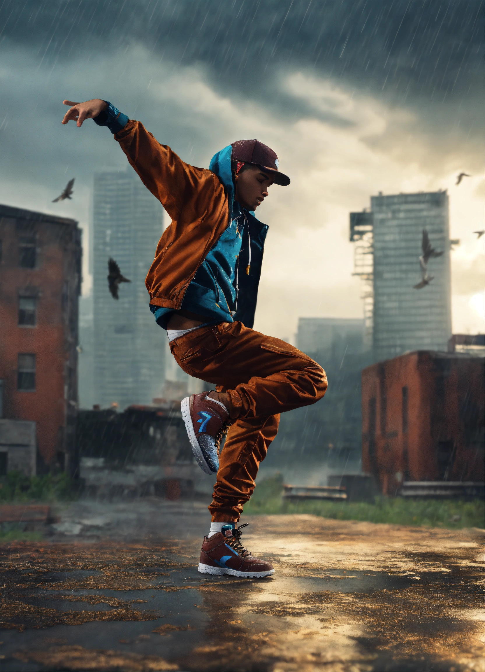 A hip hop breakdancer breakdancing in the rain, 8k, 3d render, abandoned buildings in the background, eagles flying in the background