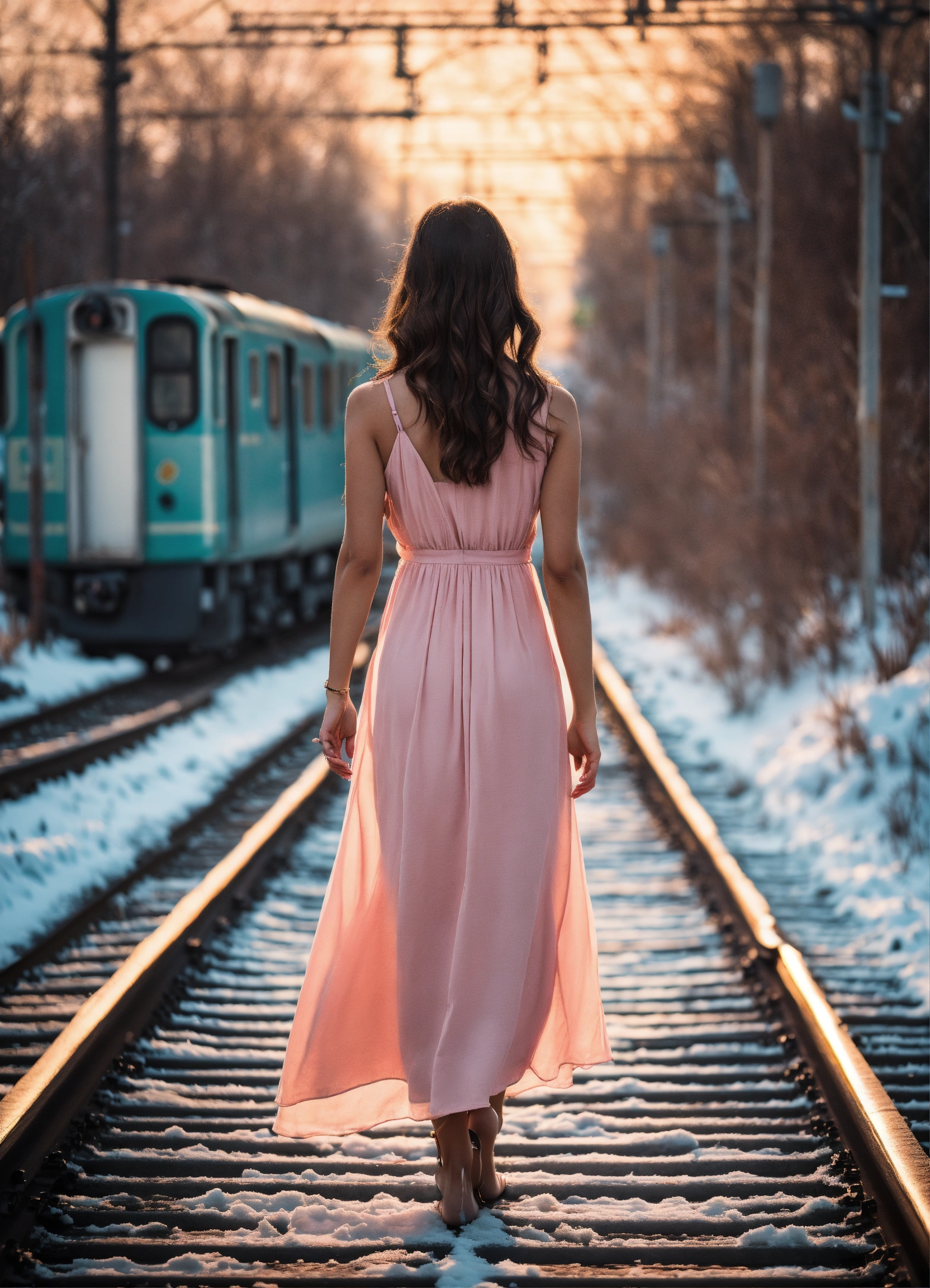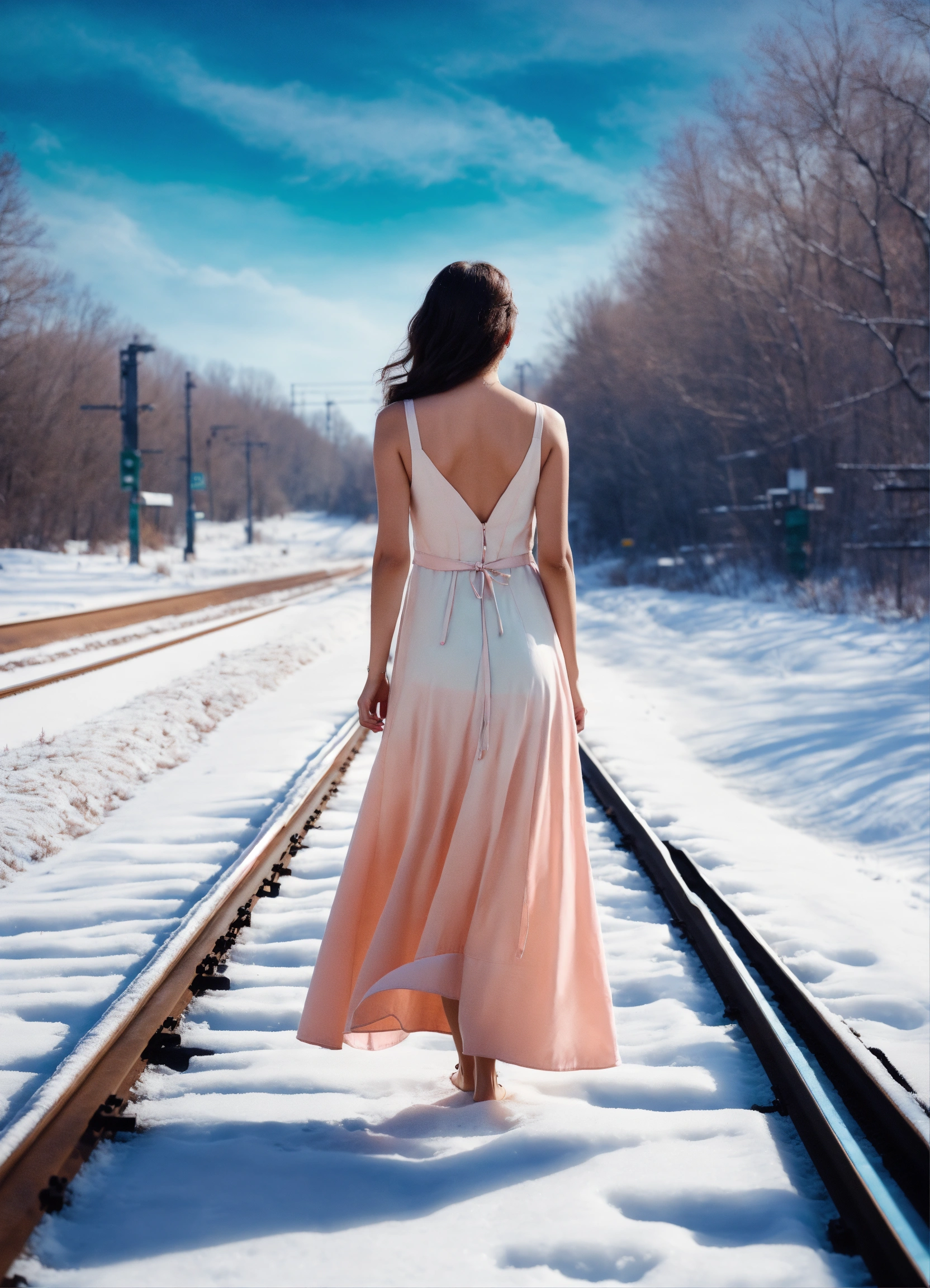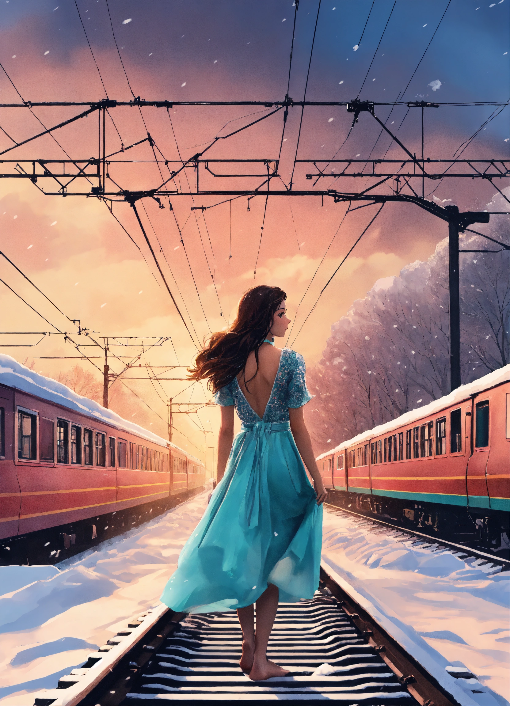 A beautiful poster of a drama movie. on the railway tracks that go into the distance, a barefoot young brunette woman in a light summer fashionable dress of 2023 is standing with her back to us. a train is traveling along the rails. the background is winter. lot of snow. the color scheme is pastel colors. noir.