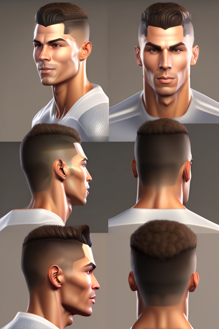 Cristiano ronaldo, same character, head shot, 3d model reference images, detailed, multiple poses: front view, left view, right view, back view
