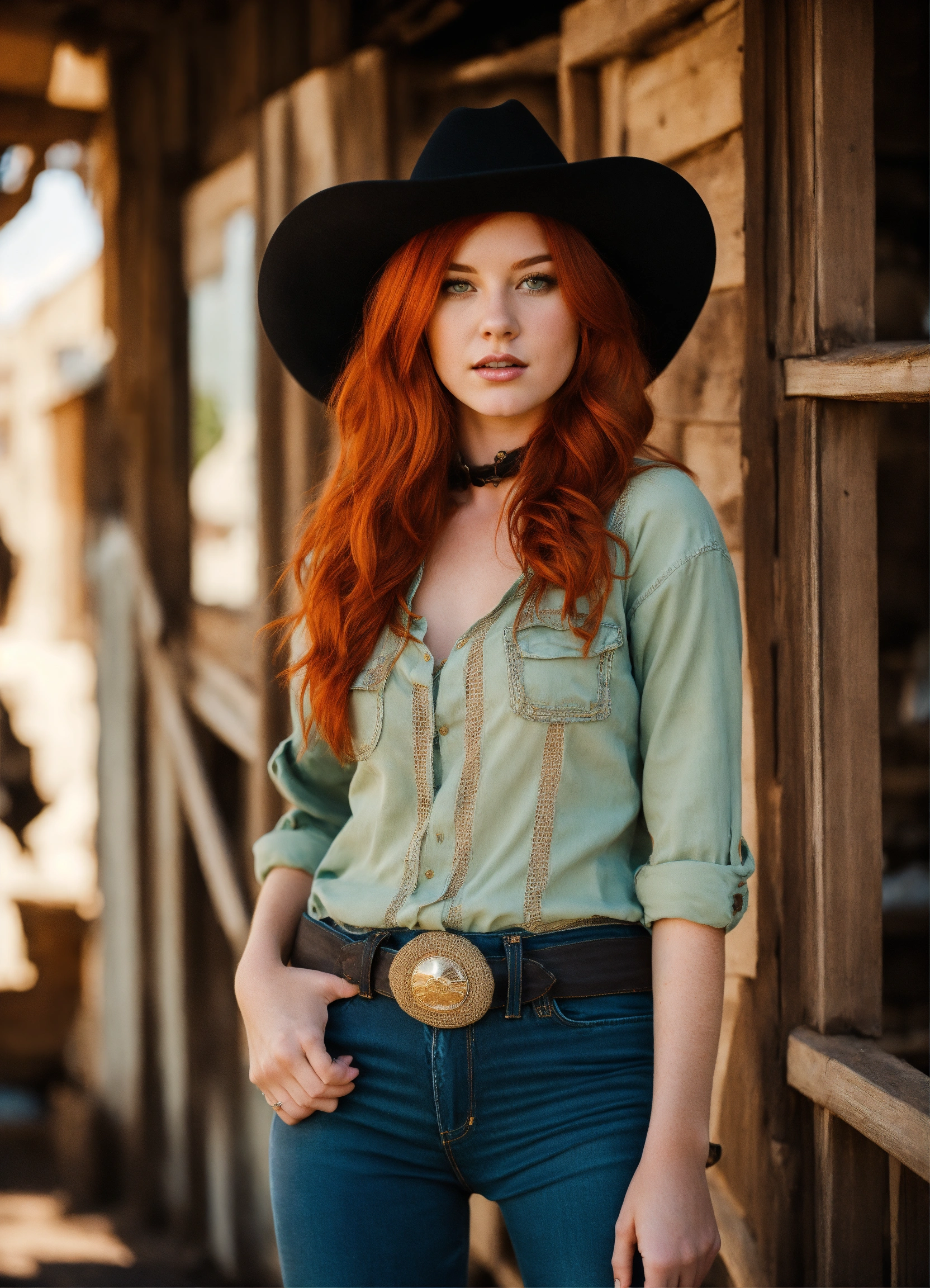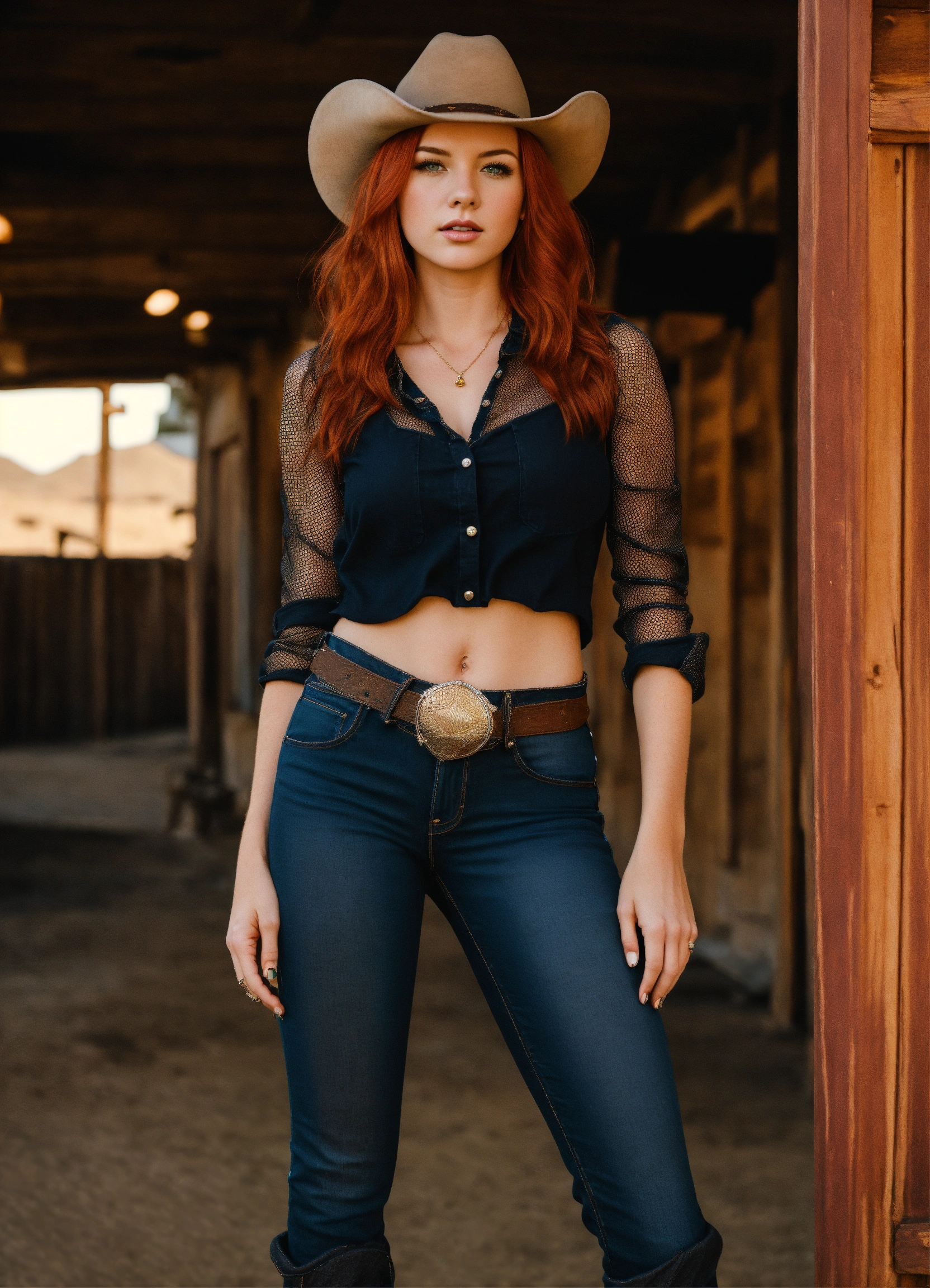 A real photo of a hot 25 year old redhead cowgirl, she is wearing a fishnet and black denim pants, she stands in a very old western alien town