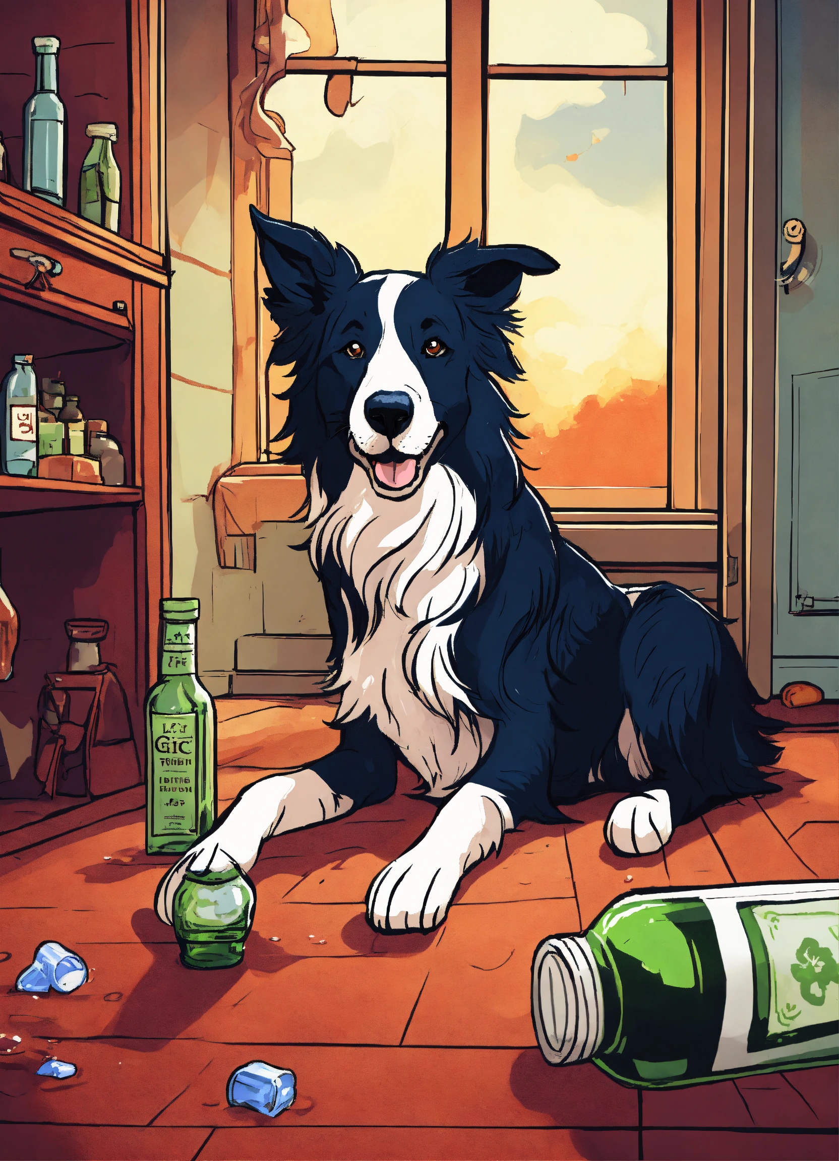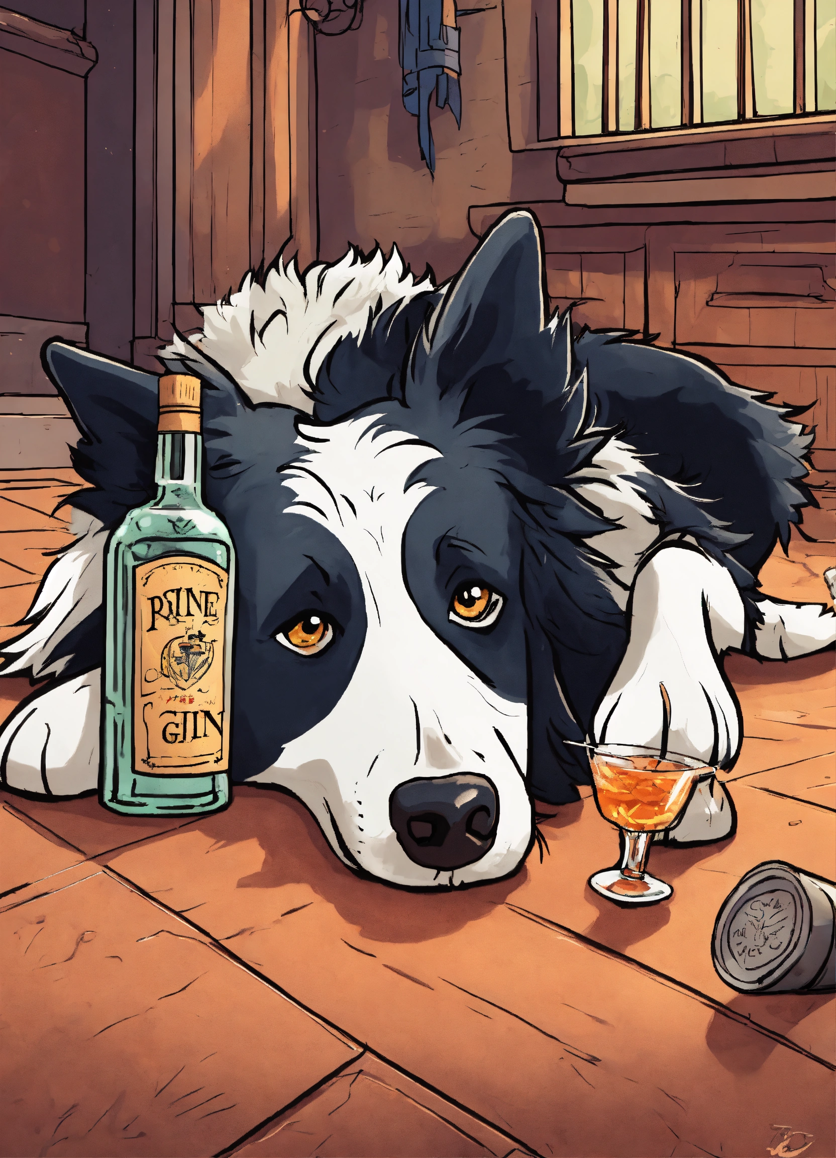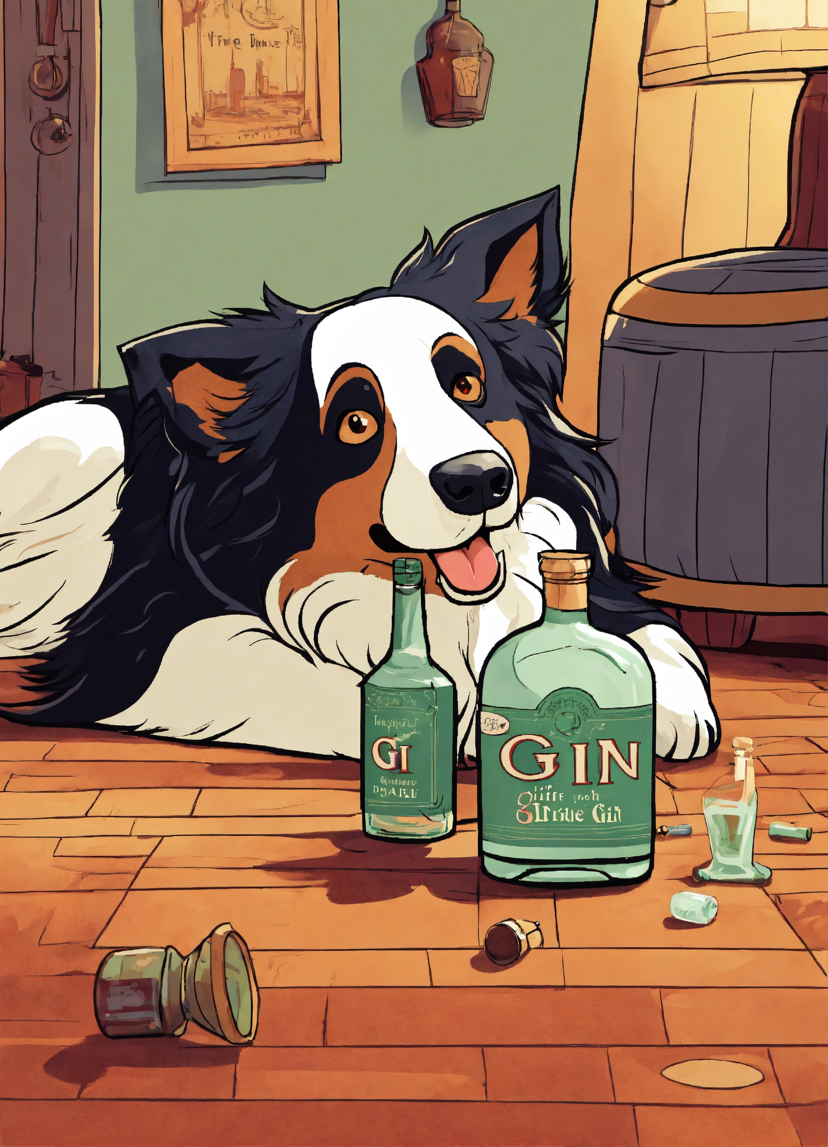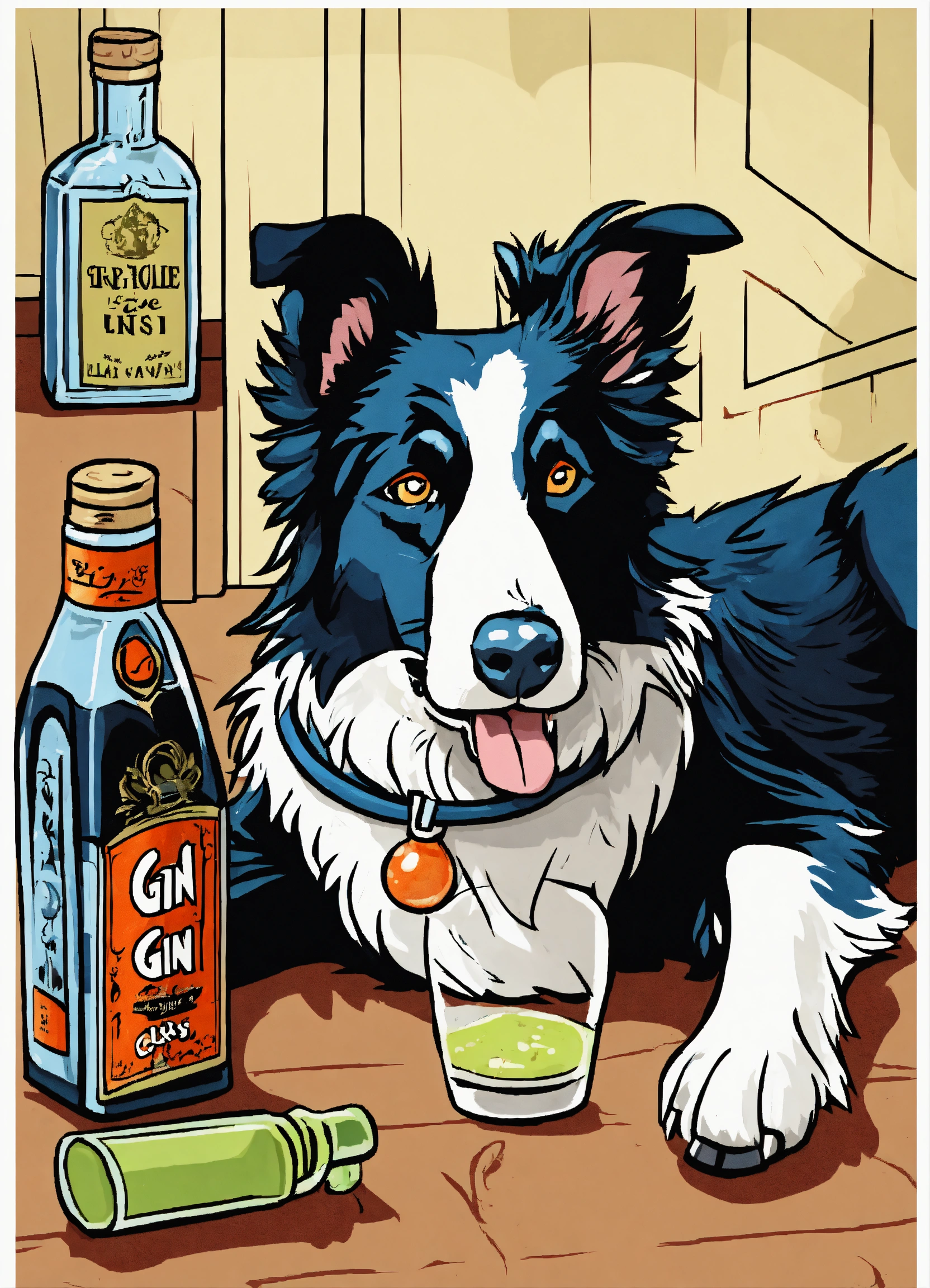 Cartoon style illustration of a life like drunk border collie lay on floor with bottle of gin beside him, cartoon, fantasy, whimsical