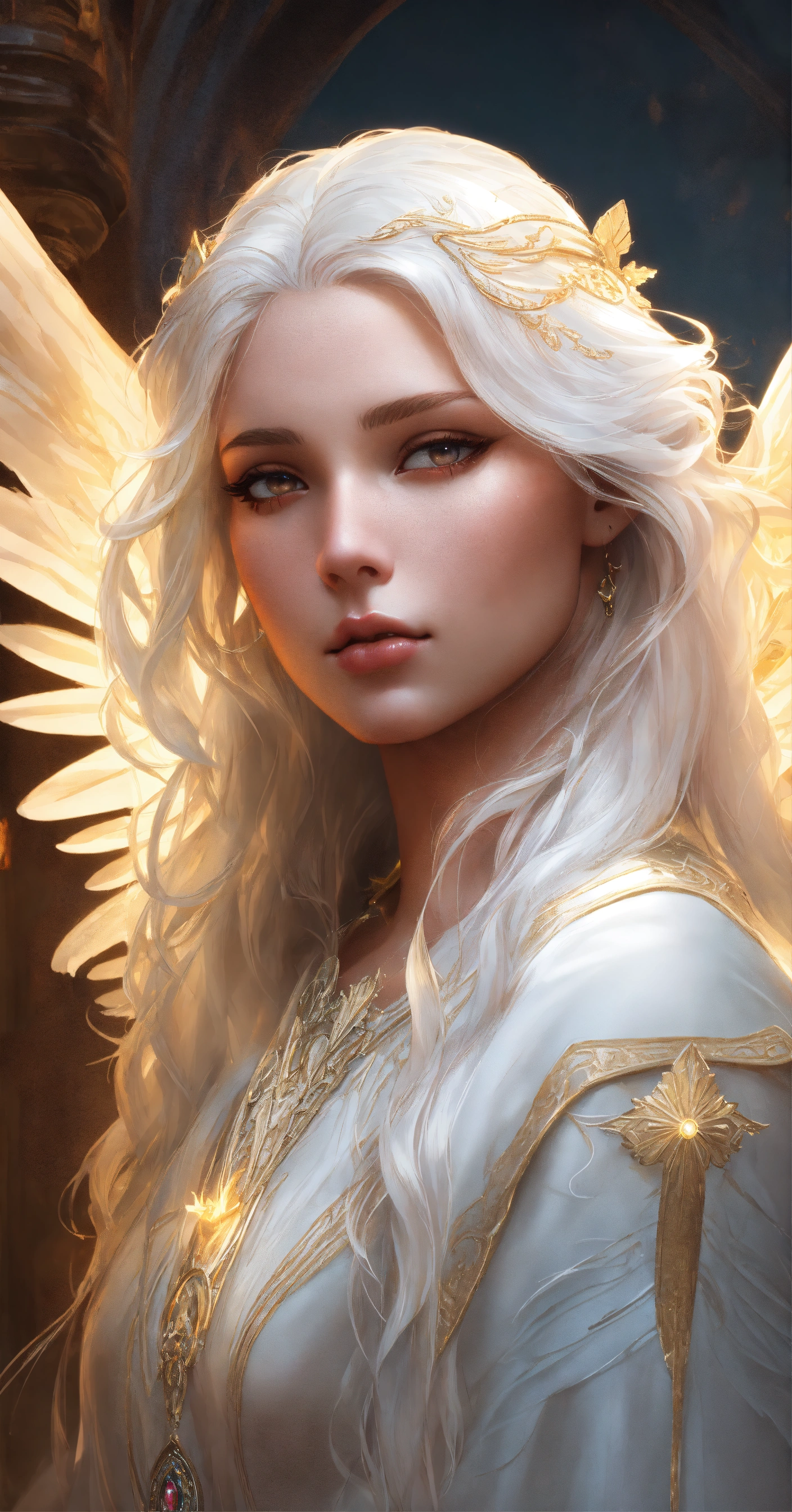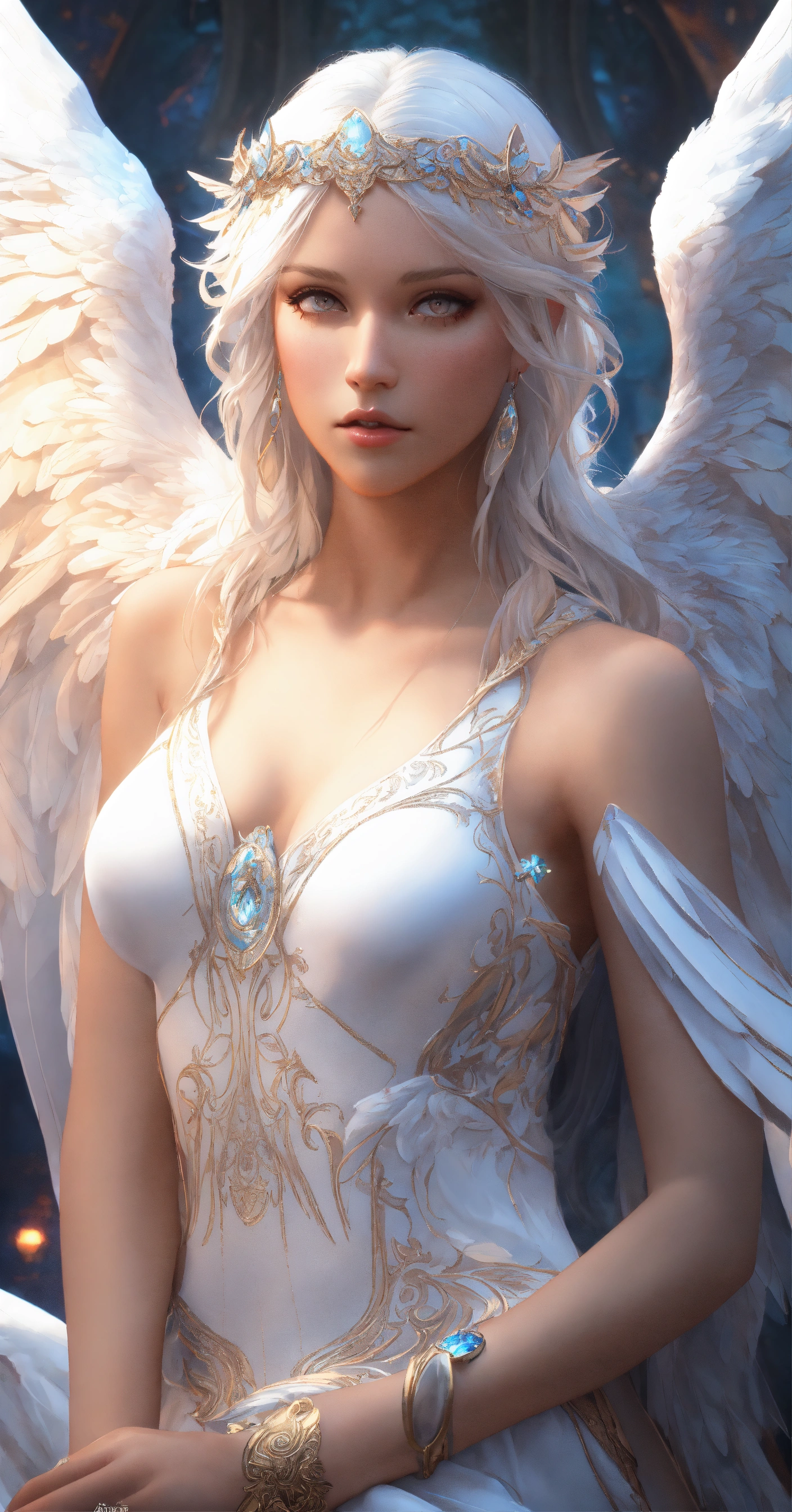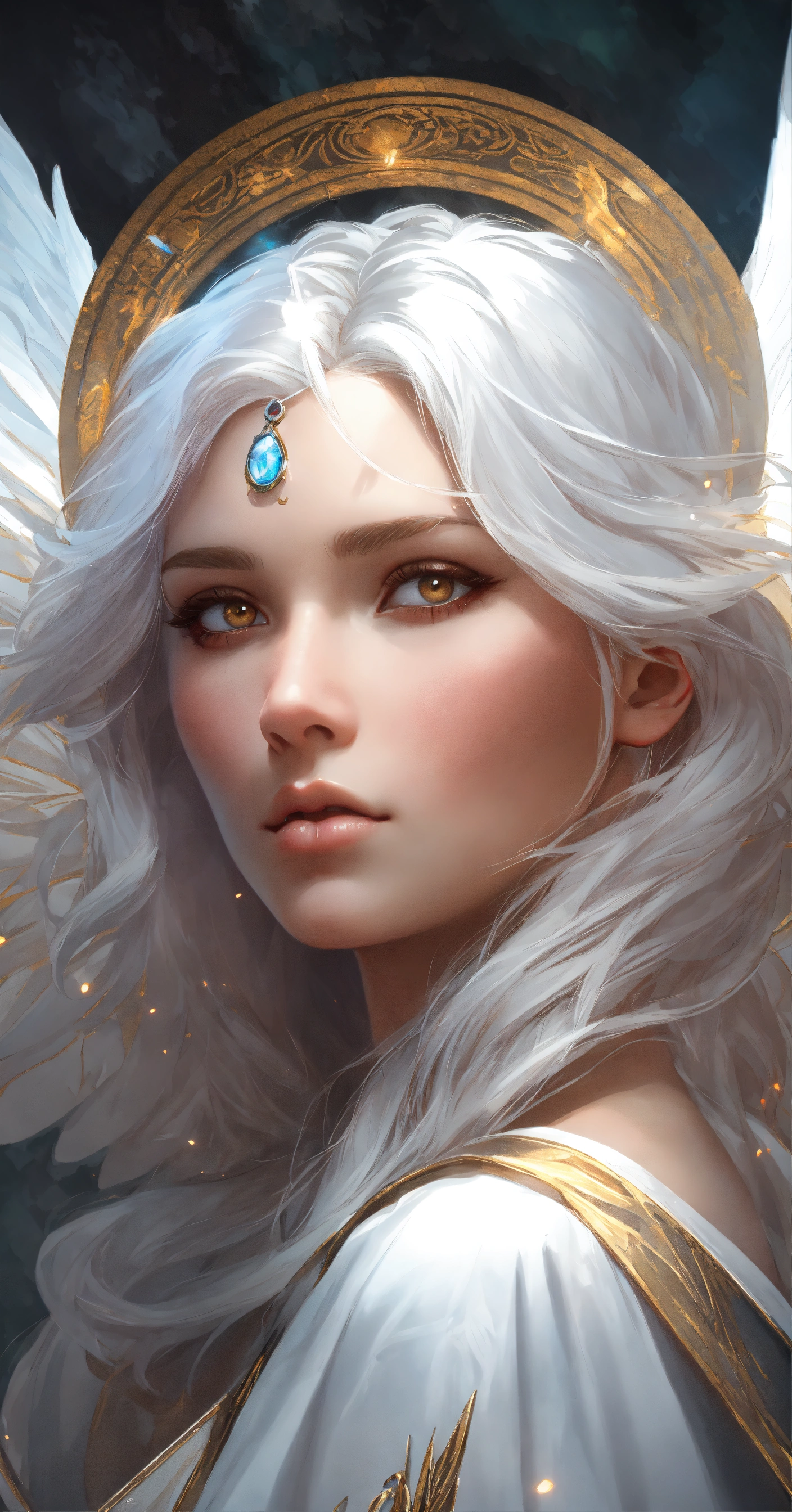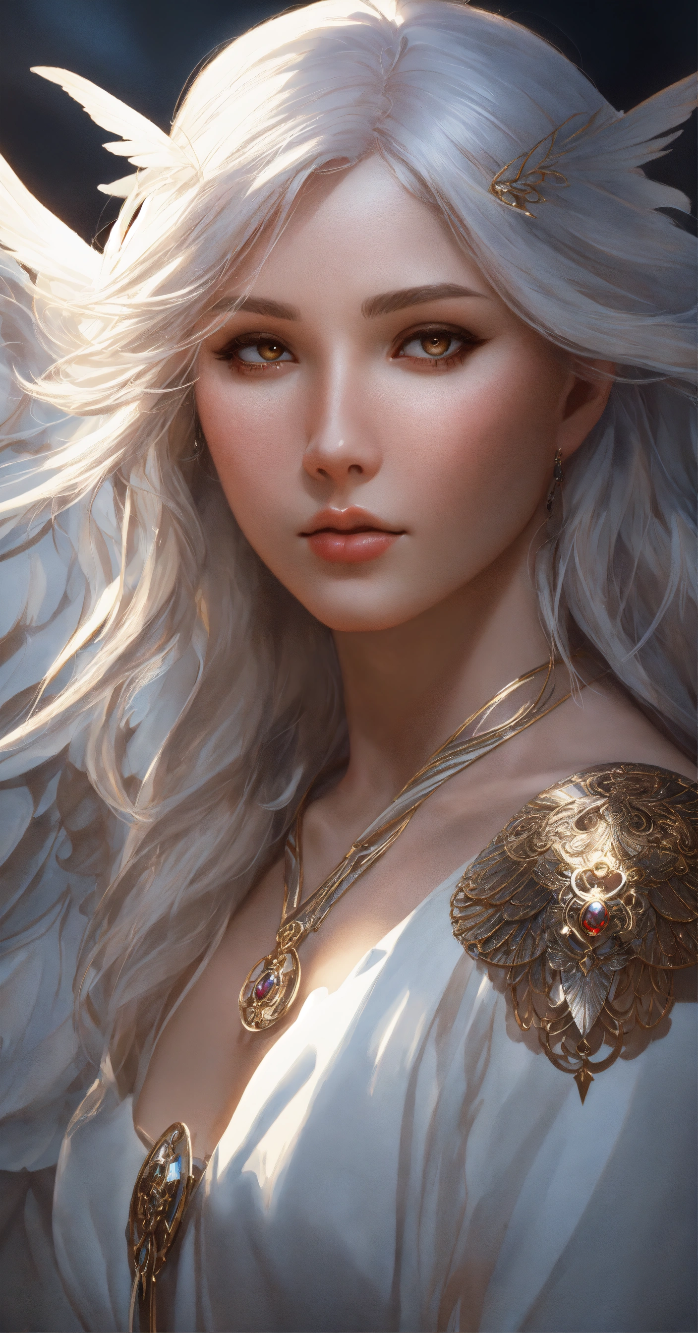 Angel, wings, intricate, headshot, highly detailed, digital painting, art station, real, 3d, large full white wings, white hair, white eyes and deep gaze, jewel in third eye, mystical, sharp focus, cinematic lighting, 8k, illustration, art by artgerm and greg rutkowski, alphonse mucha, cgsociety