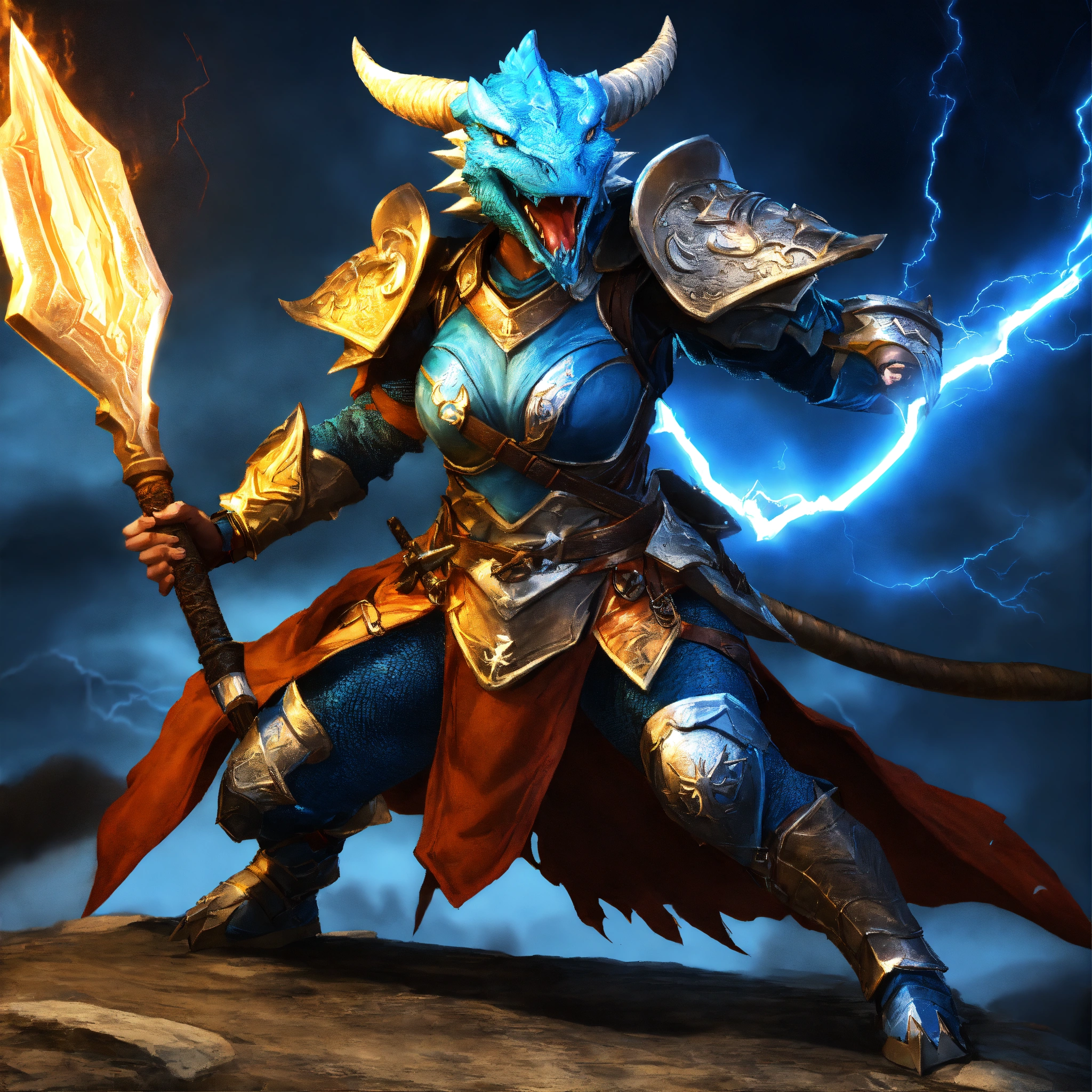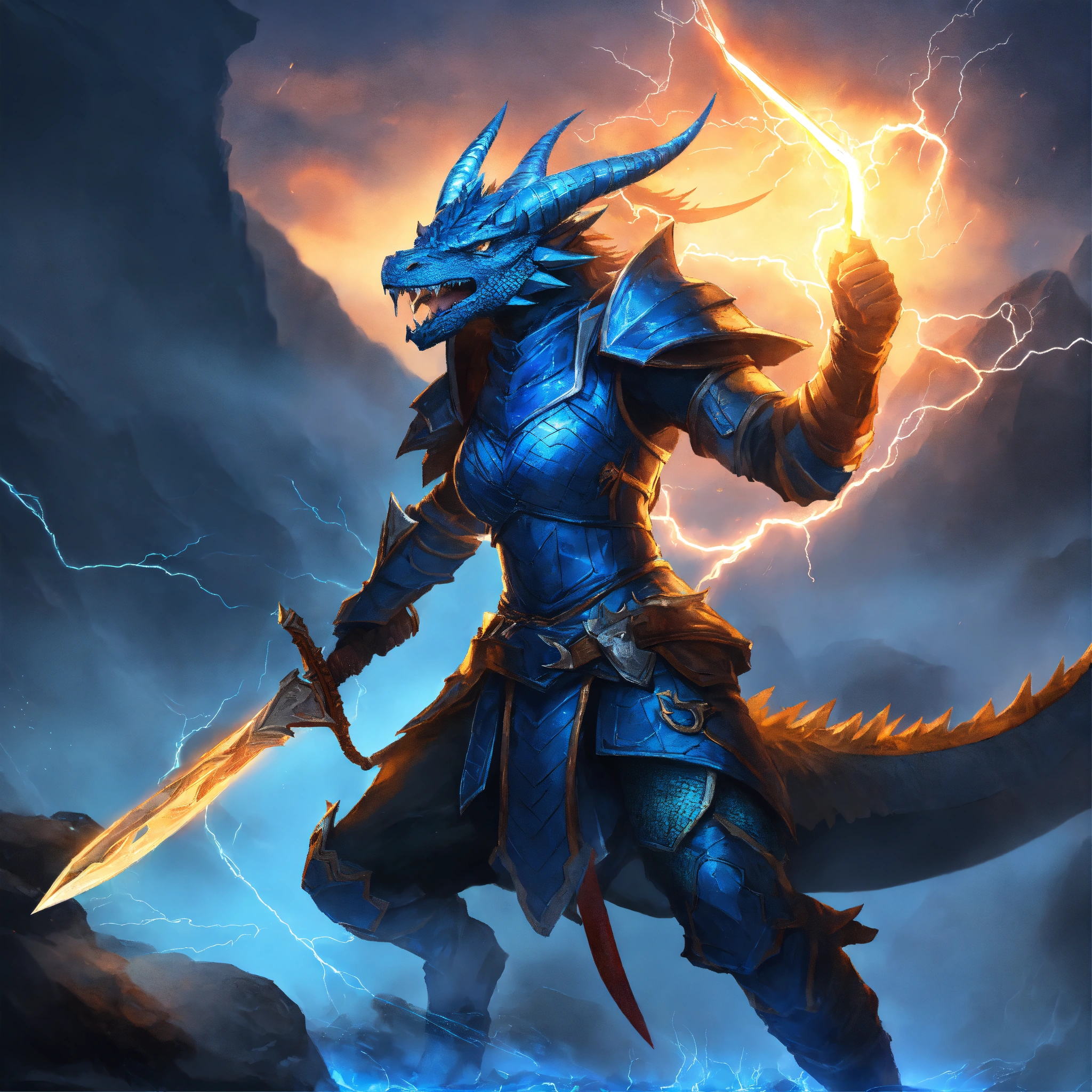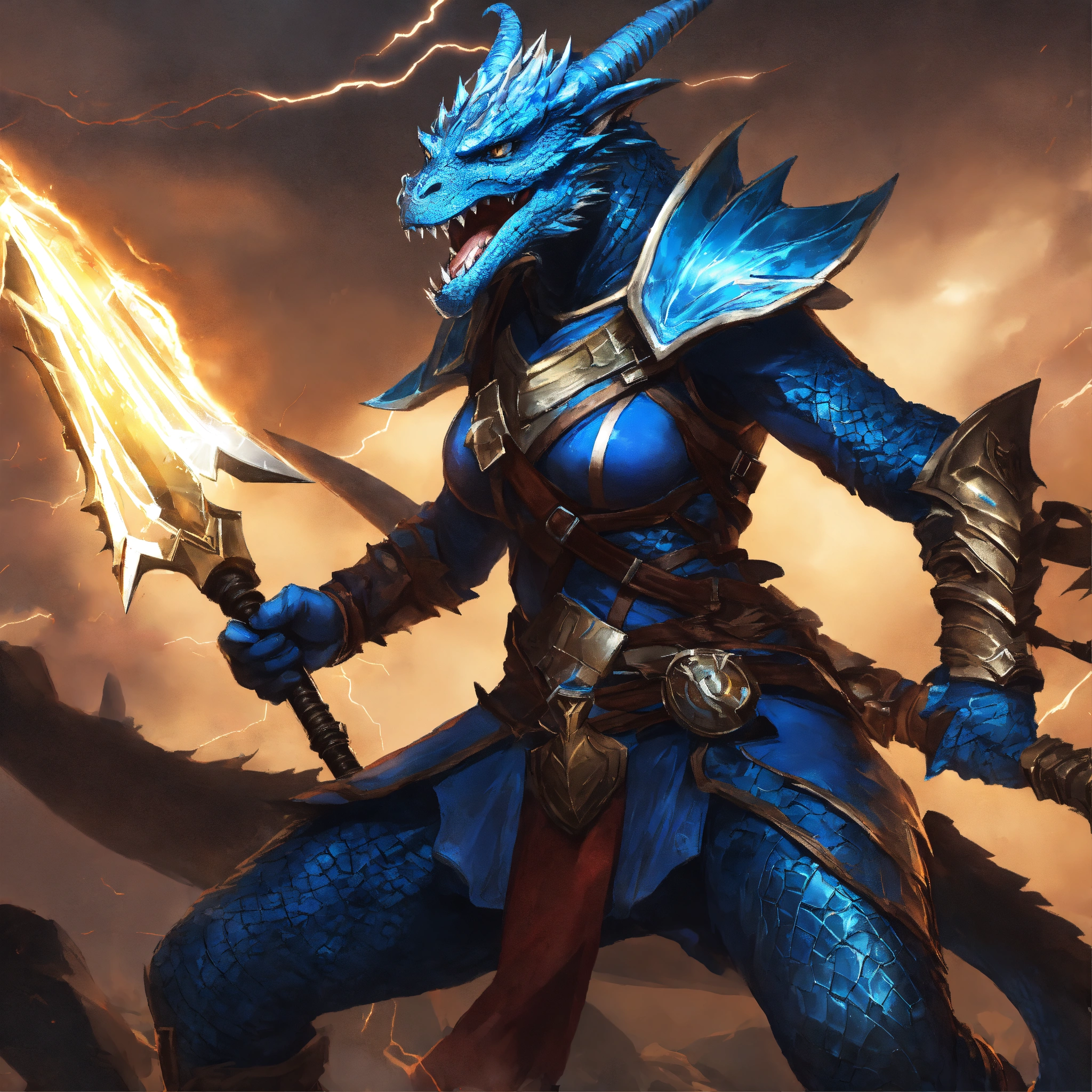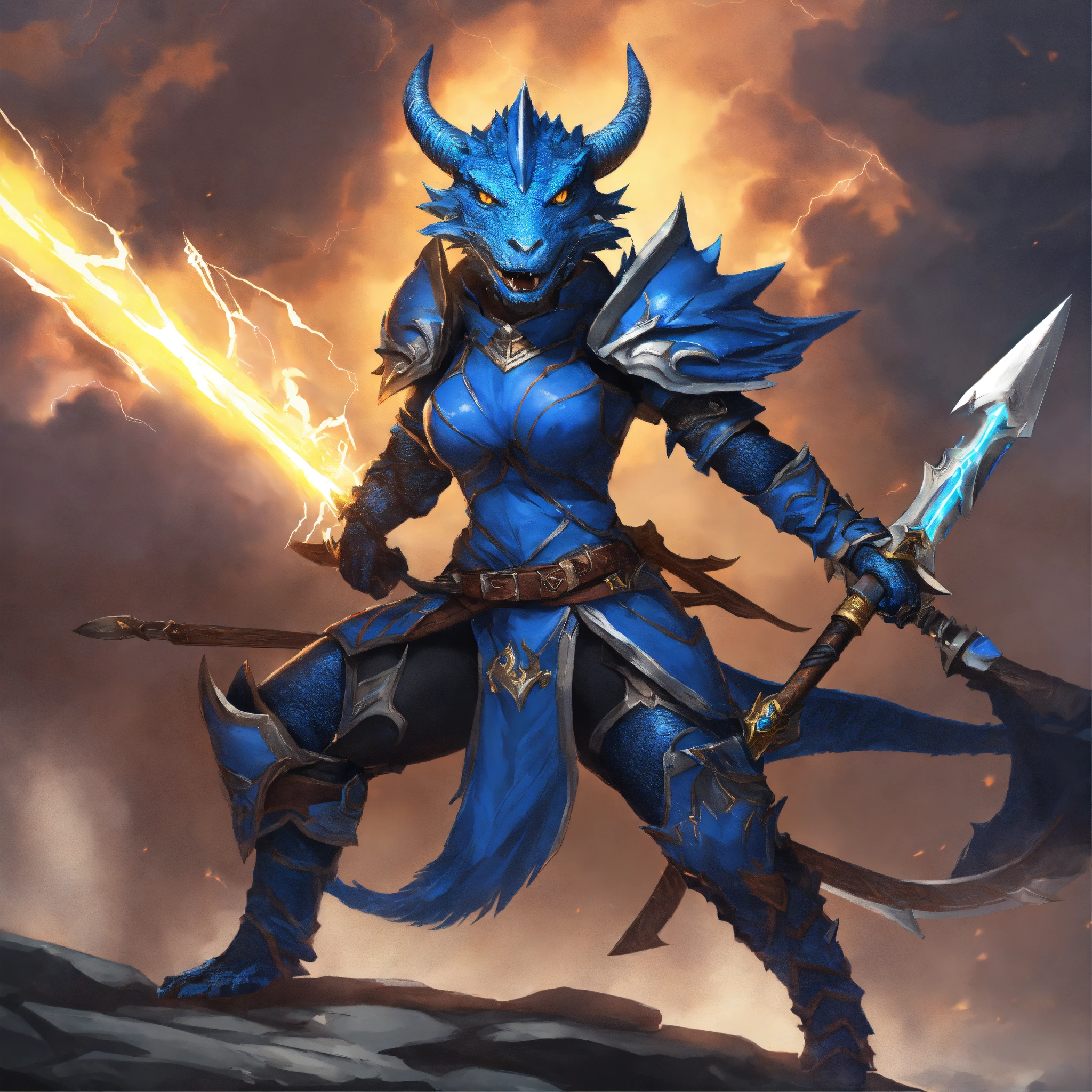 Aggressive female blue dragonborn with glaive, defensive stance, breathing lightning bolt out of the mouth