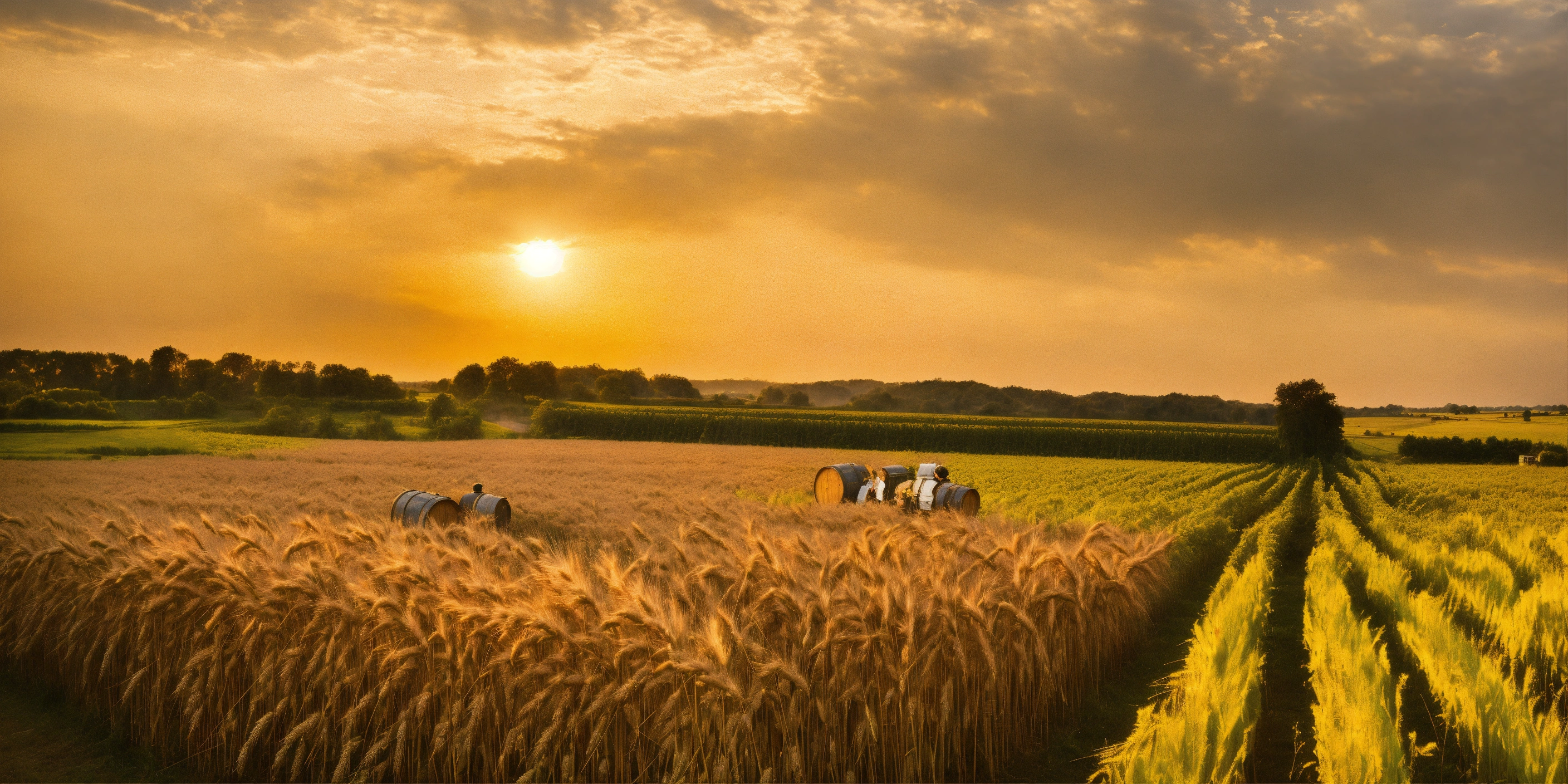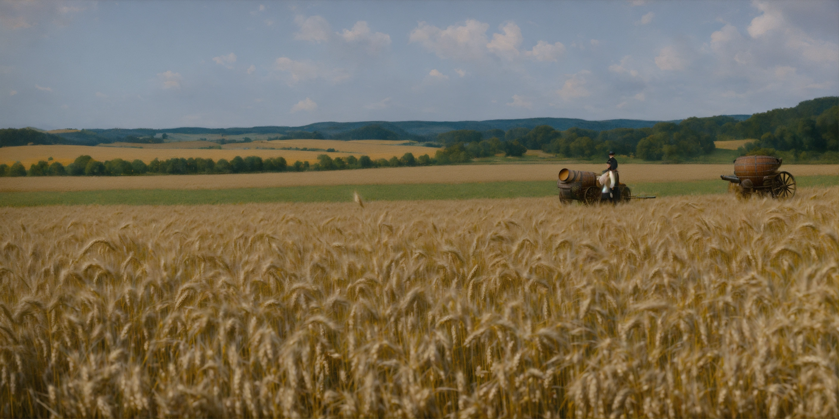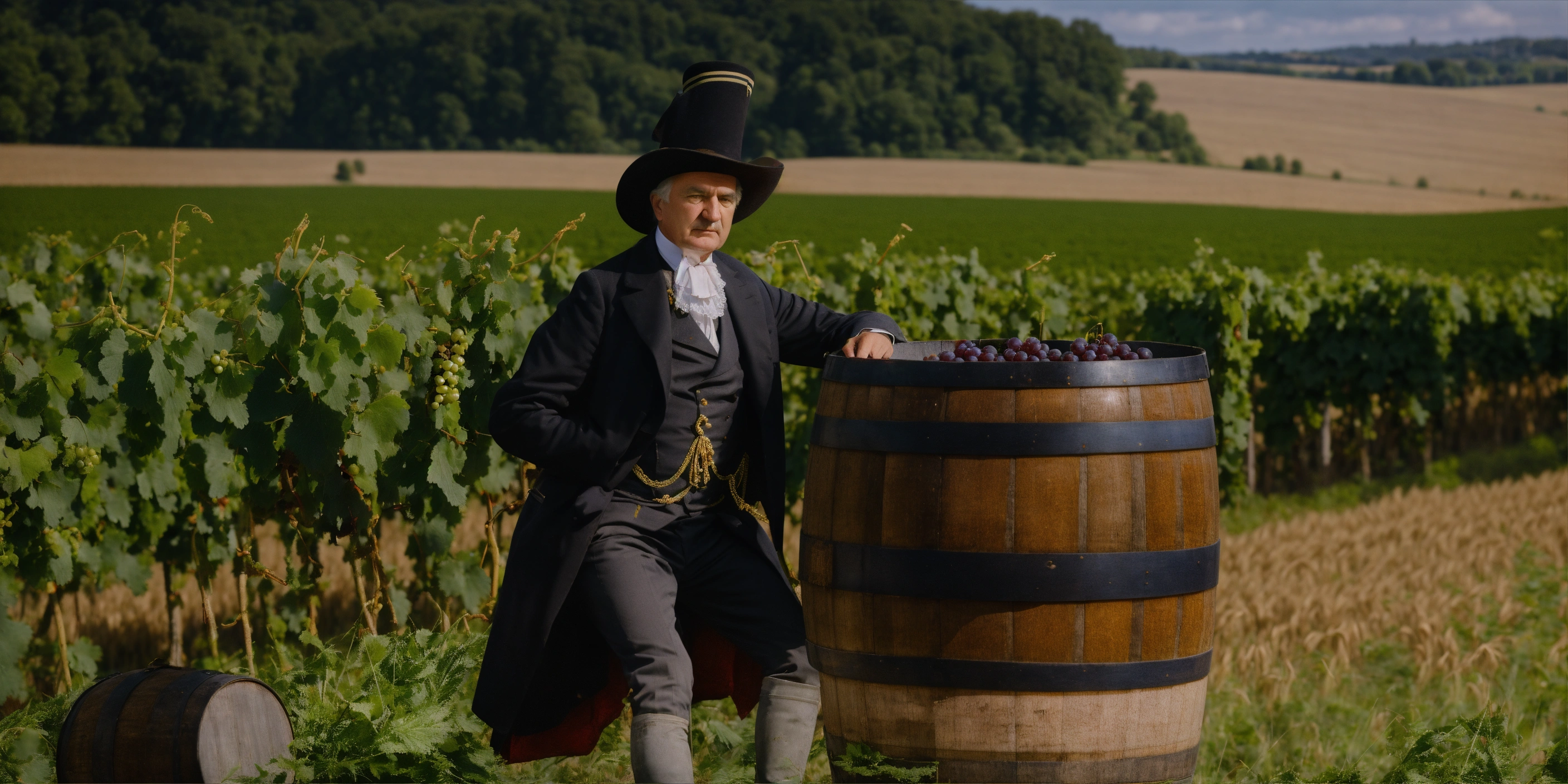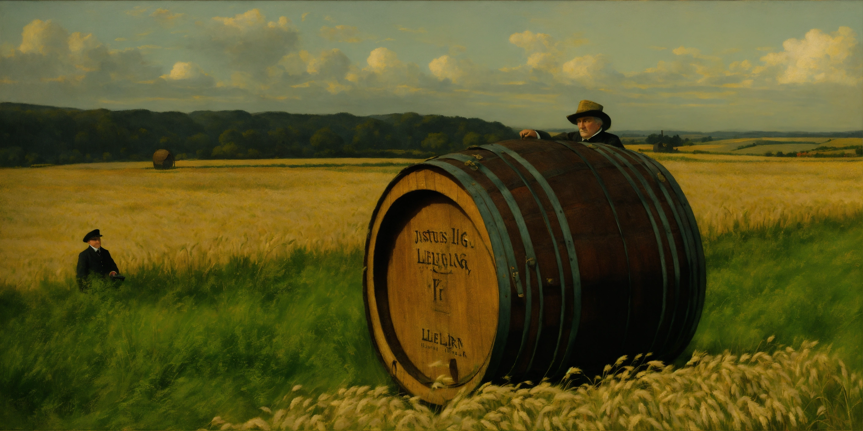 Justus von liebig in a field of wheat with a barrel full of grapes