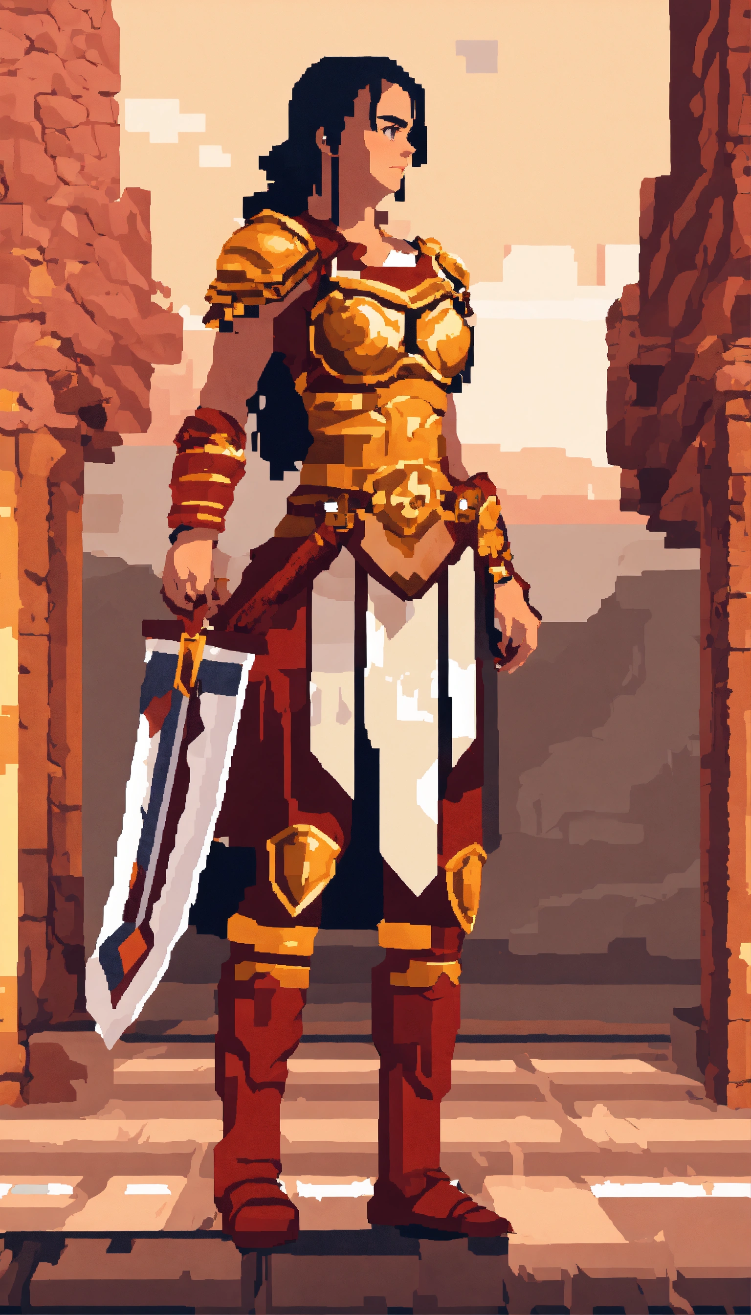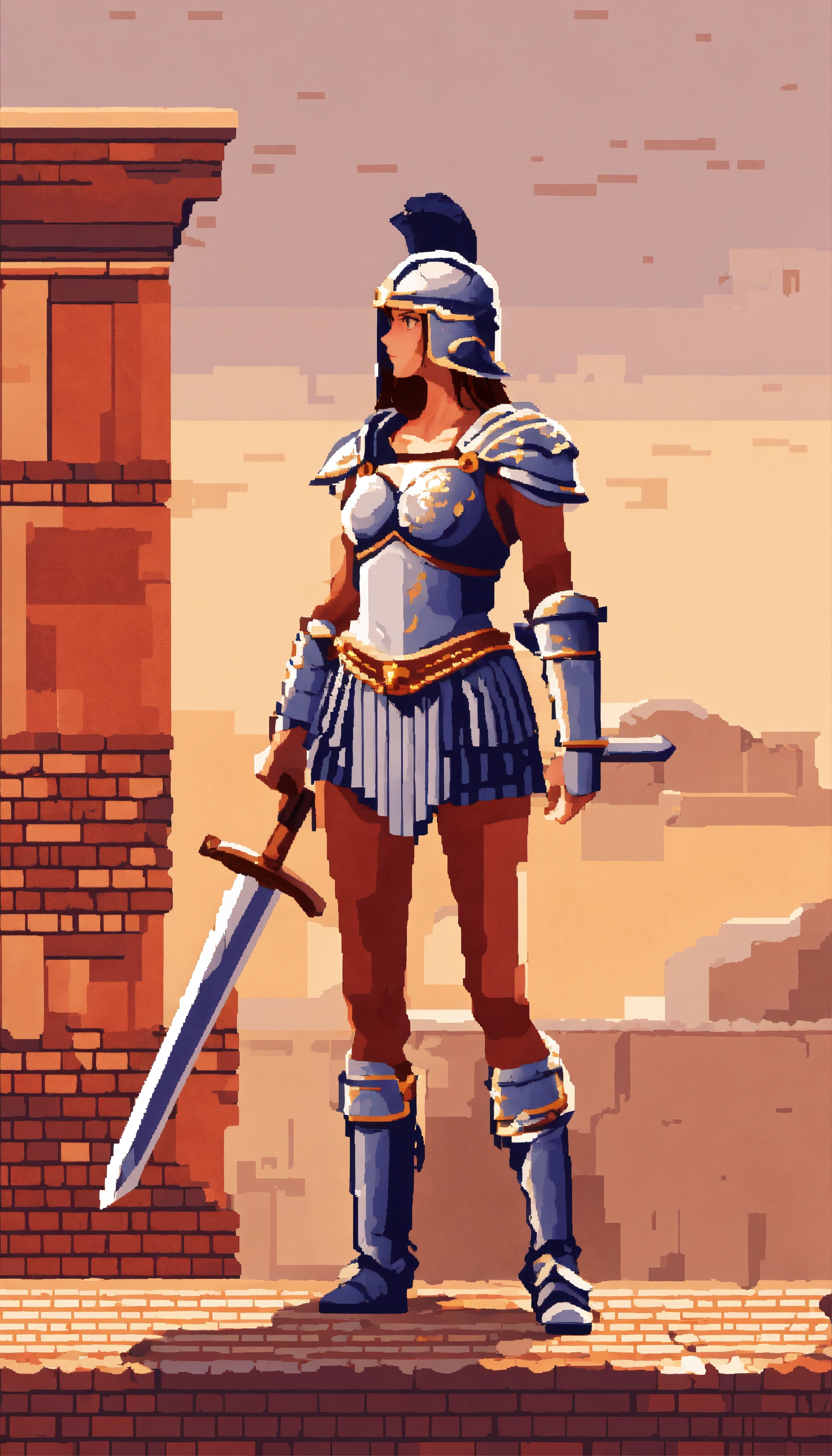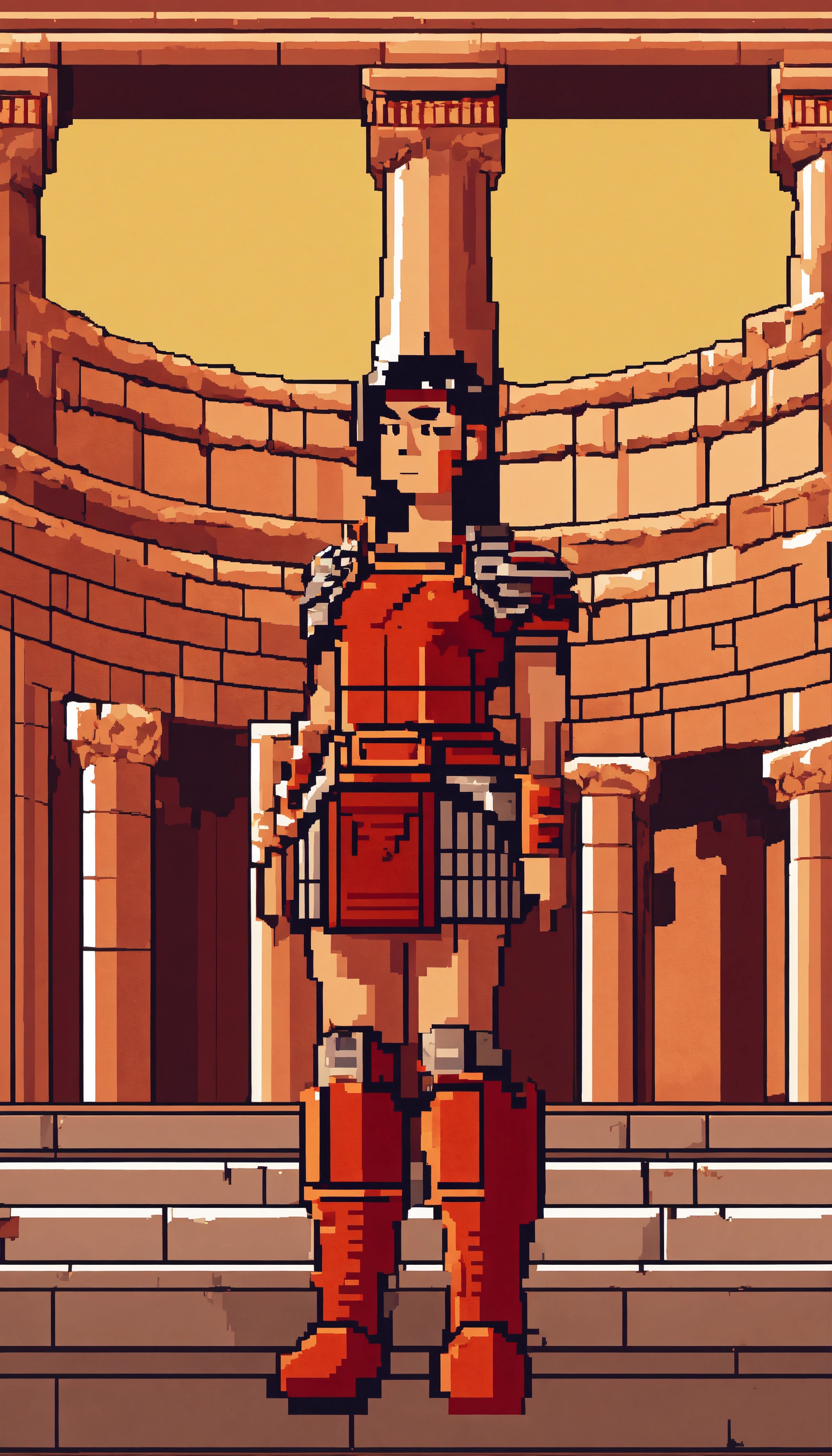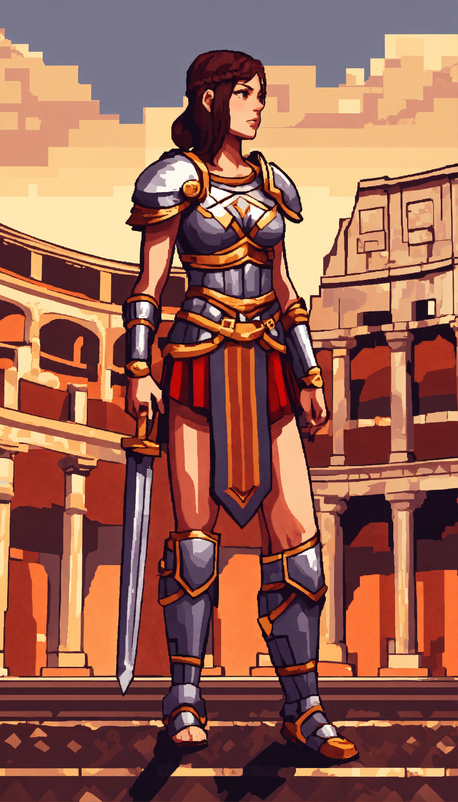 A pixel art of a female gladiator in the iconic roman gladiator armor, standing with confidence in the colosseum.