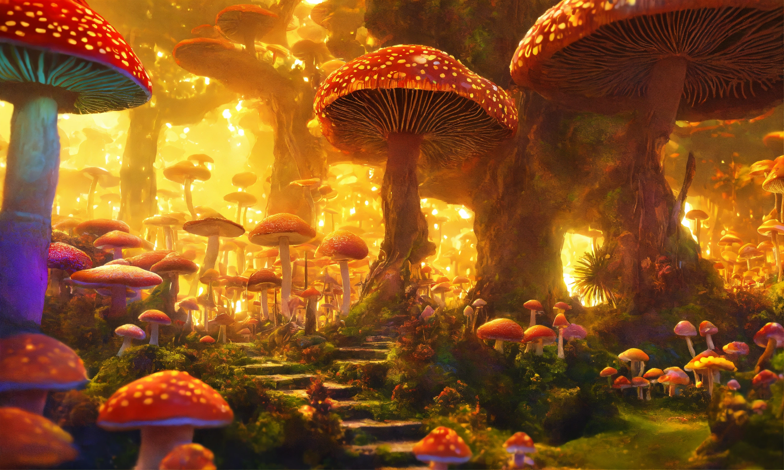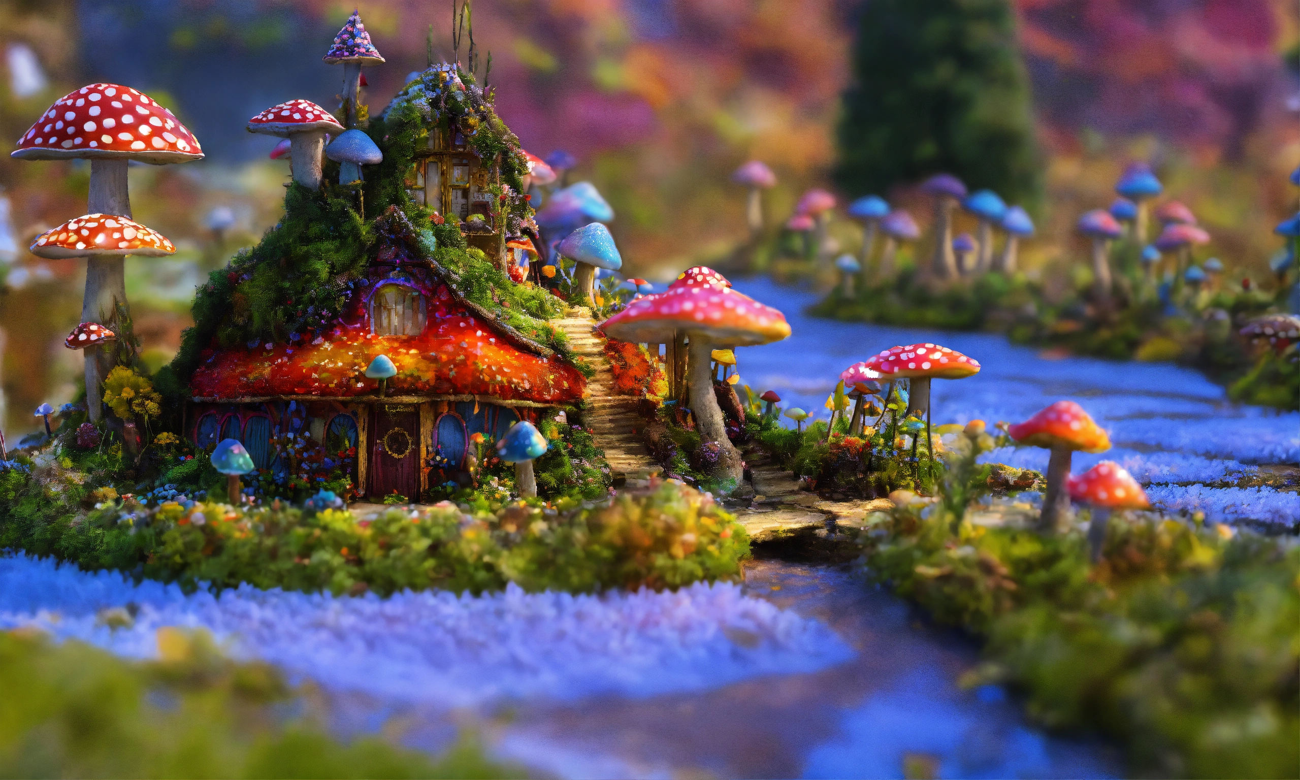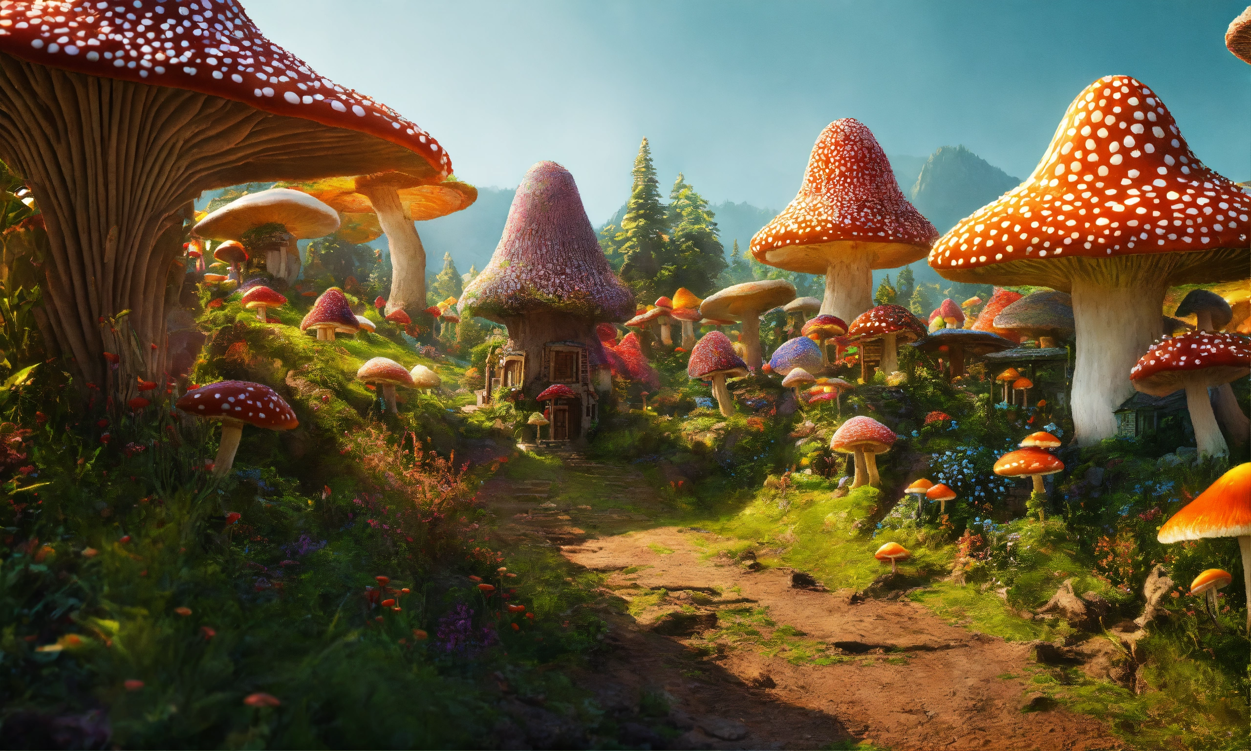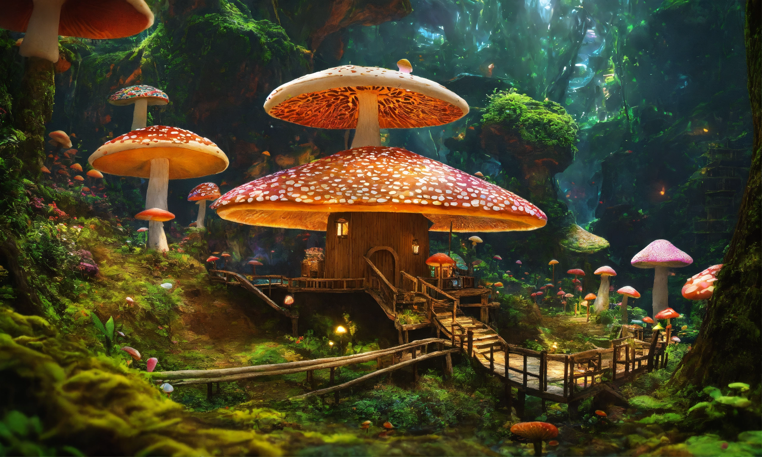 An intricate village made of psychedelic mushrooms
