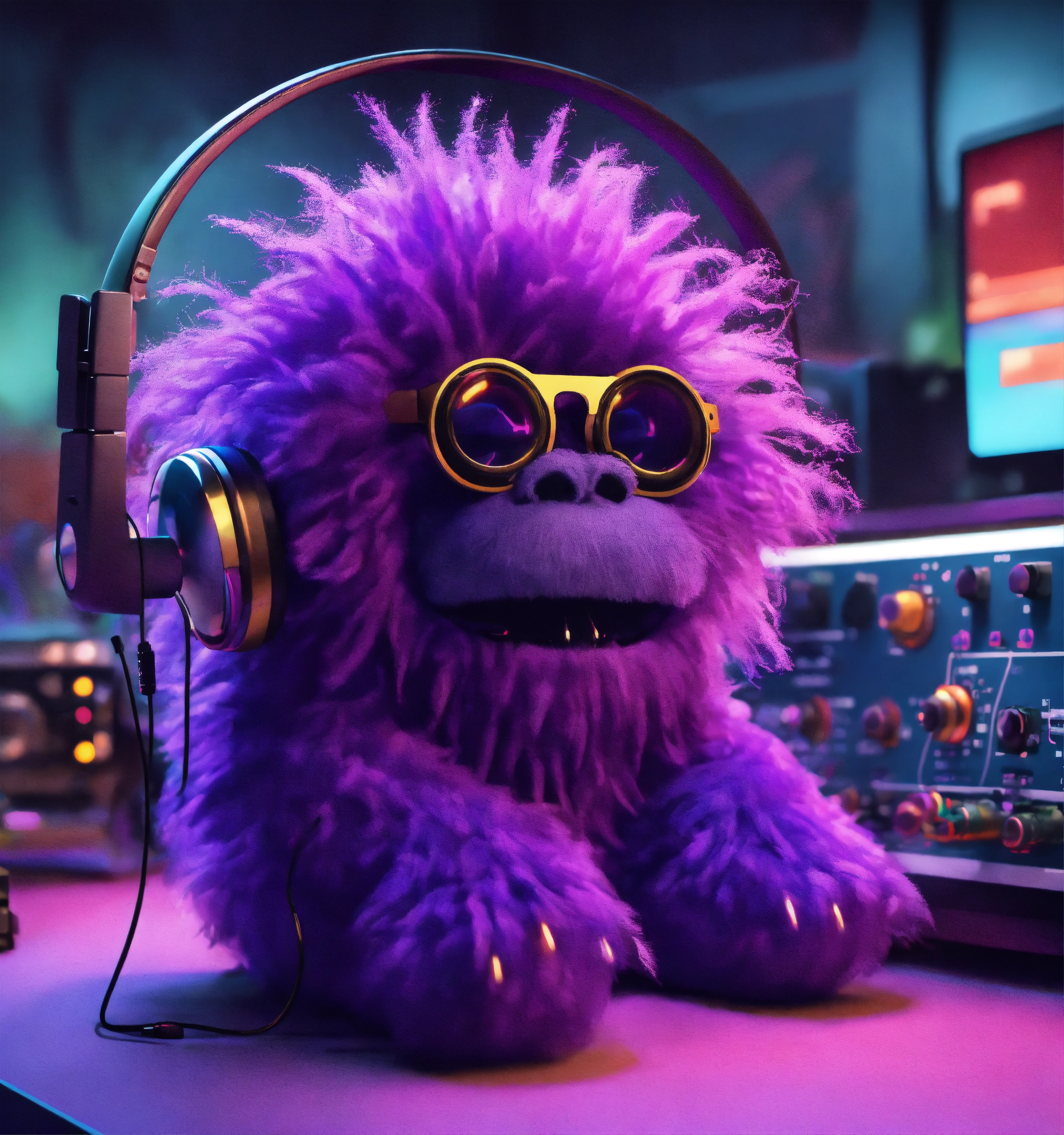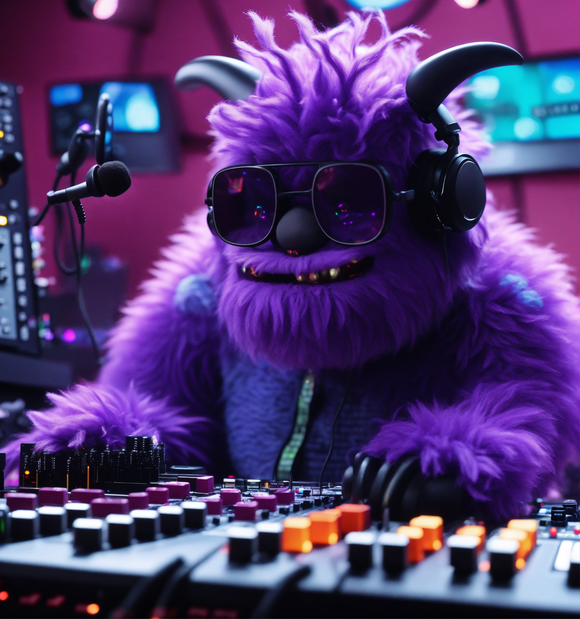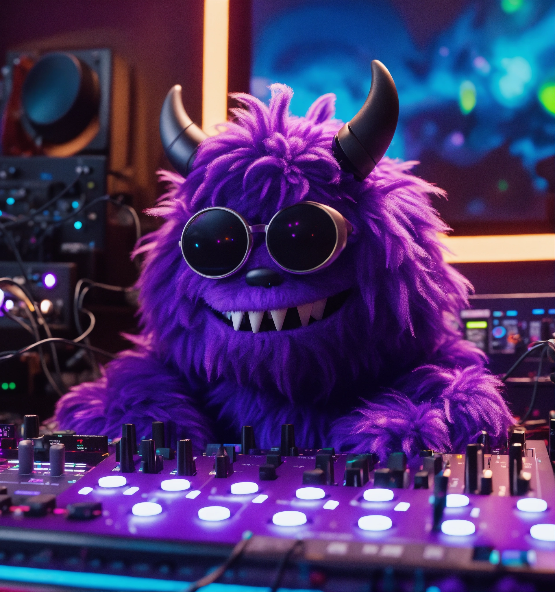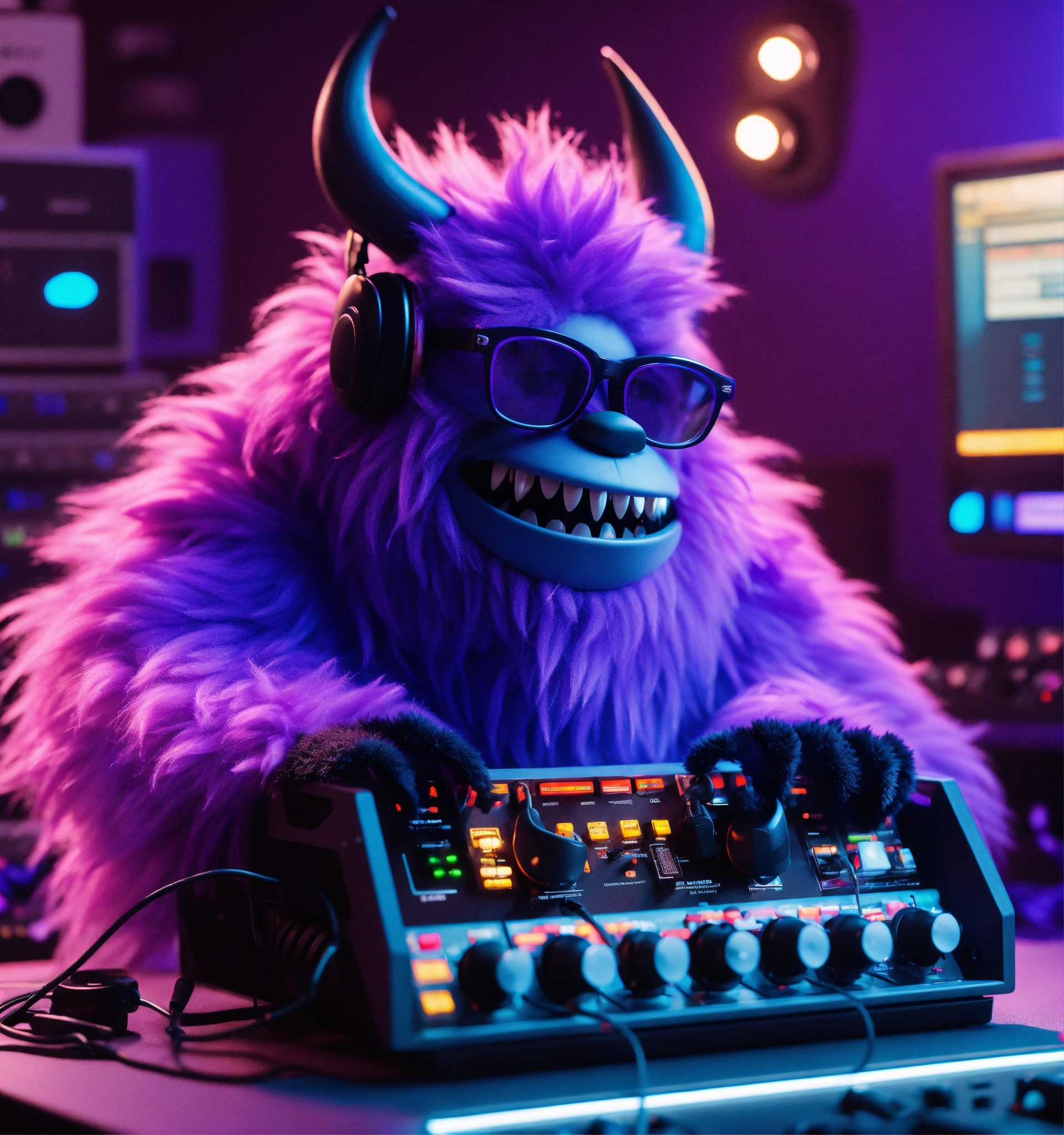 Zoom out on a big, fun loving, fuzzy purple monster wearing hi tech earphones and glasses, sitting at an futuristic analog modular synths, in a studio, hands on controls, pixar, disney, unreal engine