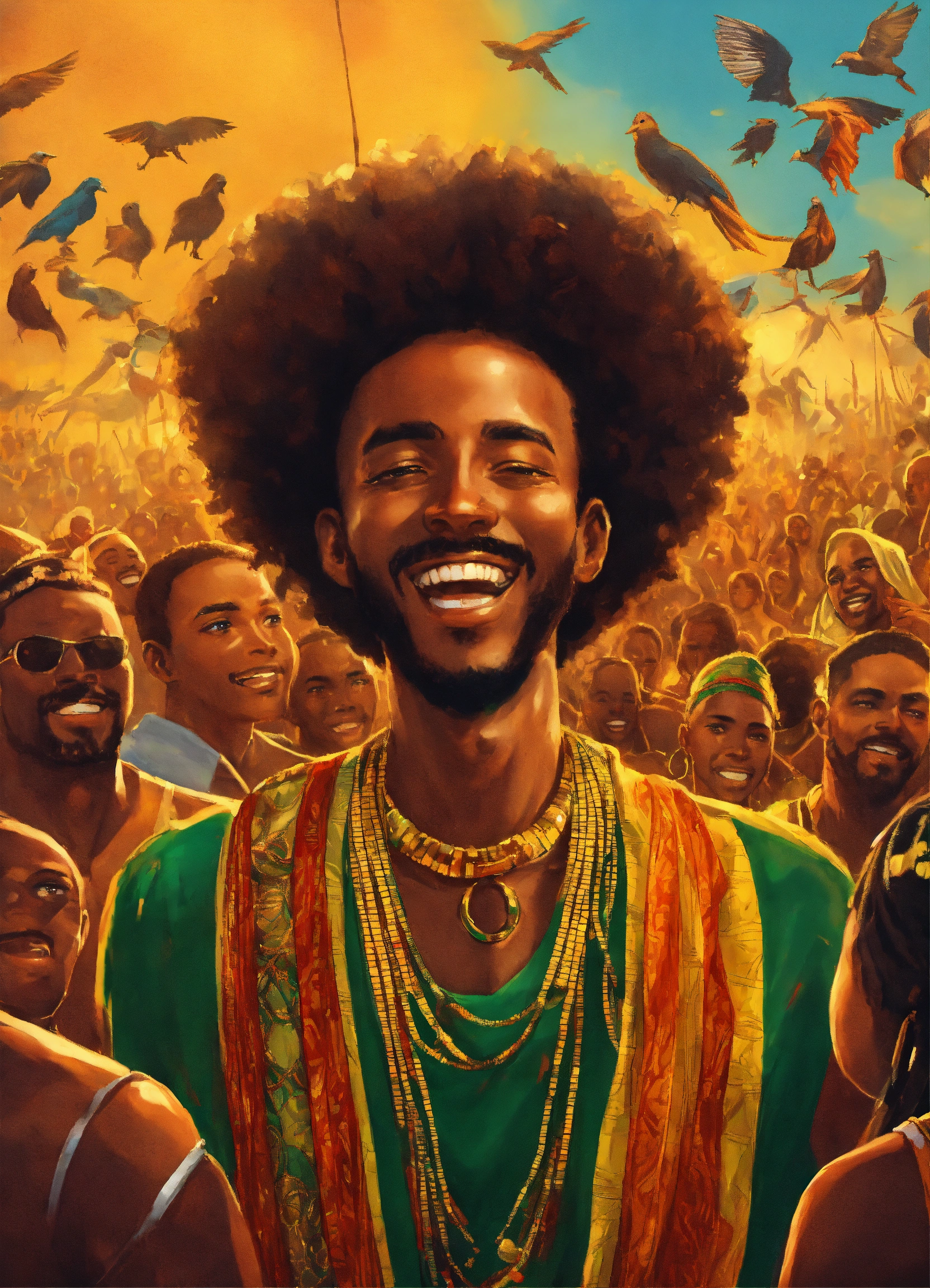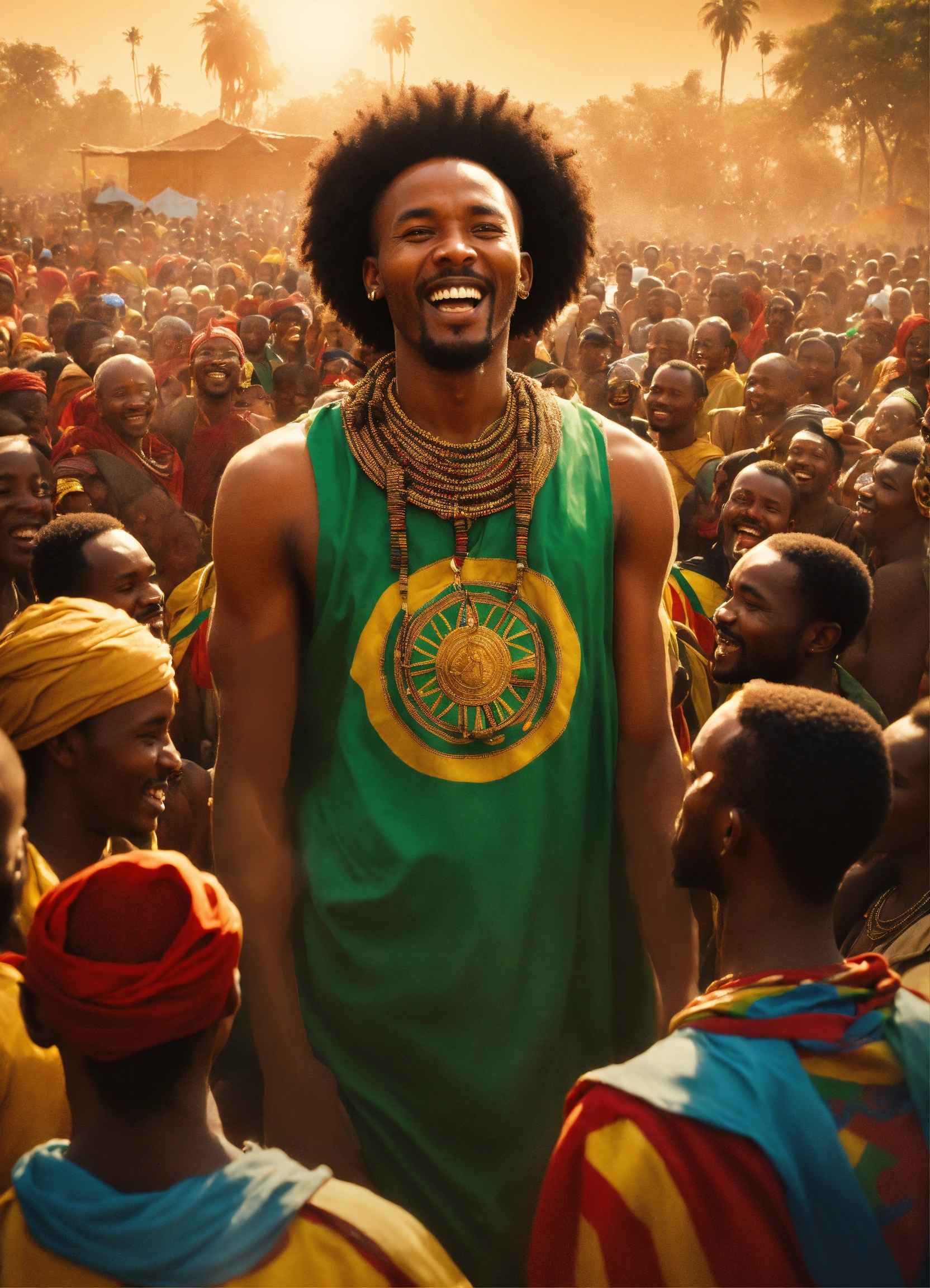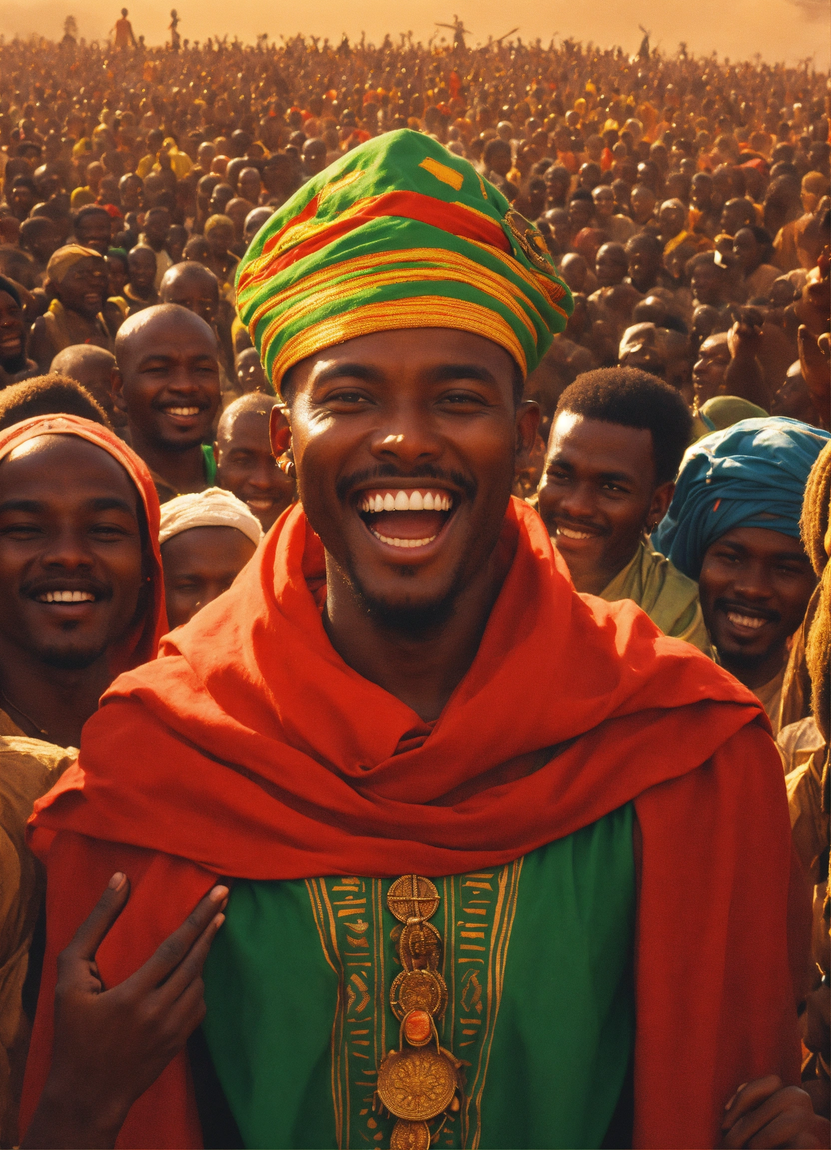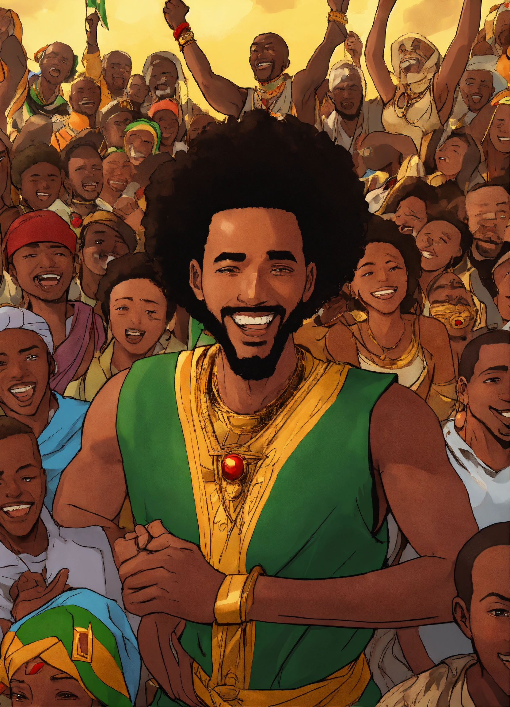 An ethiopian person surrounded by a lot of african people and praising him, super villain grin on face
