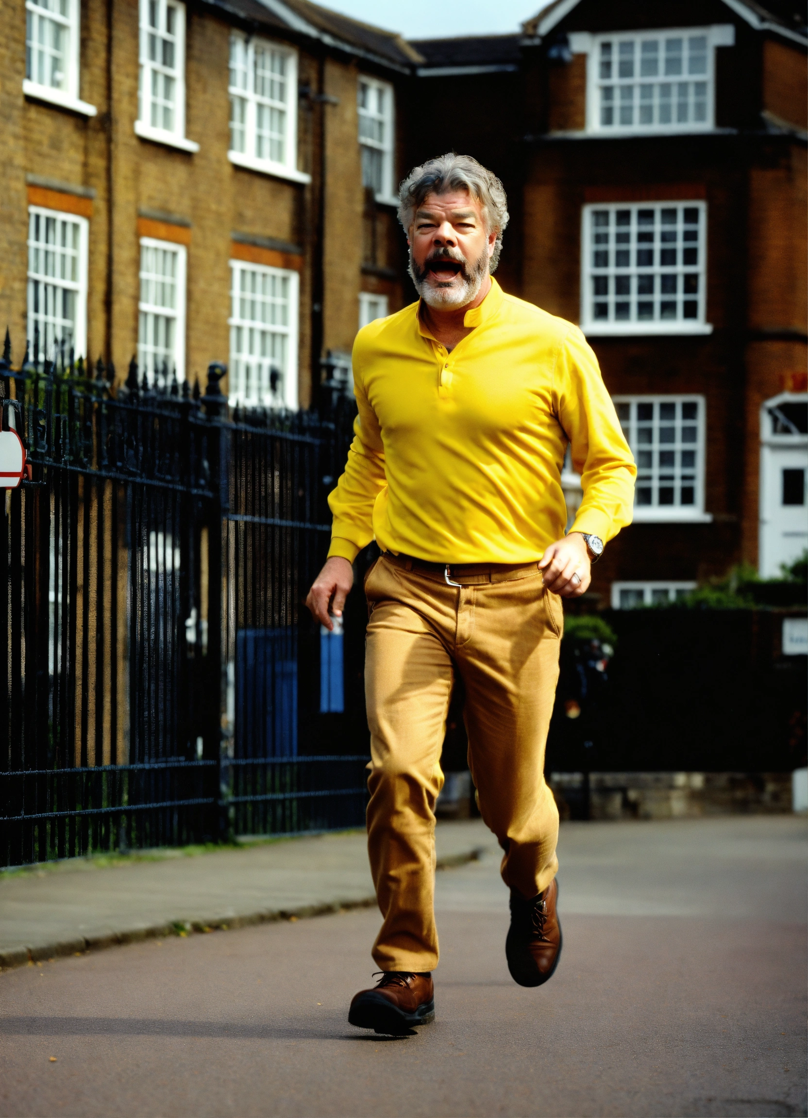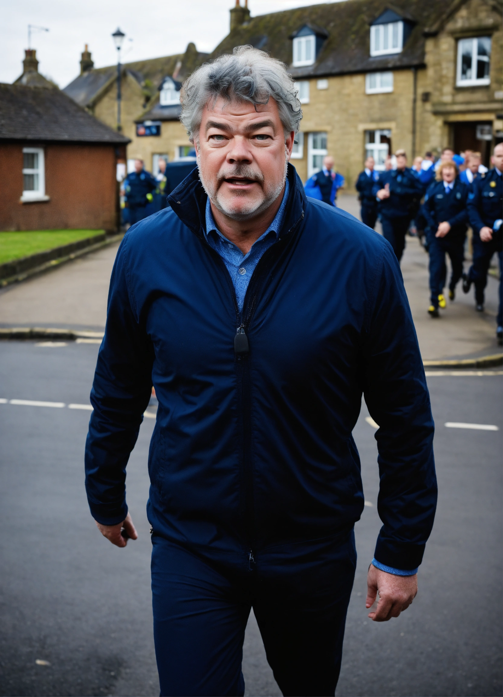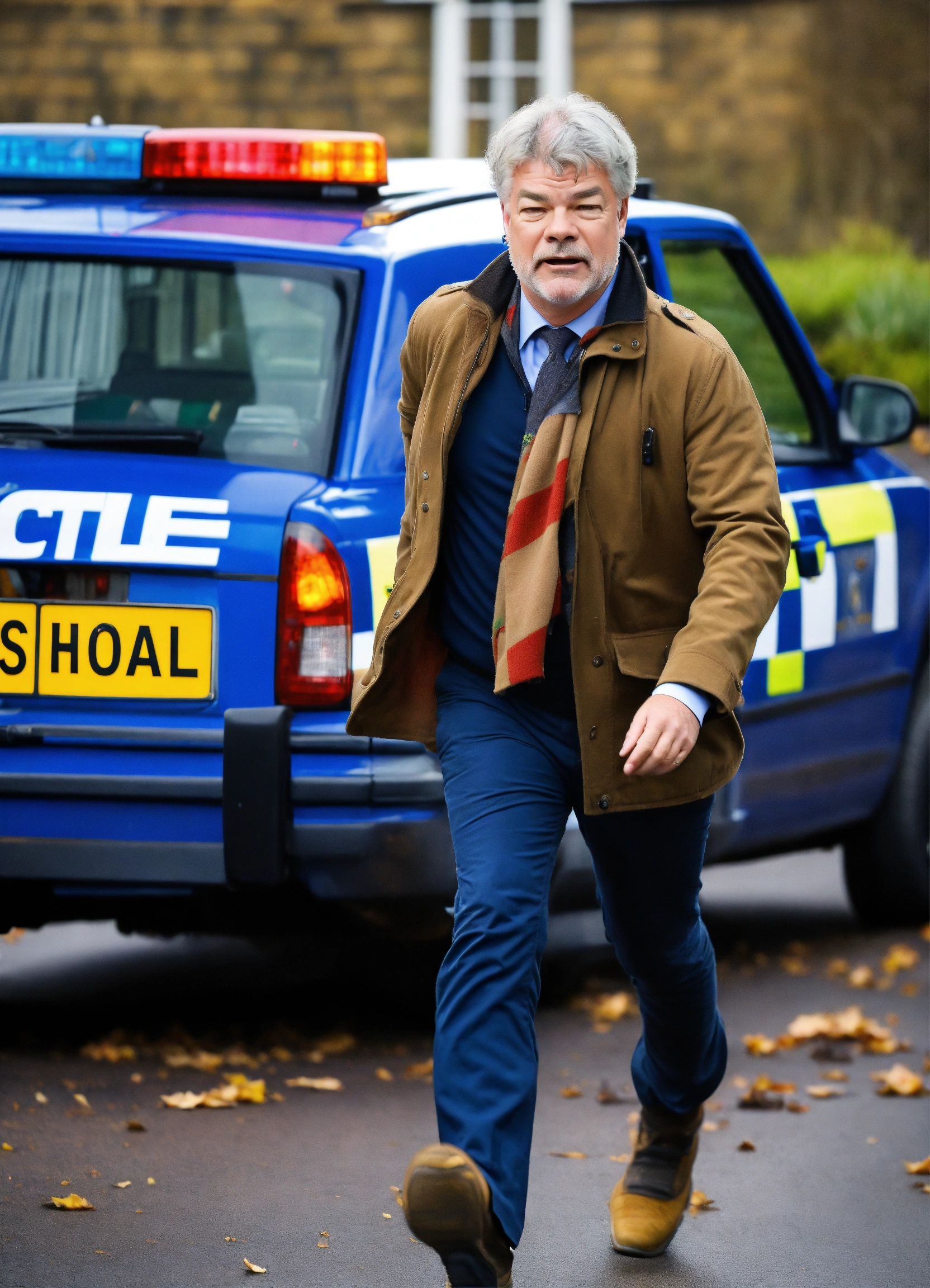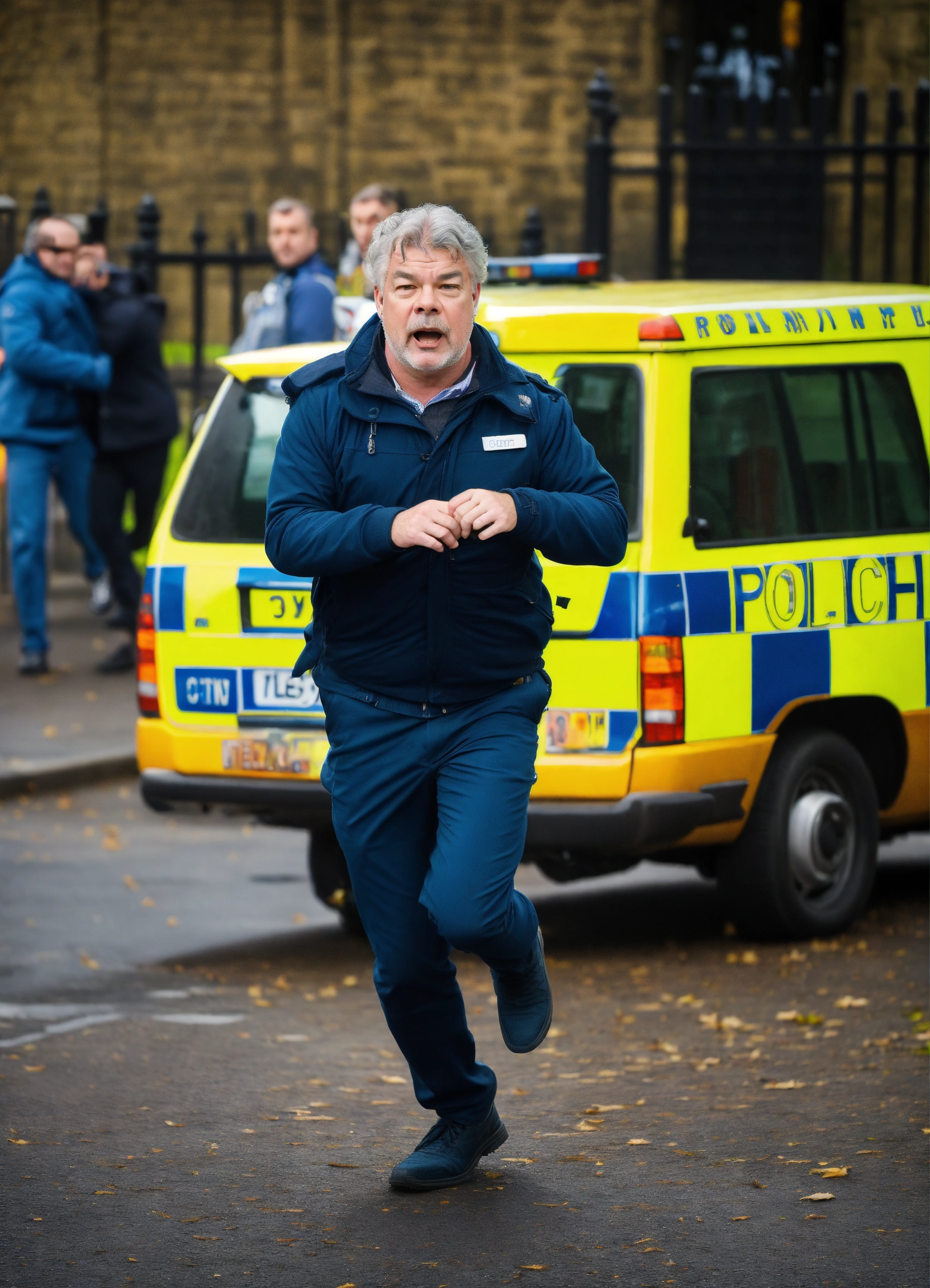 Tv presenter matthew kelly, scared, aged 35, with a short beard and curly hair. running away from busy school gates. police car driving towards camera in the background.