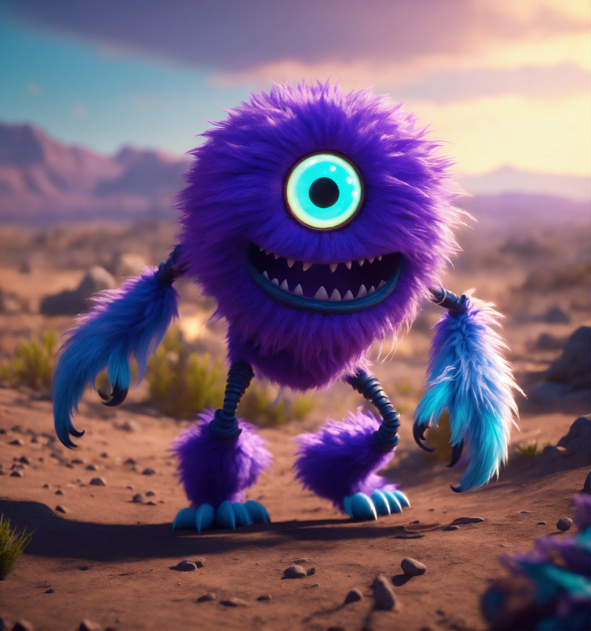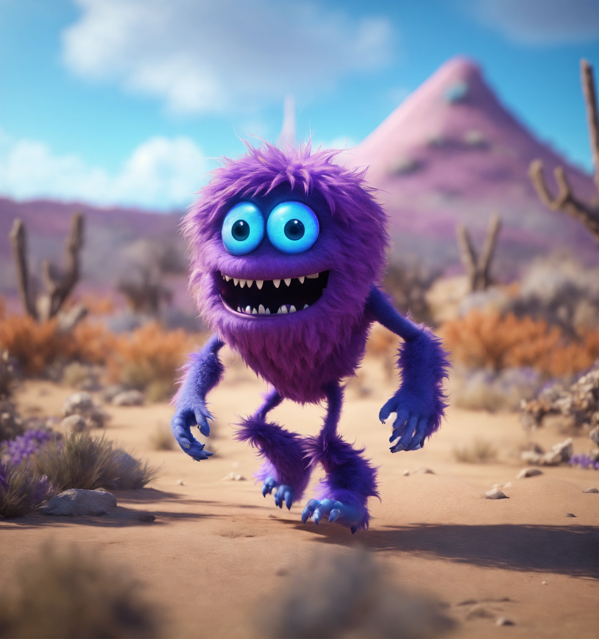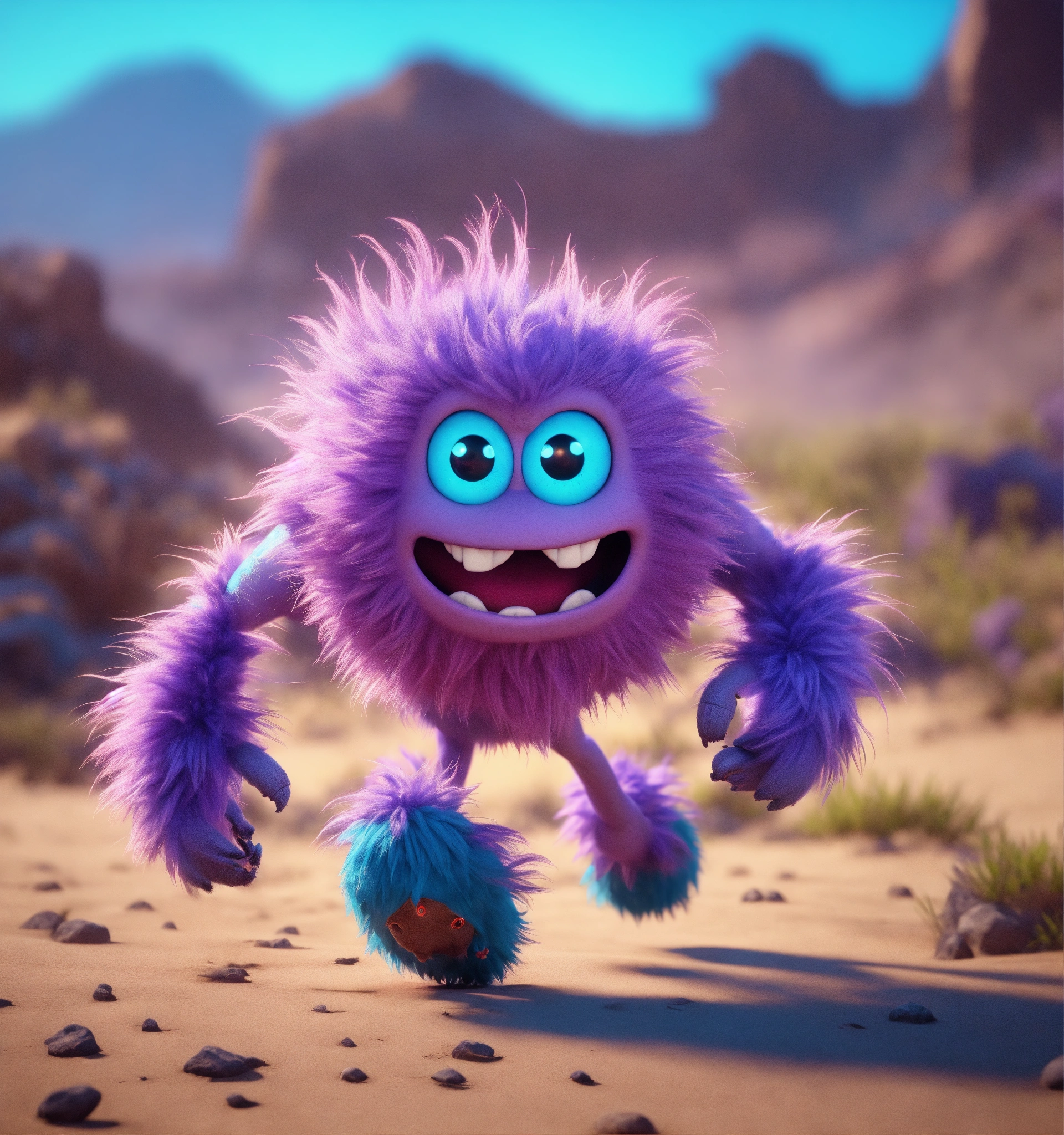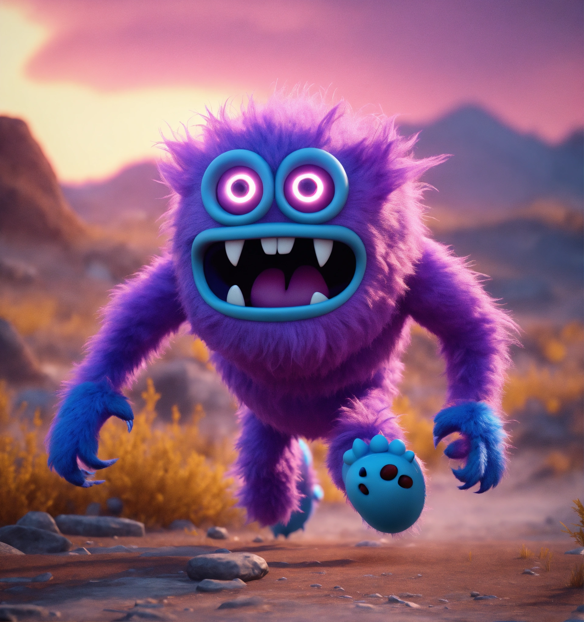 Zoom out on a friendly, fun loving, hairy violet colored monster with glowing blue eyes, cartoon character running in a wasteland sci-fi, 8k, unreal engine, pixar
