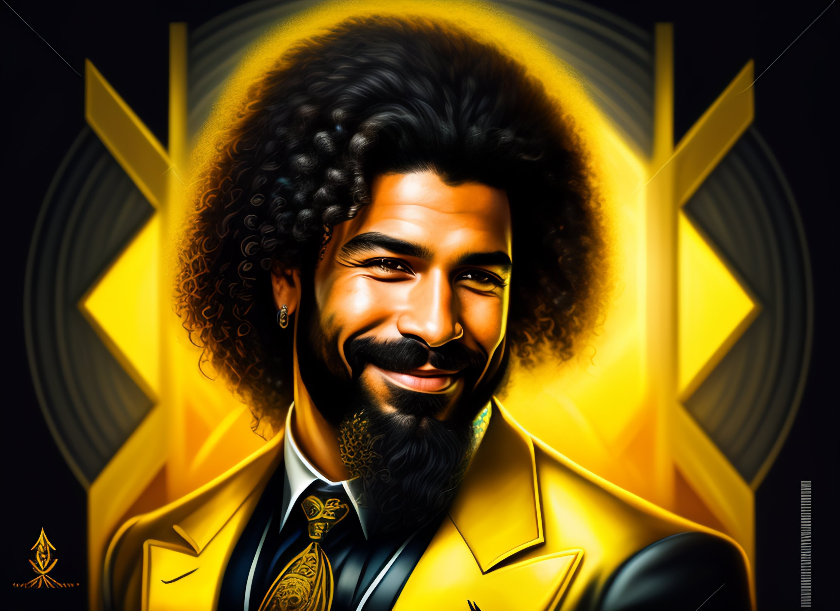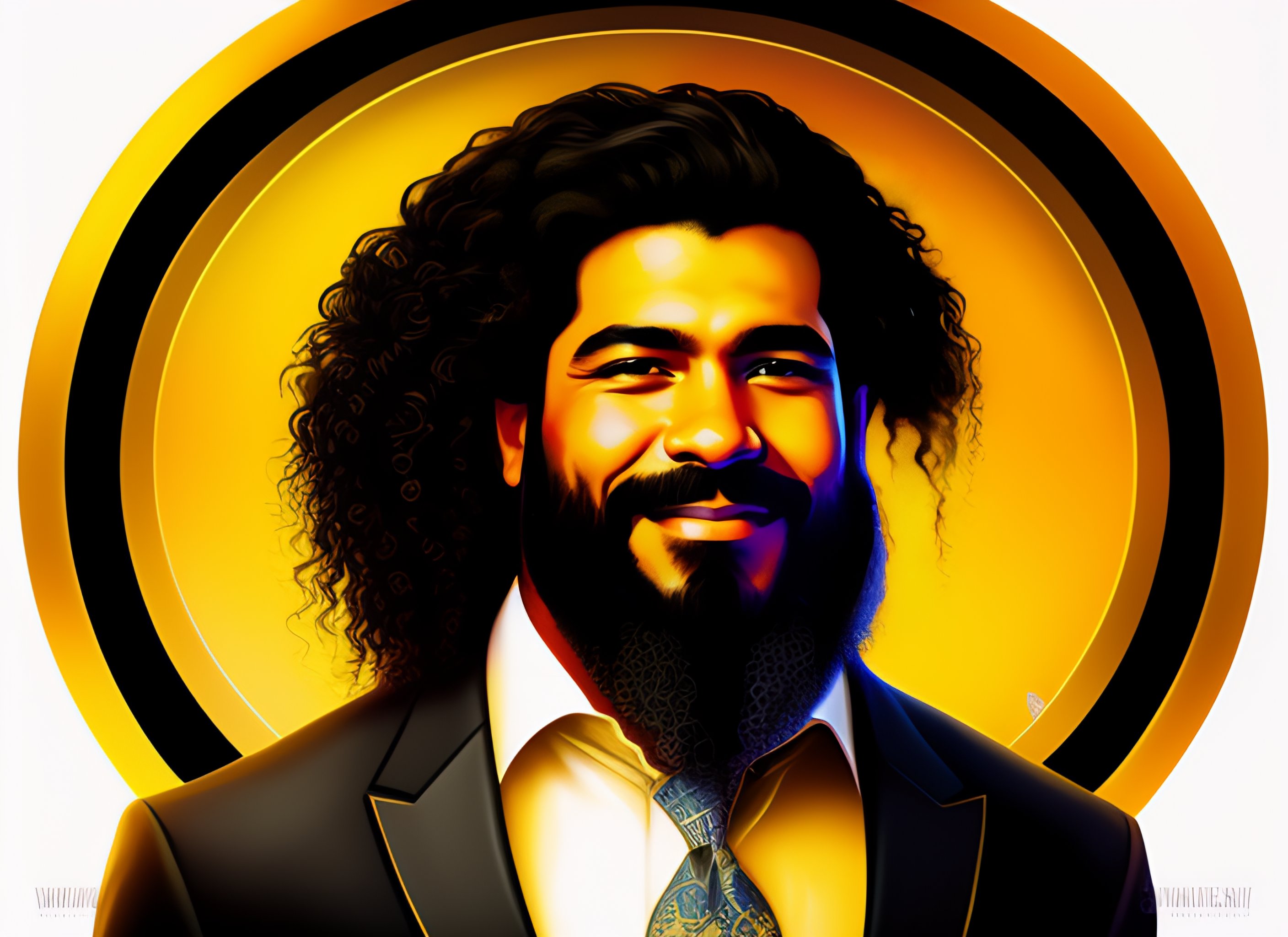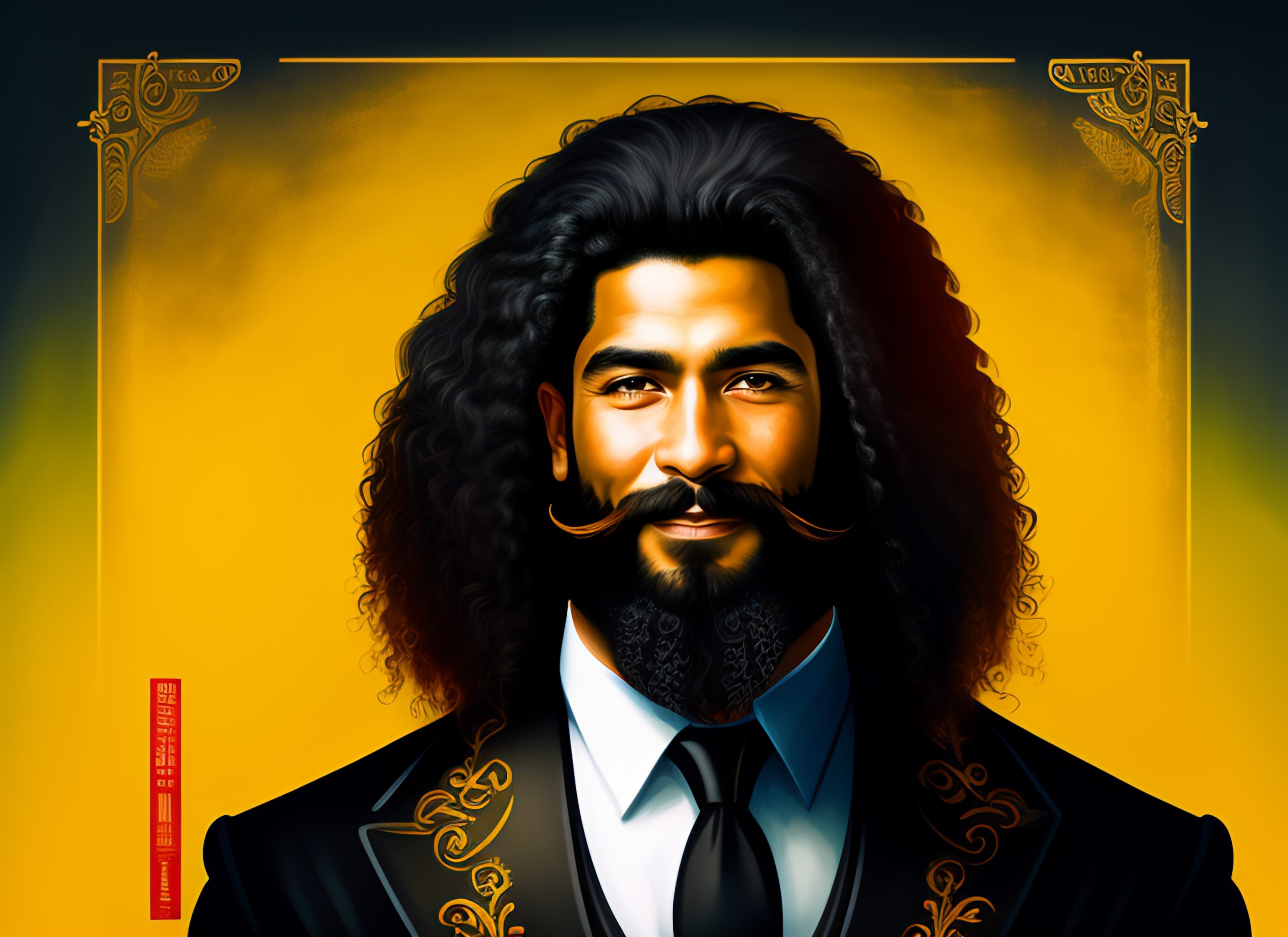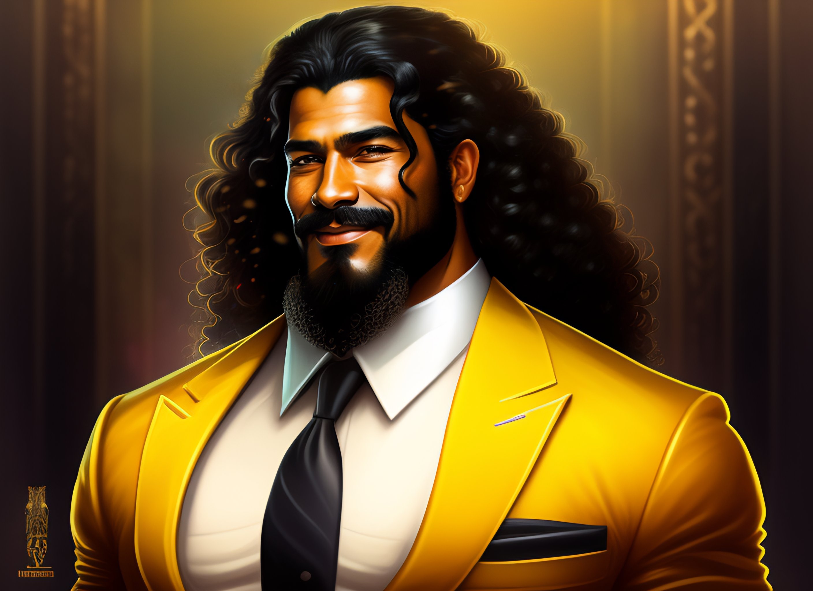 Illustration ultra detailed warrior alkqn king, latin american 42 years old, black long hair, long curly hair, having a short go tee, yellow eyes, full beard perfectly trimmed, wearing mafia suit, gangster's style, smiling, happy, perfect body, kind, masterpiece art, tustworthy