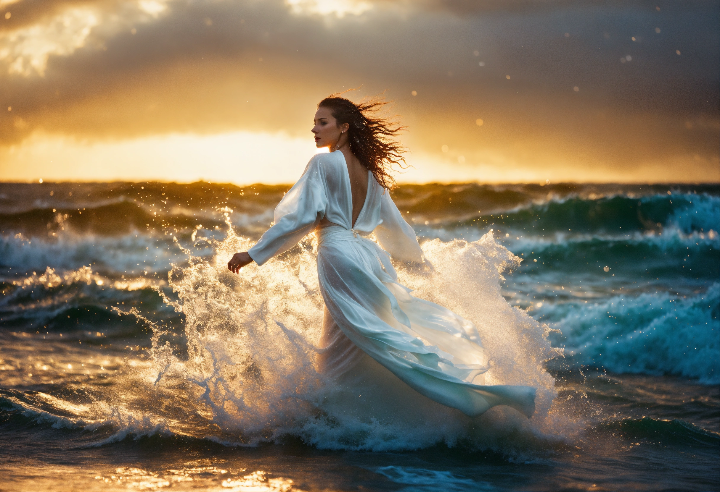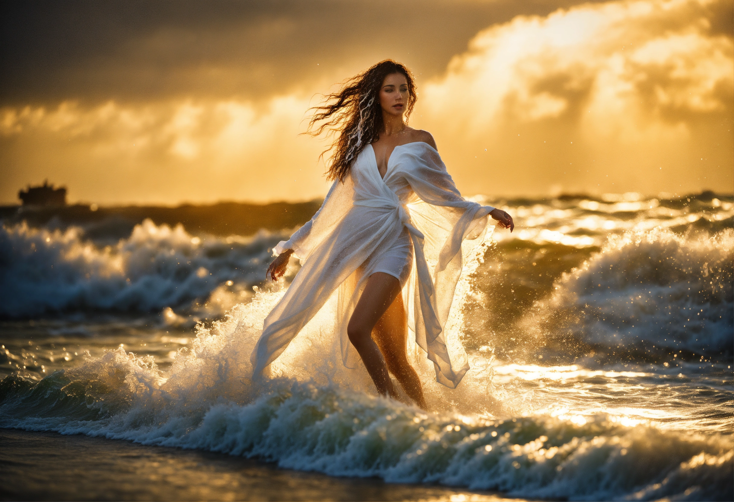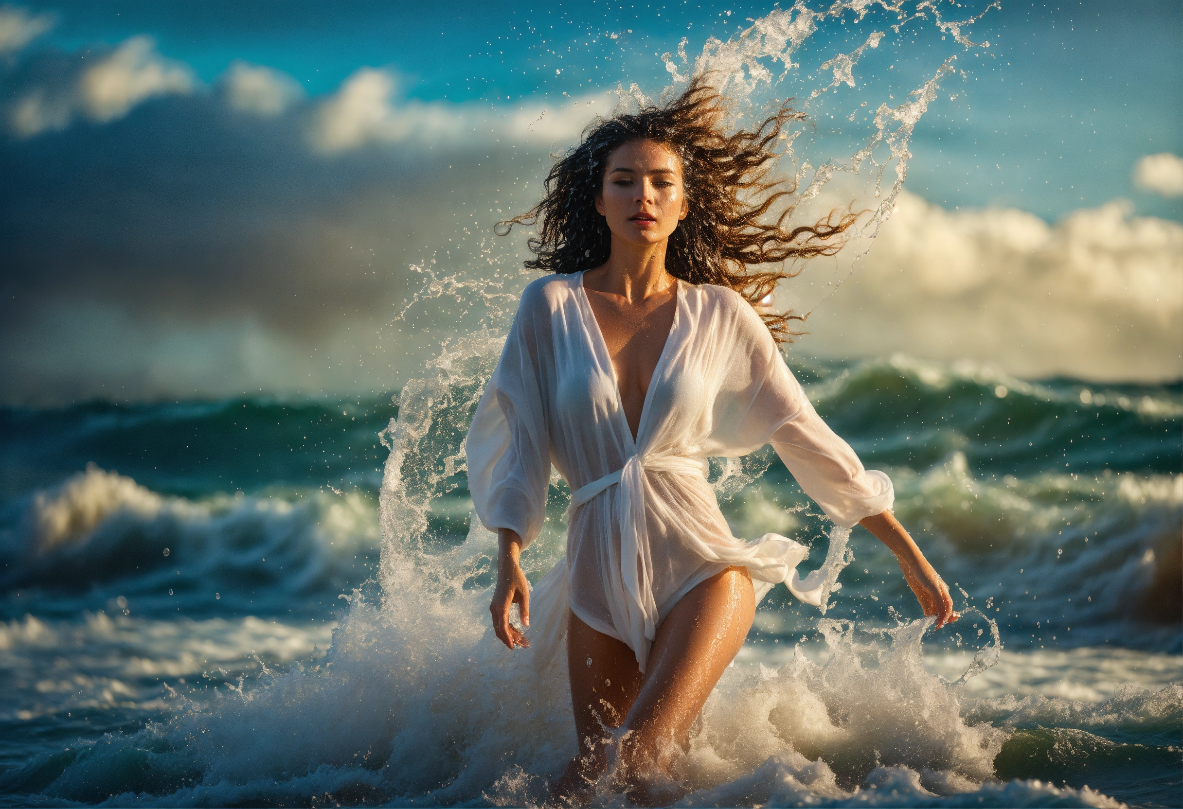 3d realistic surreal conceptual full body photo of flamboyant energetic fierce glowing brazilian model in wet dolman sleeve donna karan white cotton outfit in ocean waves to her hips, drenched in water, in storm wind and heavy sparkling rain and water wave splashes sparkling on her skin. exposure solography, strong intentional camera movement, hurricane bokeh waves behind her, backlit, low contrast, soft light, dolphins