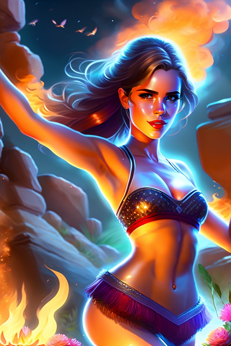 Emma watson in tribal grass skirt bikini outfit, facing camera, dancing around tribal sacrifice alter, surrounded by cavewomen tribe, nighttime, tribal cave bonfire background