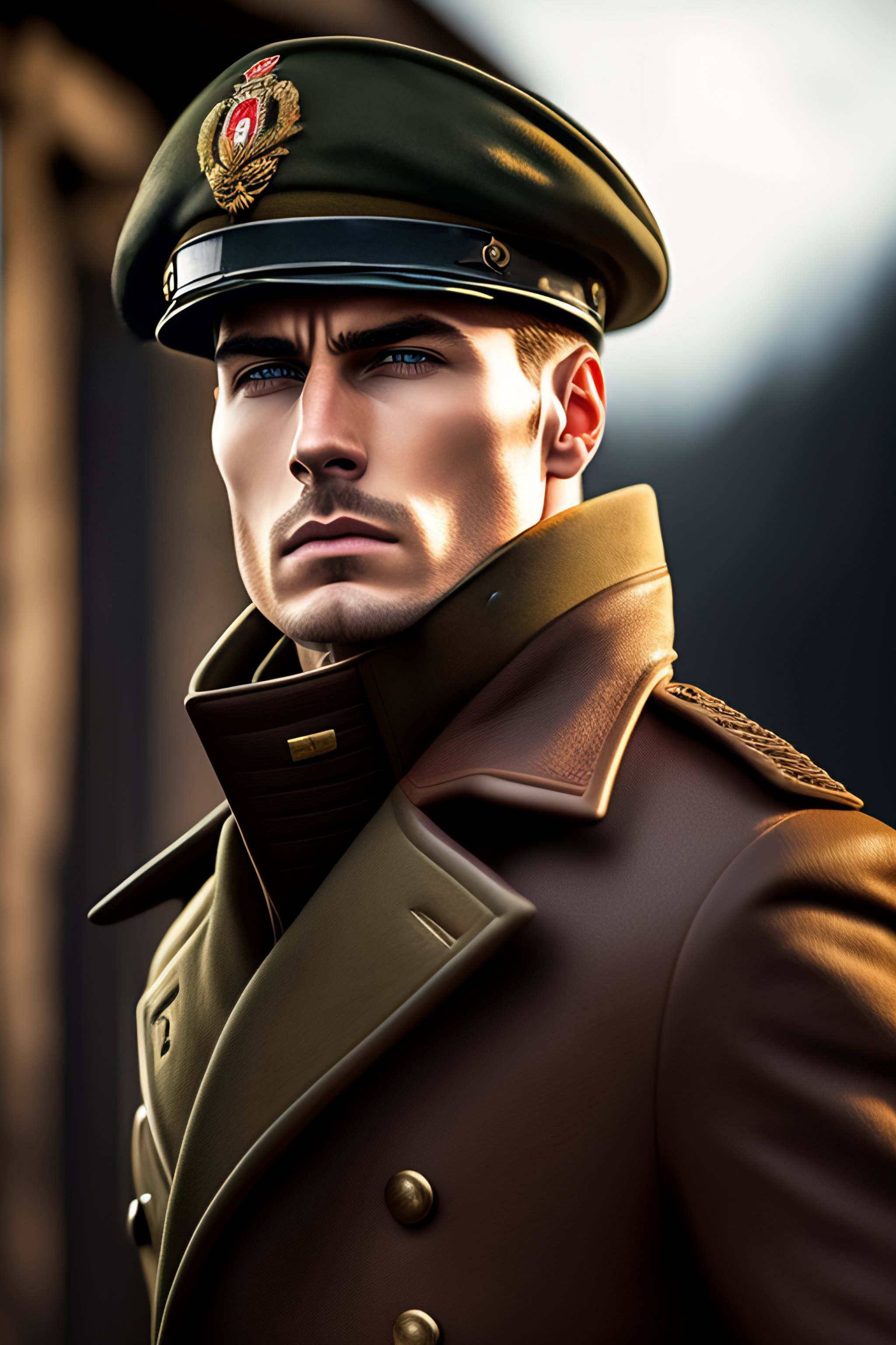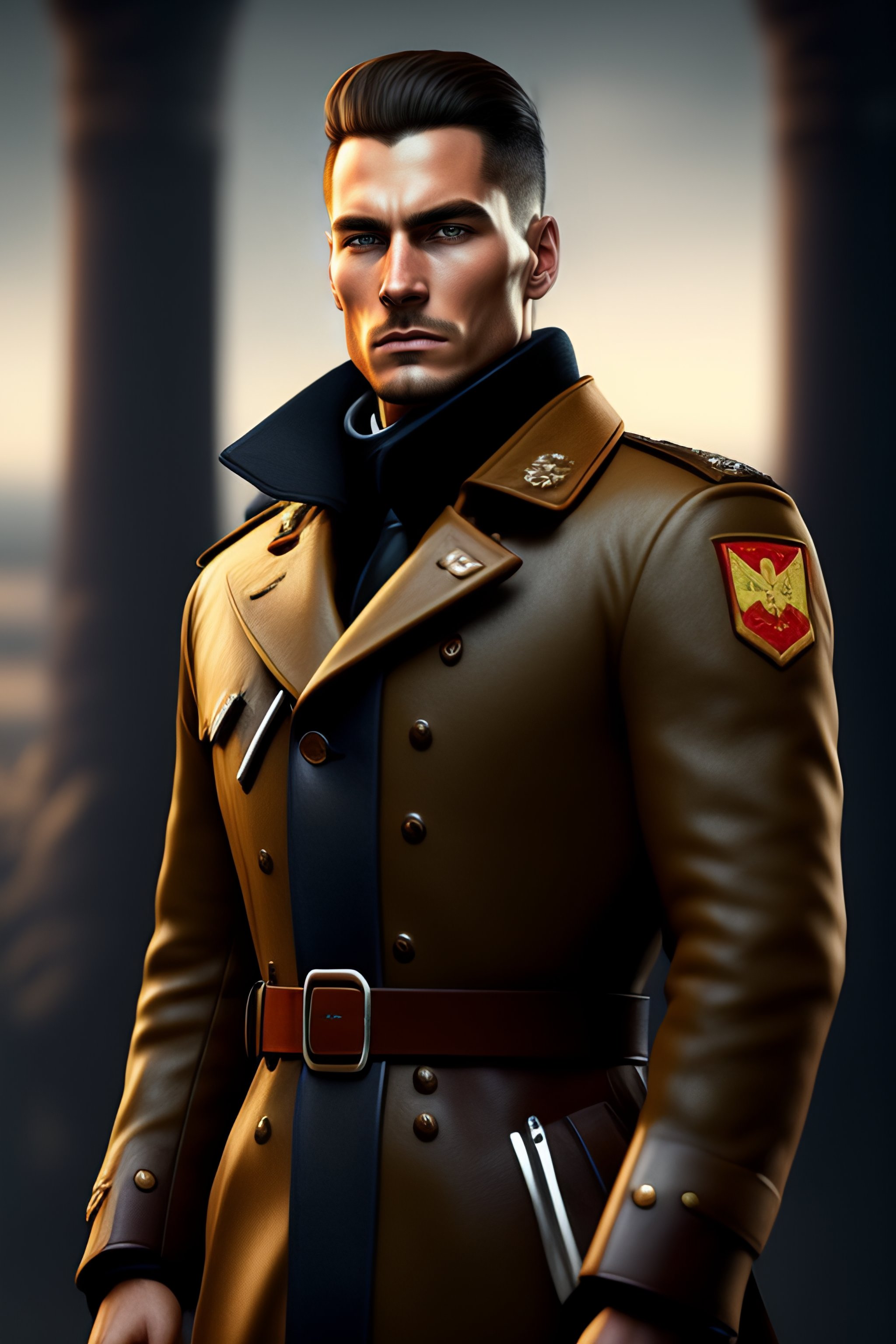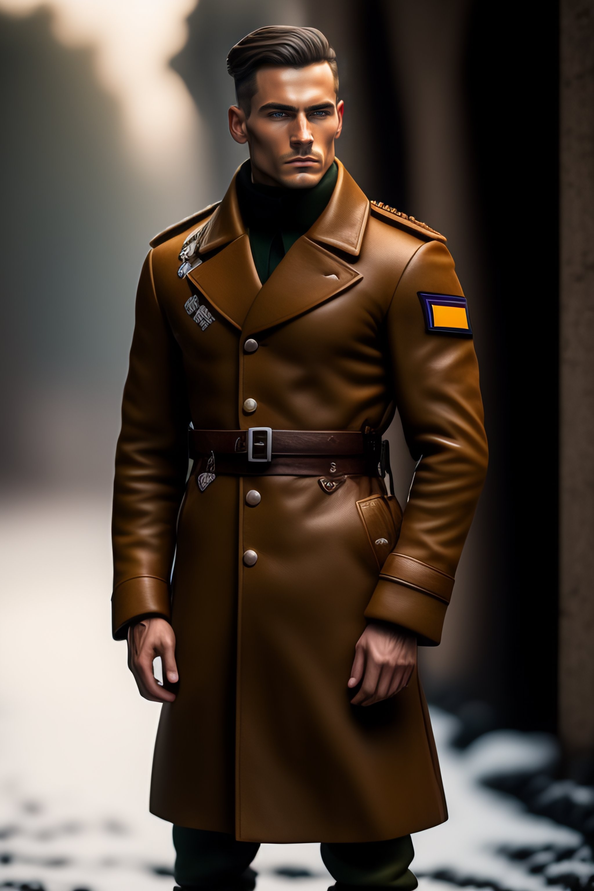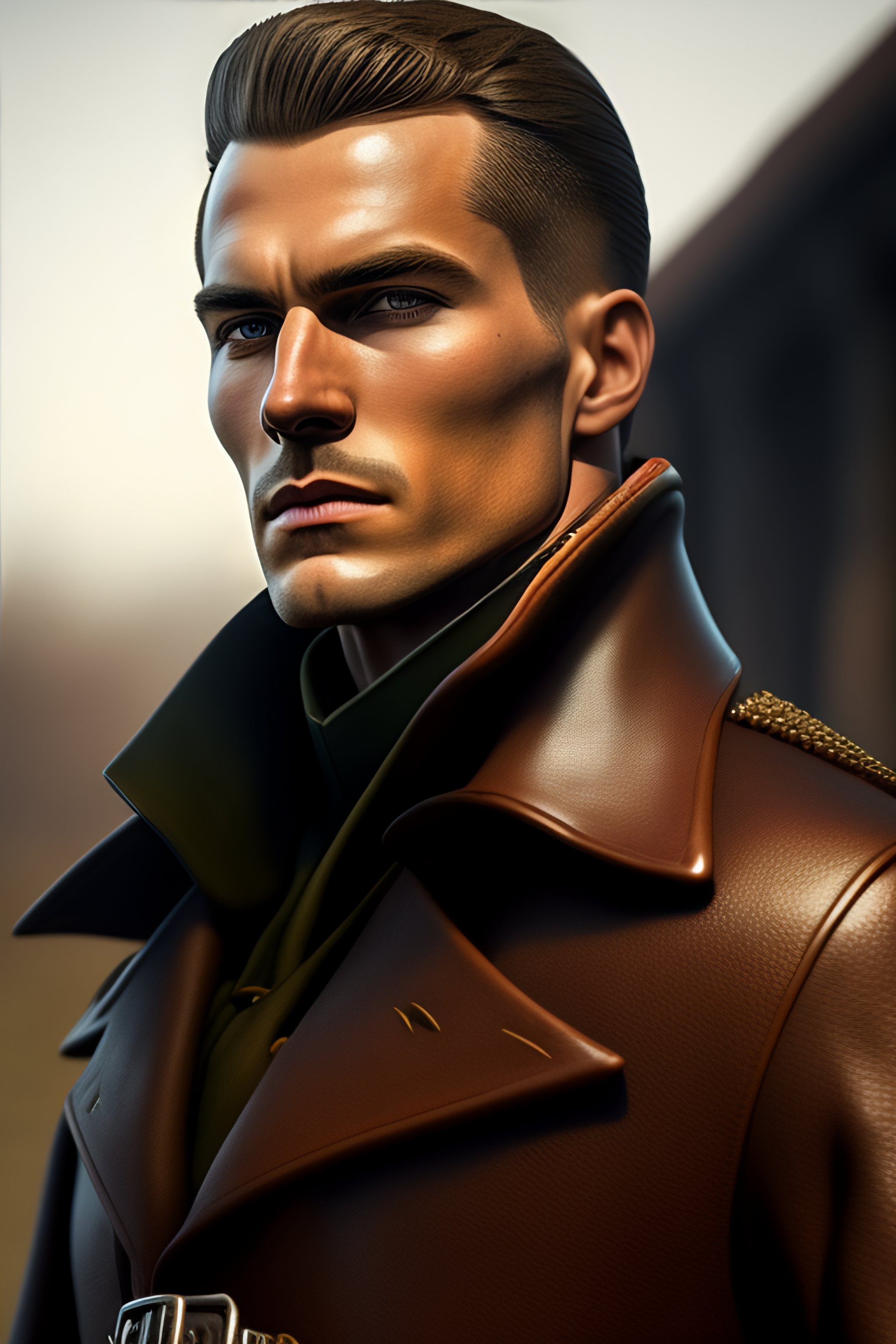 German soldier whermacht, outside, with a ww2 german gestapo cowhide trench leather coat ready for battle, highly detailed face, very angry face, 8k in the style kohei ohmori