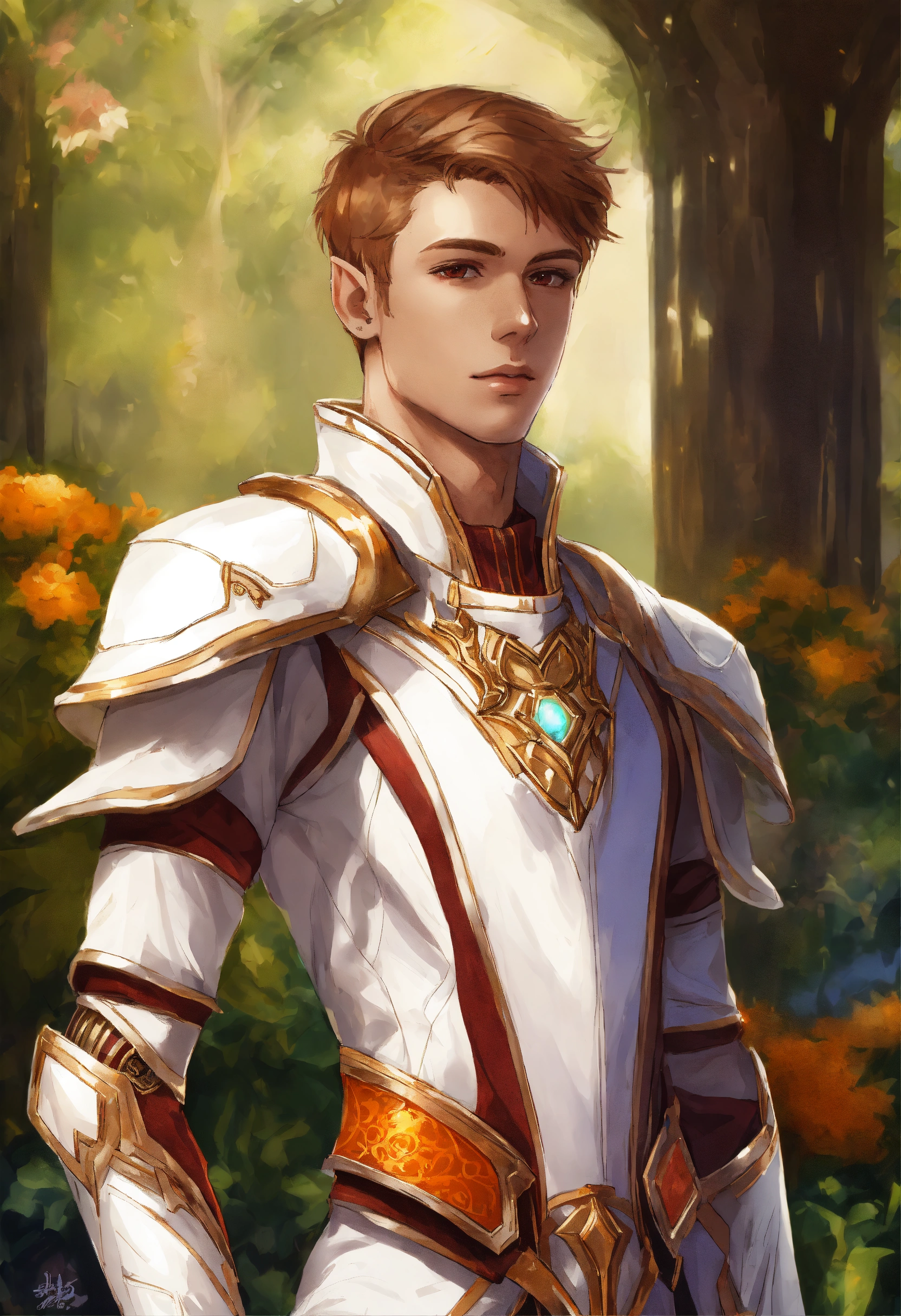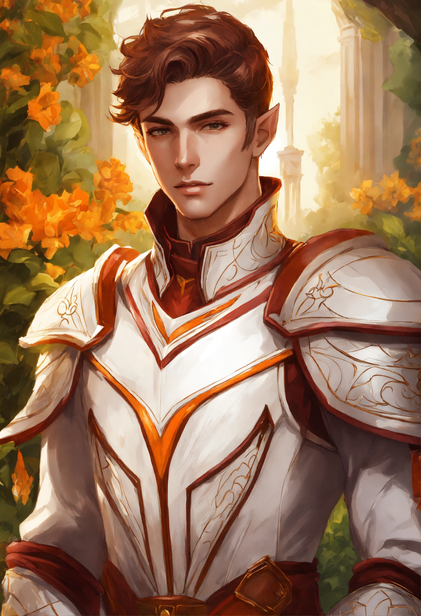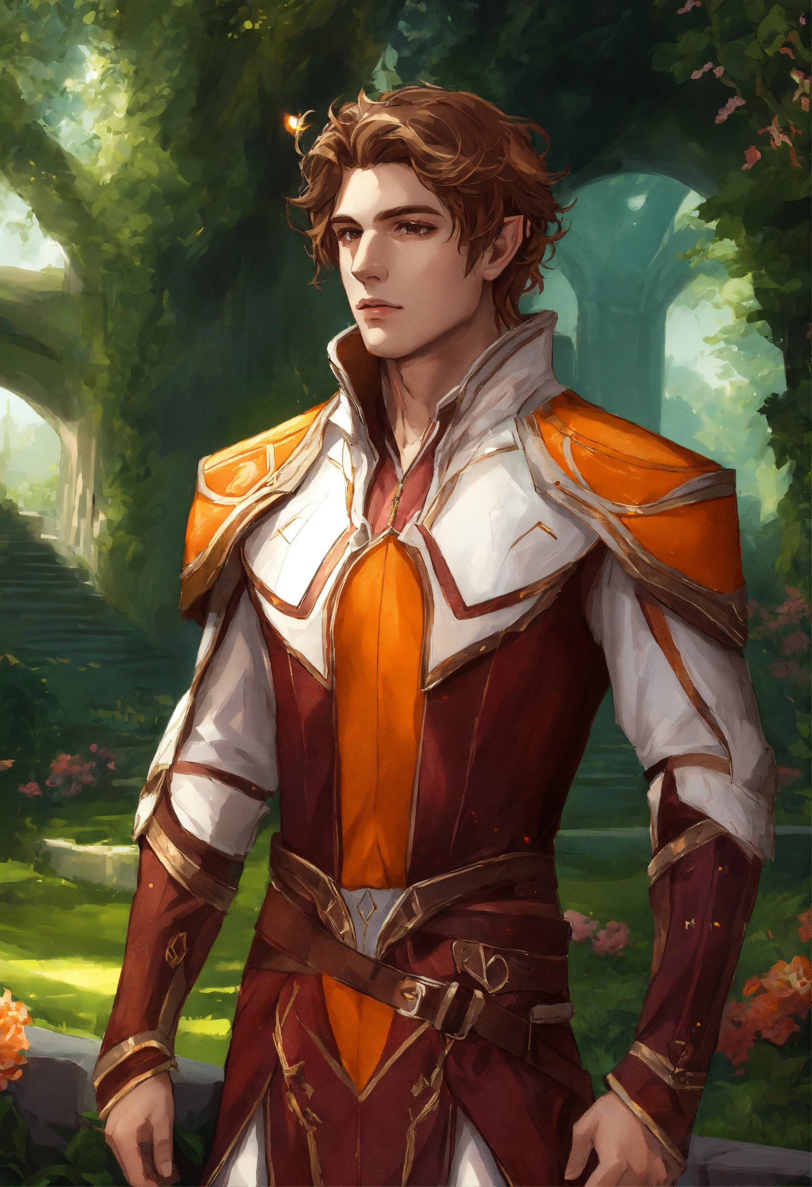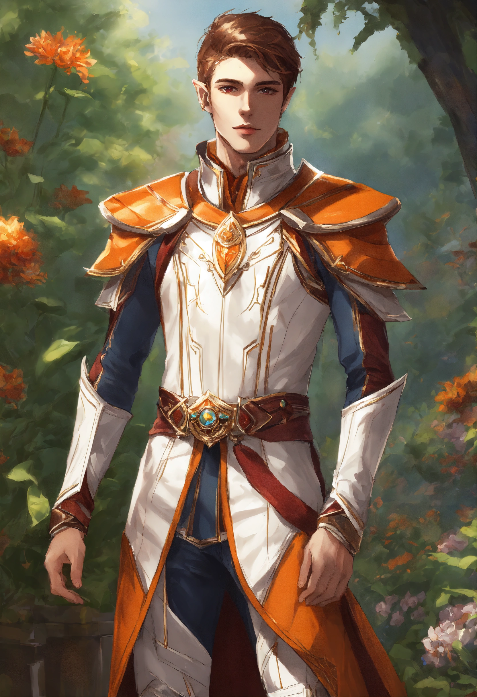 Drawing of a sci fi high elf, space, palace, white cybernetic leather royal outfit with orange and maroon trim, elf, male, handsome, 22 years old, brown hair, standing in a garden, elf ear