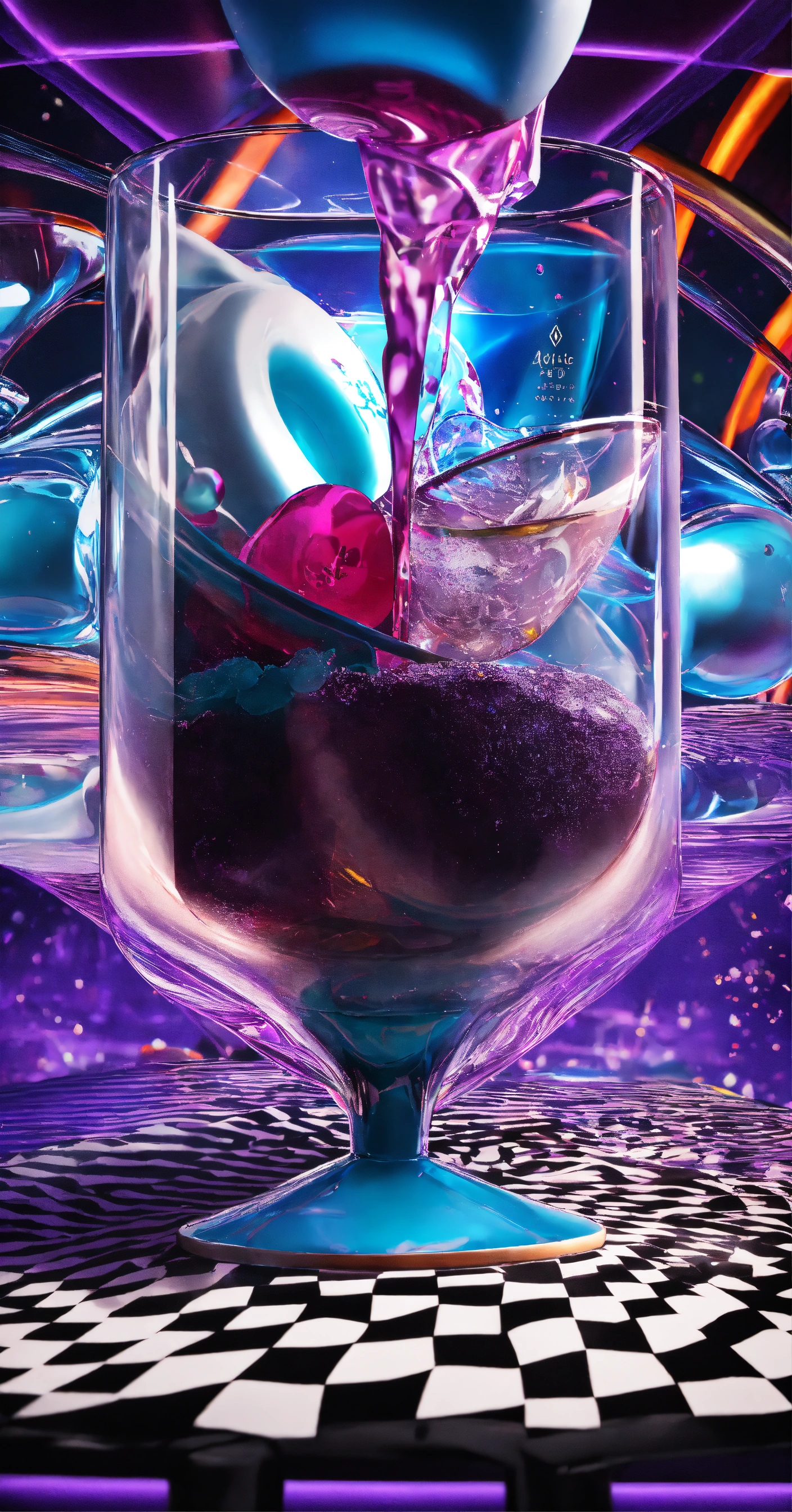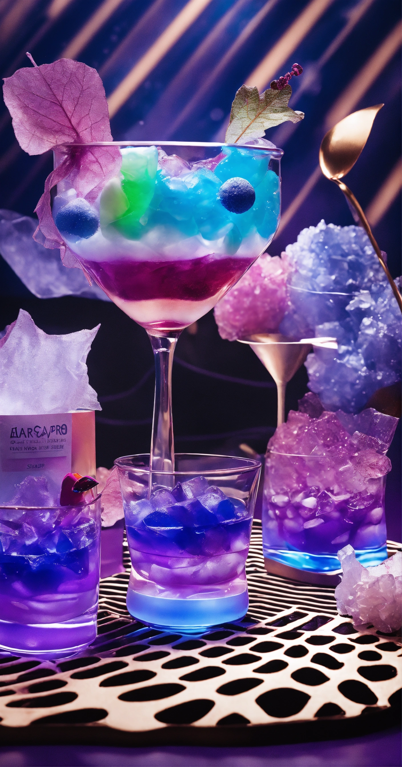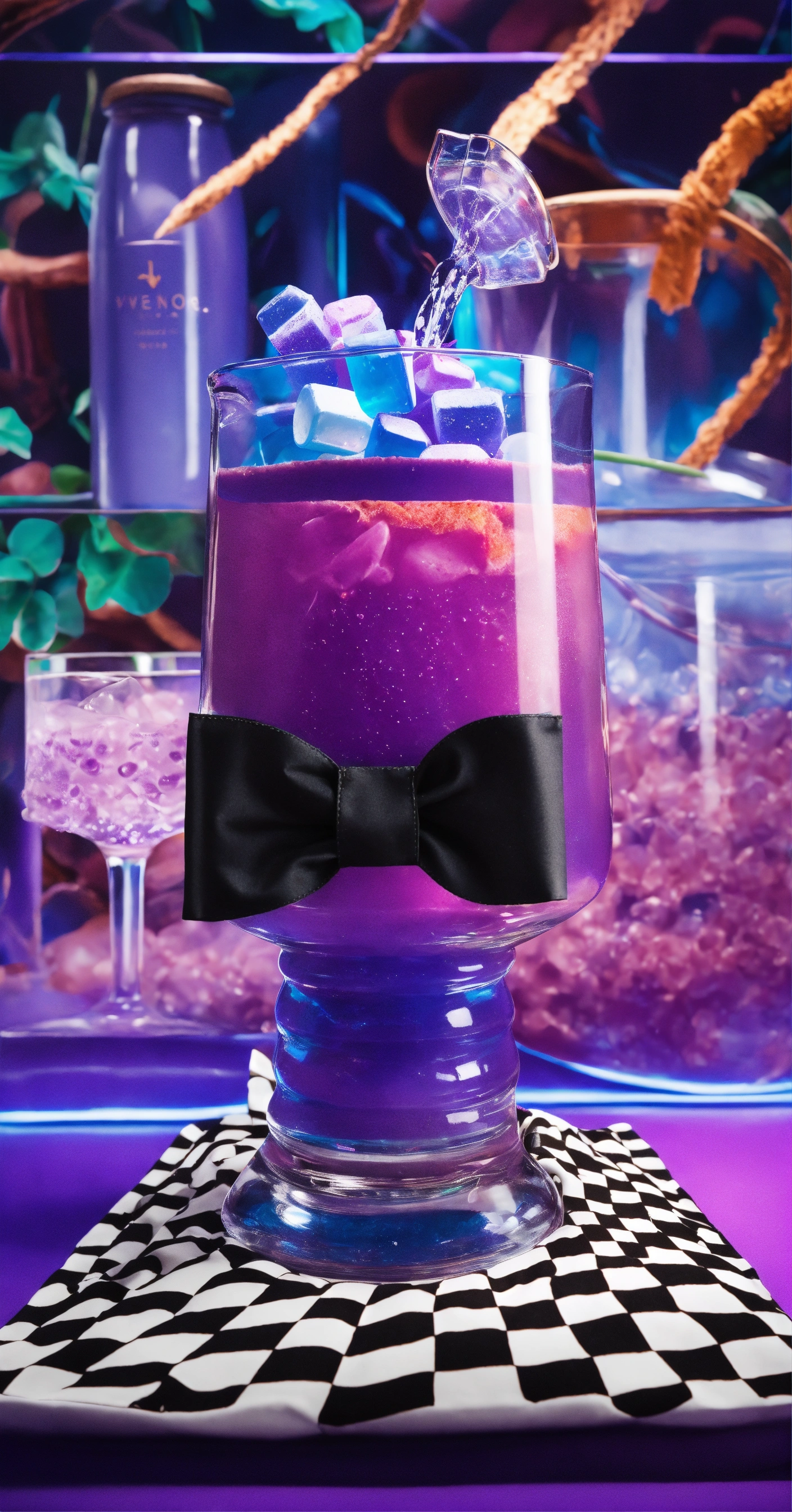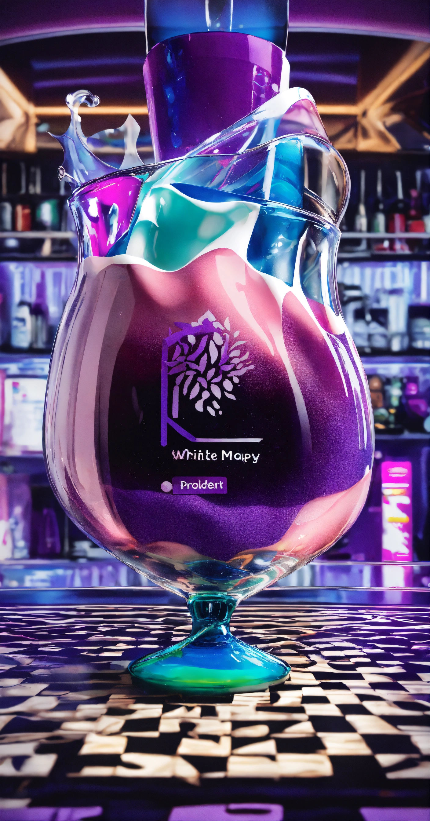 Front angle product shot of white stand up pouch with purple drink in a glassware, simple magic background