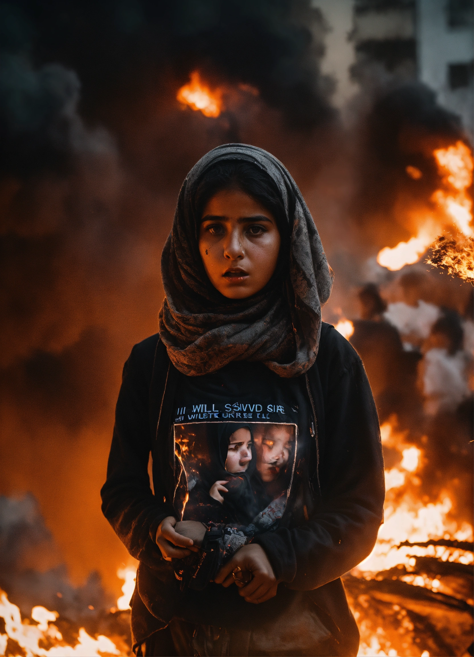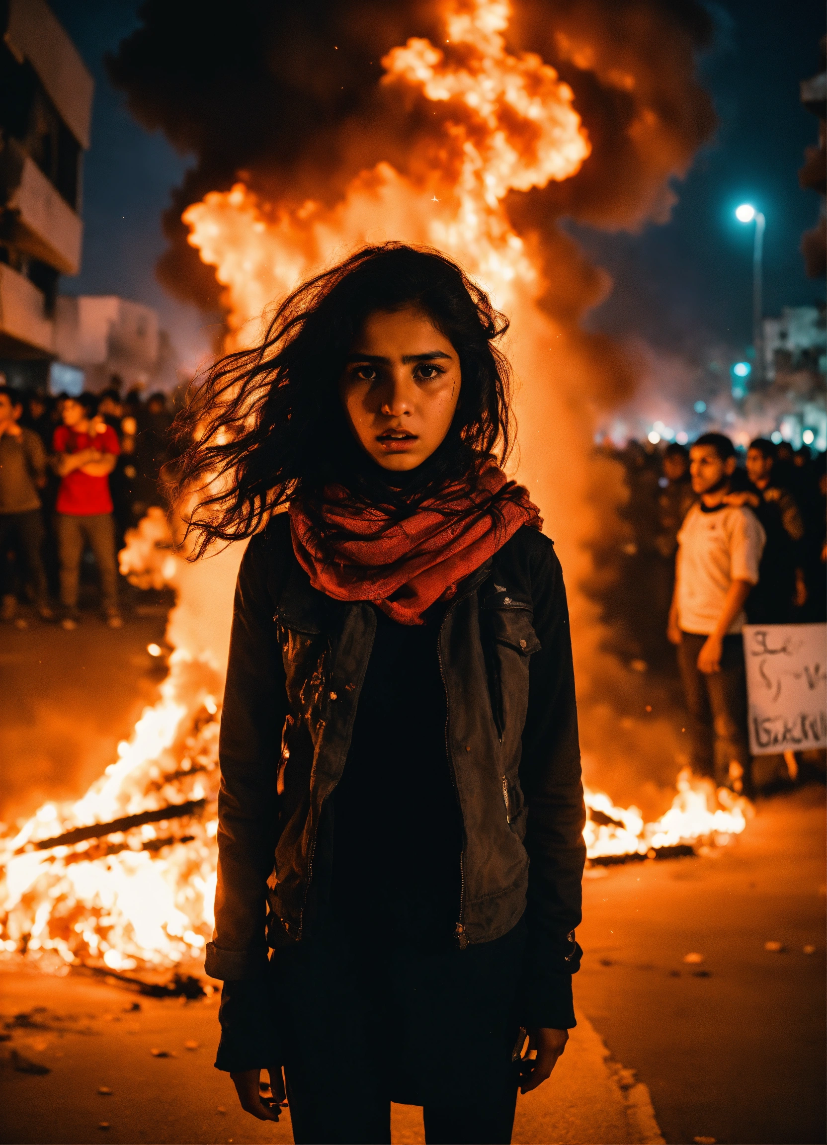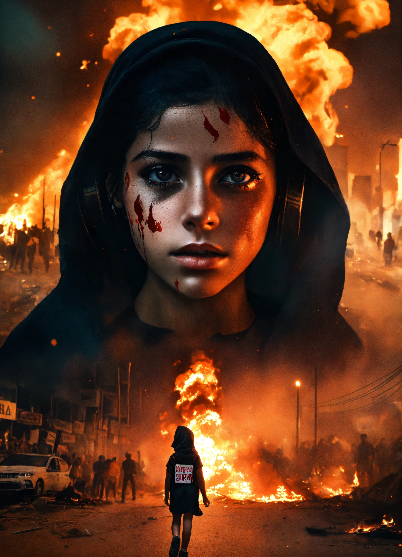 Dark aesthetic photo, of a palestinian girl amidst a chaotic street protest in gaza, the scene is filled with tension and unrest, as flames from fire flares illuminate the night sky in the background, a stunning surreal photo of an intense scene. the detailed expression on her face, with text "i will survive"